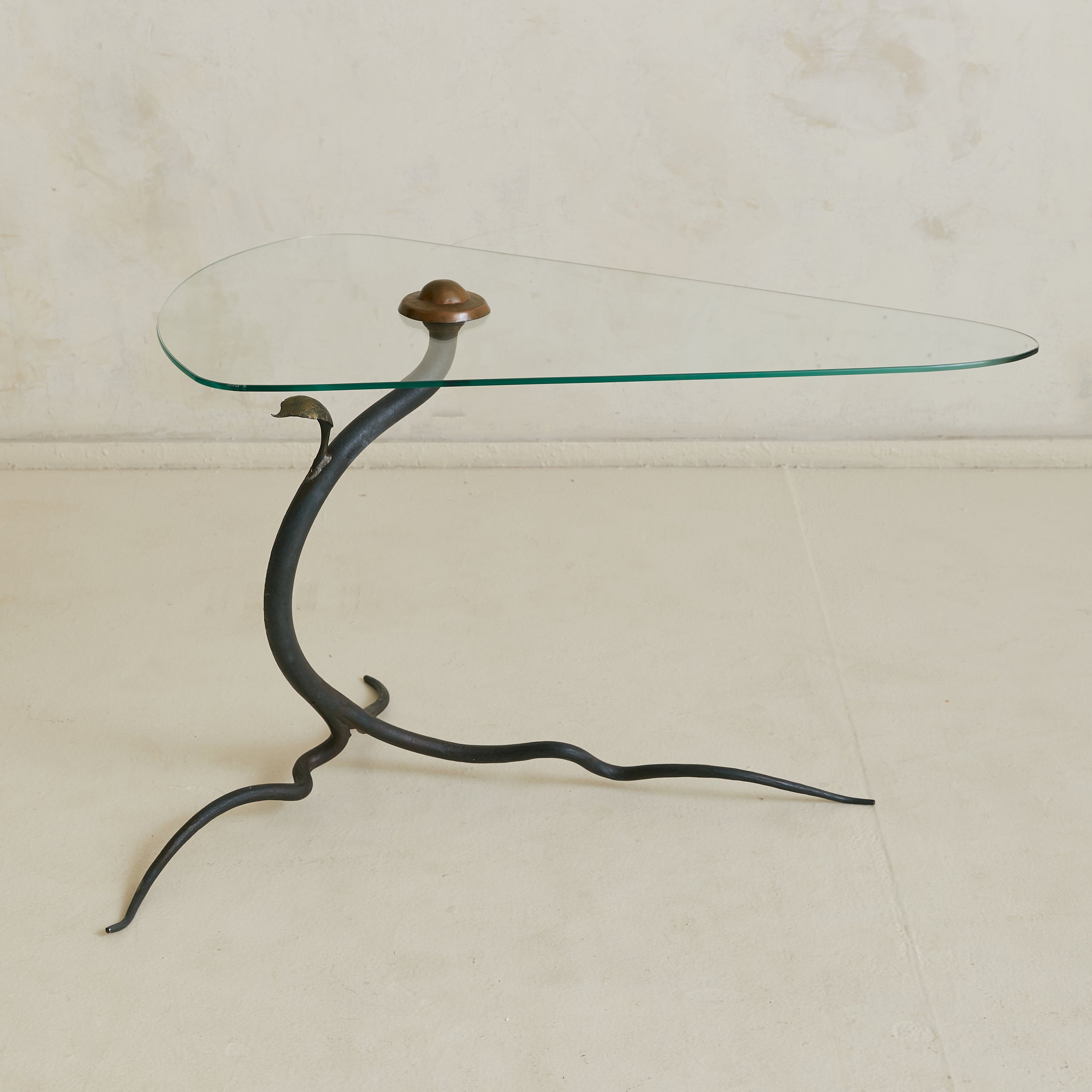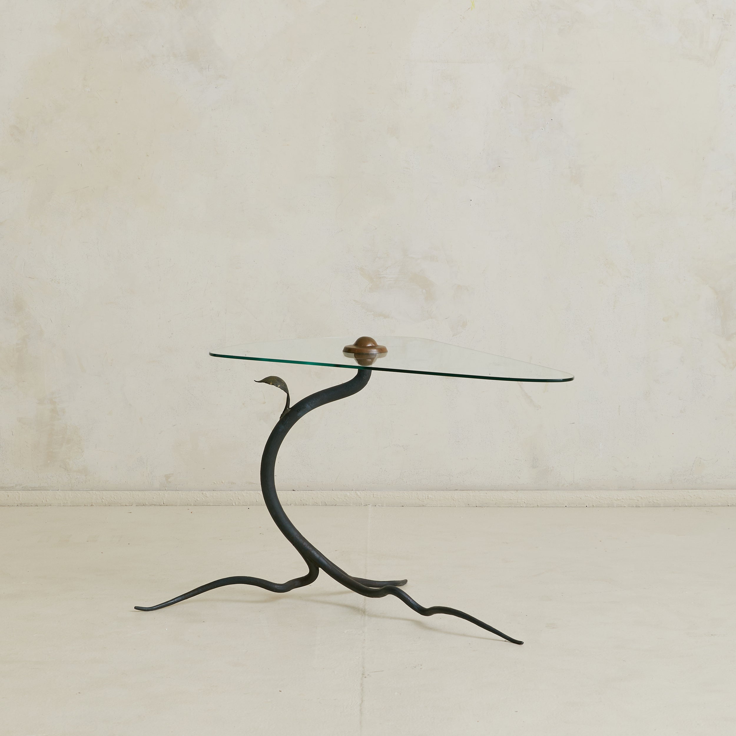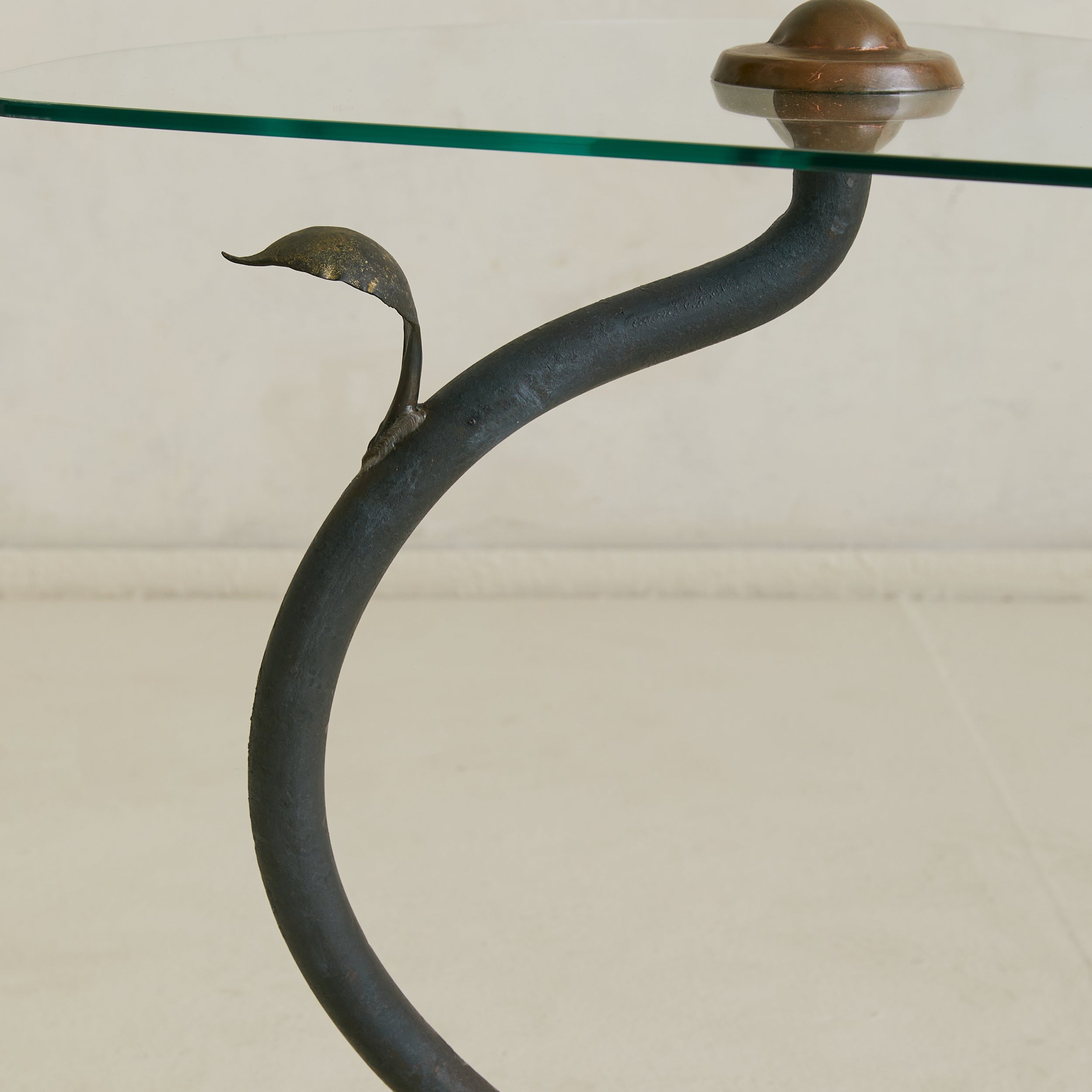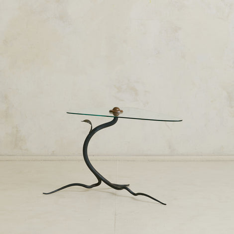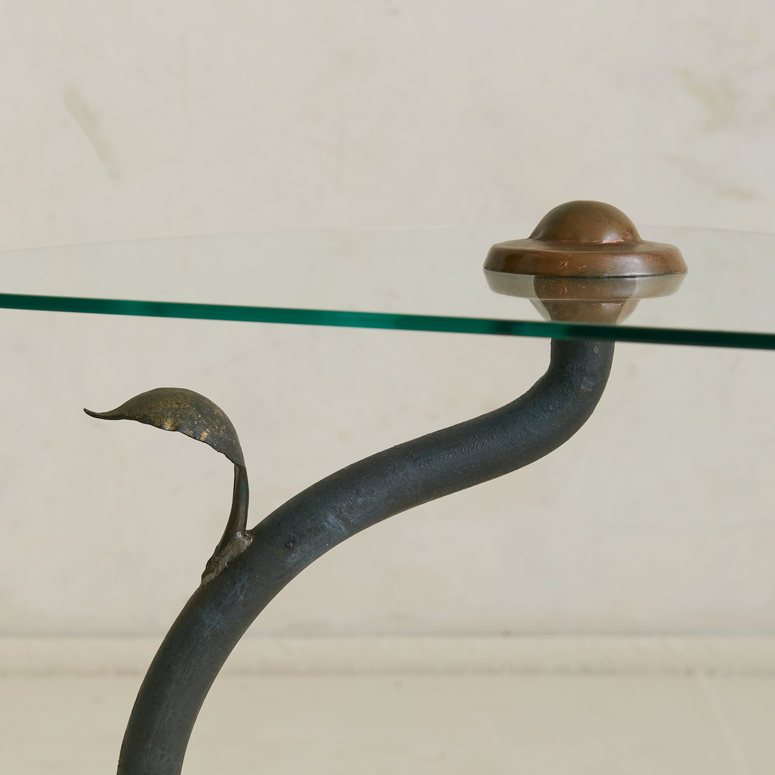 A lyrical composition in wrought iron, this 1970s Belgian side table takes its cues from the natural world. The frame unfurls in fluid, branch-like curves, its hand-forged lines both delicate and deliberate. A single gilt leaf extends toward the glass, while a copper-finished cap crowns the stem.