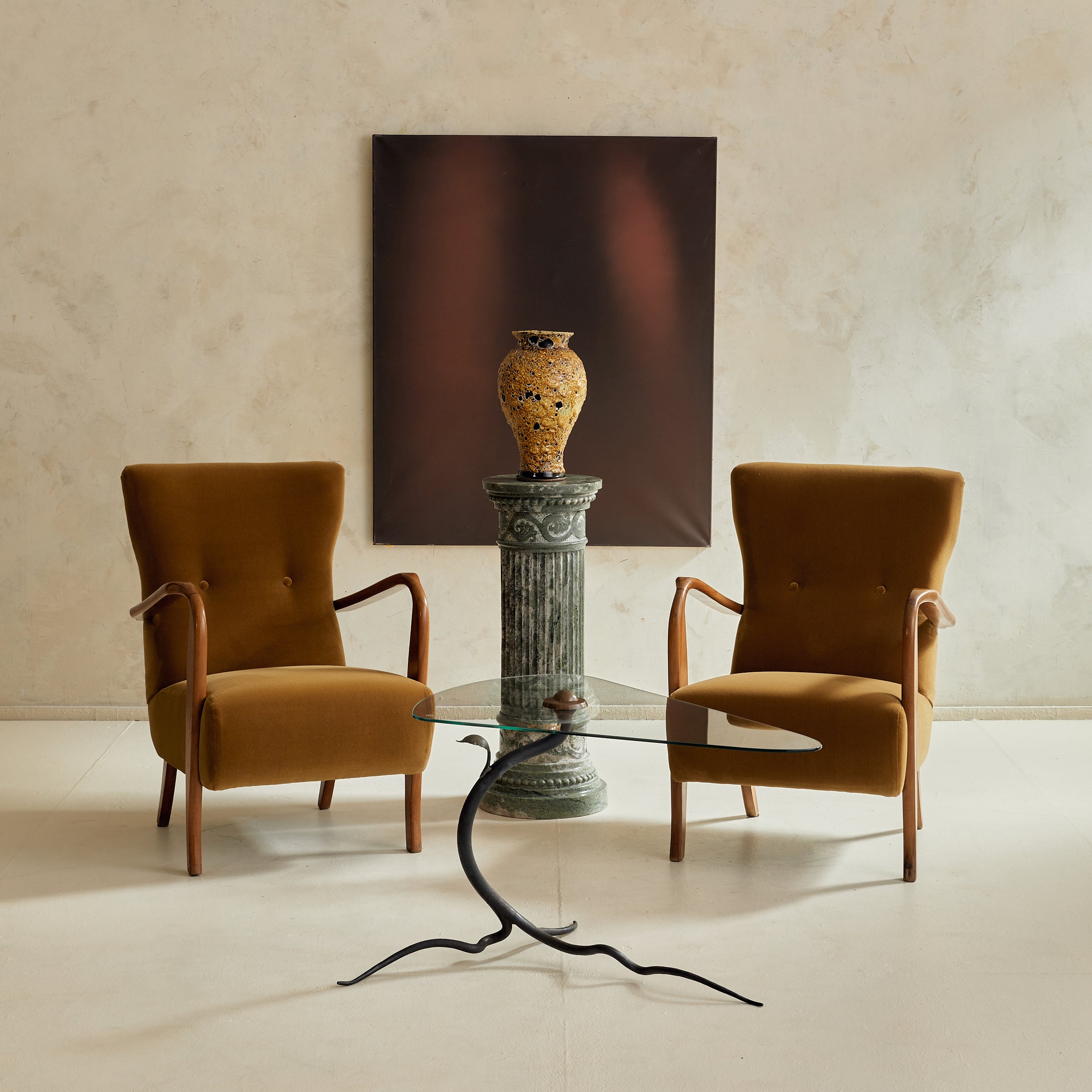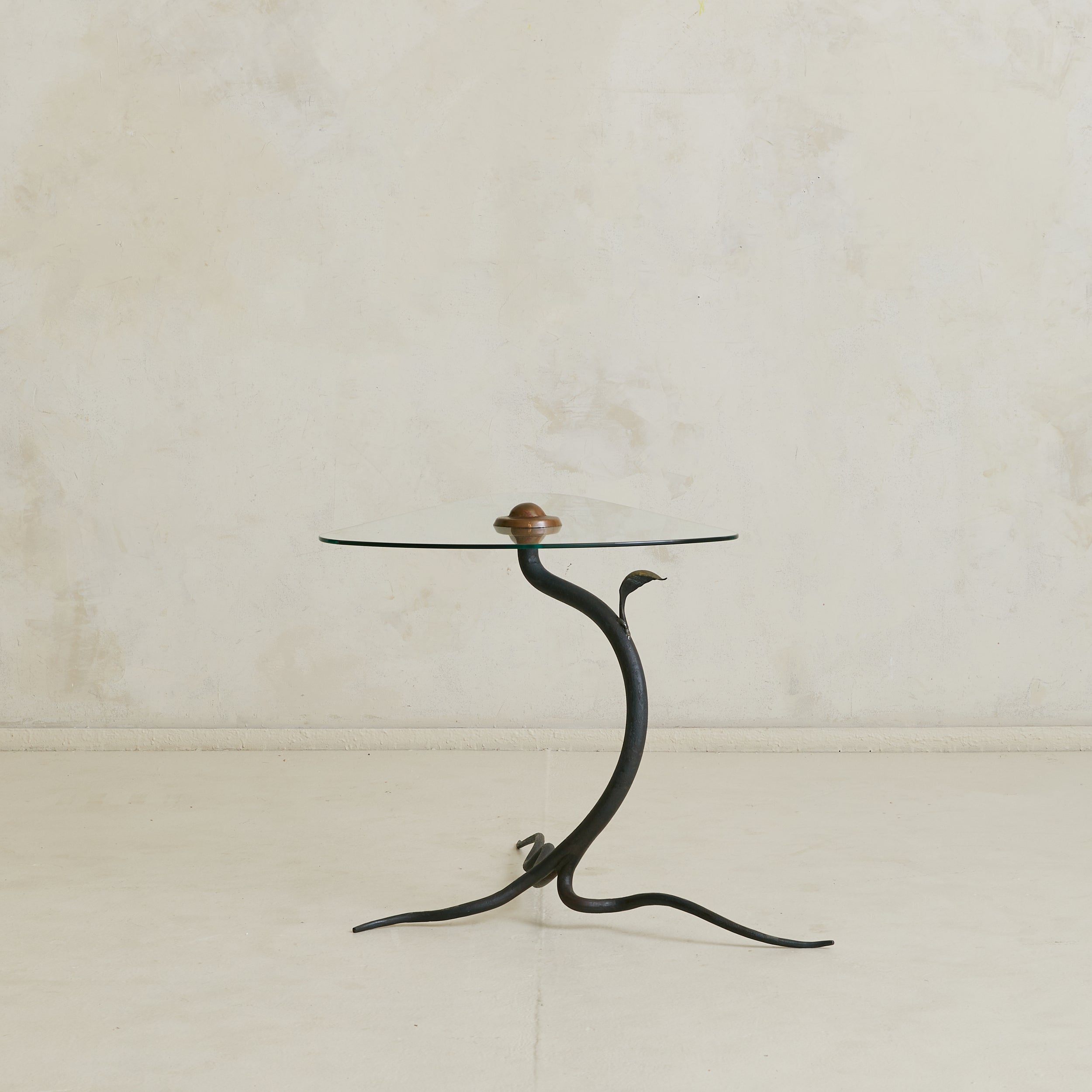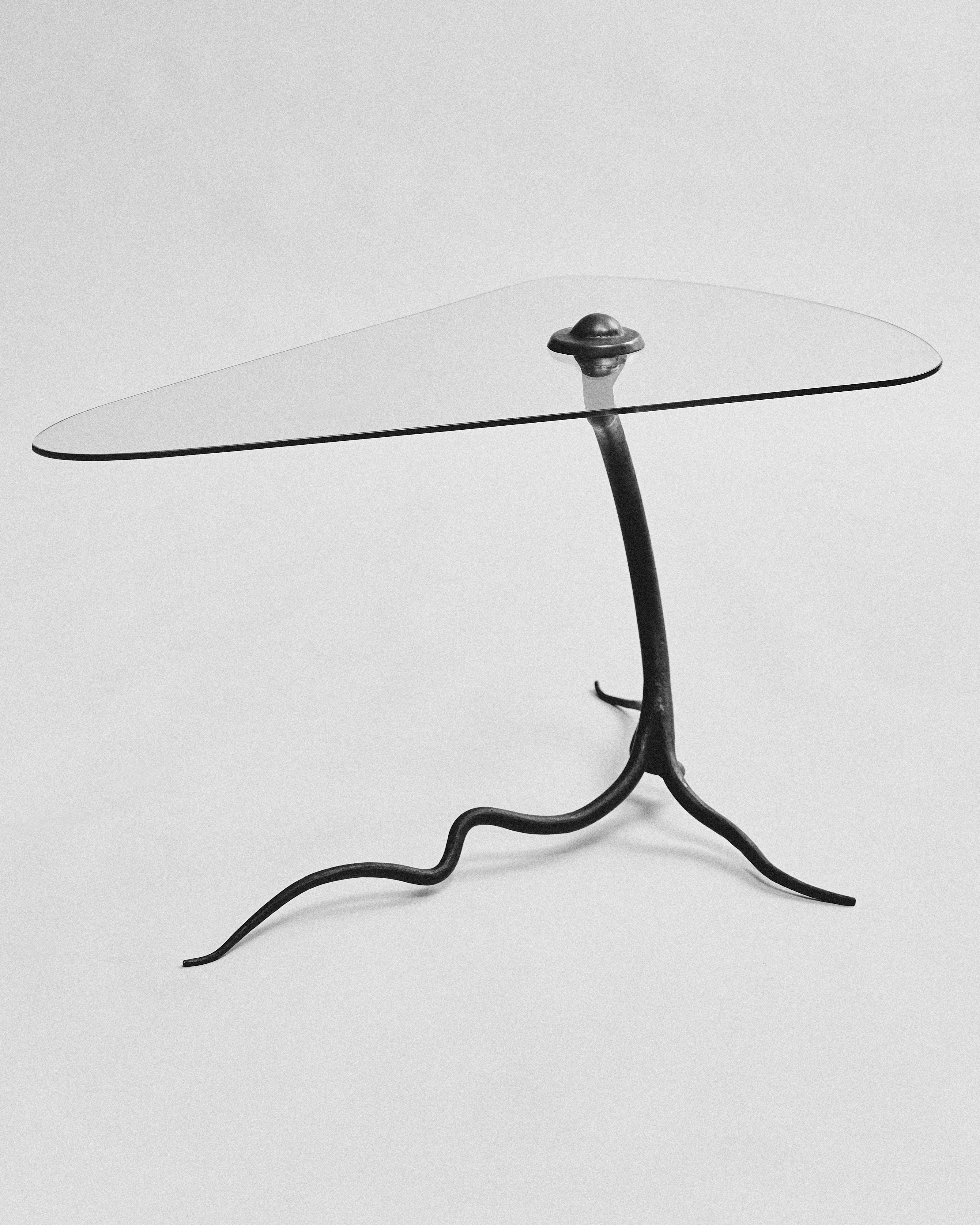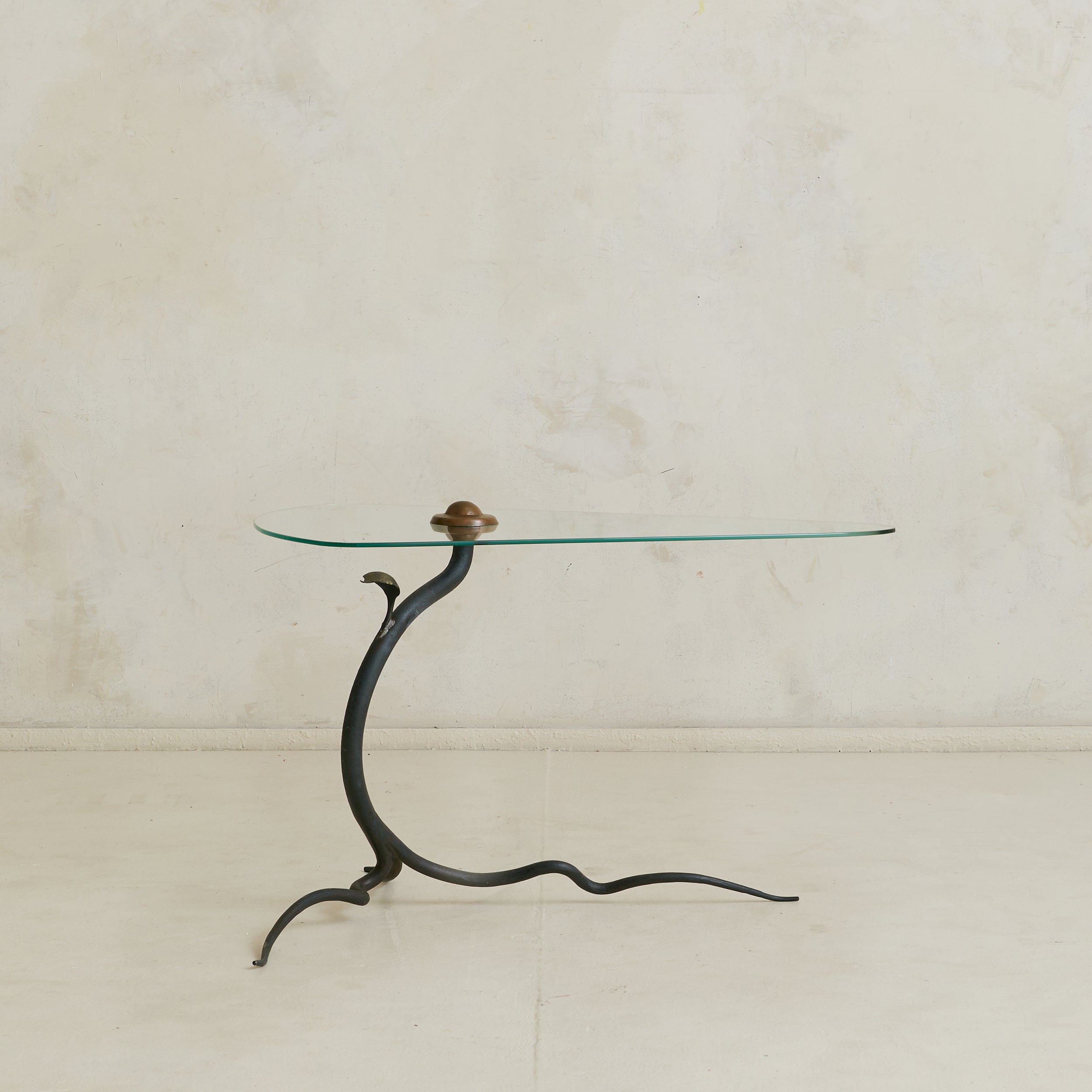 A lyrical composition in wrought iron, this 1970s Belgian side table takes its cues from the natural world. The frame unfurls in fluid, branch-like curves, its hand-forged lines both delicate and deliberate. A single gilt leaf extends toward the glass, while a copper-finished cap crowns the stem.