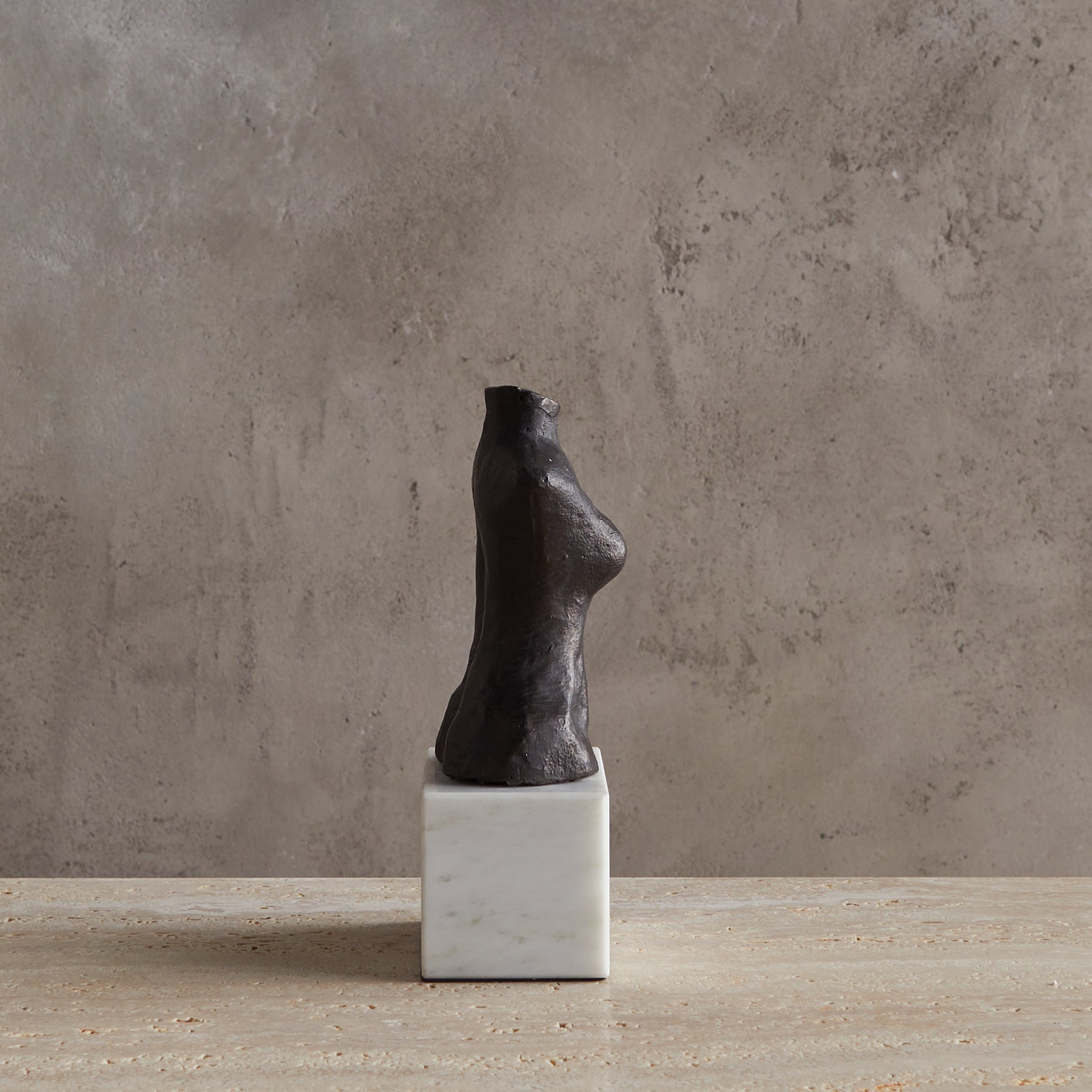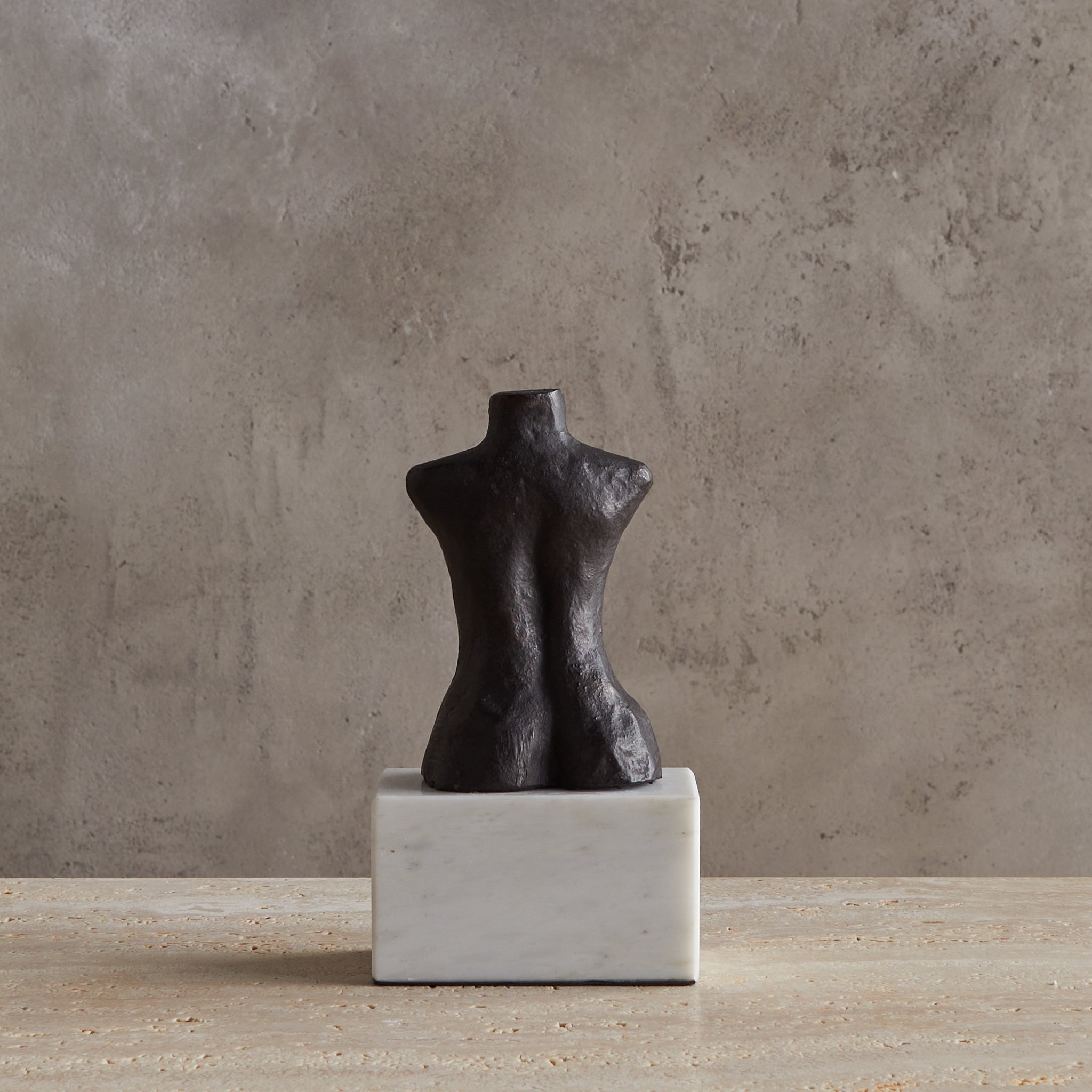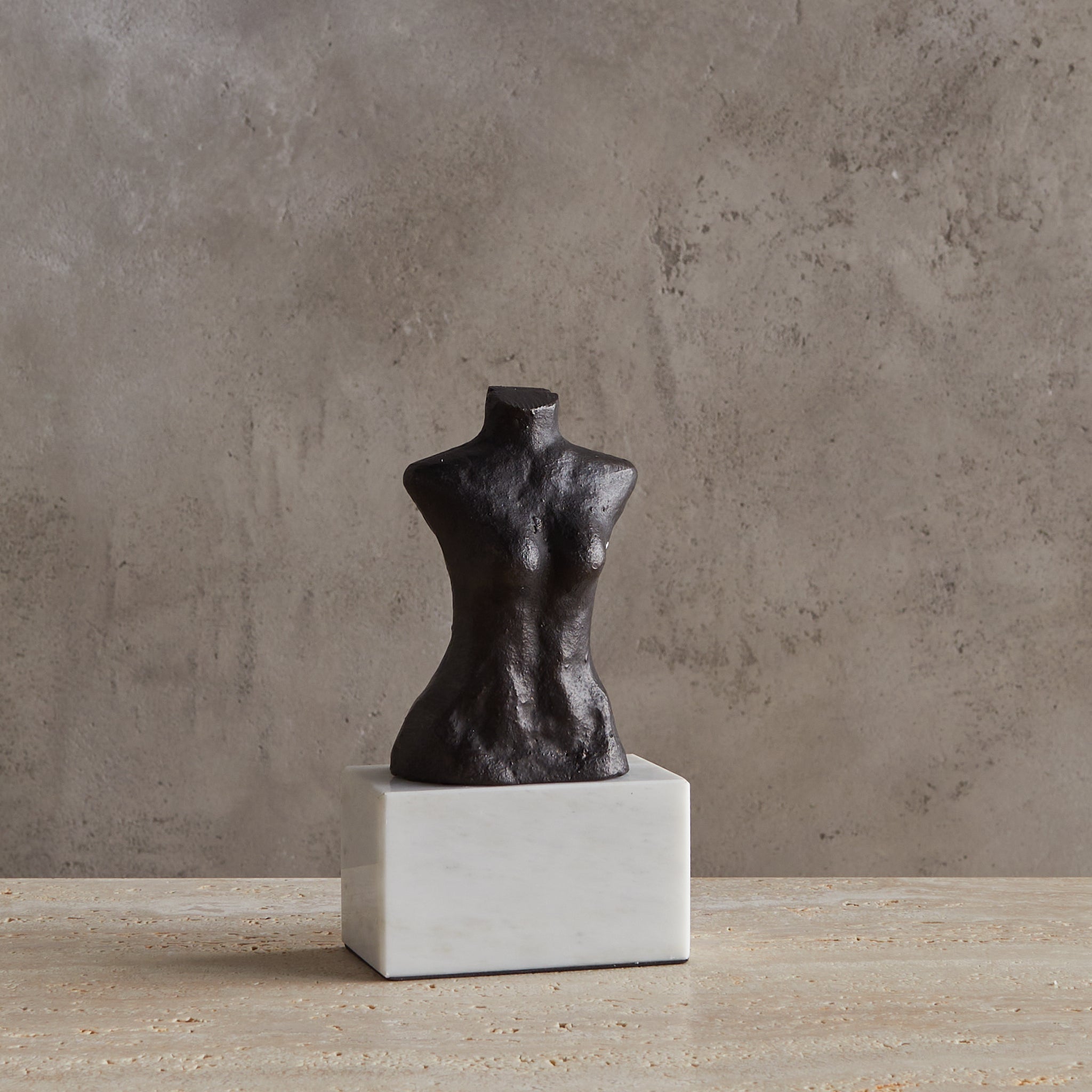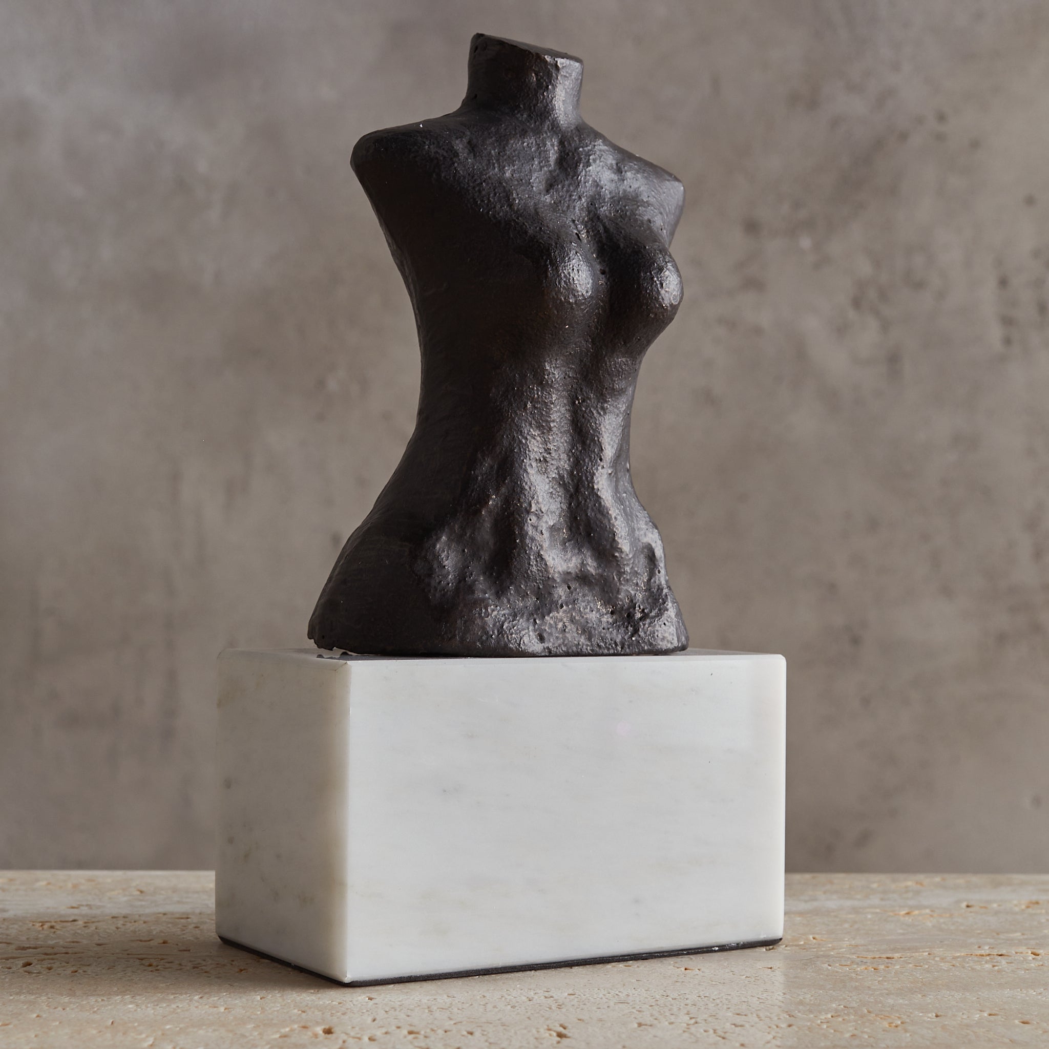A contemporary sculpture cast in iron with a textured bronze finish. The form, a stylized female torso, is defined by soft curves and quiet poise. The surface is raw and tactile, mottled with gesture and light.
