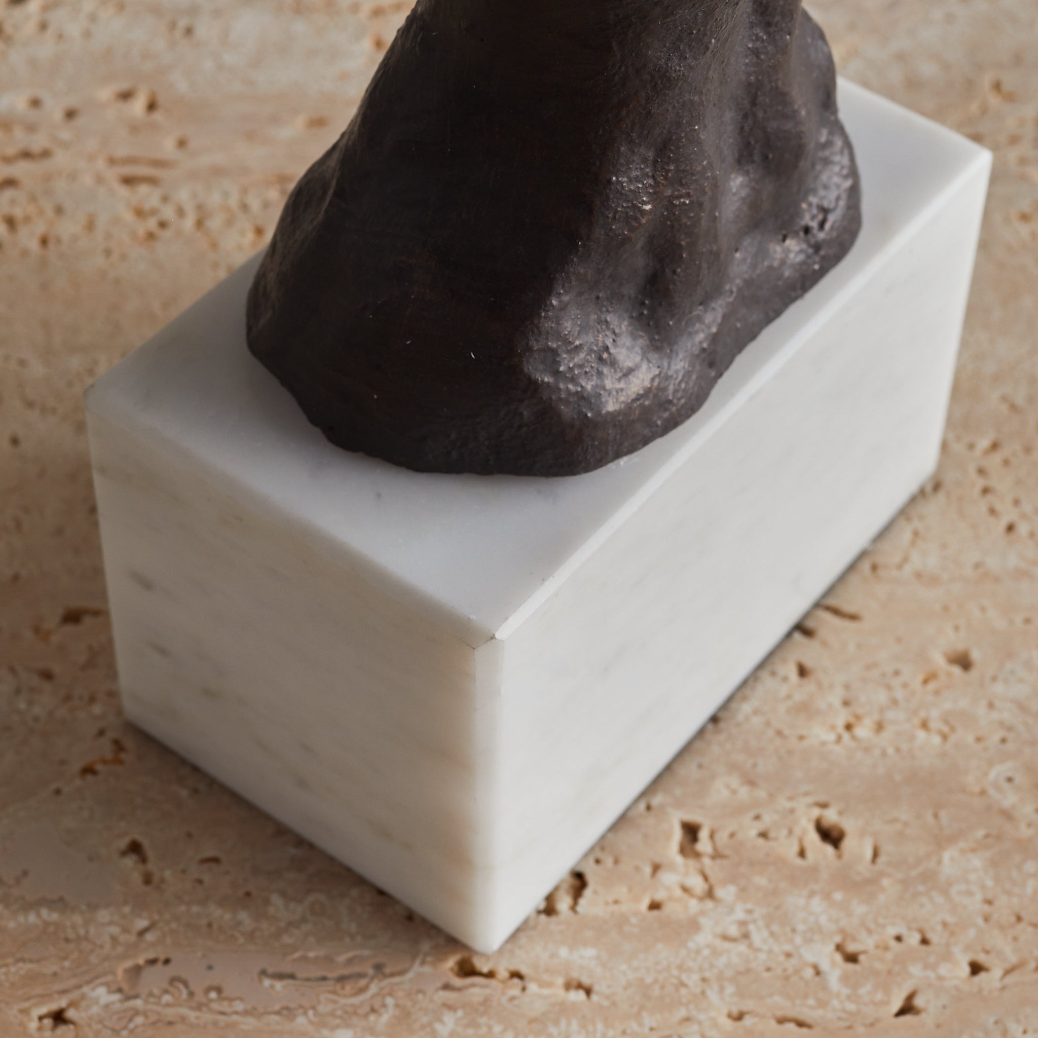 Standing 8.5 inches tall in total, including its white marble pedestal, it’s scaled for a bookshelf, console, or collector’s cabinet.