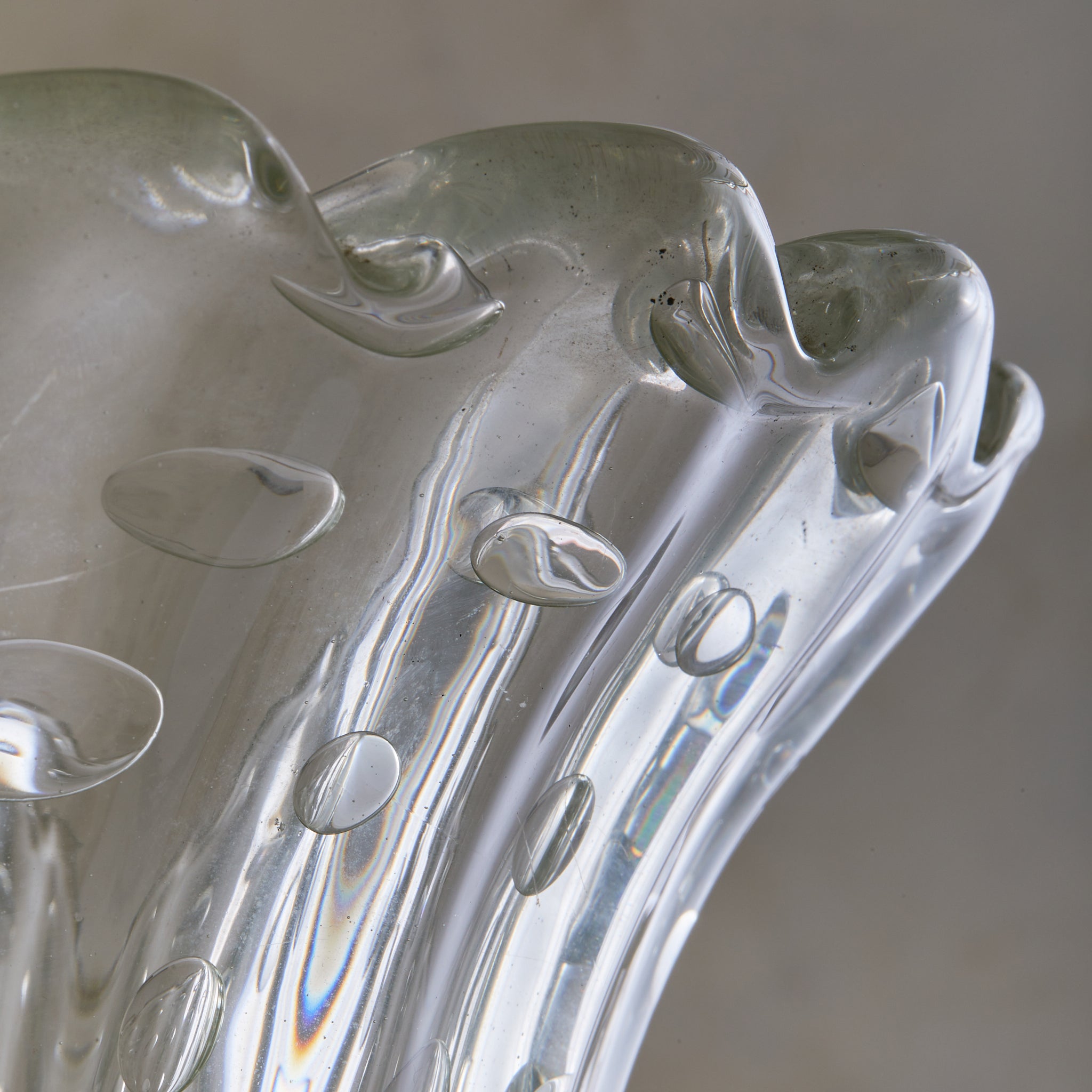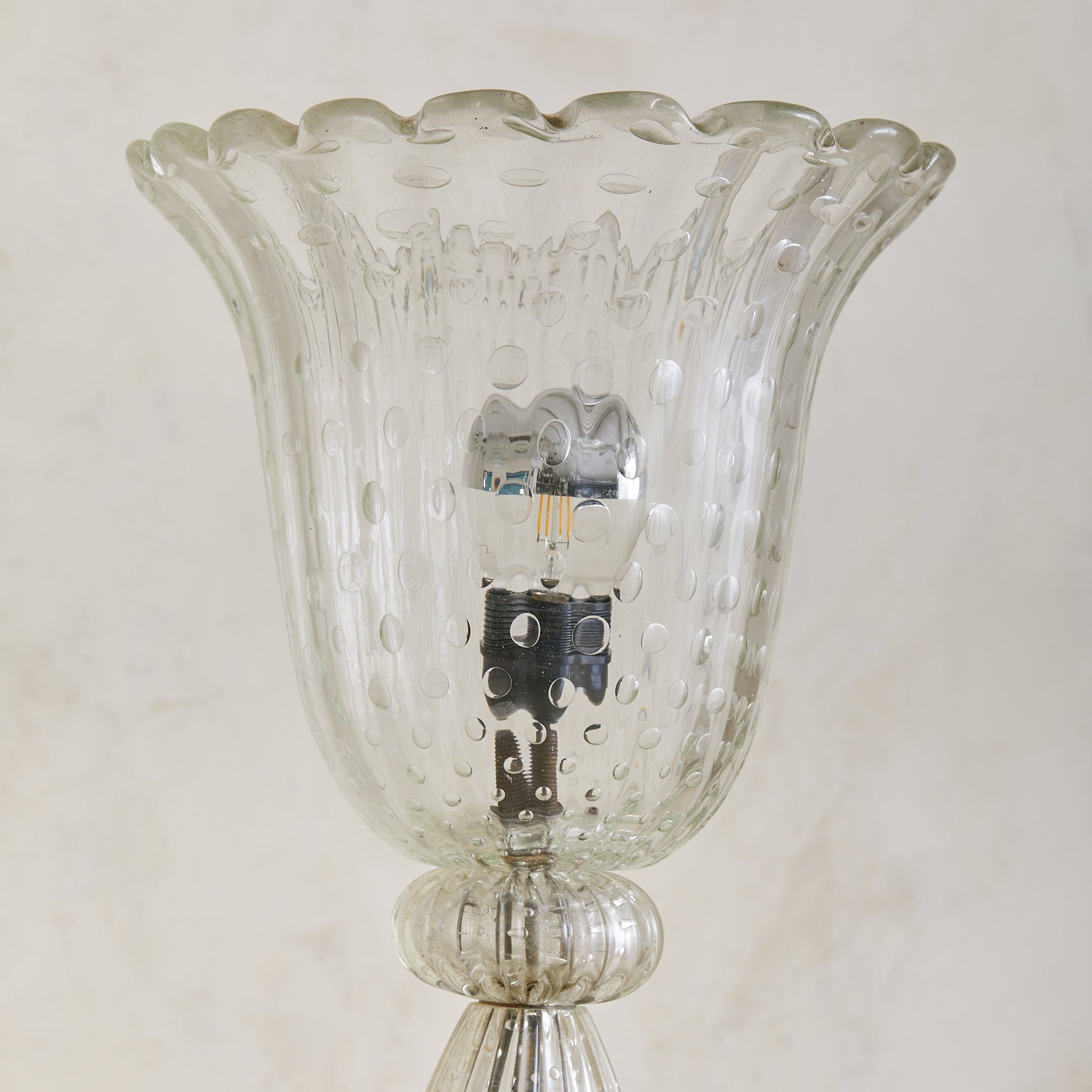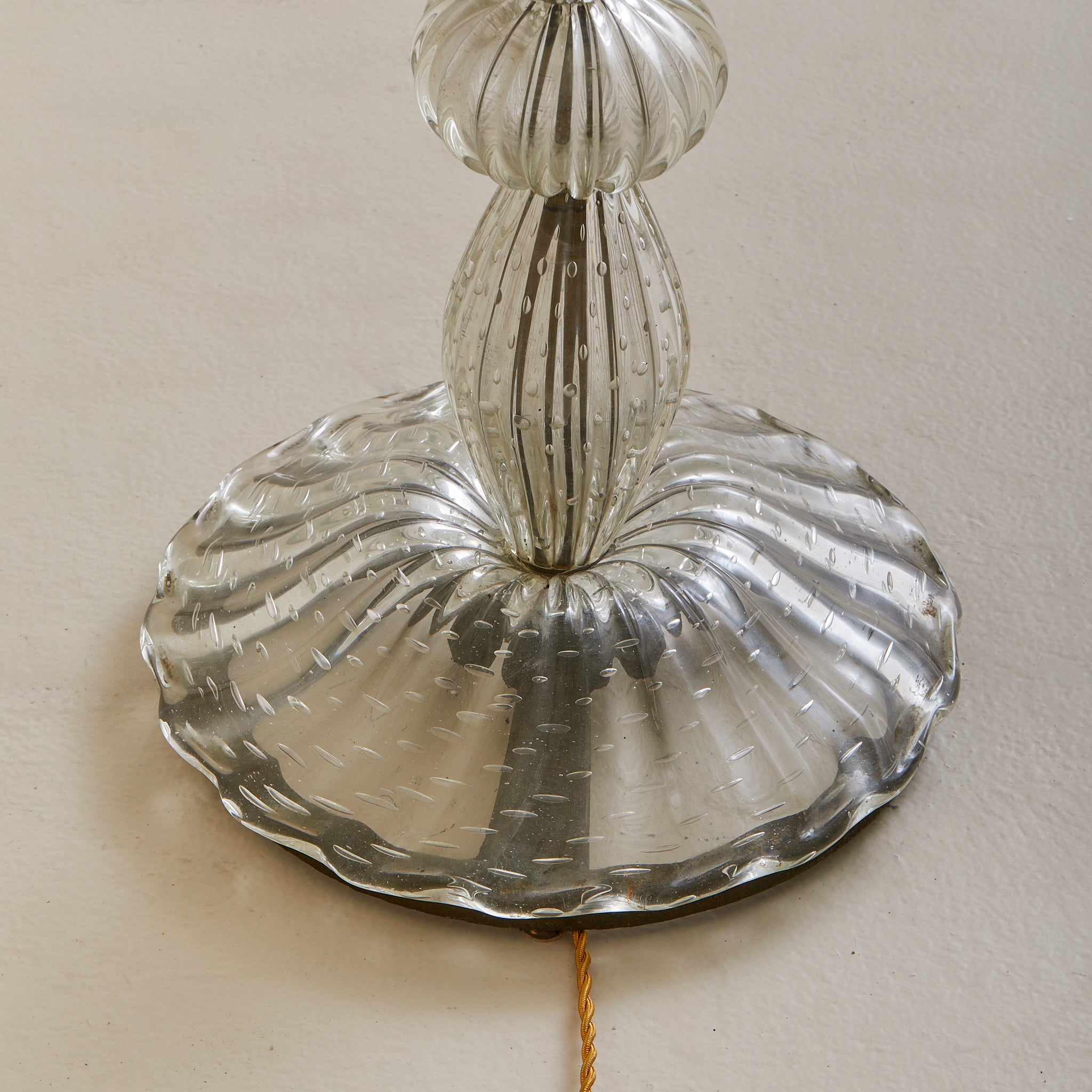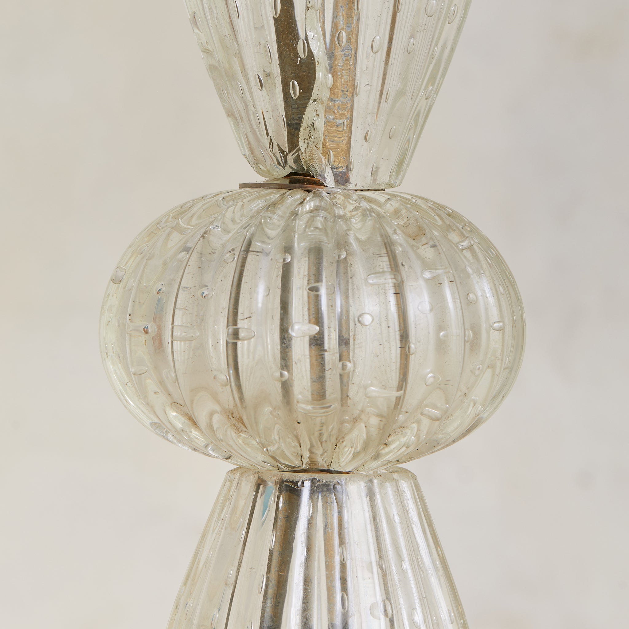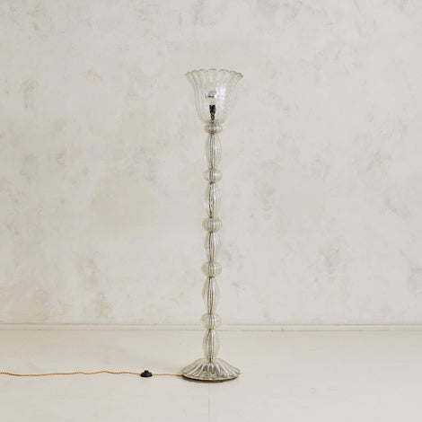 Crafted in the manner of Barovier & Toso, this sculptural floor lamp is composed entirely of handblown transparent Murano glass. The form rises in stacked ribbed segments, alternating in shape and culminating in a scalloped torchiere shade. Each piece is inset with controlled bubbles, or bullicante—a signature technique pioneered by Ercole Barovier—lending the glass an ethereal, effervescent quality.