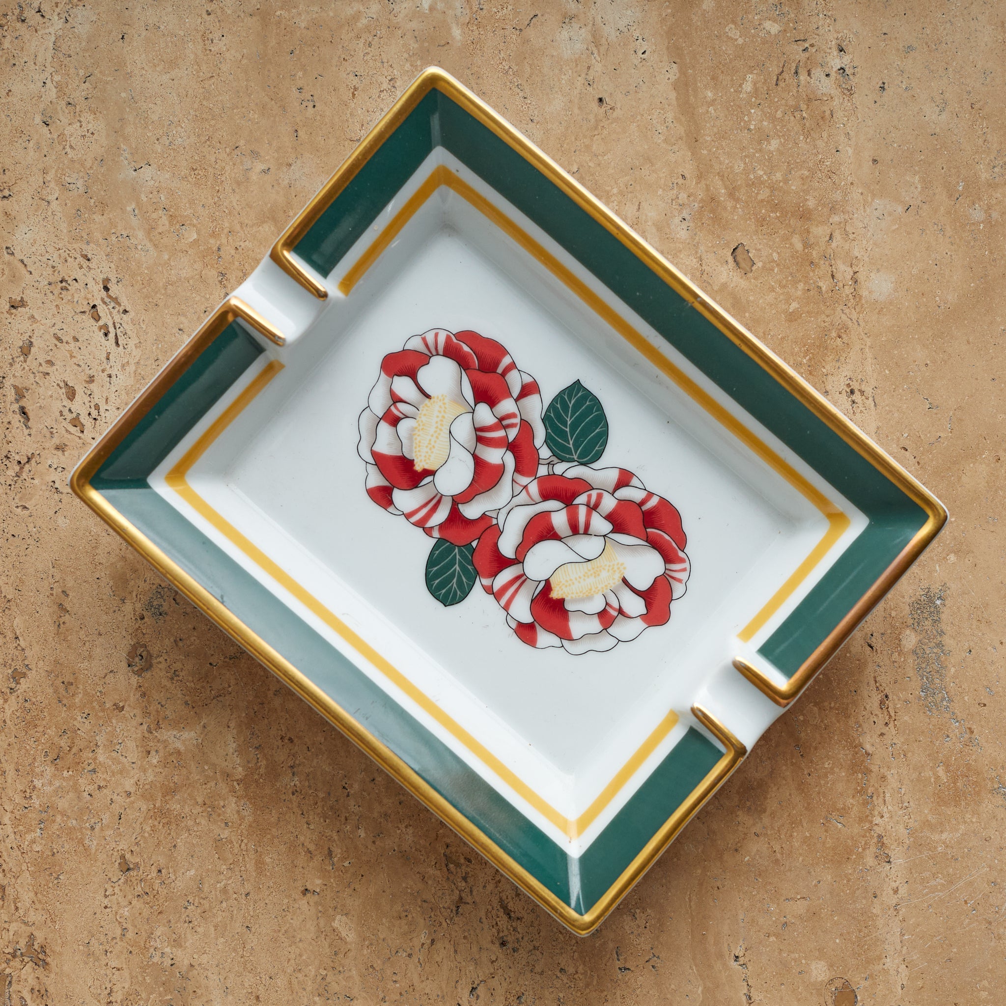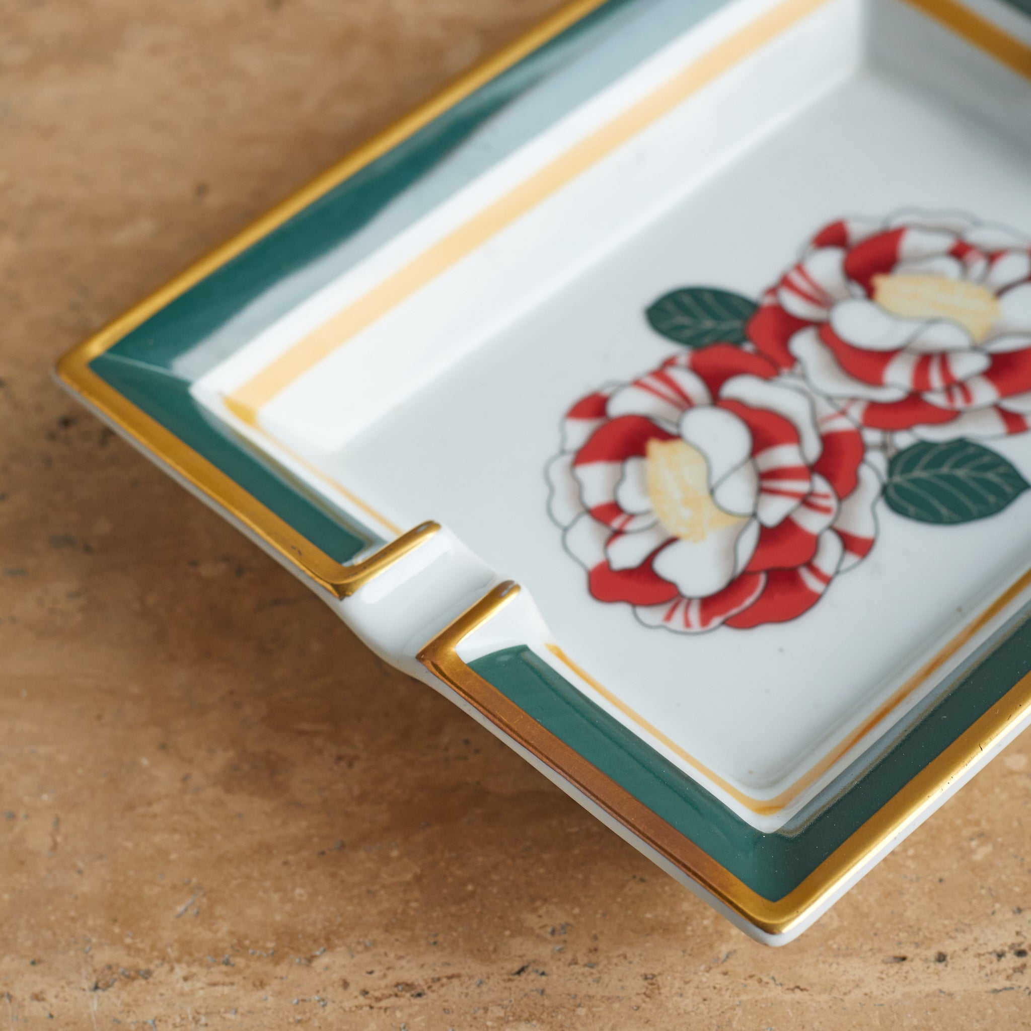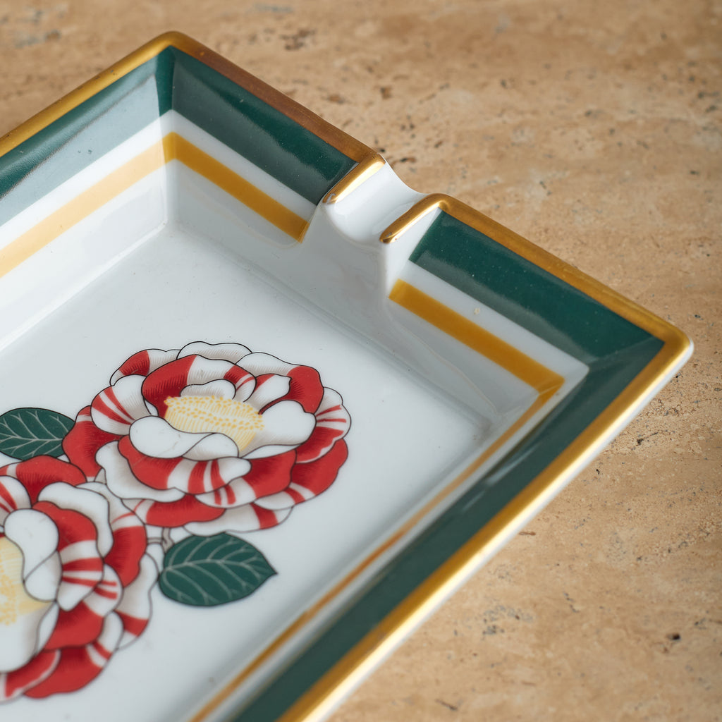 A Hermès porcelain tray featuring red and white camellia blooms, framed by green and mustard-yellow borders with gold trim. A refined blend of function and luxury, with the ‘Hermès - Paris’ mark near the base.
