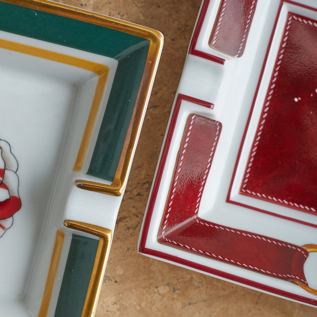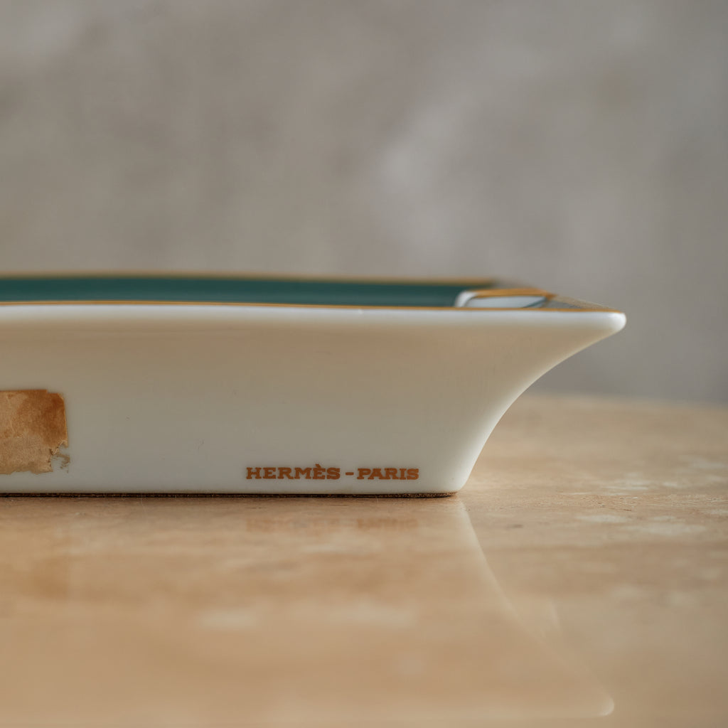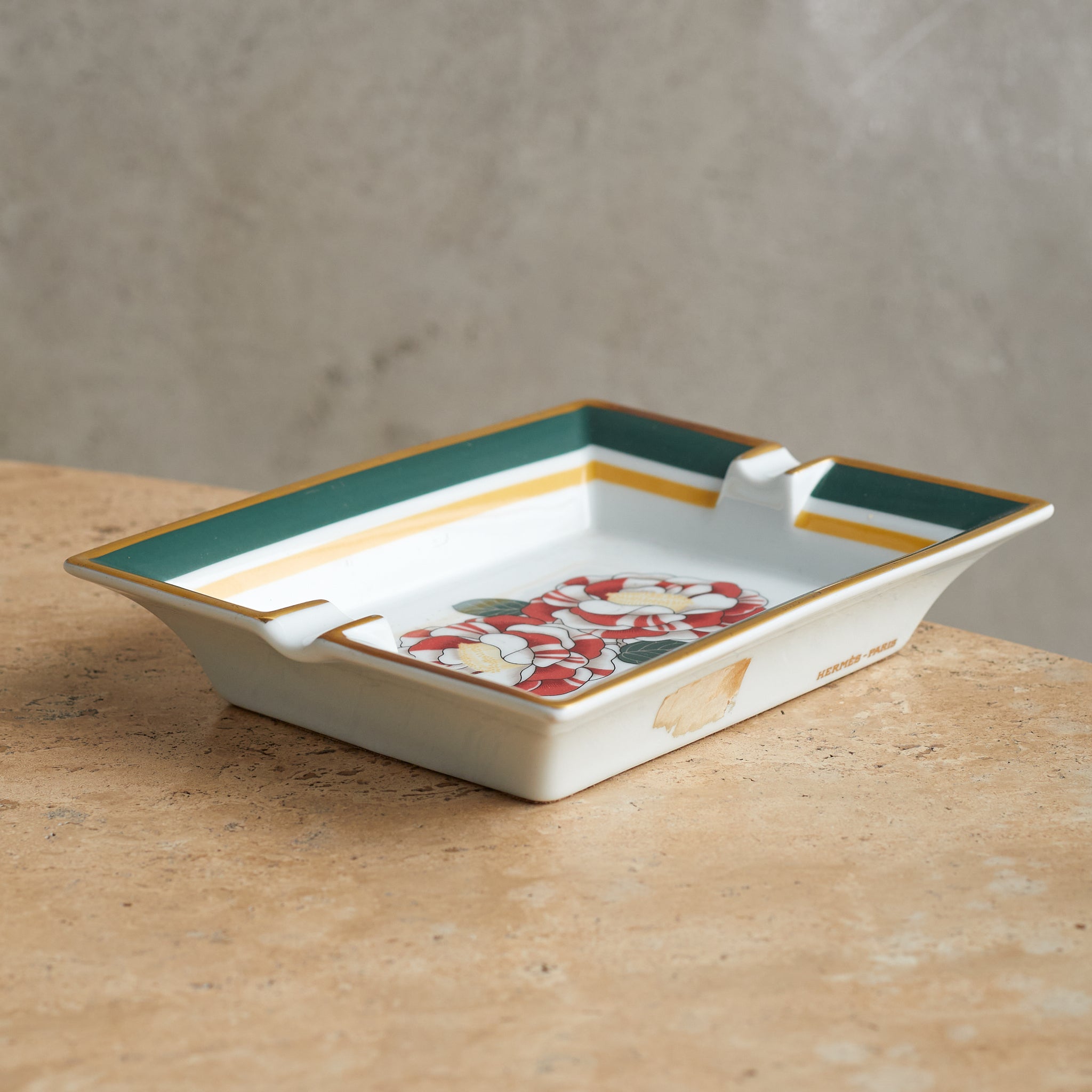 A Hermès porcelain tray featuring red and white camellia blooms, framed by green and mustard-yellow borders with gold trim. A refined blend of function and luxury, with the ‘Hermès - Paris’ mark near the base.