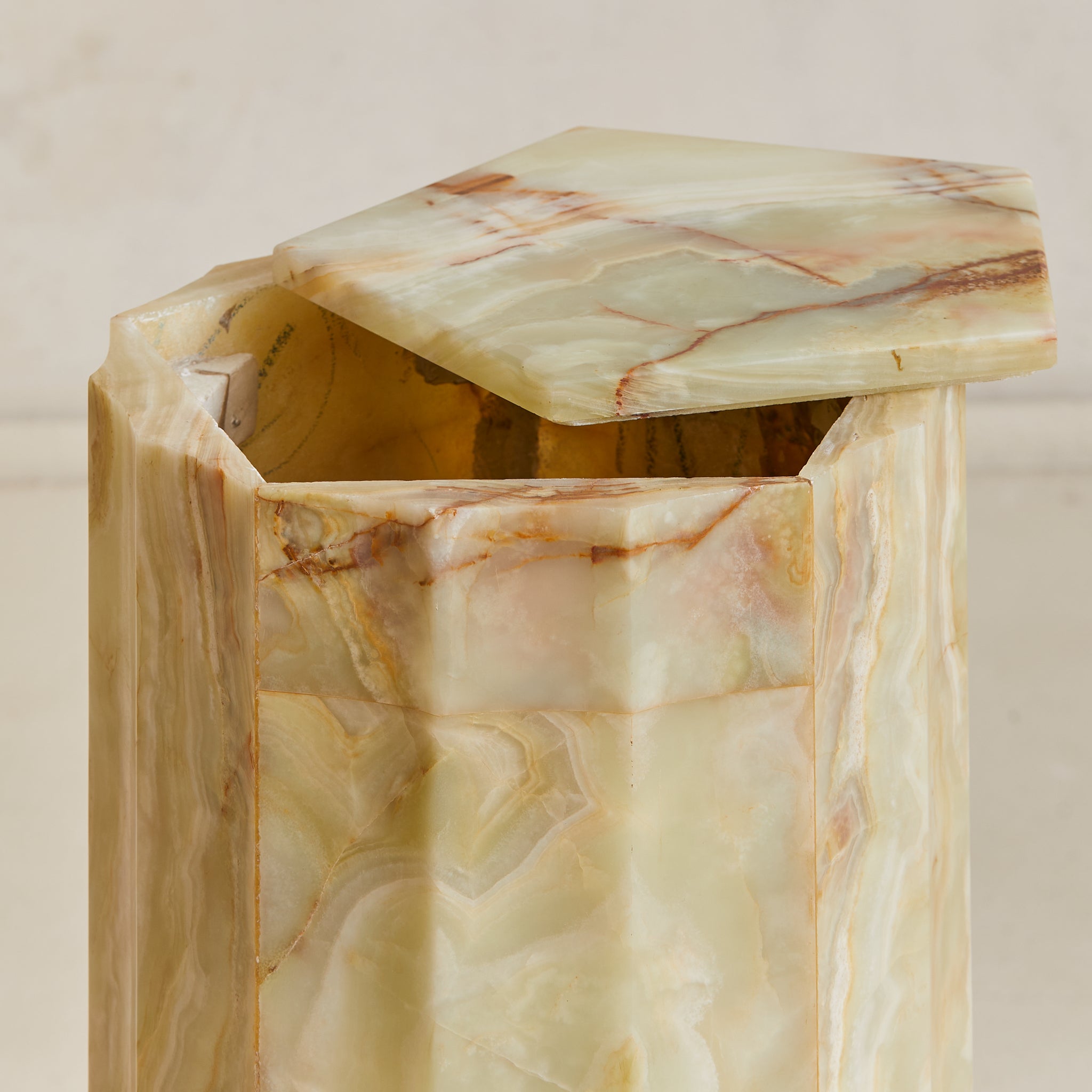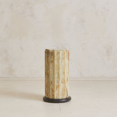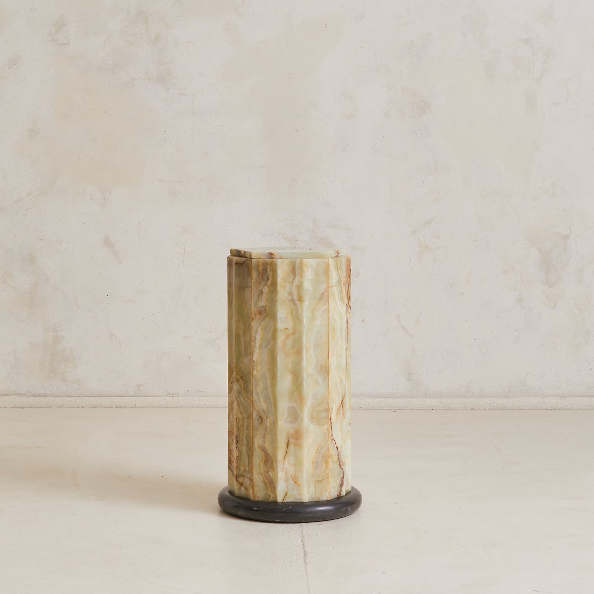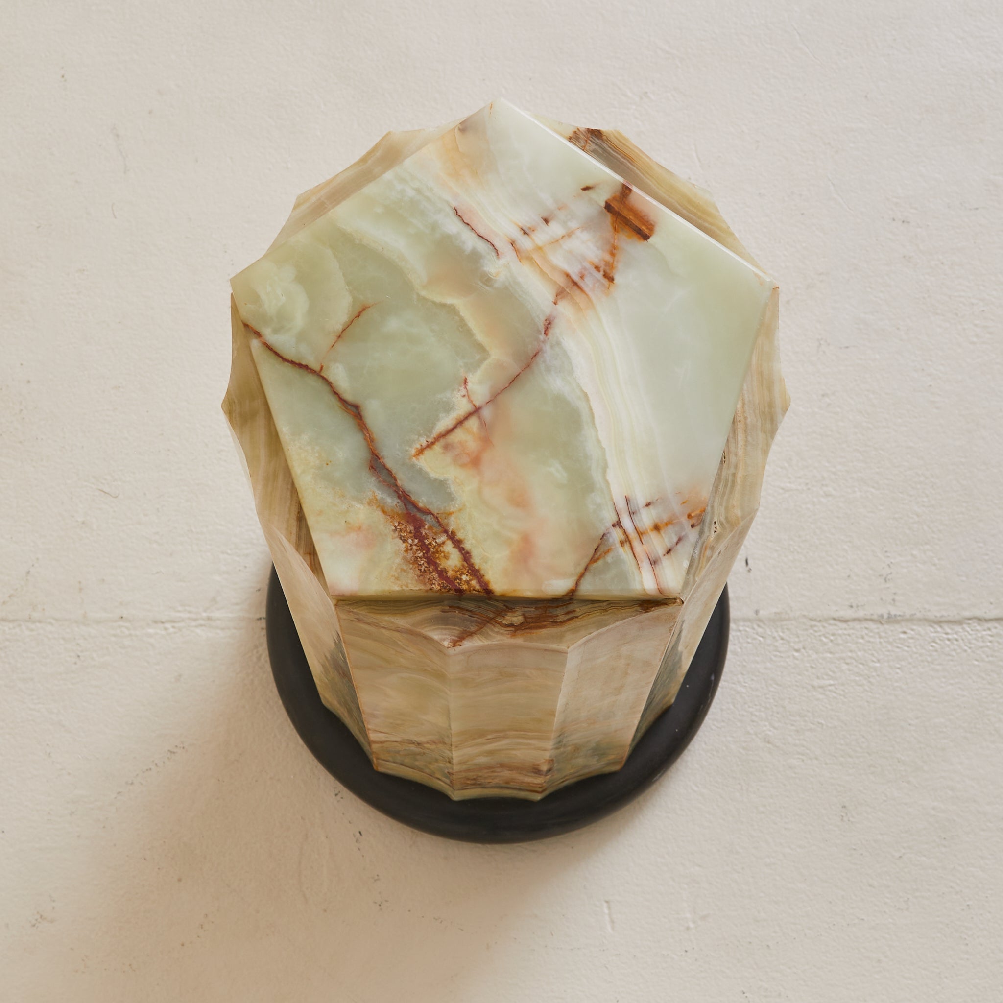 A 1970s pedestal in faceted green onyx, sourced in the South of France. The fifteen-sided form rests on a deep charcoal marble base, its geometry crisp and sculptural. The onyx surface shimmers with tonal variation—translucent layers of celadon, amber, rust, and ecru that shift with the light.
