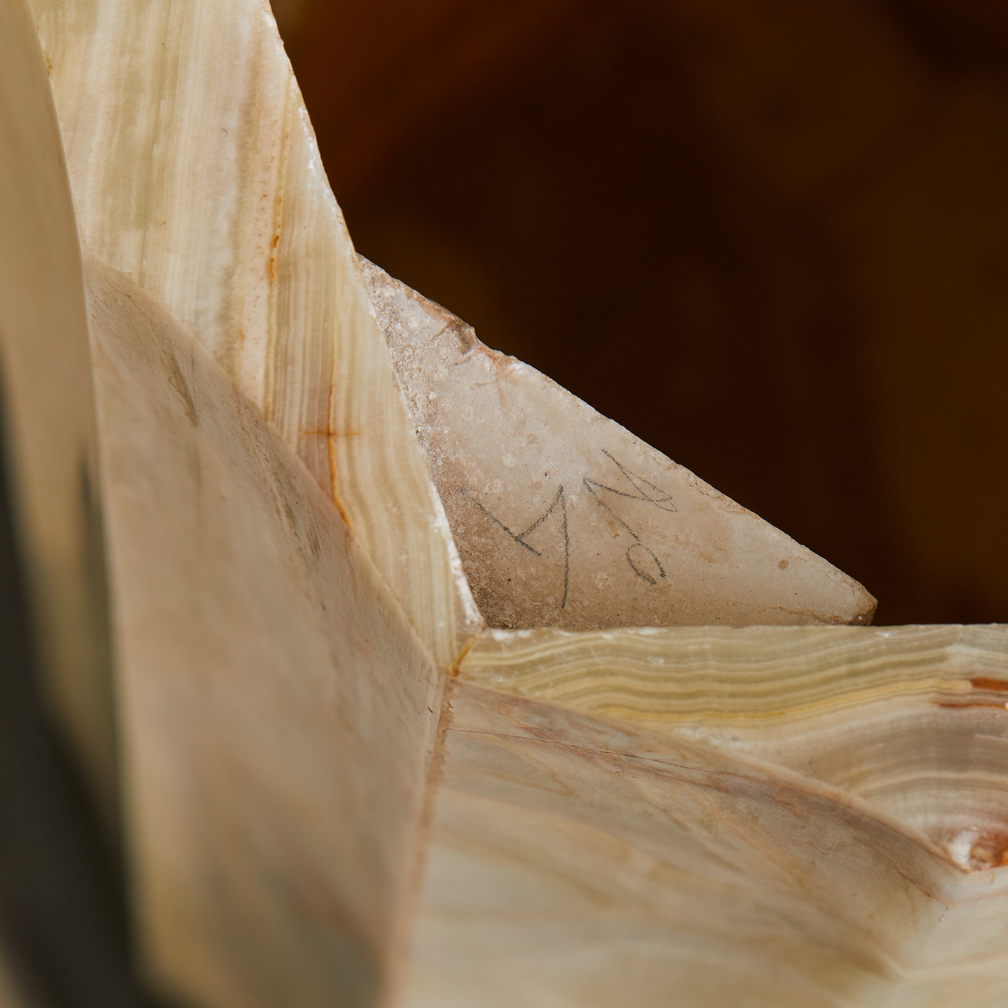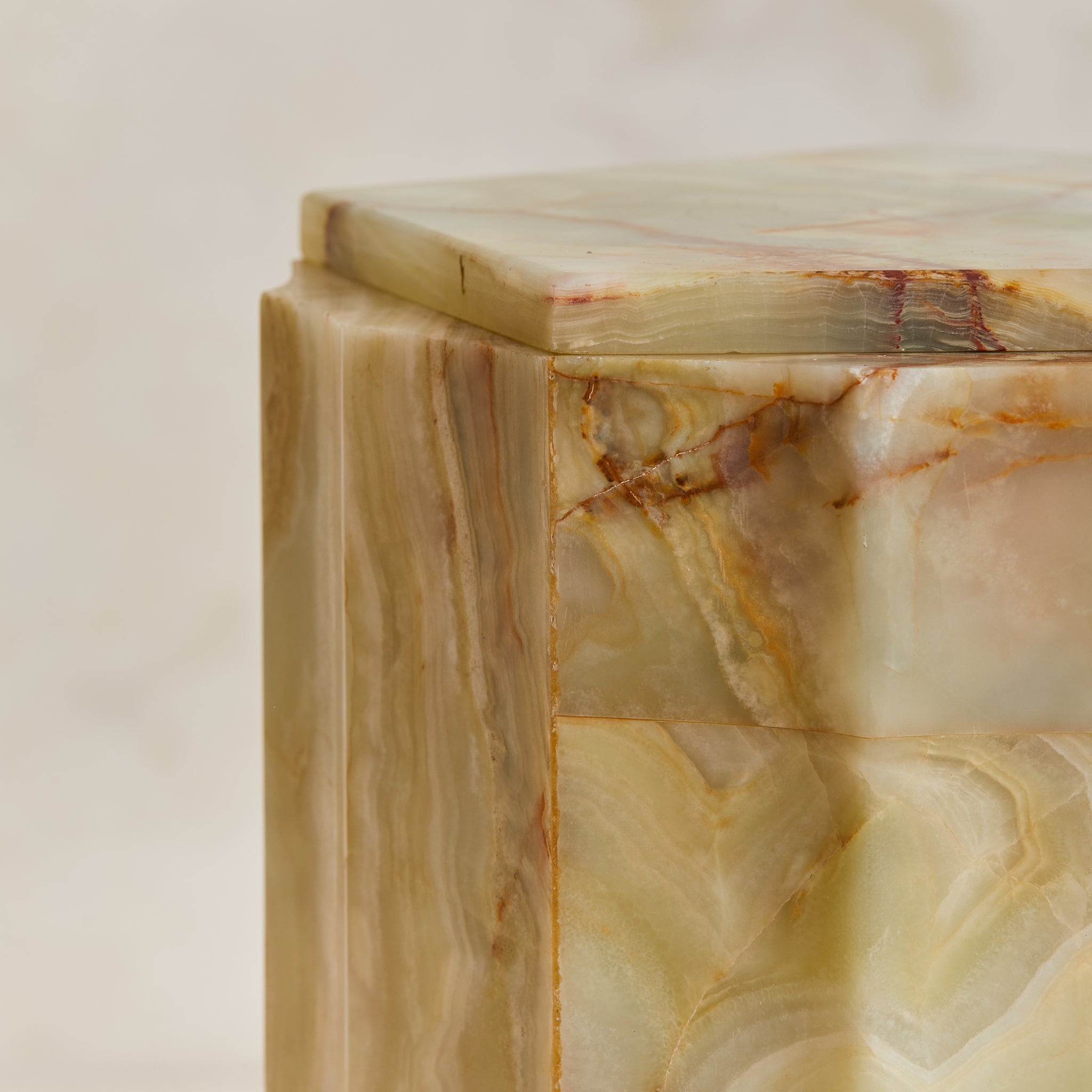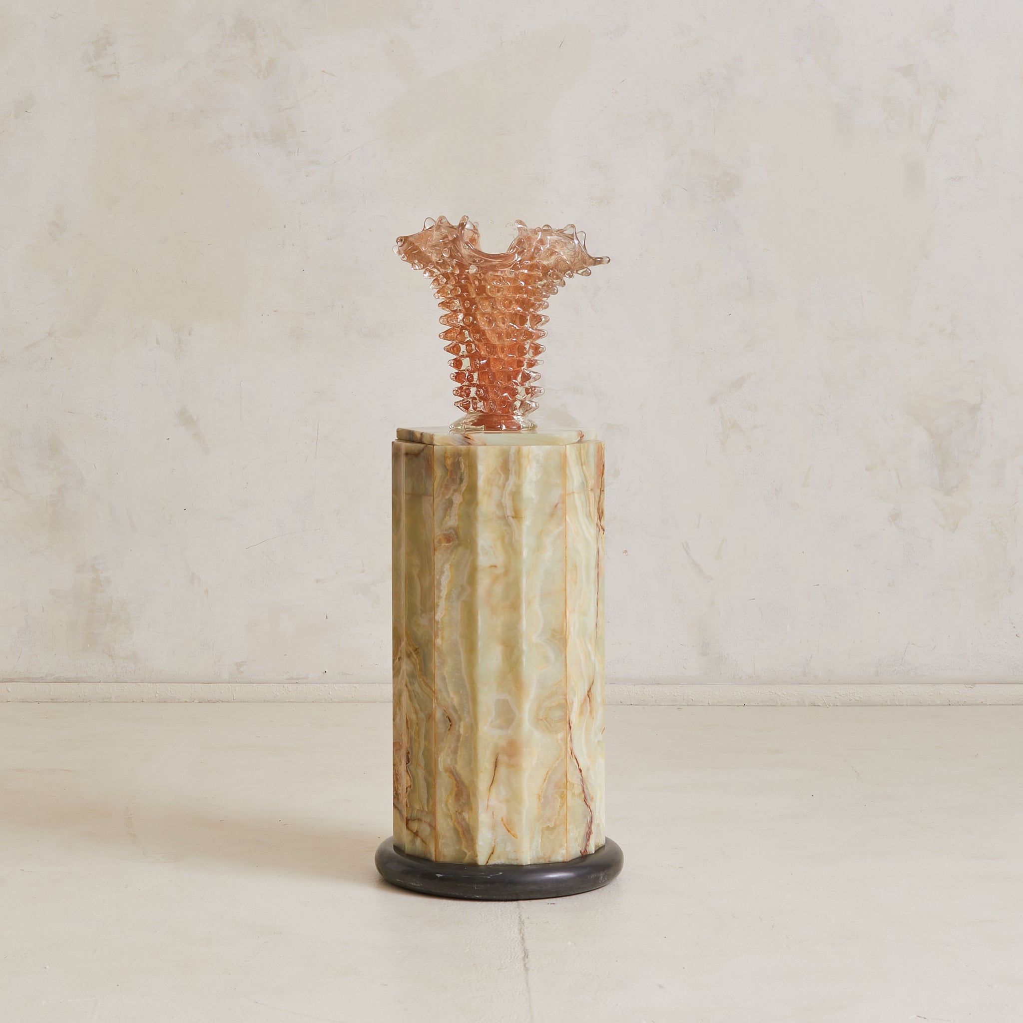 A 1970s pedestal in faceted green onyx, sourced in the South of France. The fifteen-sided form rests on a deep charcoal marble base, its geometry crisp and sculptural. The onyx surface shimmers with tonal variation—translucent layers of celadon, amber, rust, and ecru that shift with the light.