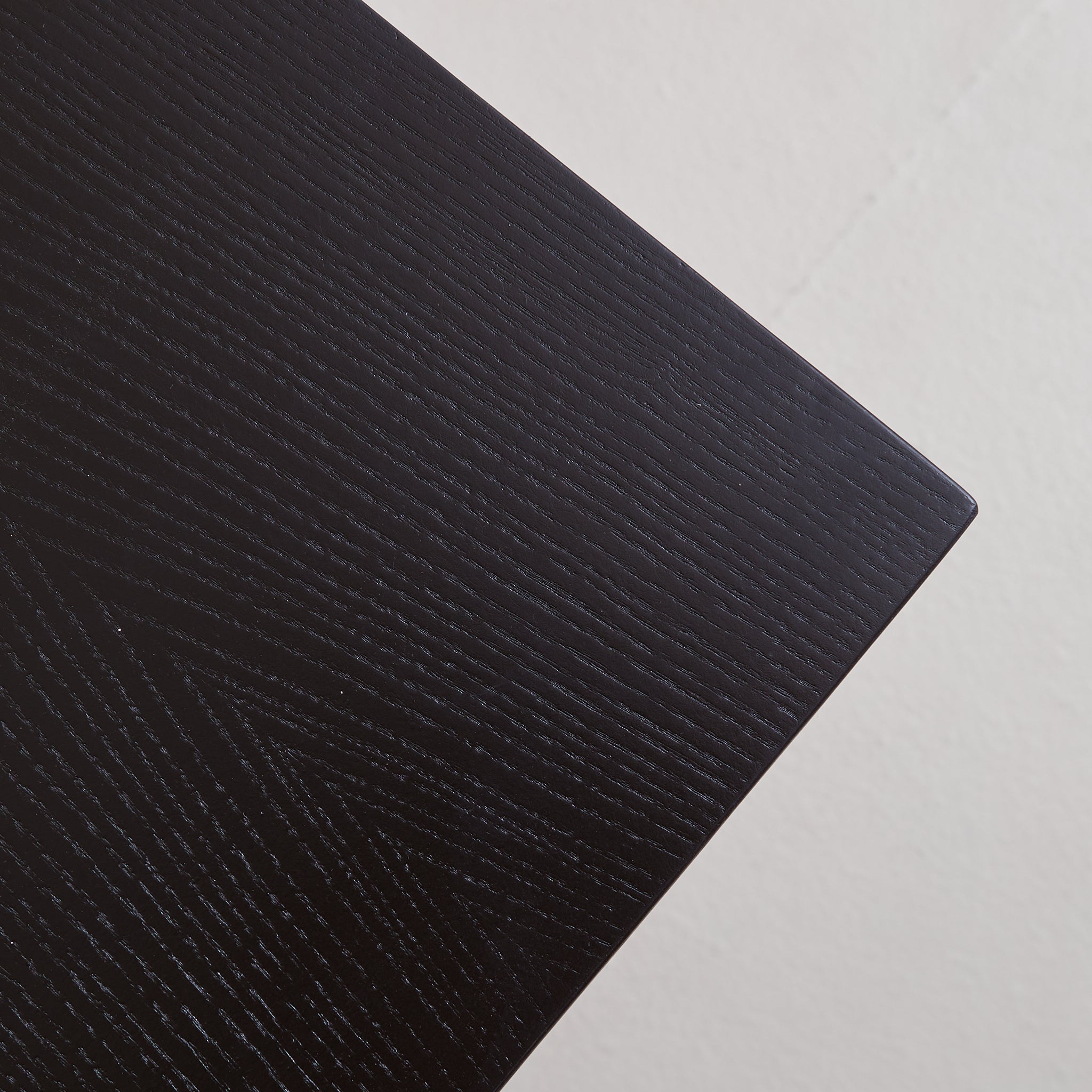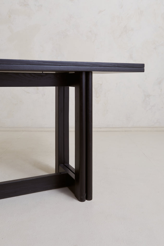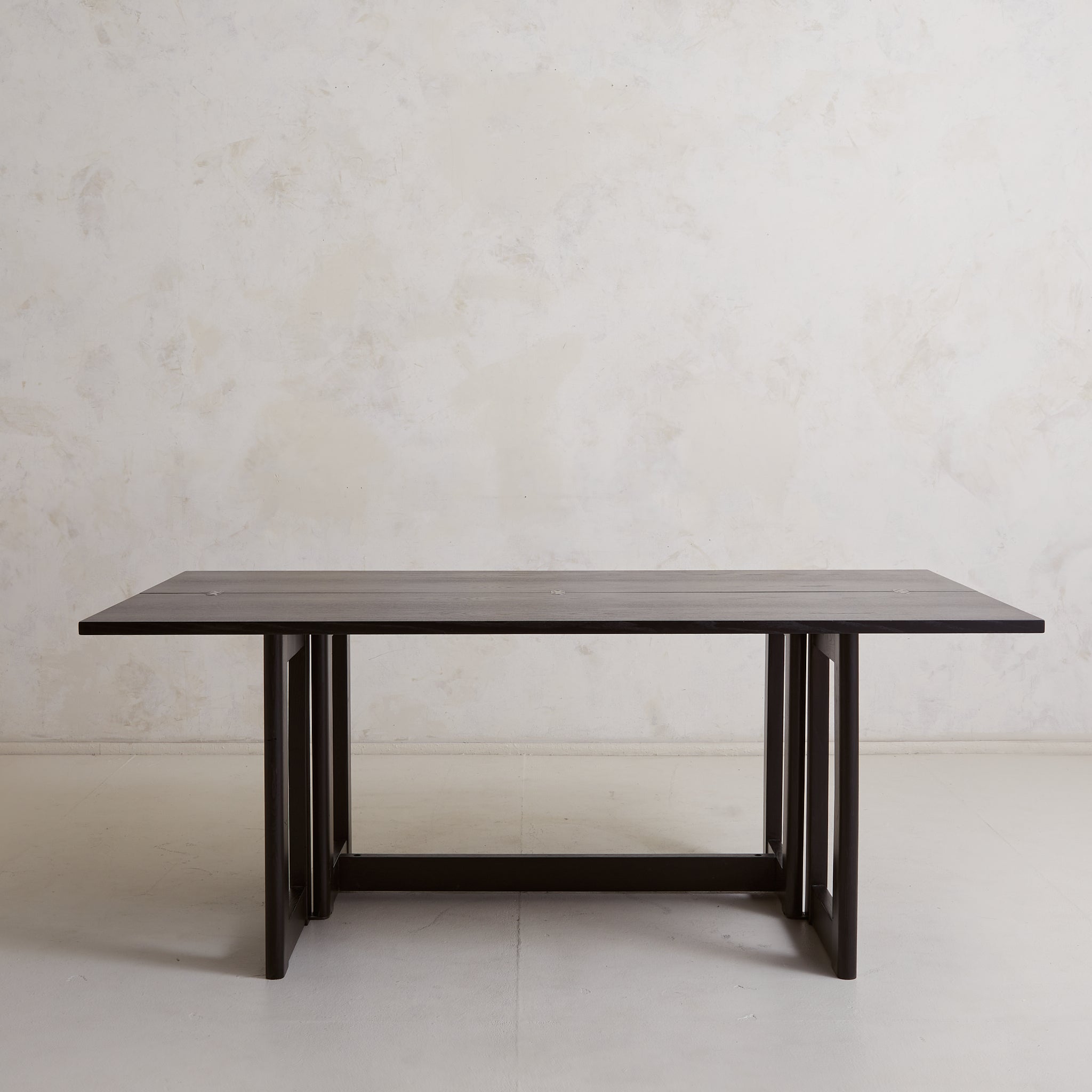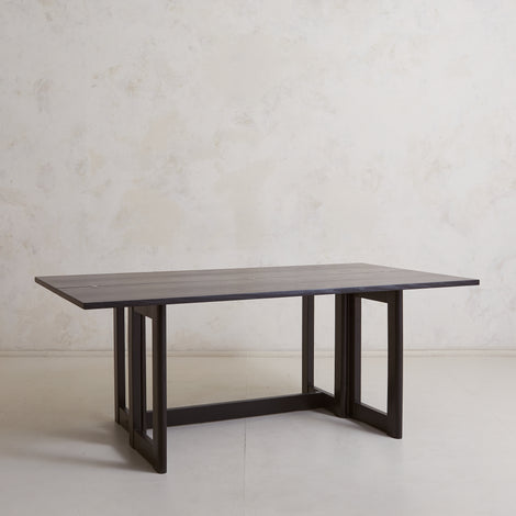 A 1970s foldable ash wood table featuring a rich ebonized finish that highlights the painterly wood grain. Both the legs and top extend to create a larger surface area the scale of a large dining table; when folded in - this serves elegantly as a console table. Unmarked. Sourced in France, 1970s.