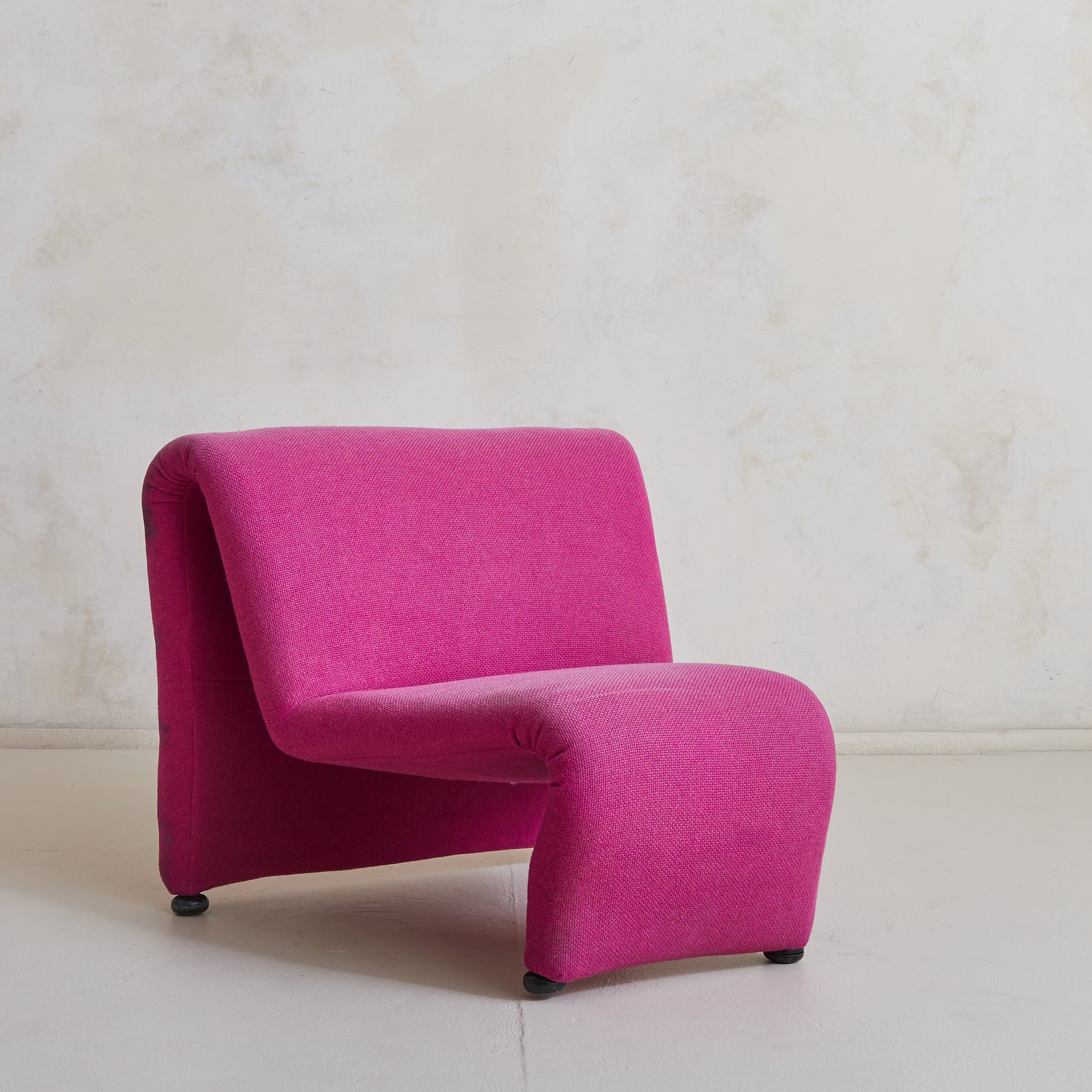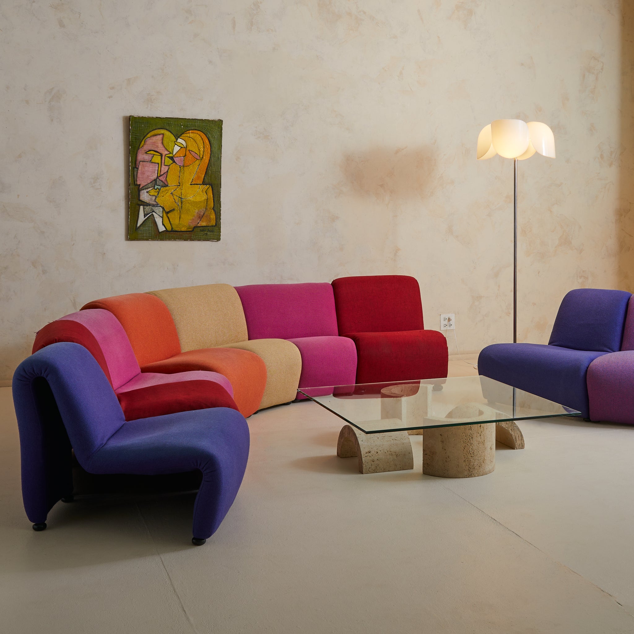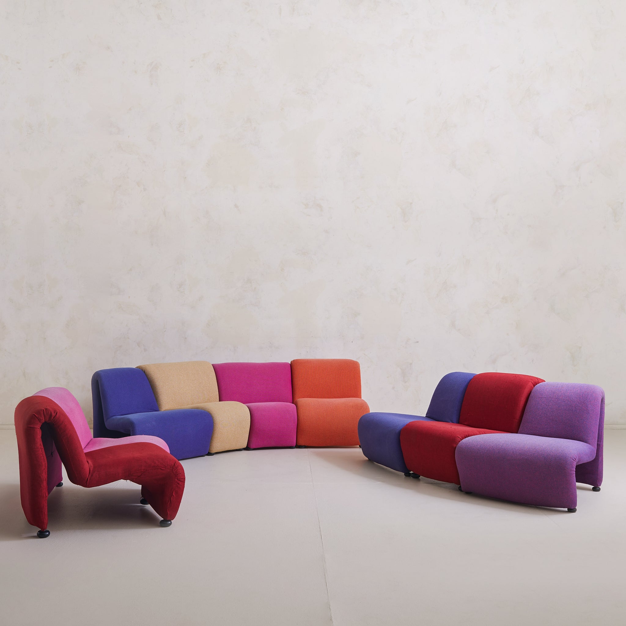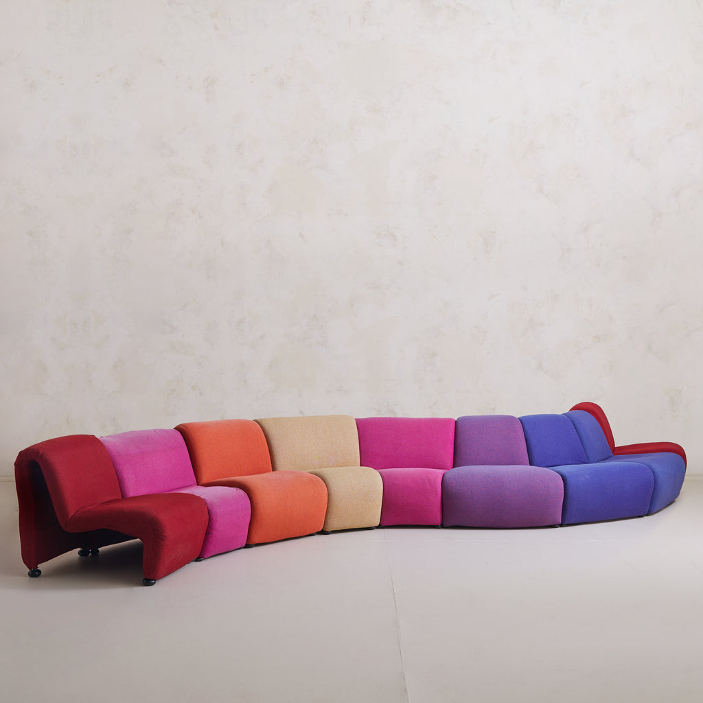 This rare nine-piece serpentine sectional—attributed to French designer Étienne Fermigier, 1970s—channels the modular exuberance of postmodern living. Each bulbous module retains its original upholstery in a saturated spectrum from oxblood to fuchsia to Yves Klein blue, resting playfully on Fermigier’s signature rubber ball feet.