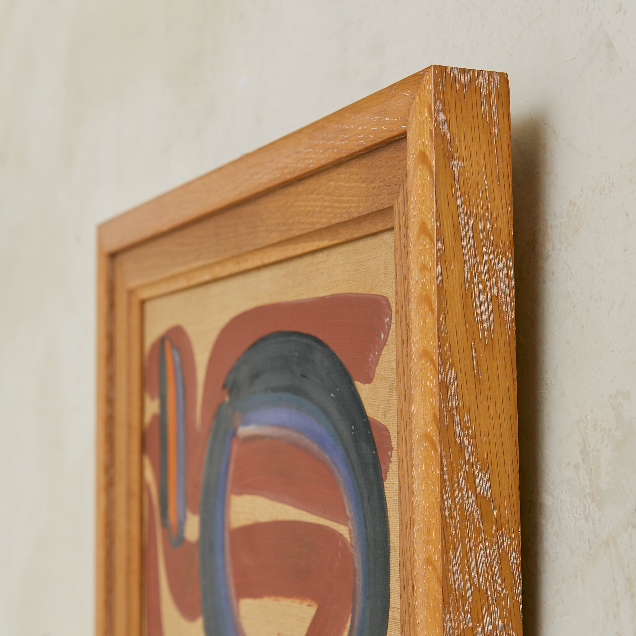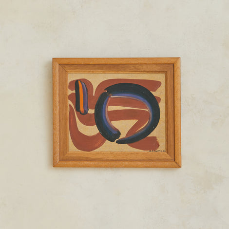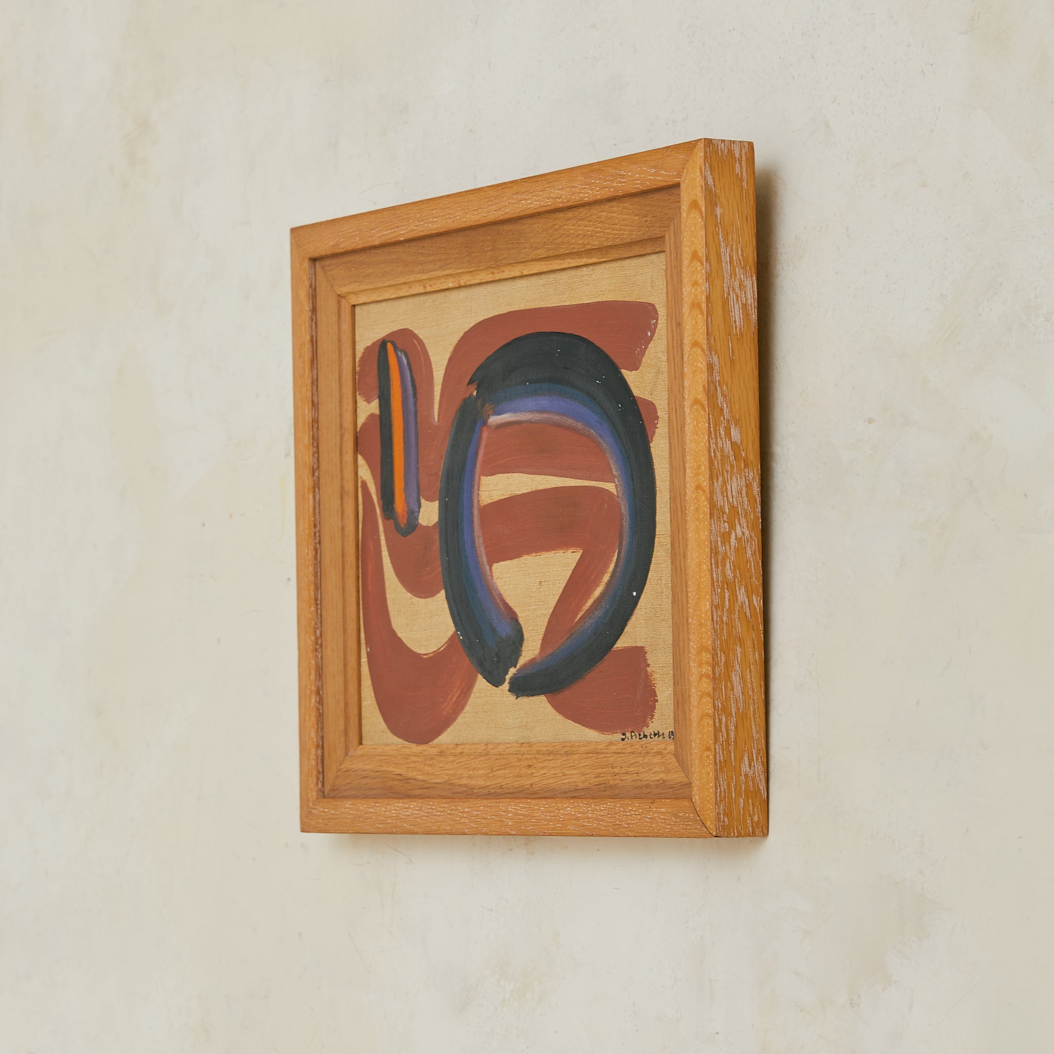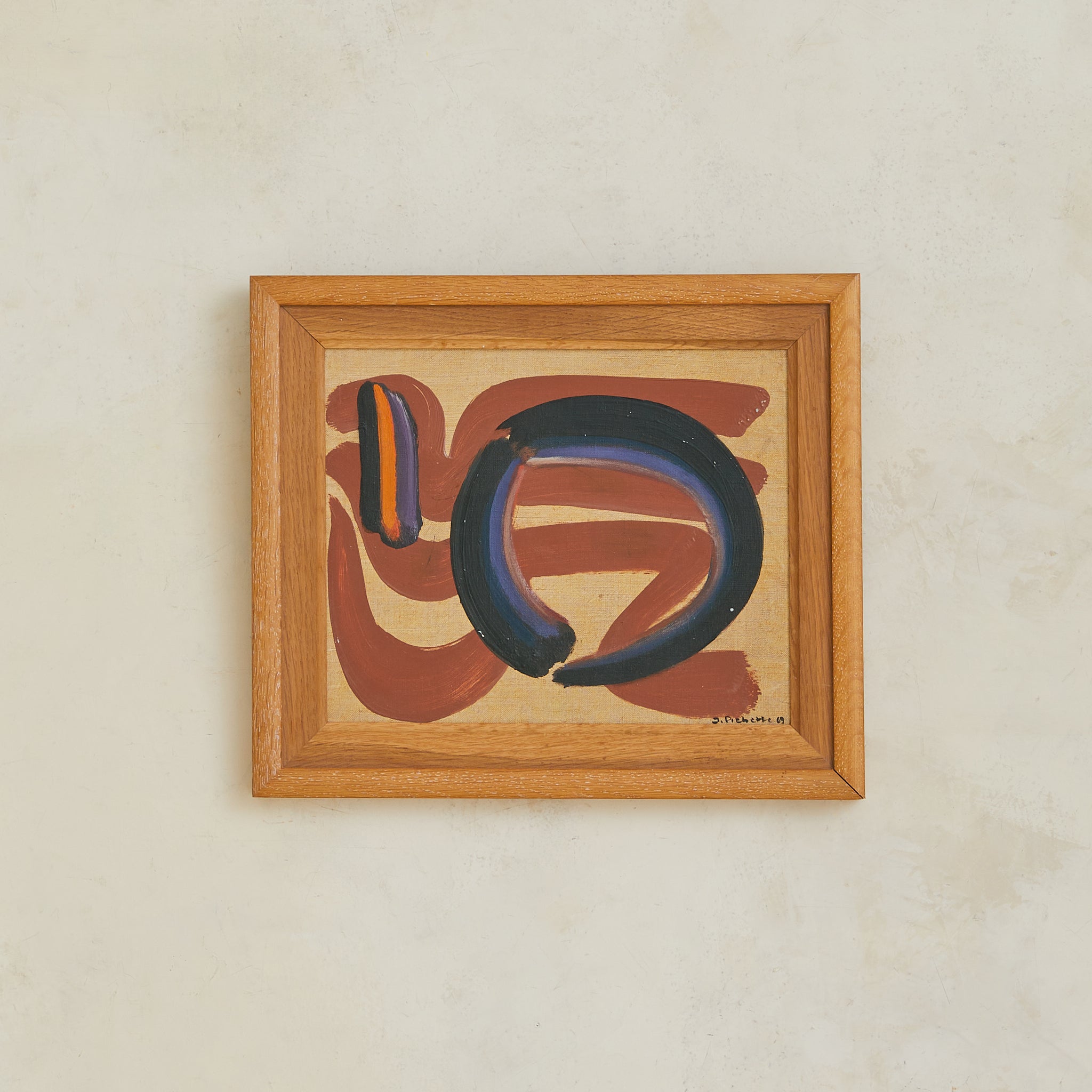 An abstract oil on canvas painting by French artist James Pichette, dated 1969. Gestural strokes of earthy terracotta intertwine with a sweeping arc of deep indigo and violet, offset by sharp accents of orange. The composition is dynamic yet balanced, revealing Pichette’s lyrical approach to abstraction during the postwar era. Housed in a wood frame, the work bears both the artist’s painted signature and inscription to the reverse.