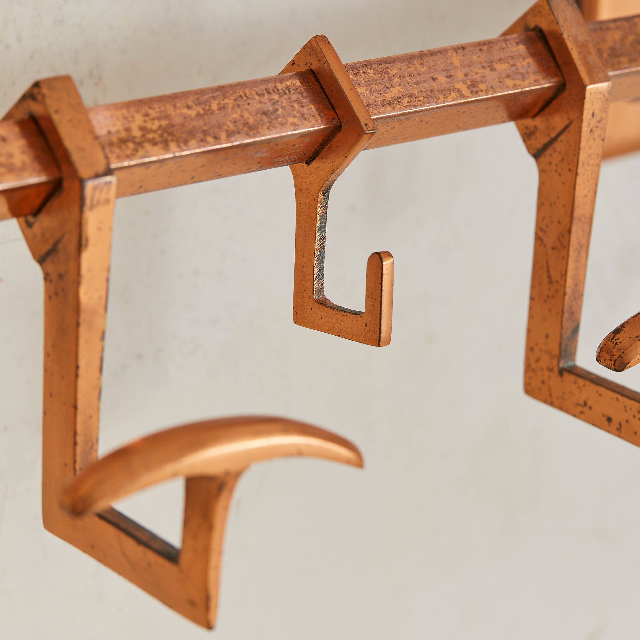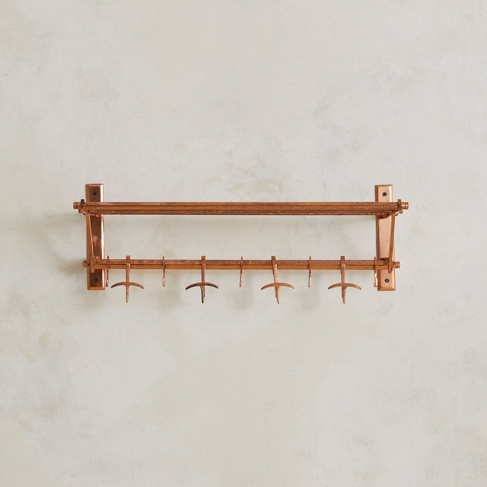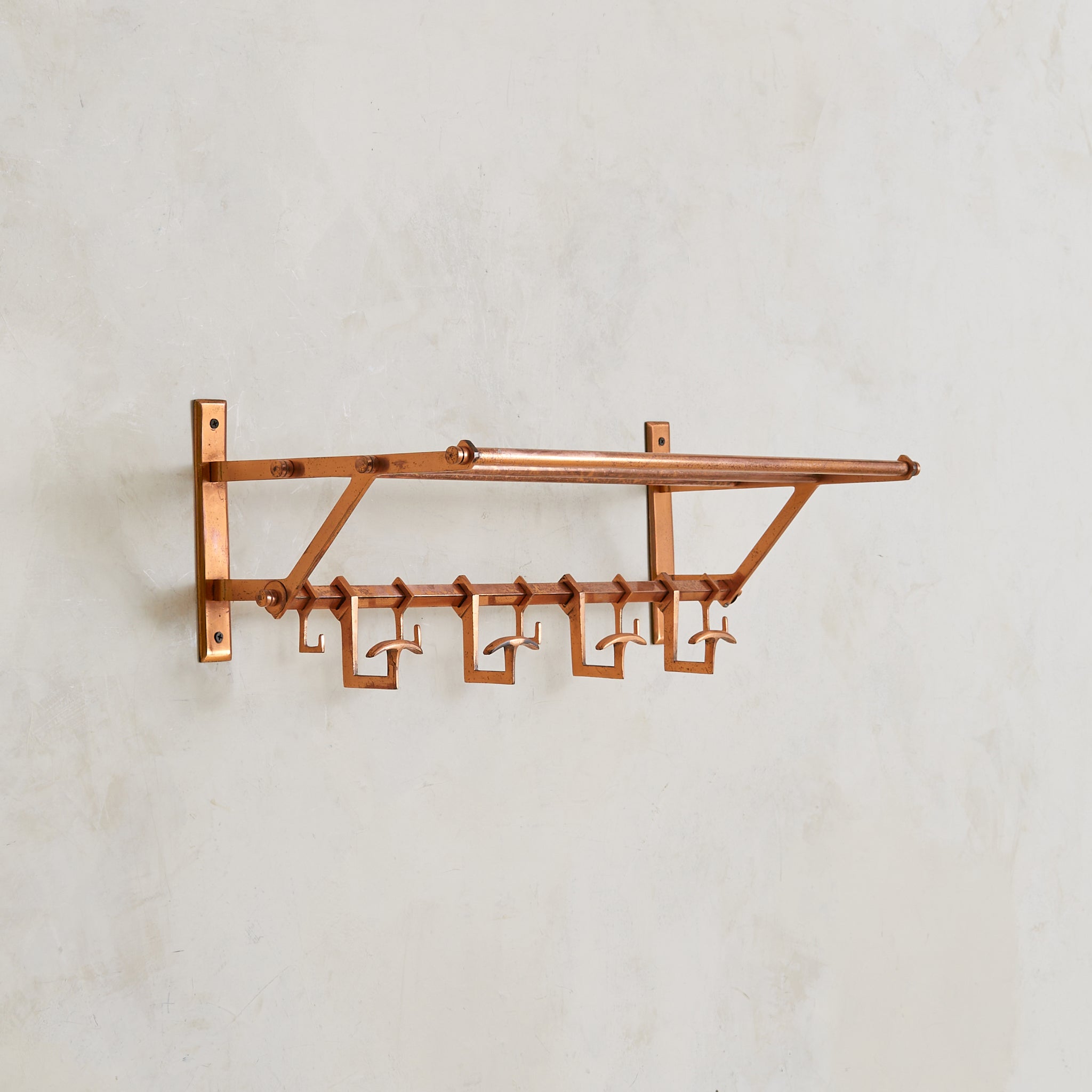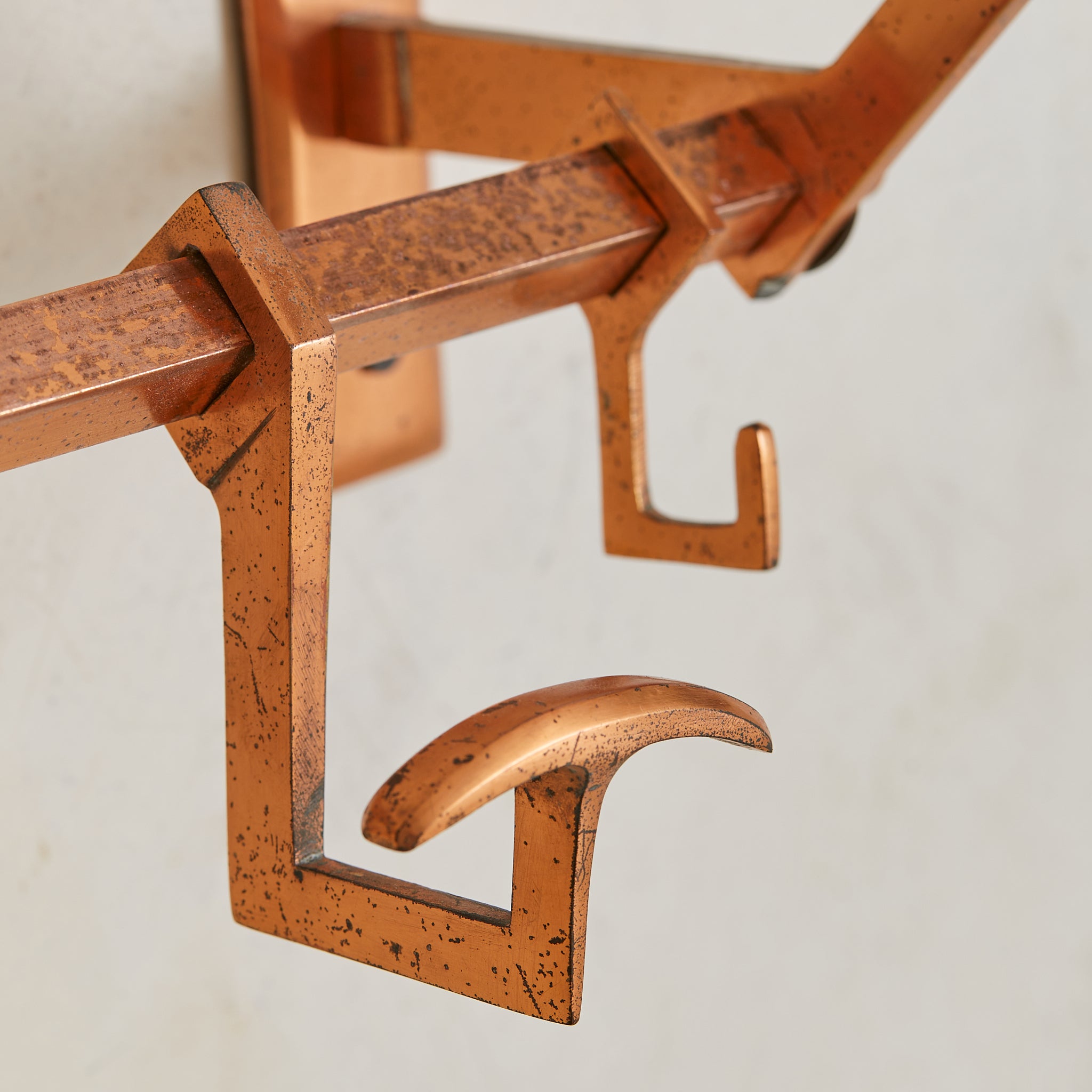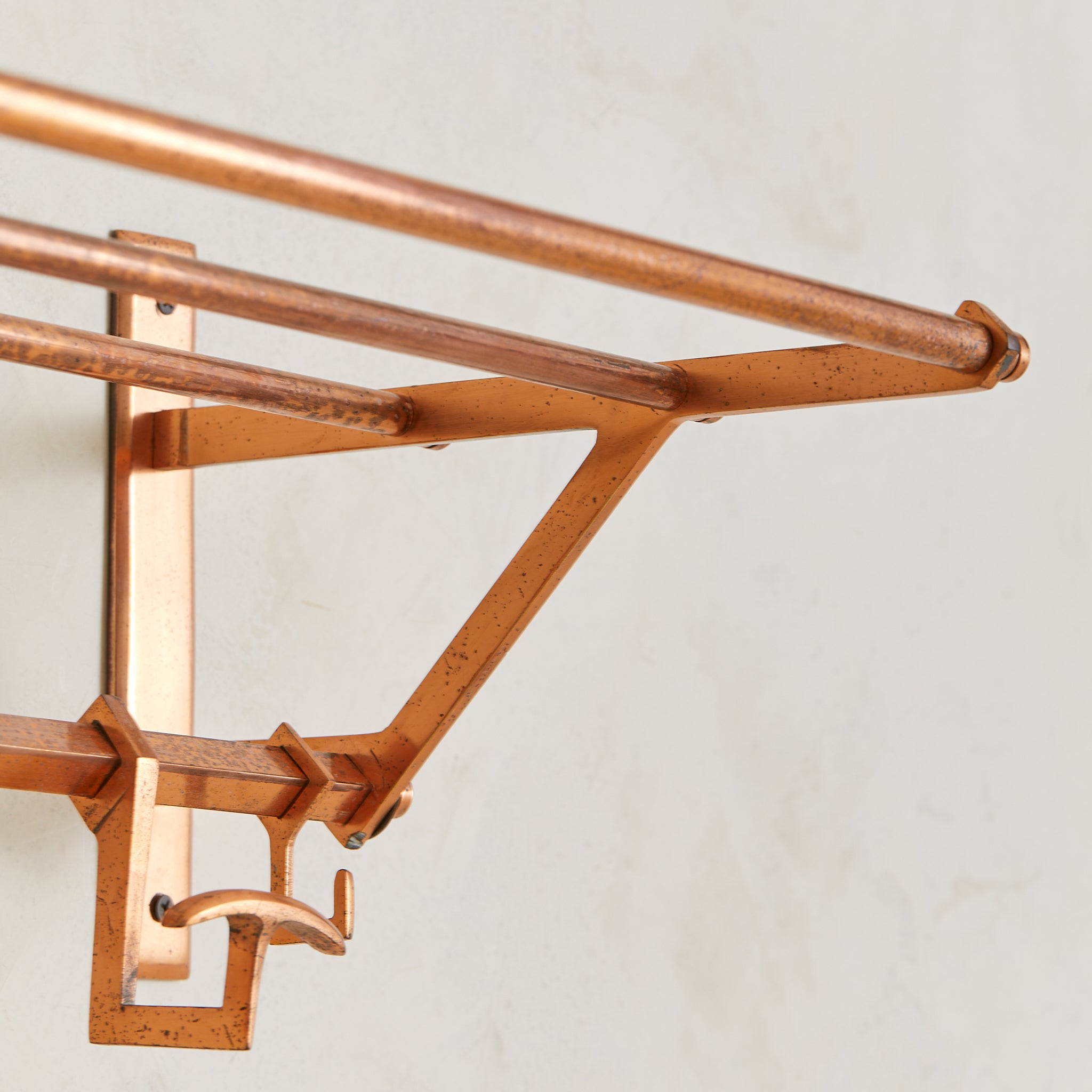 A 1930s French Art Deco coat rack in copper. Just over two feet wide, the design is architectural and compact—structured in a tri-rail frame with angular supports and a row of sliding hooks. Functional and sculptural, with a forward-leaning silhouette that floats cleanly off the wall. Elegant in a small entry or bath.