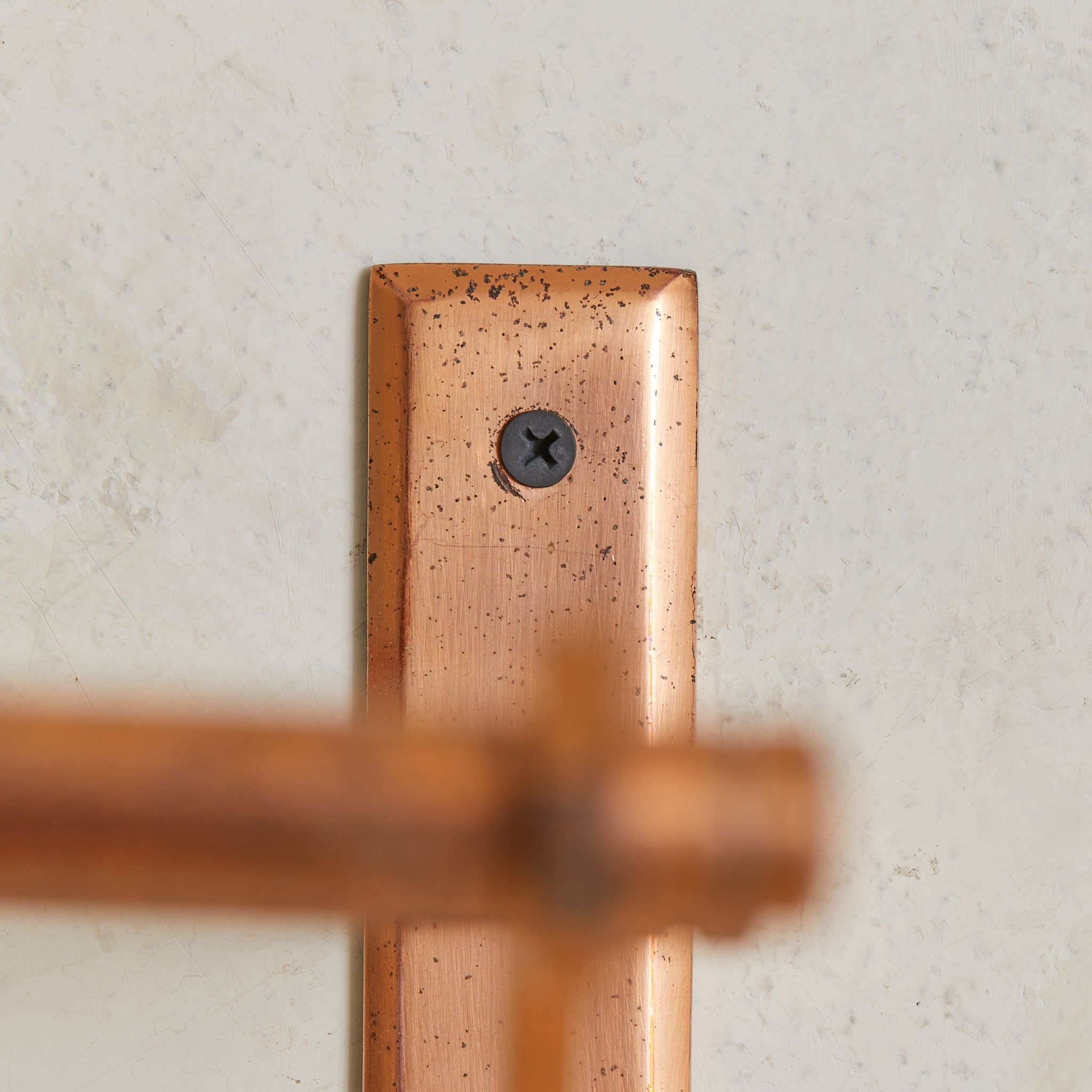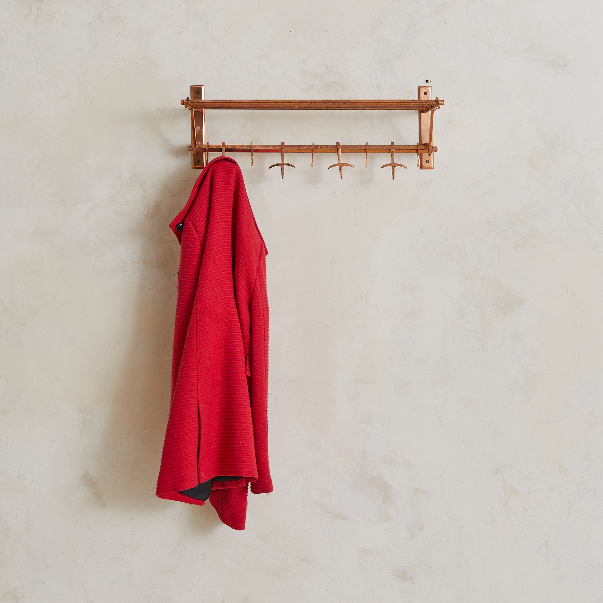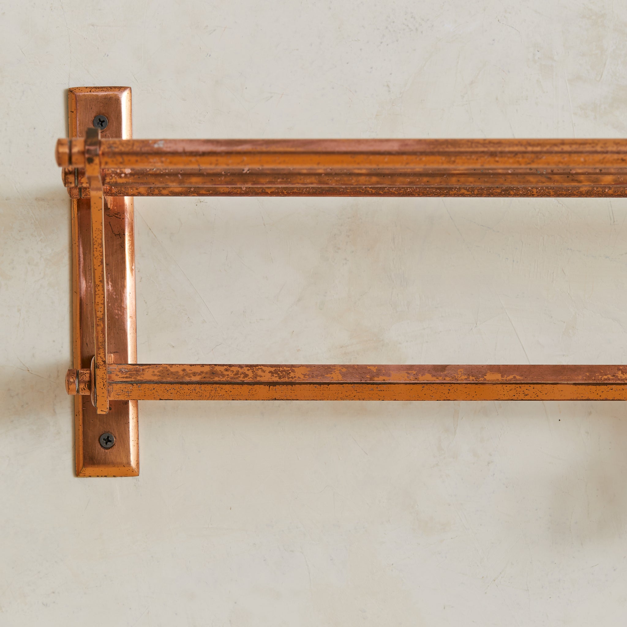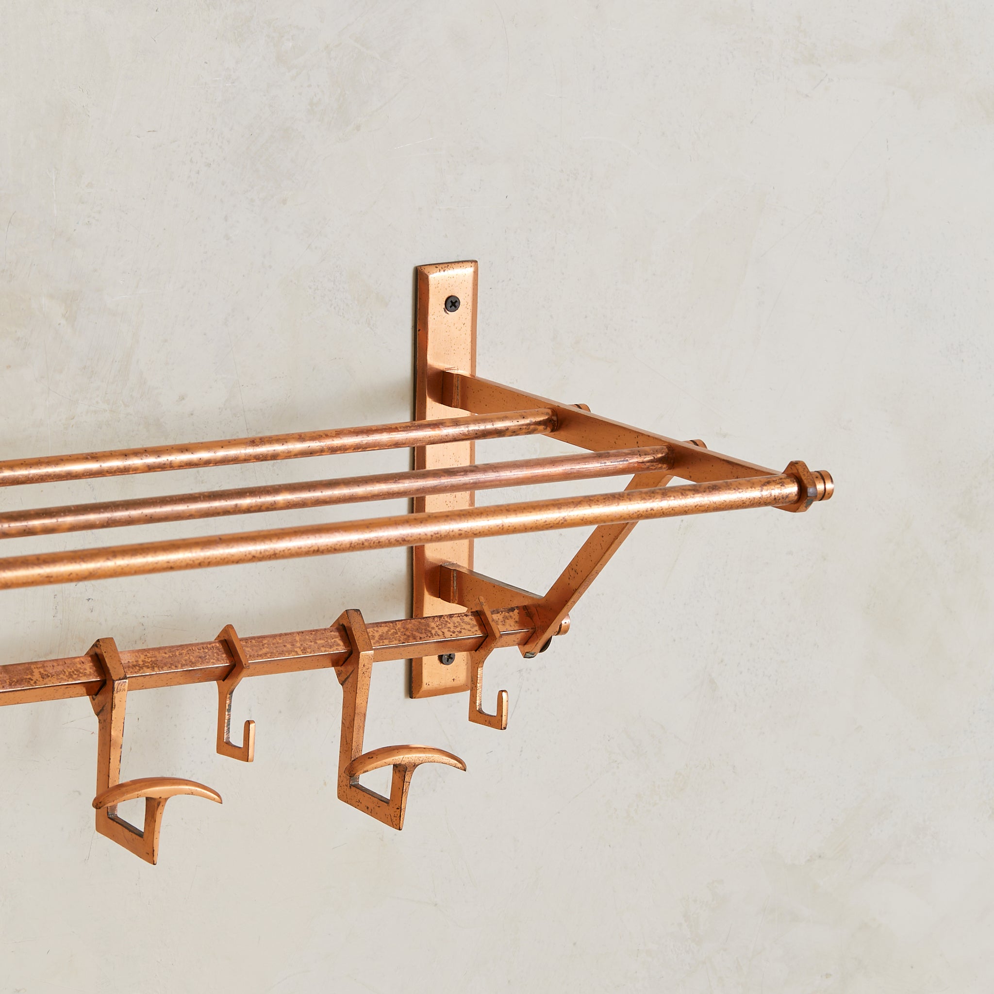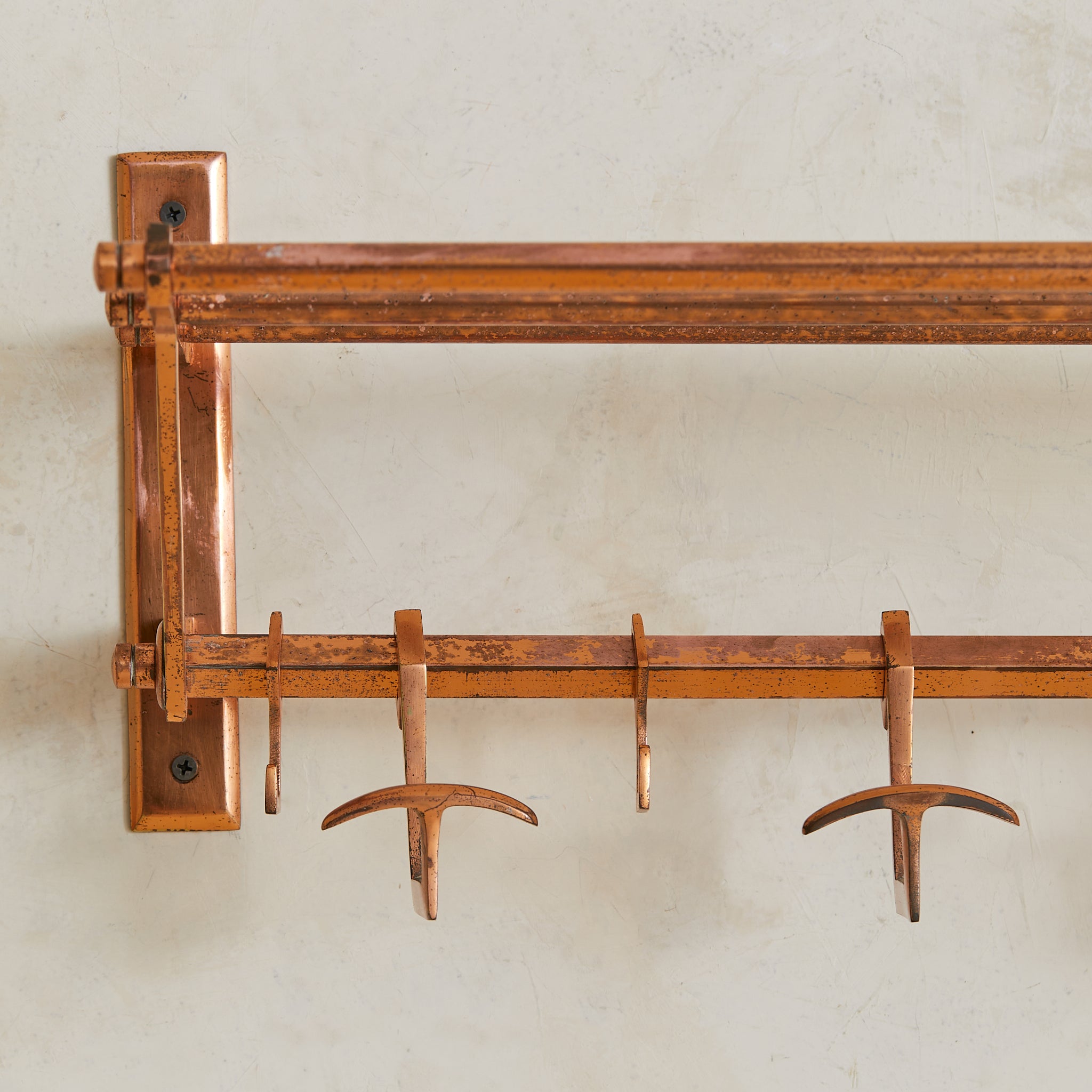 A 1930s French Art Deco coat rack in copper. Just over two feet wide, the design is architectural and compact—structured in a tri-rail frame with angular supports and a row of sliding hooks. Functional and sculptural, with a forward-leaning silhouette that floats cleanly off the wall. Elegant in a small entry or bath.