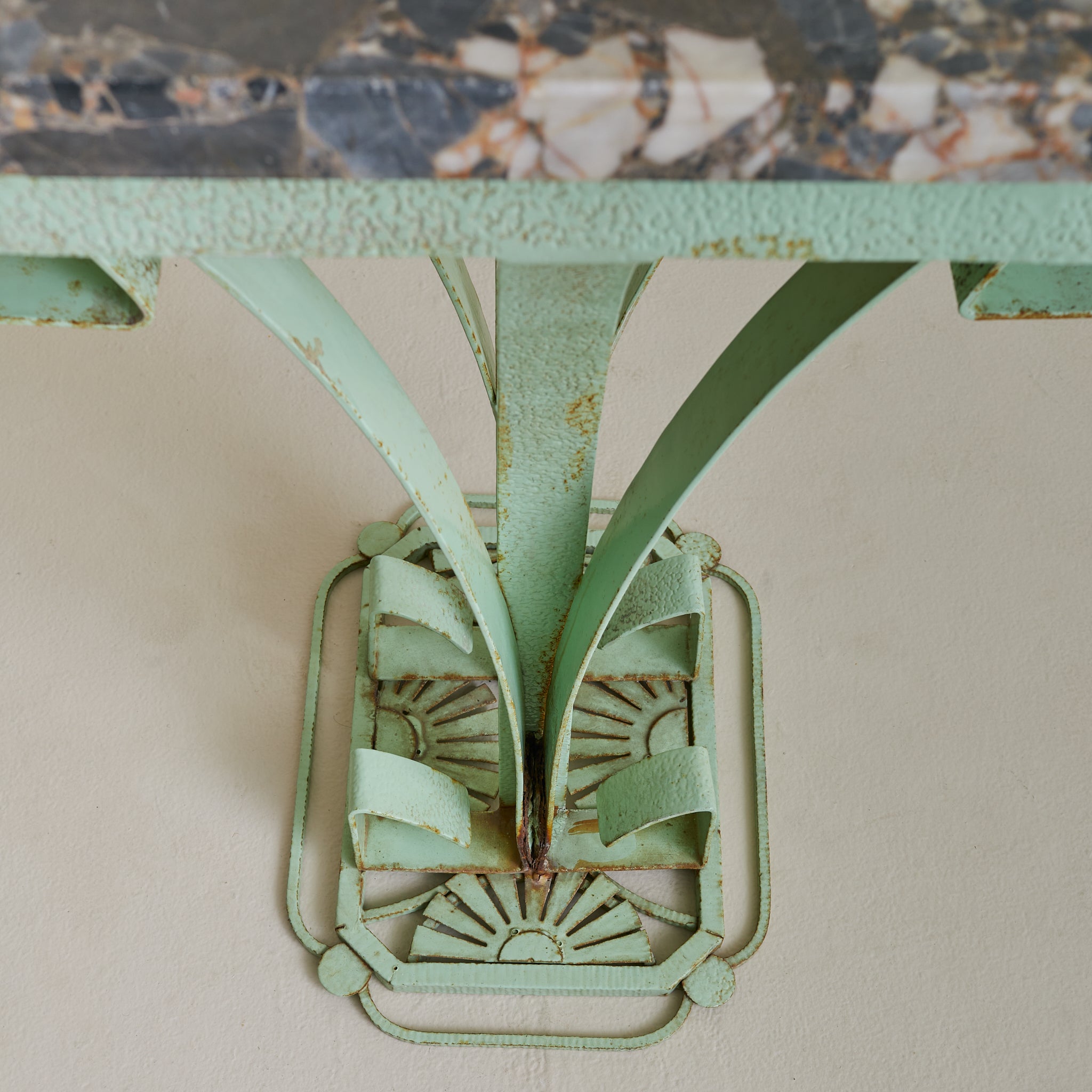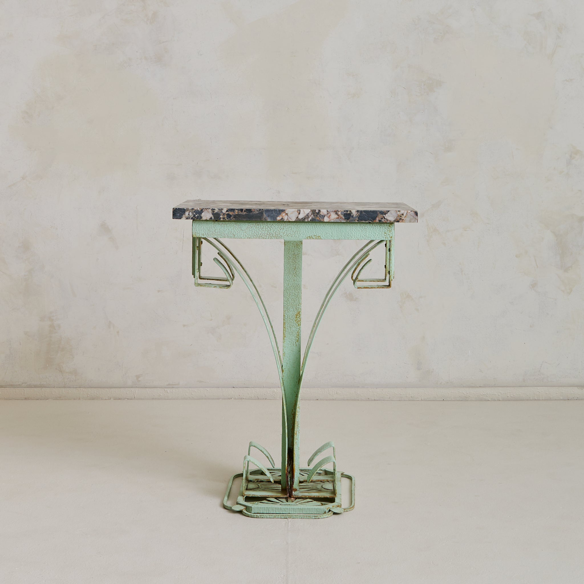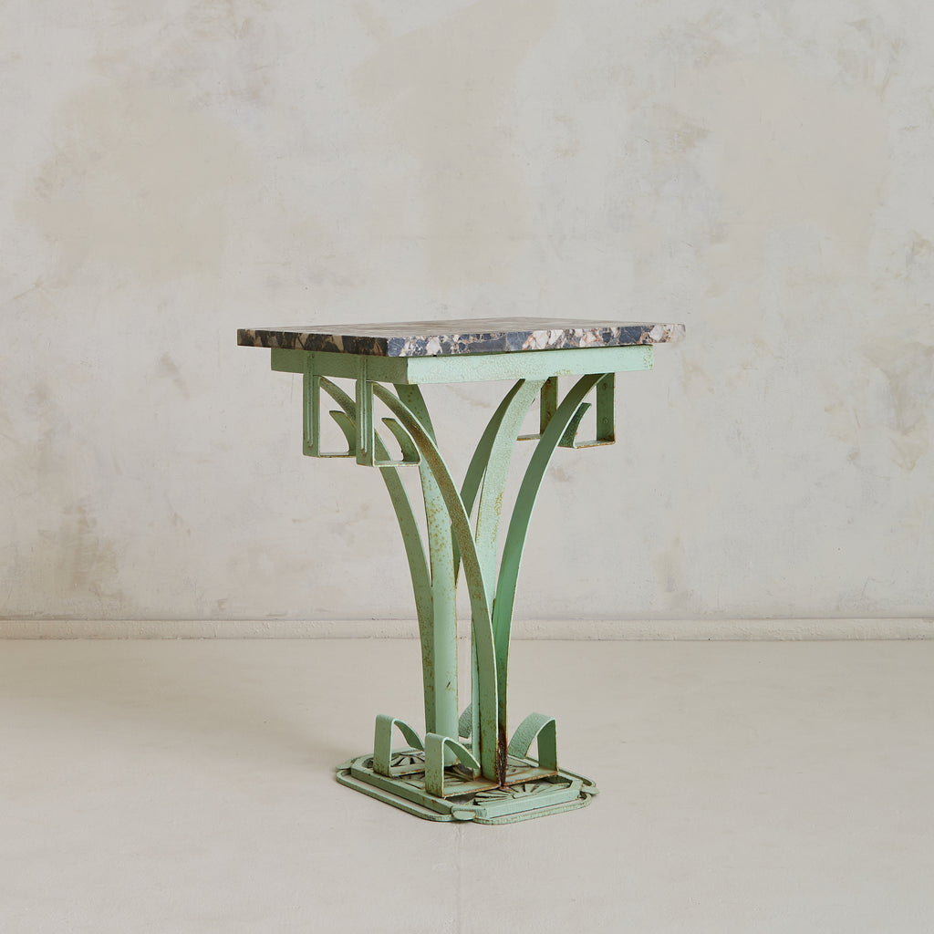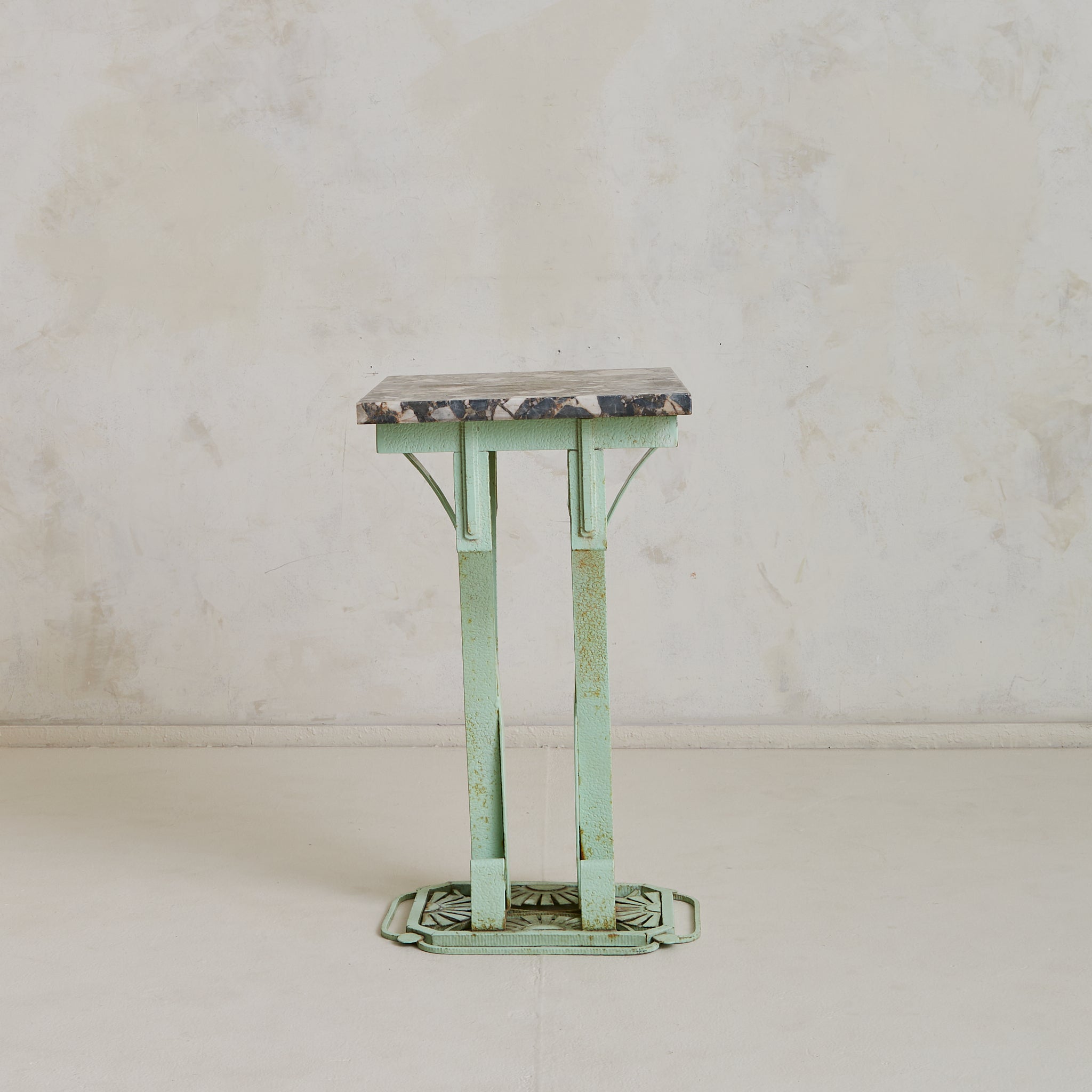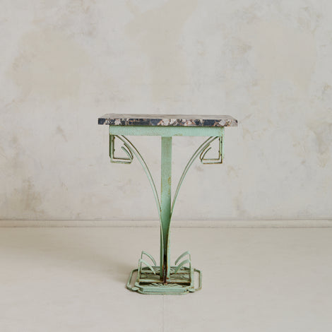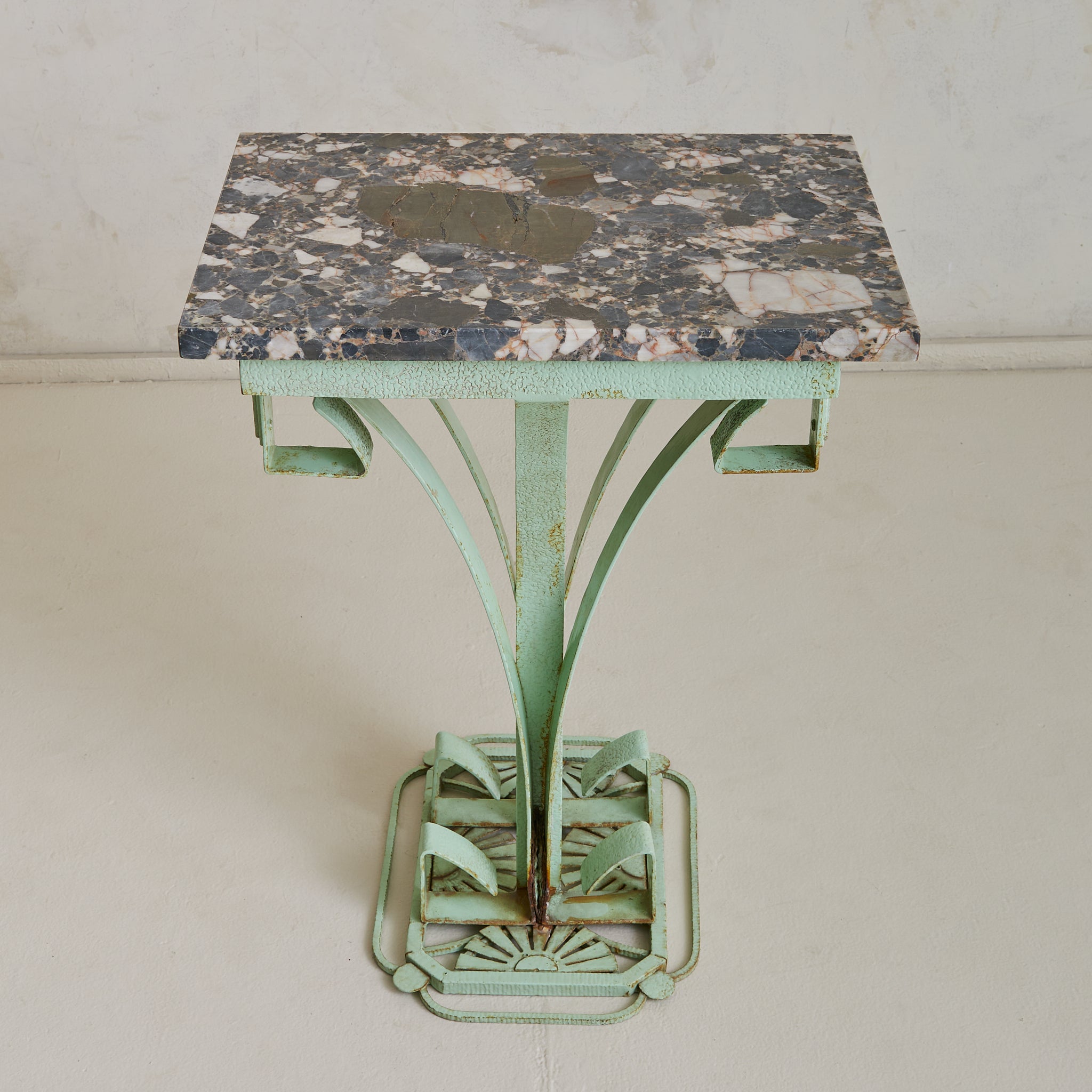French Art Deco Green Iron Side Table with Marble Top, 1930s