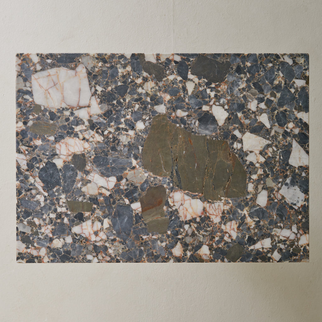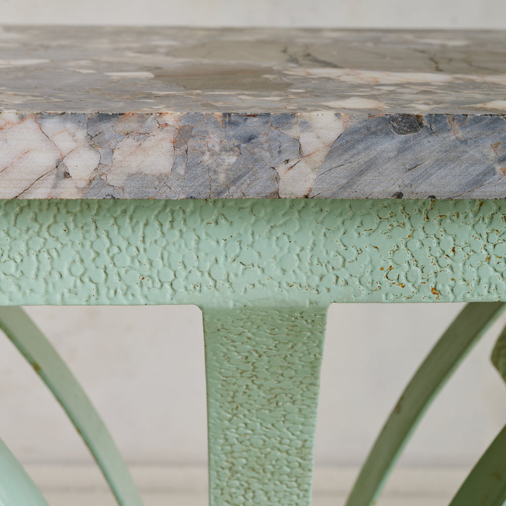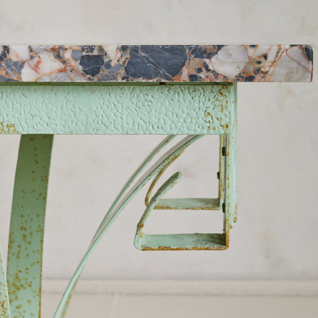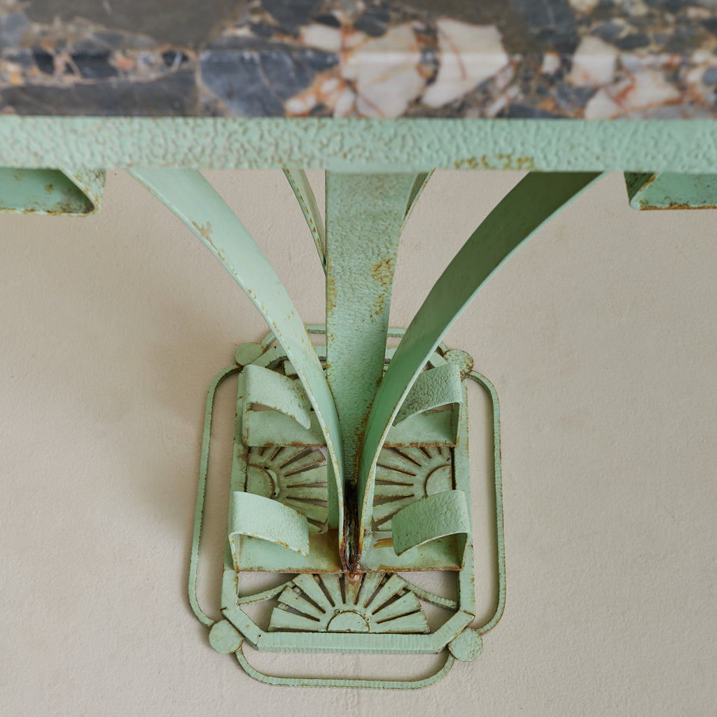 A 1930s French Art Deco side table, defined by a breccia marble top and celadon green iron base. The rectangular slab is a mosaic of fractured stone—black, alabaster, rust, and slate—bound in ancient geology and polished to a soft sheen.