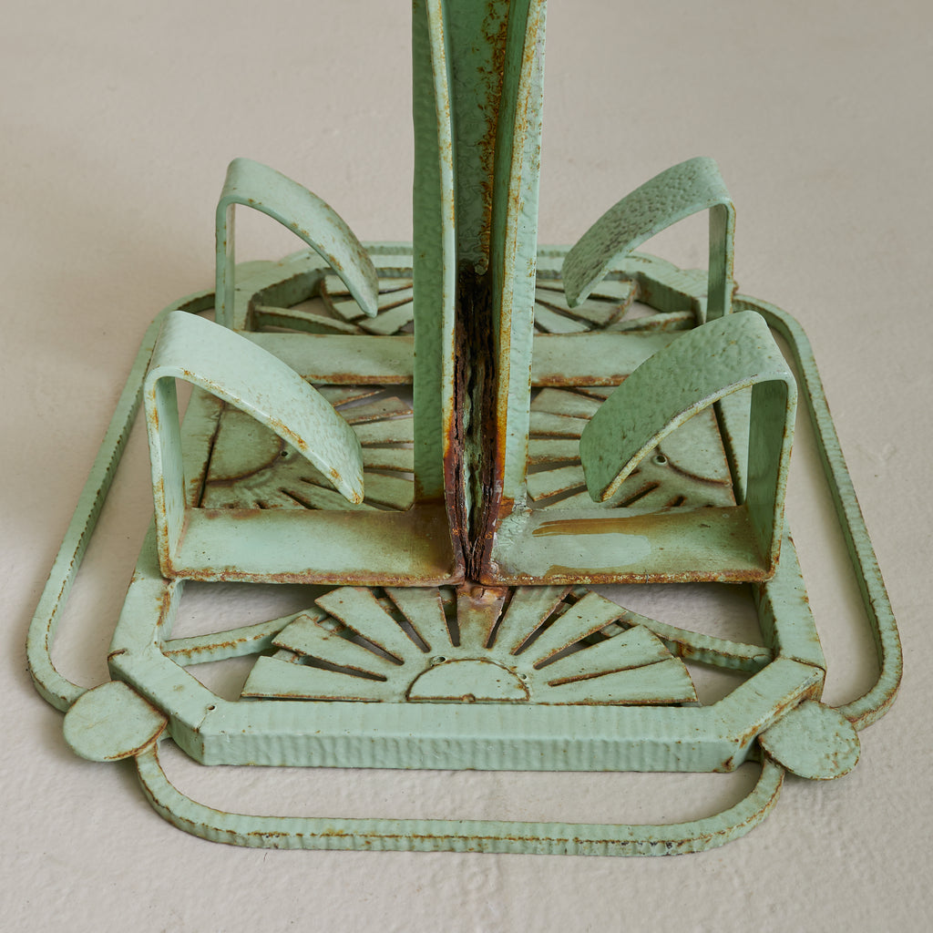 Below, the iron frame arches in stylized botanical forms, flaring into scrollwork and anchored by a sunburst base. Finished in celadon with a rich texture and timeworn patina, the piece strikes a balance between the ornamental and the elemental.