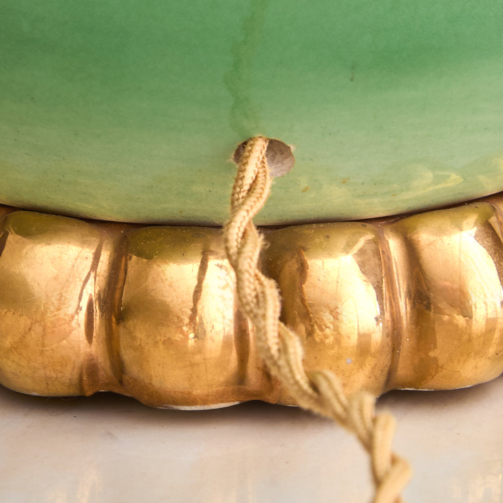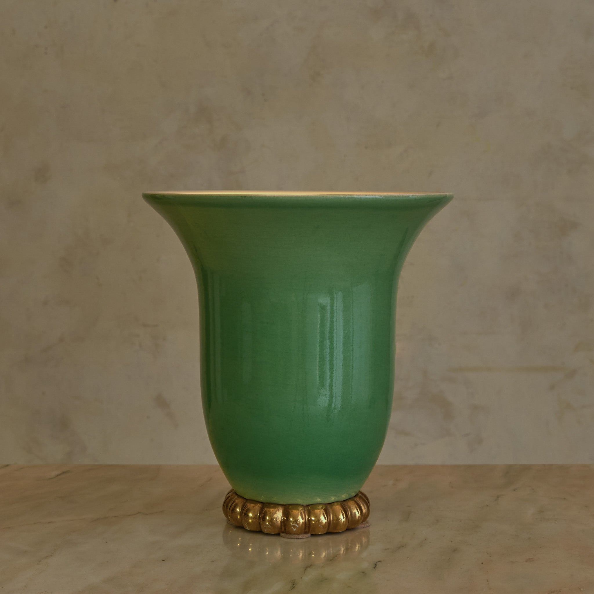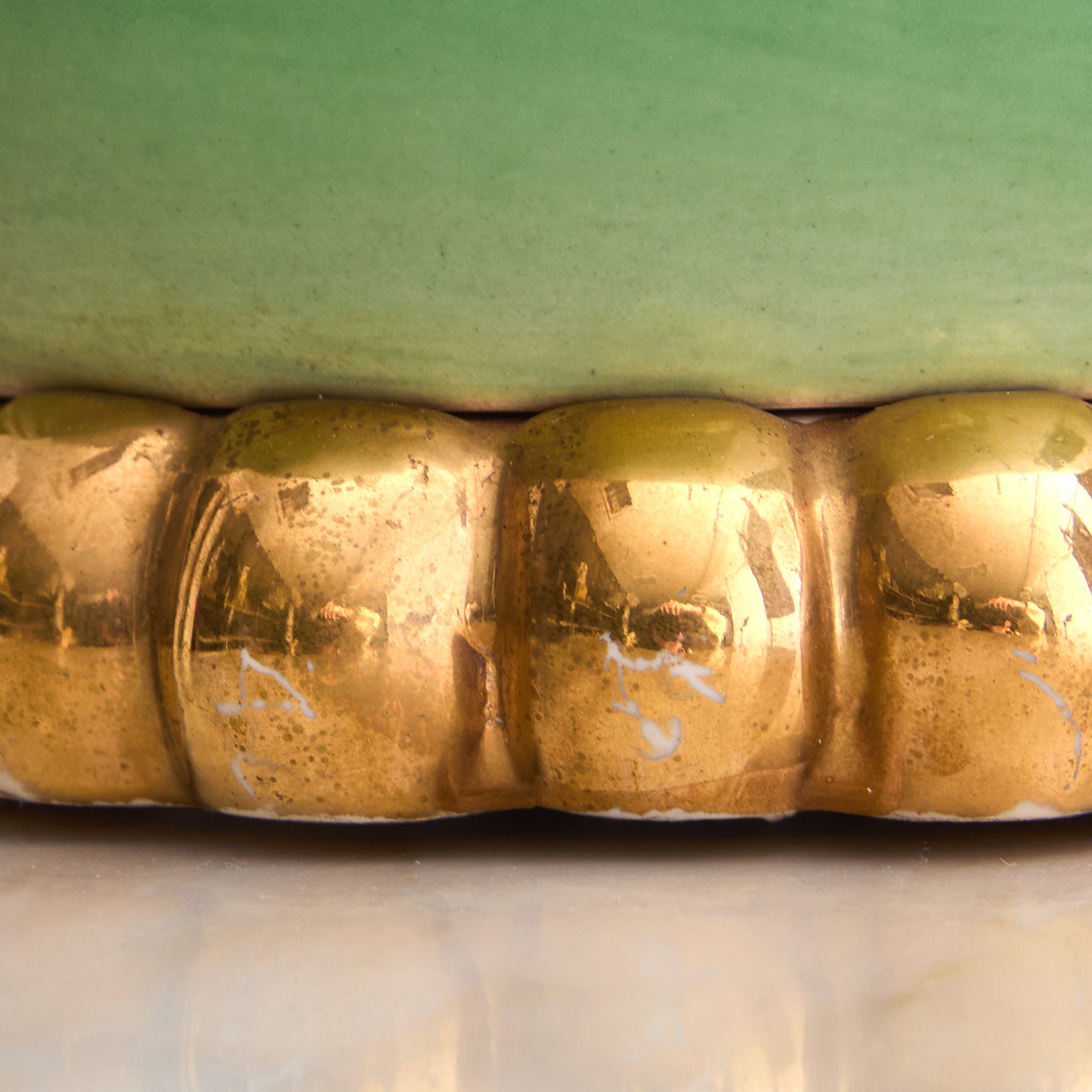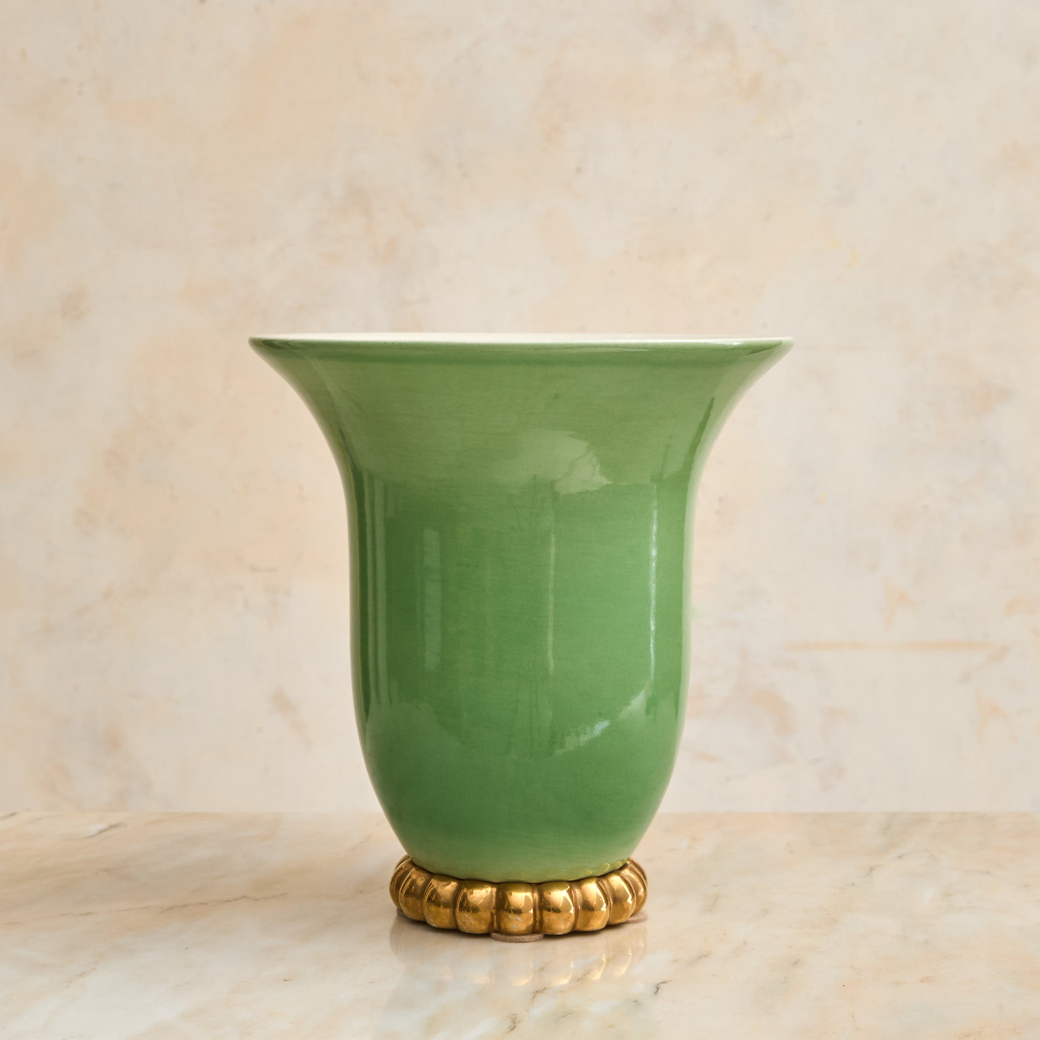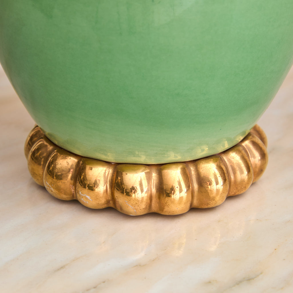 A French table lamp from the 1940s, designed in the spirit of the Art Deco era. The body is a smooth, glossy green porcelain form, its silhouette gently flaring before meeting a gilt base made of rounded, petal-like segments.
