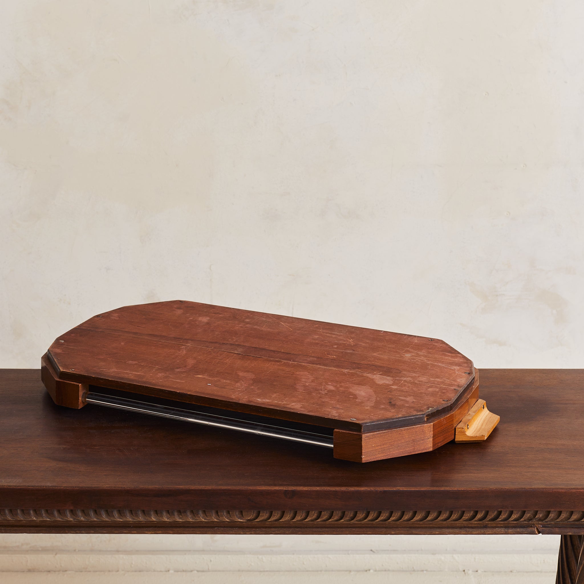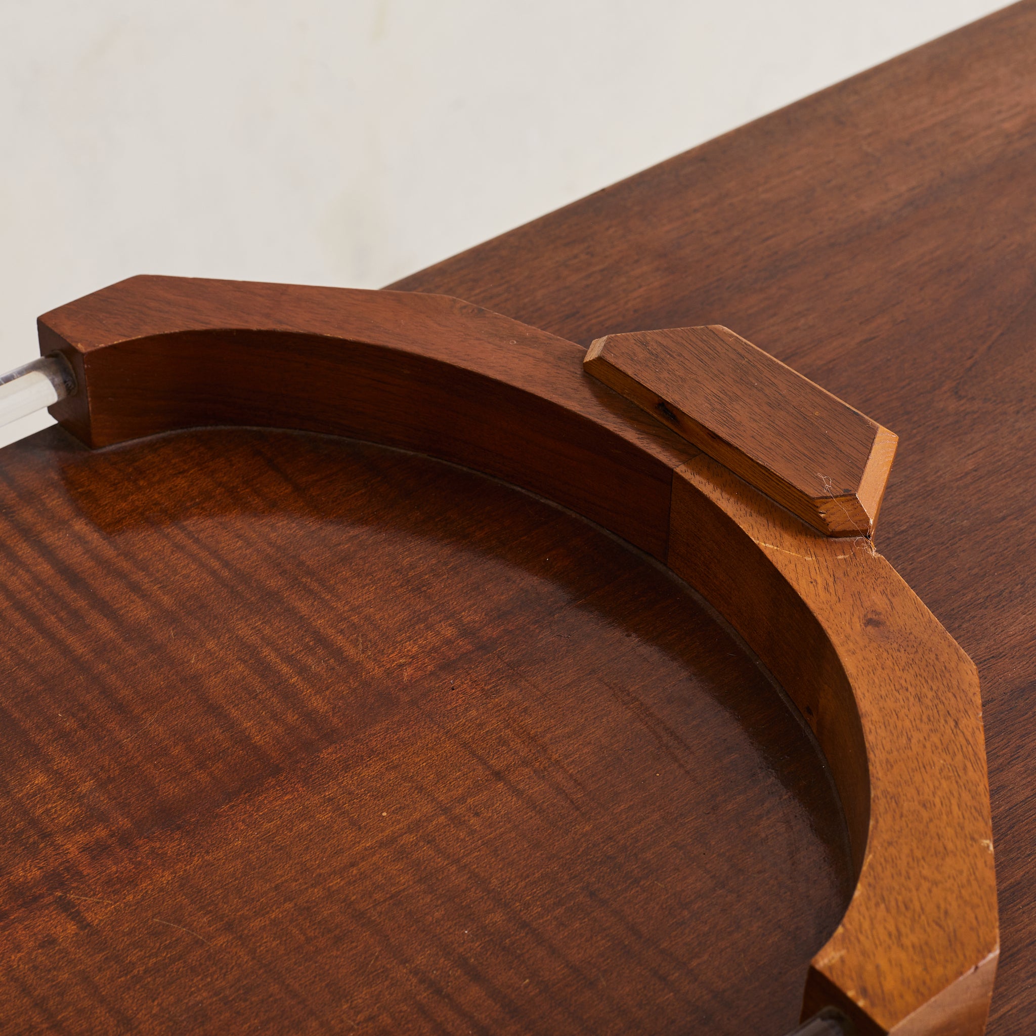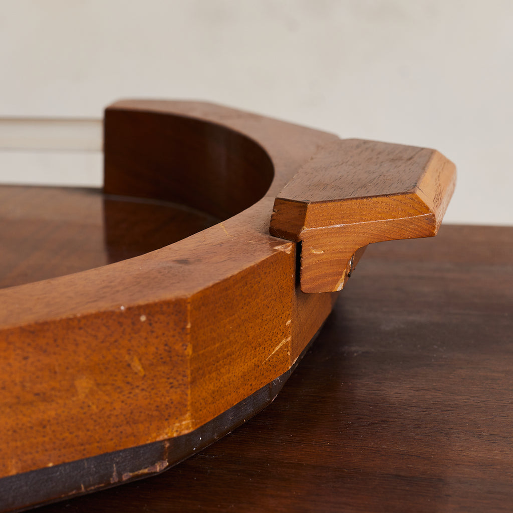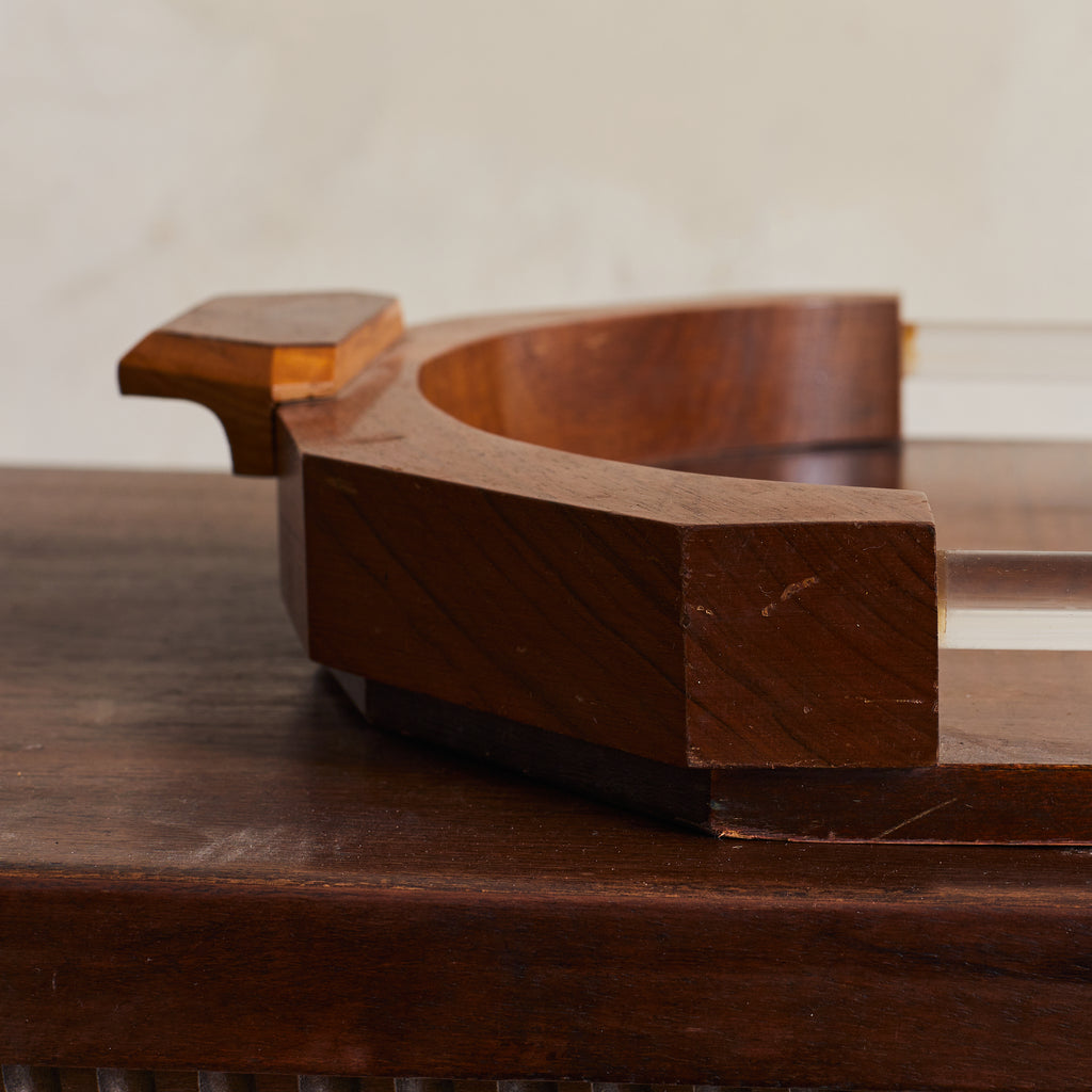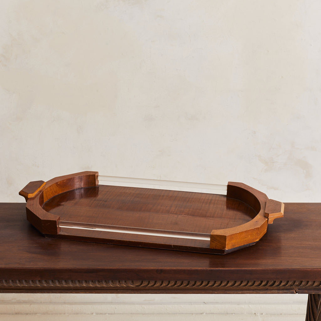 A 1940s French Art Deco tray, crafted from rich oak wood. This piece features angular handles and curved edges that frame elegant lucite side panels. The combination of warm wood tones and transparent accents embodies the refined aesthetic of the Art Deco period, making it both functional and decorative.