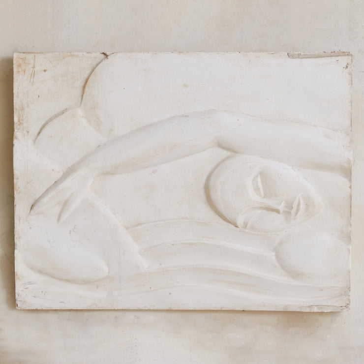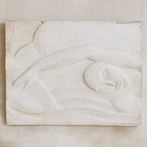 A French Art Deco bas-relief sculpture in plaster, carved in low profile with serene, simplified planes. Likely dating to the 1940s, the figure’s elongated limbs stretch skyward, framed by flowing drapery and softly abstracted forms. Her expression is one of quiet reverie—eyes lowered, lips gently curved—a nod to both classical and modernist influence.