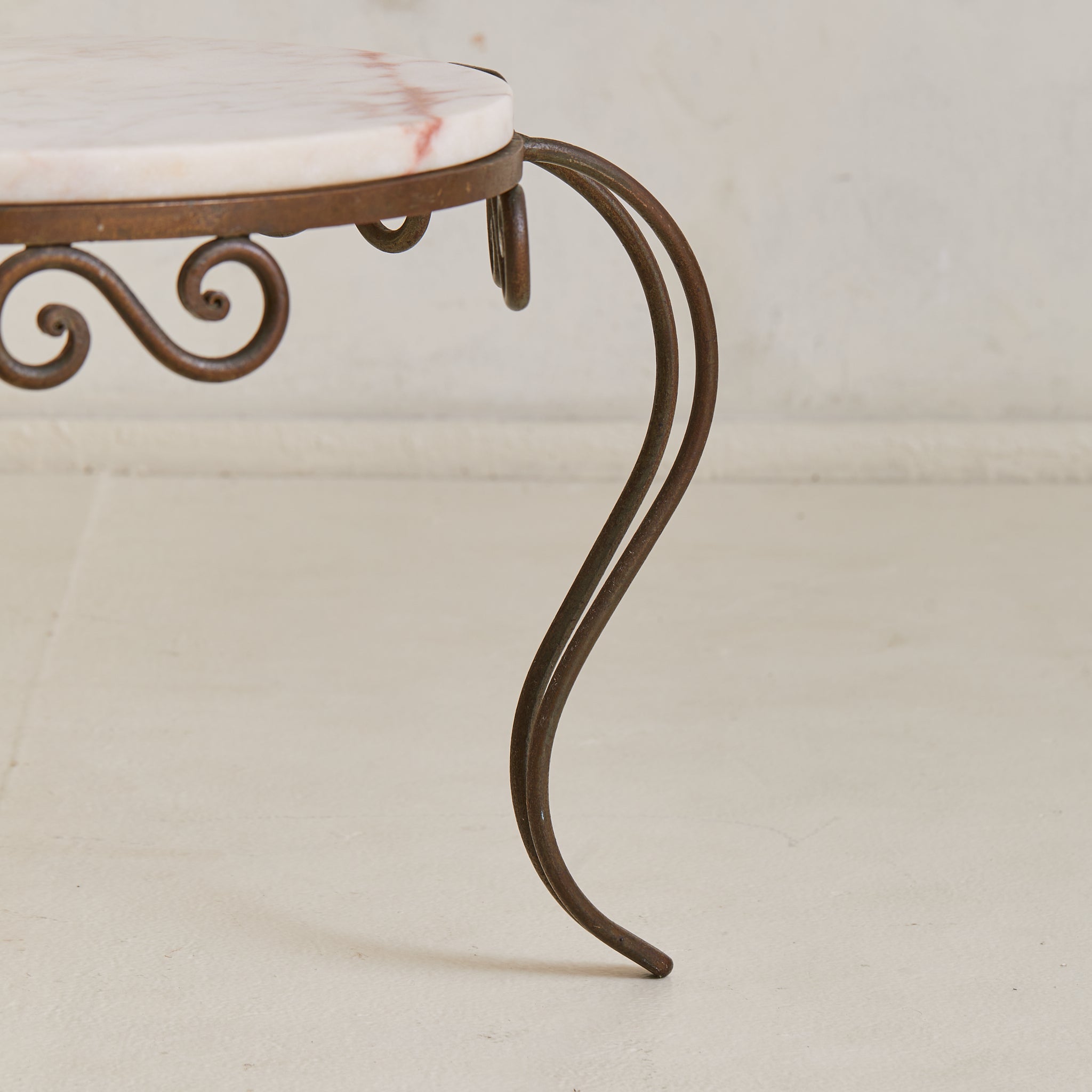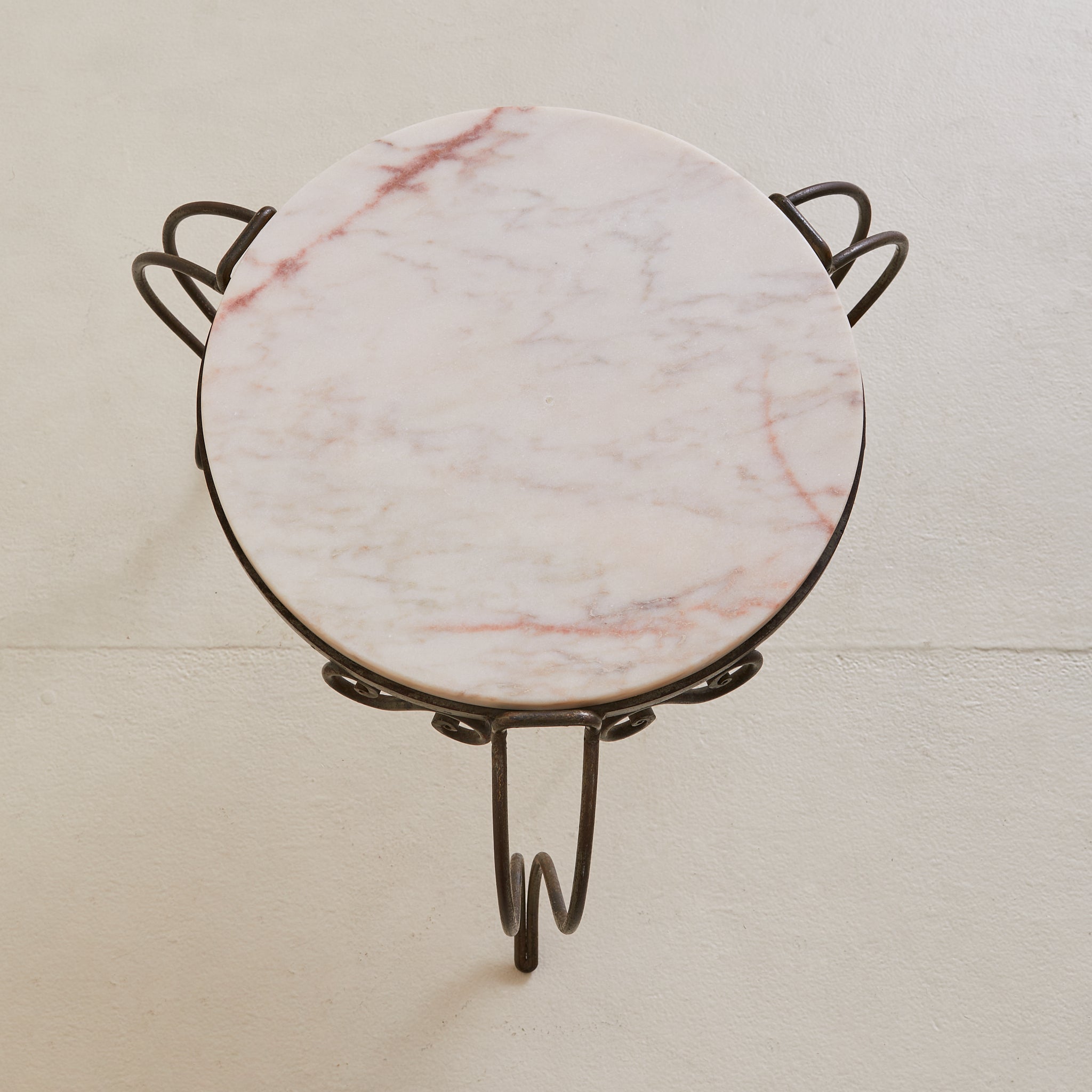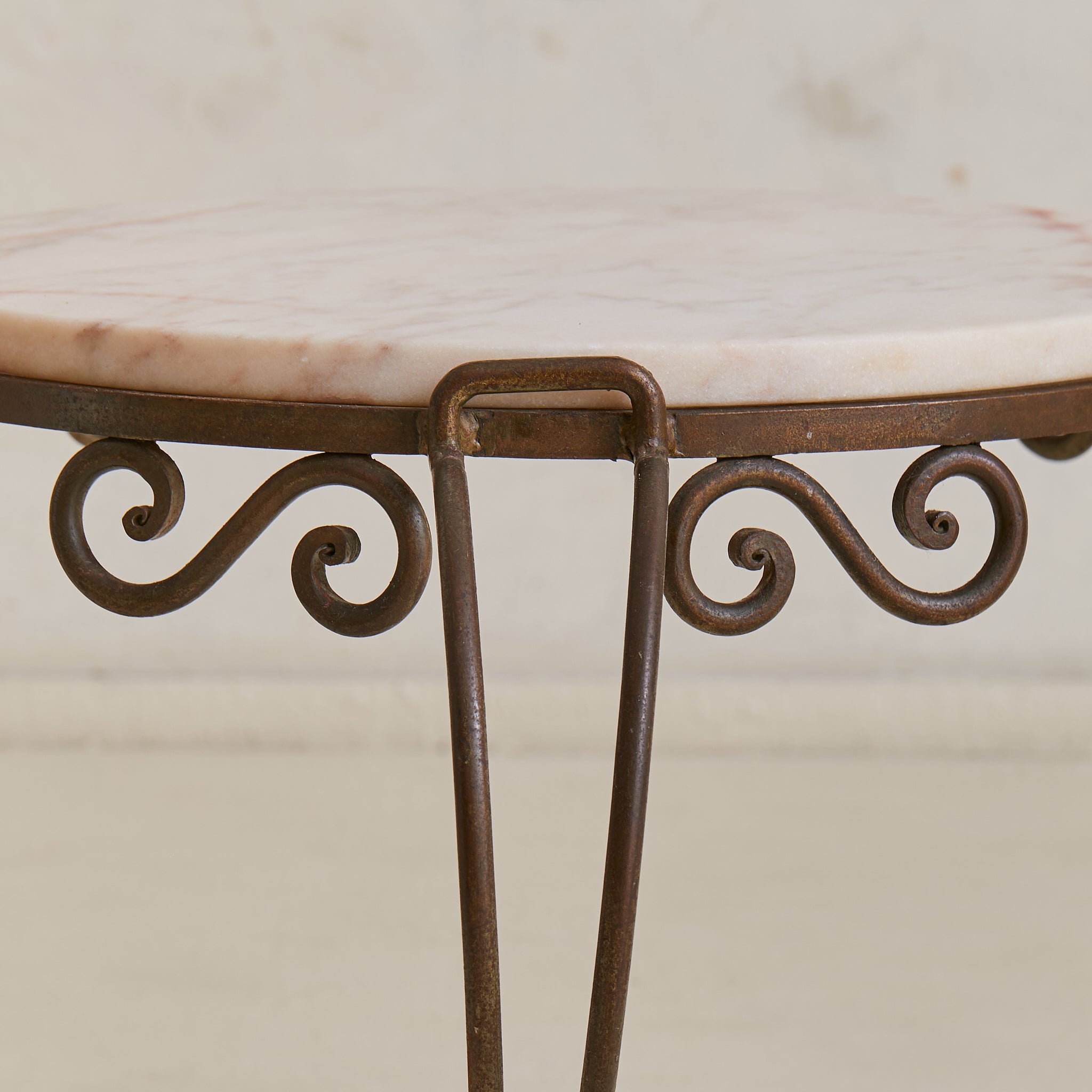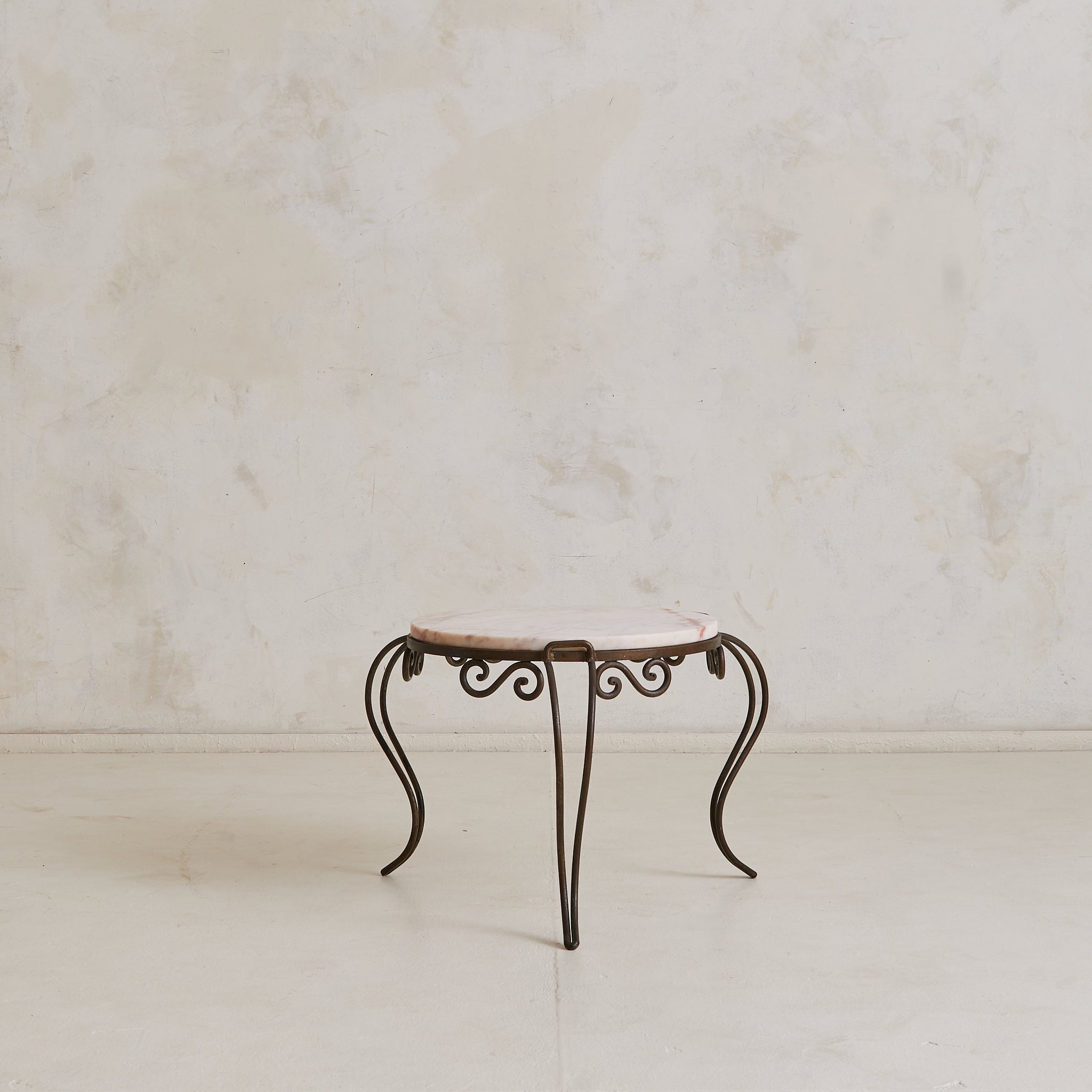 A 1930s French Art Deco coffee table with lyrical lines and delicate scrollwork. The round top is carved from pink-veined marble, cool-toned with a softly honed finish. Beneath, a trio of iron legs arcs outward in a sinuous gesture—each hand-forged with curling flourishes and aged to a dark, earthy patina over time.