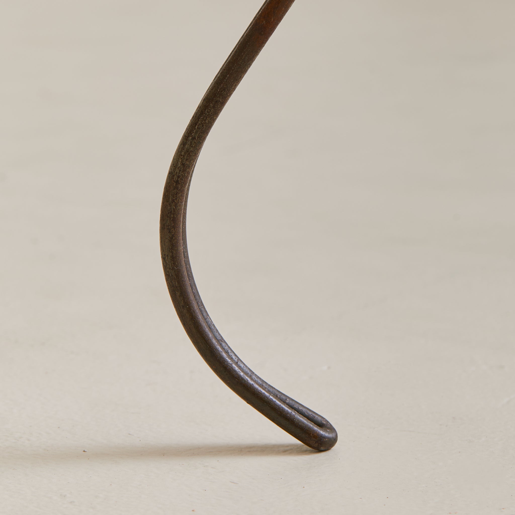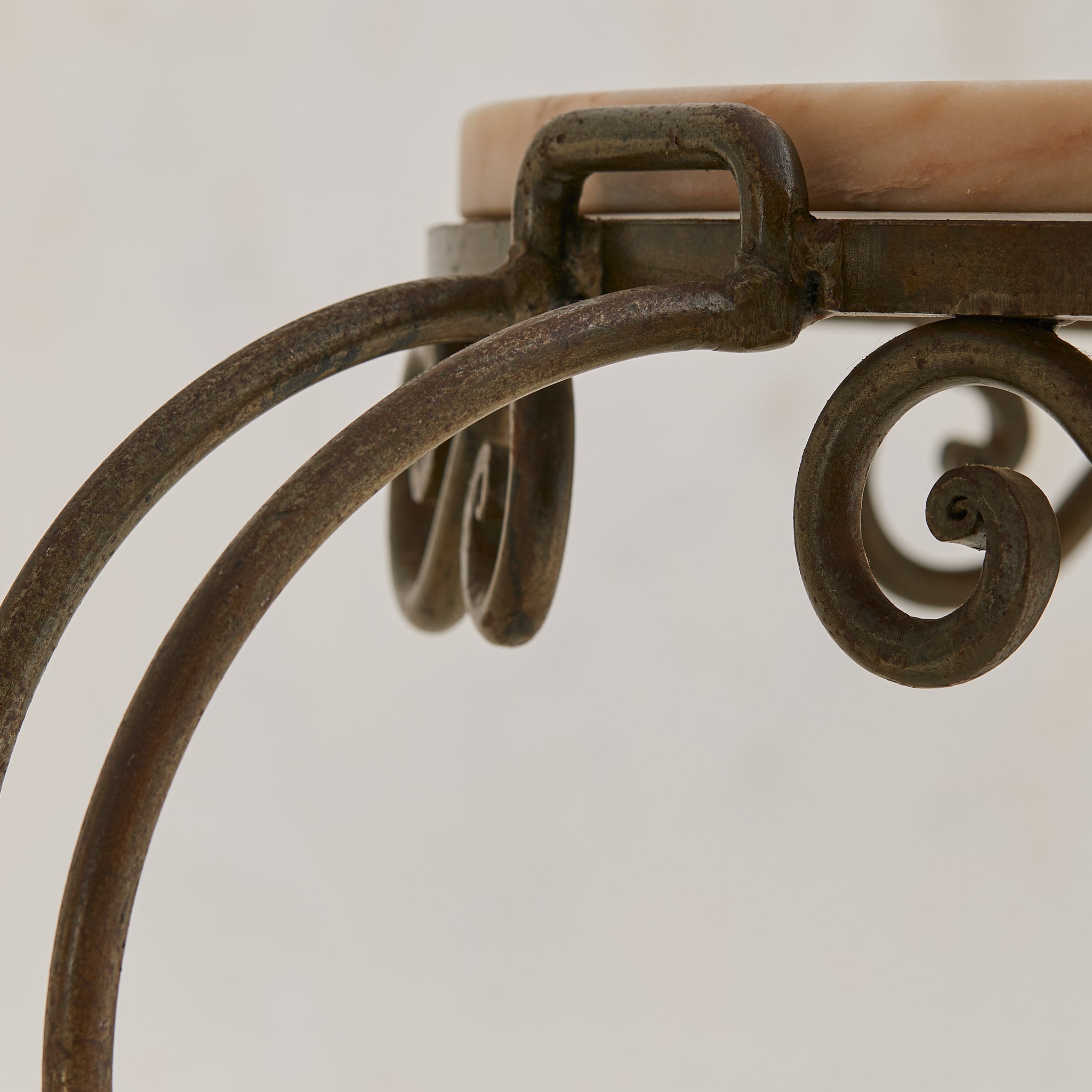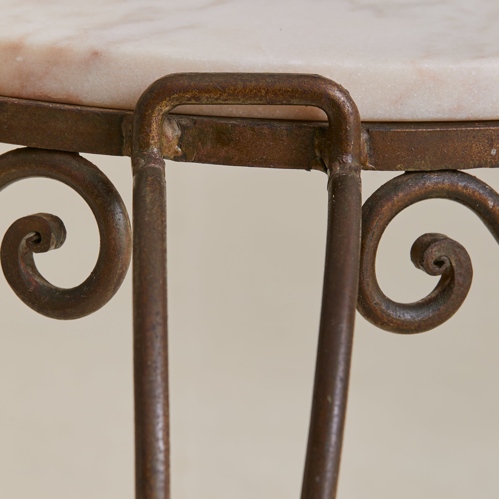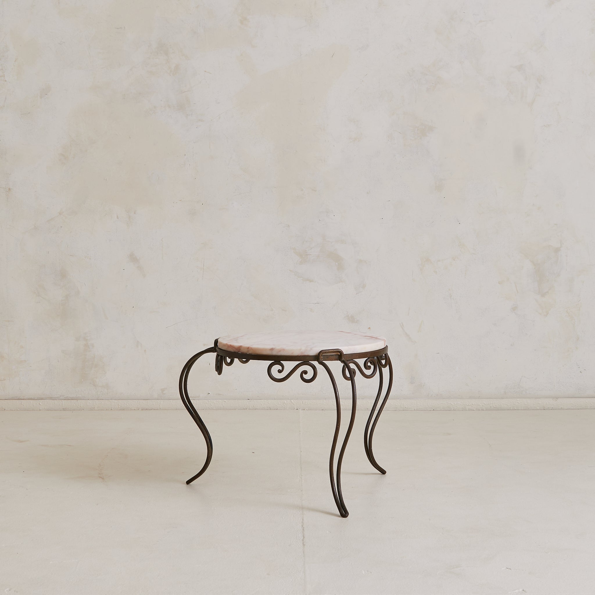 A 1930s French Art Deco coffee table with lyrical lines and delicate scrollwork. The round top is carved from pink-veined marble, cool-toned with a softly honed finish. Beneath, a trio of iron legs arcs outward in a sinuous gesture—each hand-forged with curling flourishes and aged to a dark, earthy patina over time.