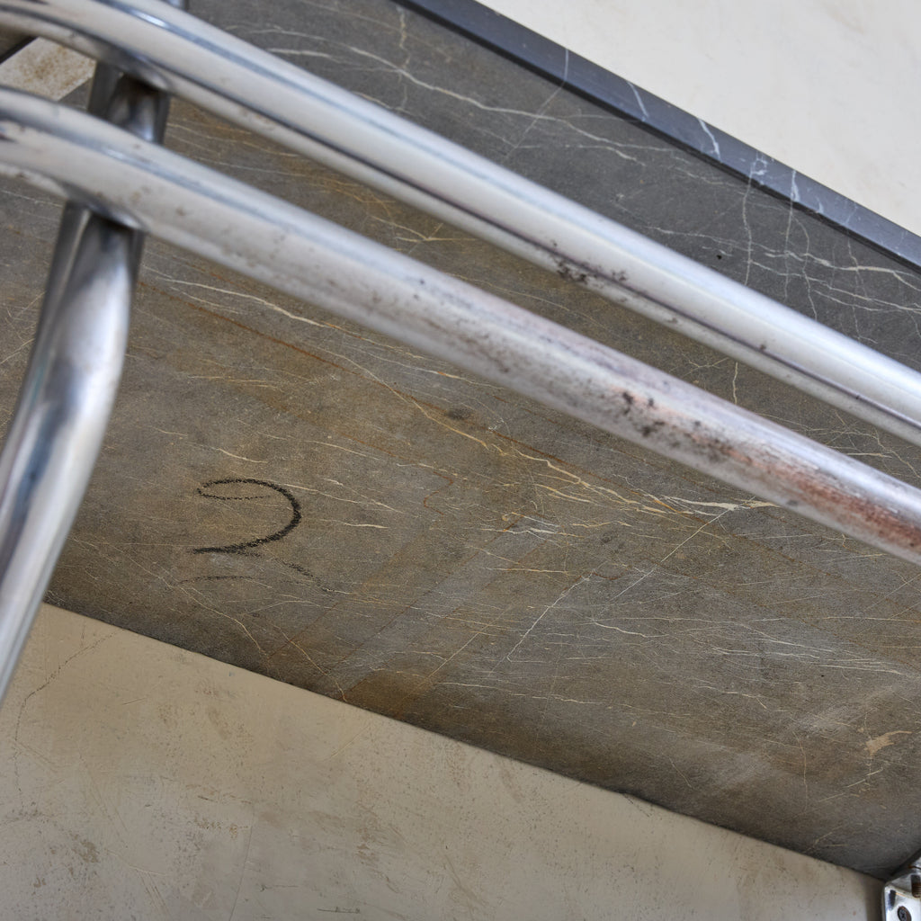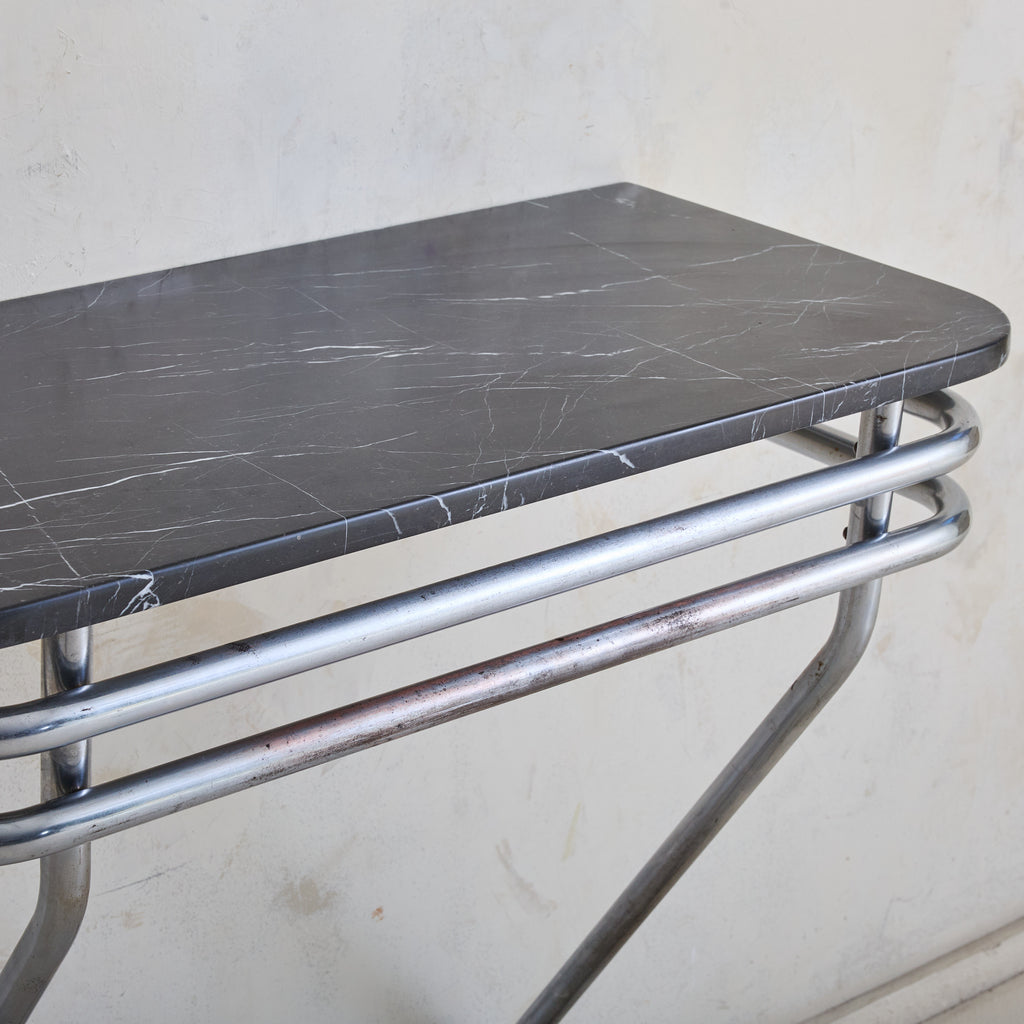 This console table features a streamlined Art Deco design, characterized by its sleek, minimalist form and the use of high-quality material of marble. The design echoes the elegance and modernity of the mid 1940s, when Art Deco flourished, particularly celebrated for its geometric shapes and the combination of luxury materials with industrial ones.