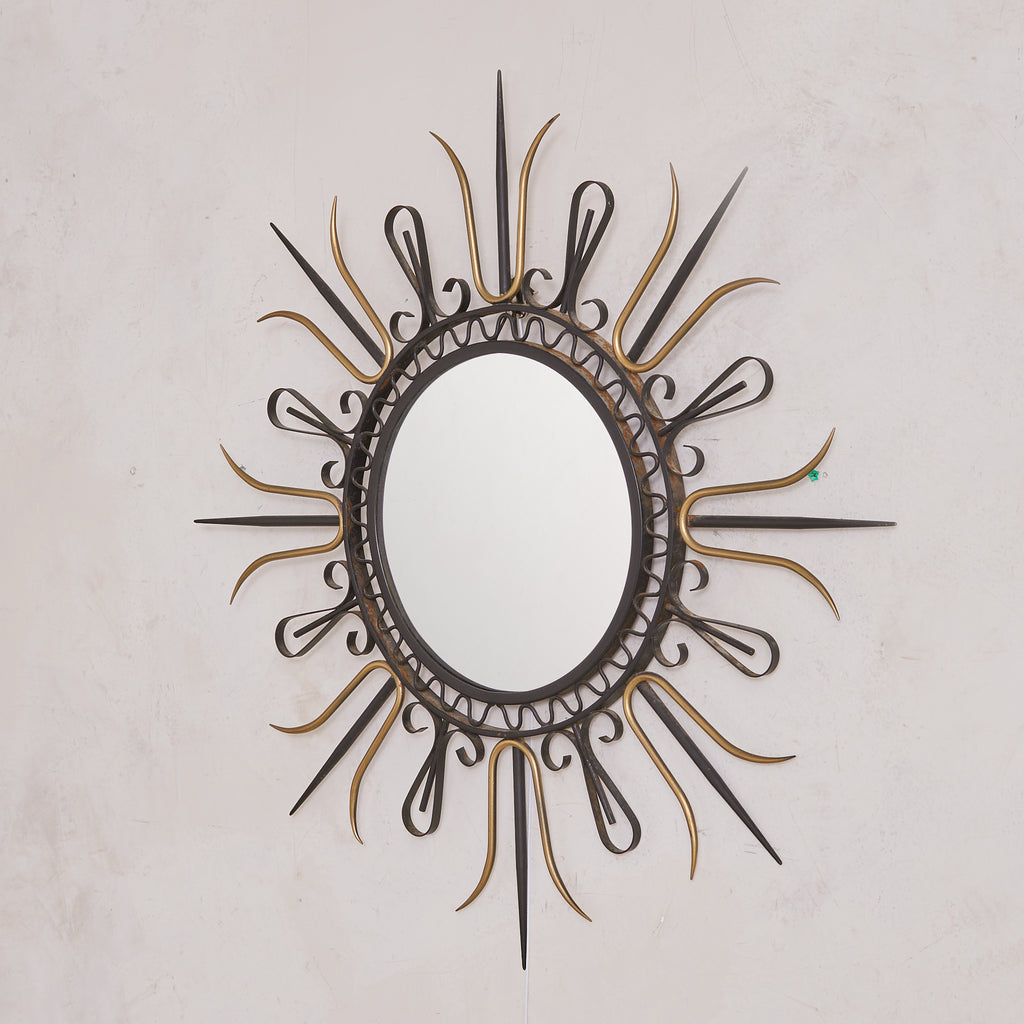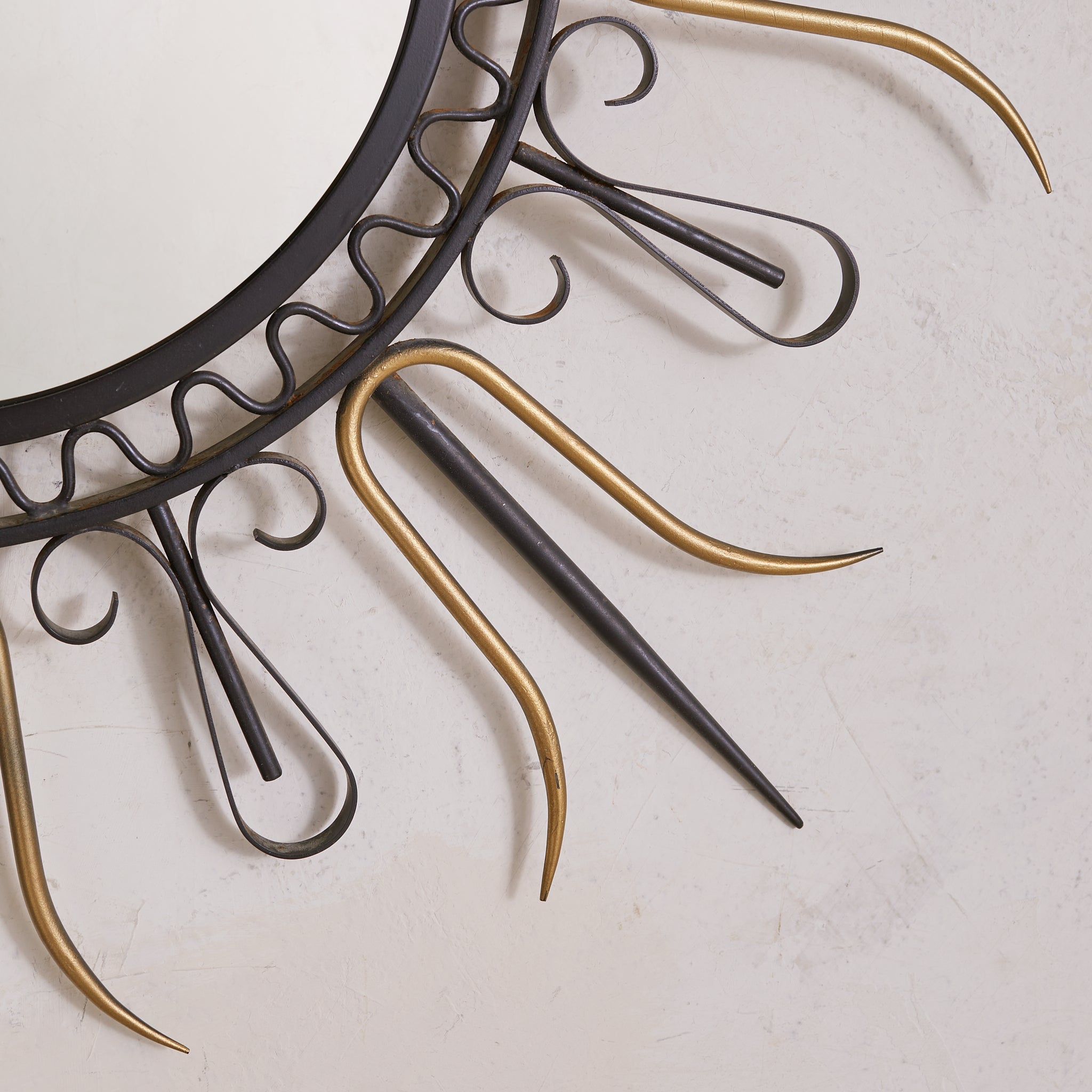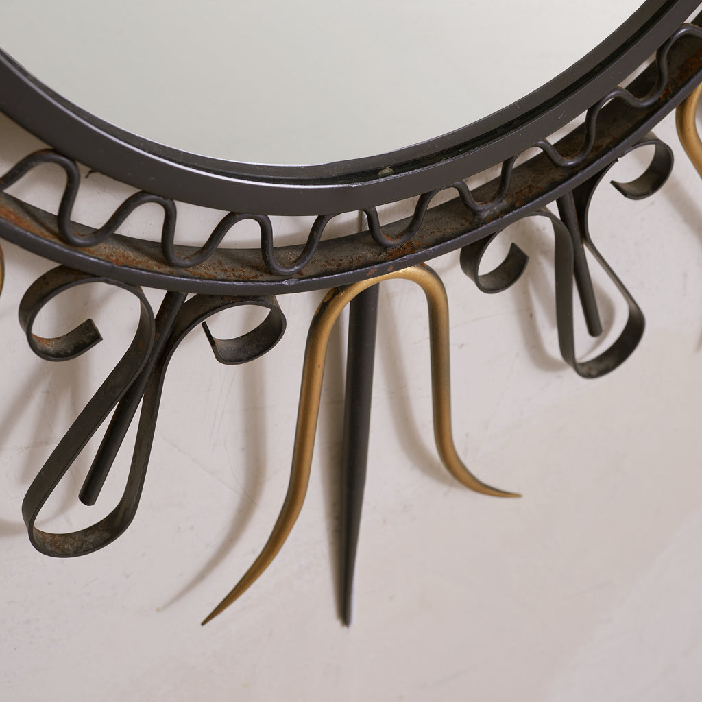 A French sunburst wall mirror from the 1950s, crafted in blackened iron with alternating gilt-tipped rays. The circular frame radiates with a play of line and flourish—scrolled ironwork meets sculptural spikes in a bold midcentury gesture. Both graphic and ornamental, it channels the spirit of postwar French design.