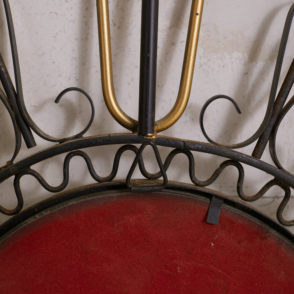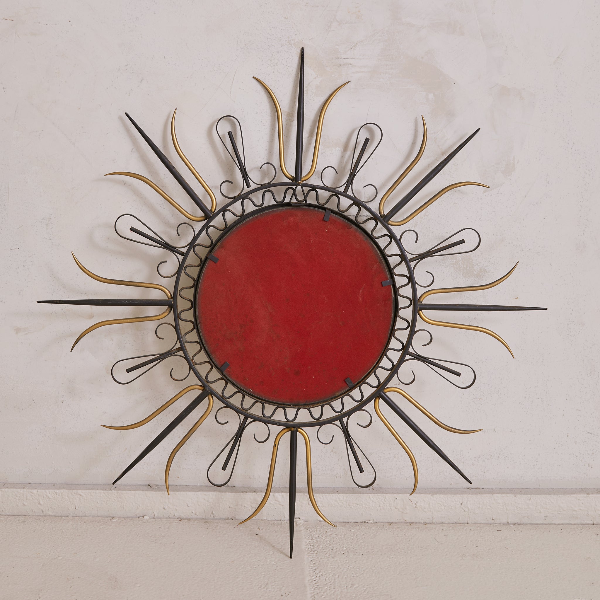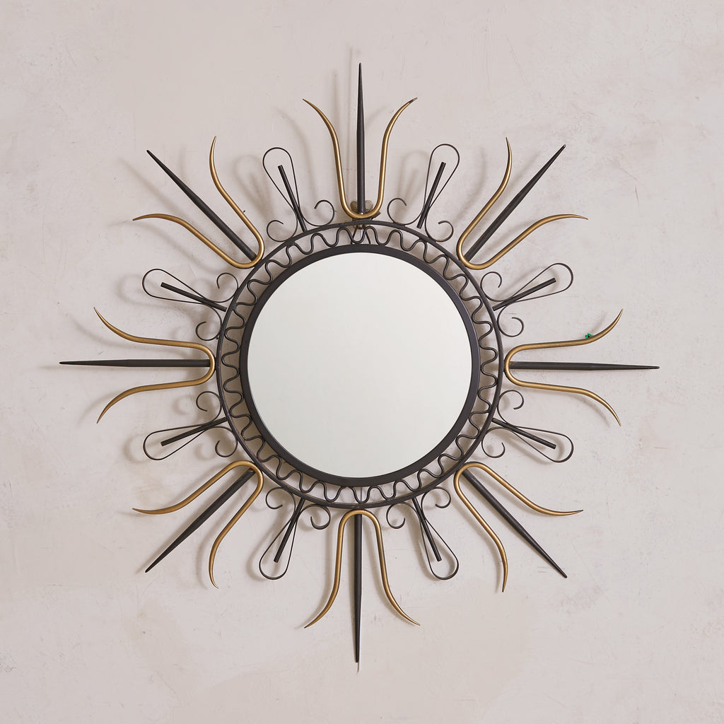 A French sunburst wall mirror from the 1950s, crafted in blackened iron with alternating gilt-tipped rays. The circular frame radiates with a play of line and flourish—scrolled ironwork meets sculptural spikes in a bold midcentury gesture. Both graphic and ornamental, it channels the spirit of postwar French design.