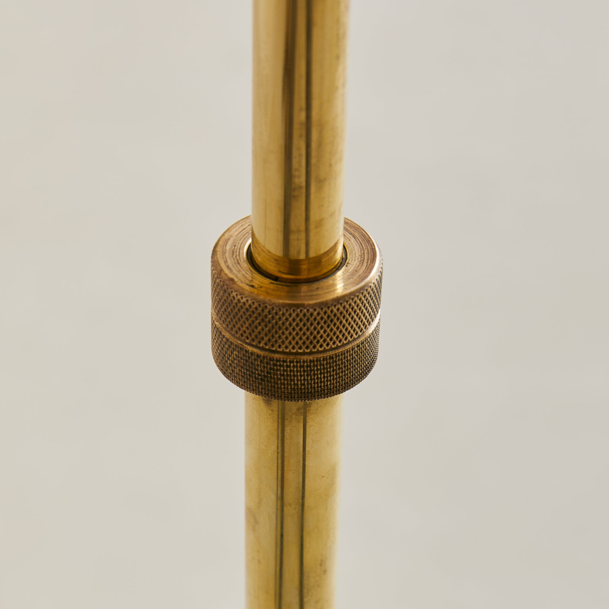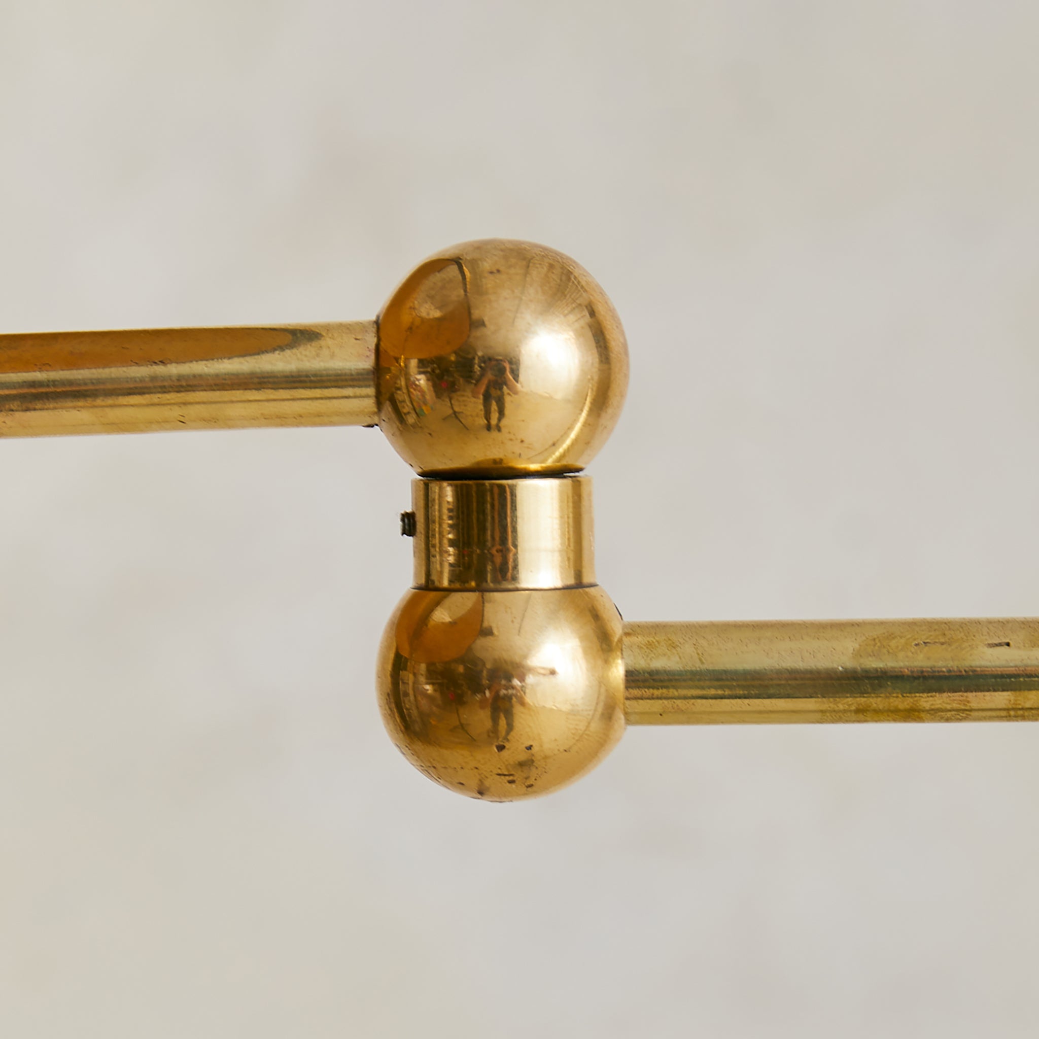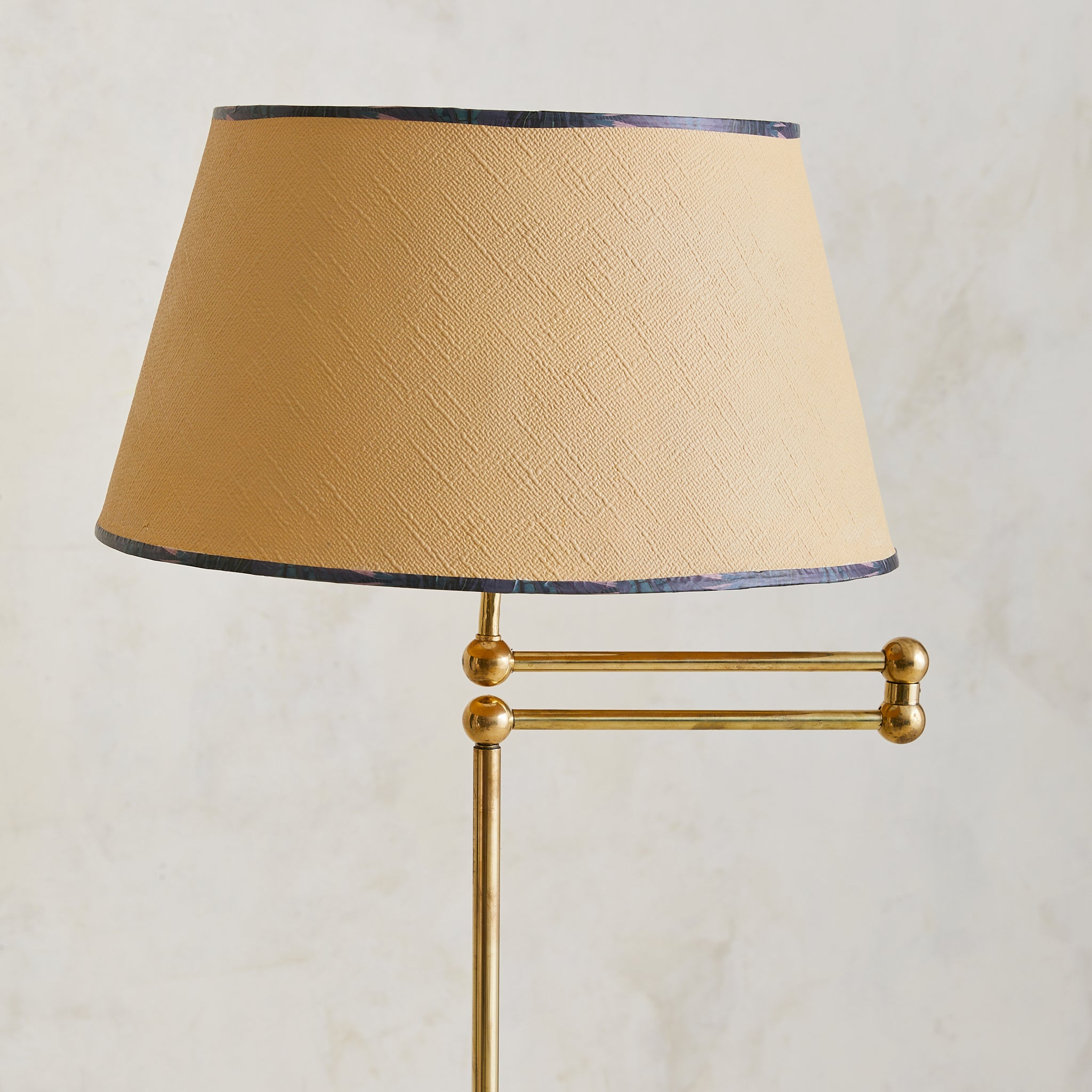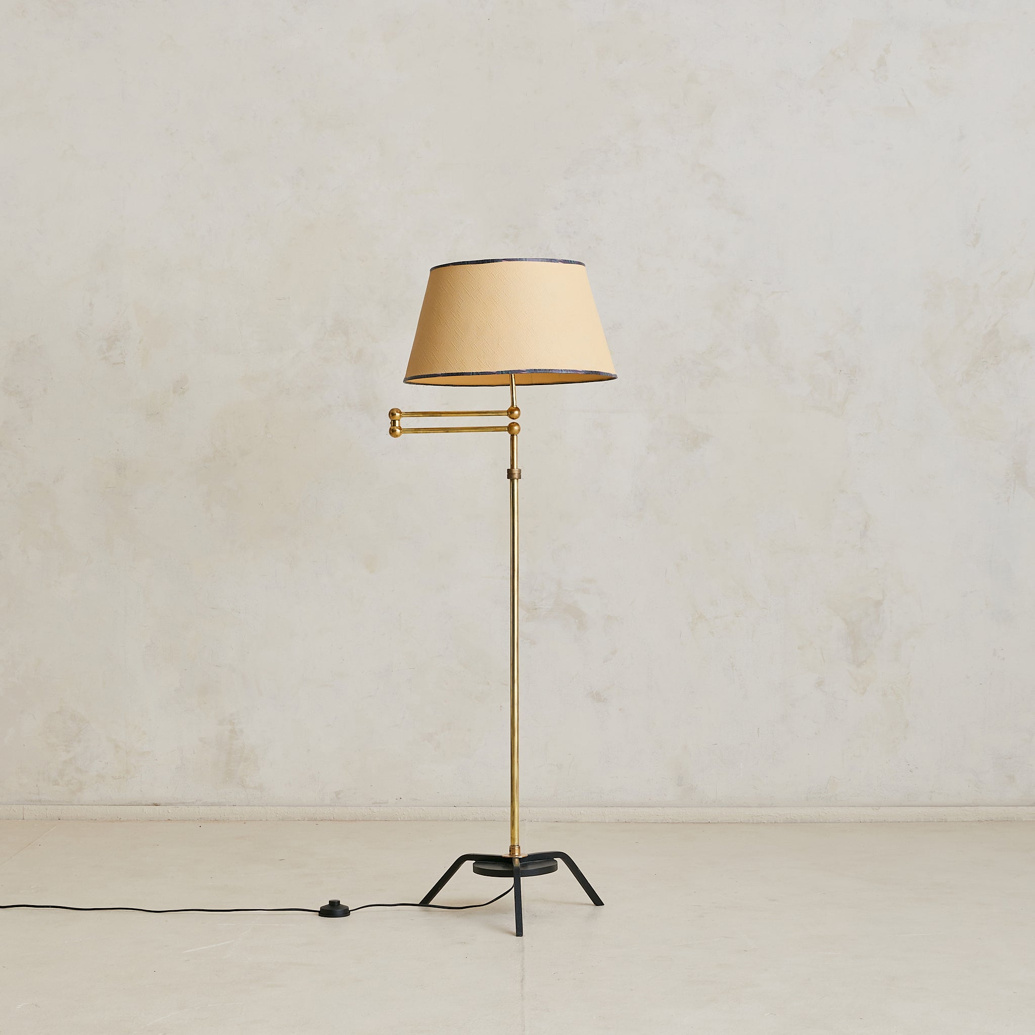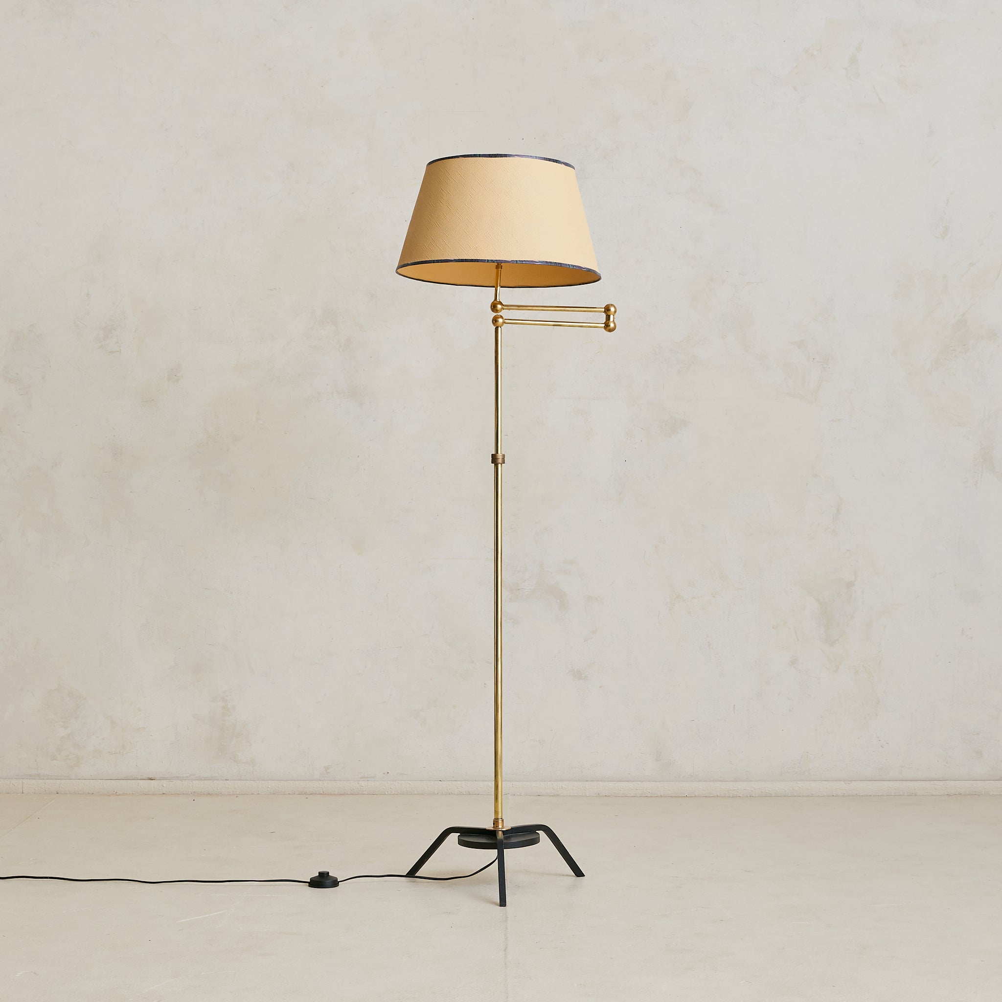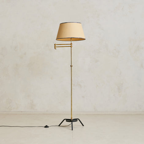 A French articulating floor lamp from the 1960s, crafted in polished brass with a blackened metal base. The slender column supports a double-jointed swing arm capped with spherical brass joints—allowing the shade to extend or retract with ease. Its warm brass finish is paired with a textured shade, trimmed in dark patterned fabric.
