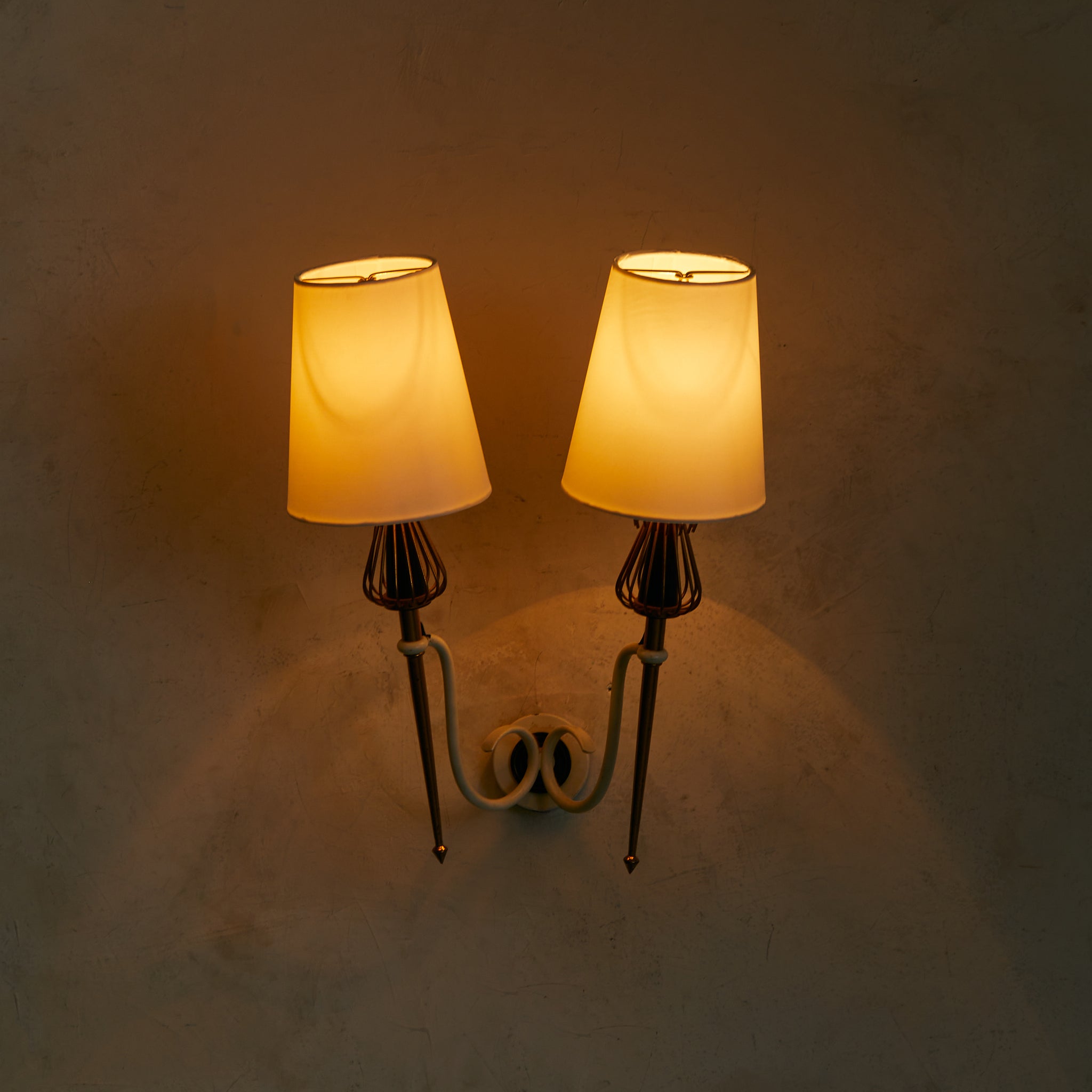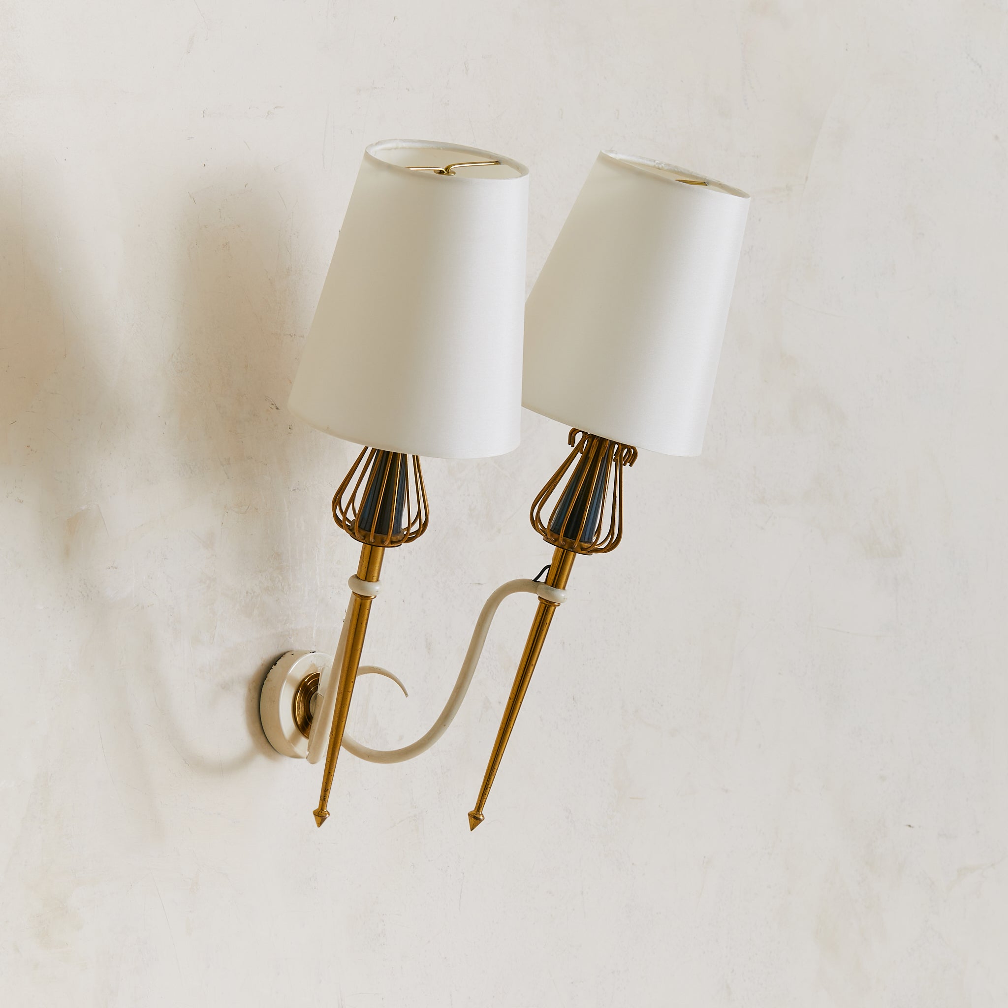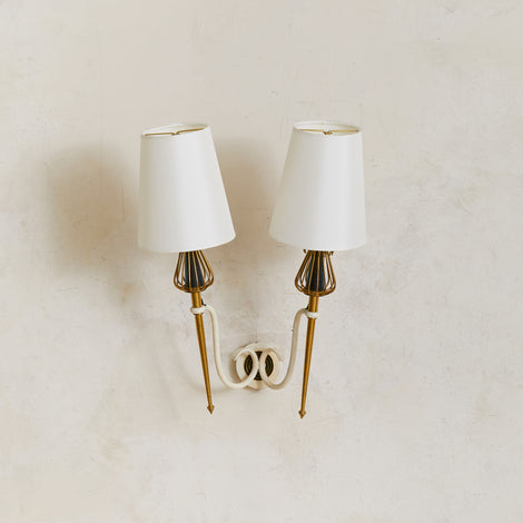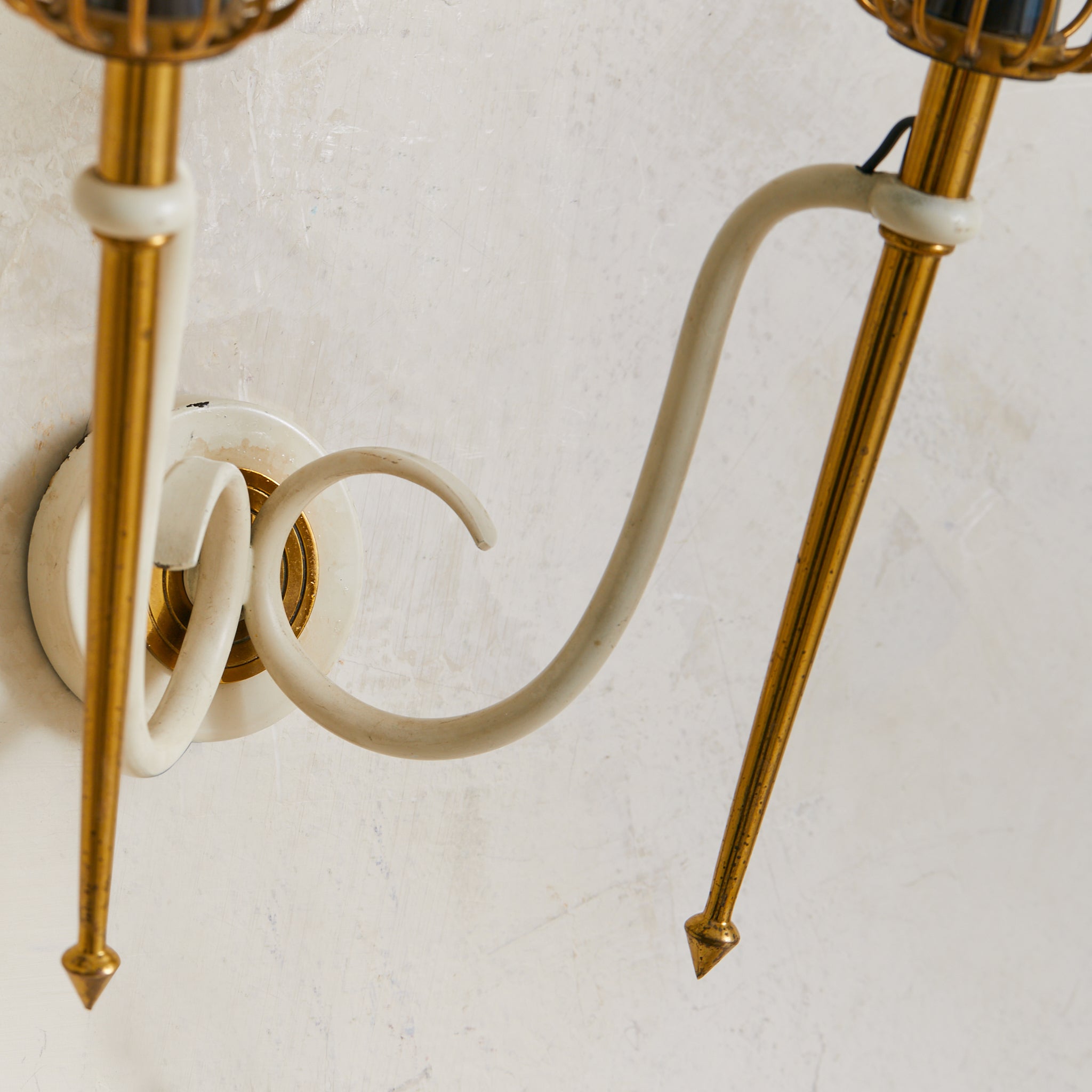 A French double-arm wall sconce from the 1950s, in the manner of Maison Arlus. Each arm scrolls outward in lacquered ivory metal, topped with a tapered brass spike and flared wire cage that cradles a black enamel cone. A round brass and ivory backplate anchors the silhouette.