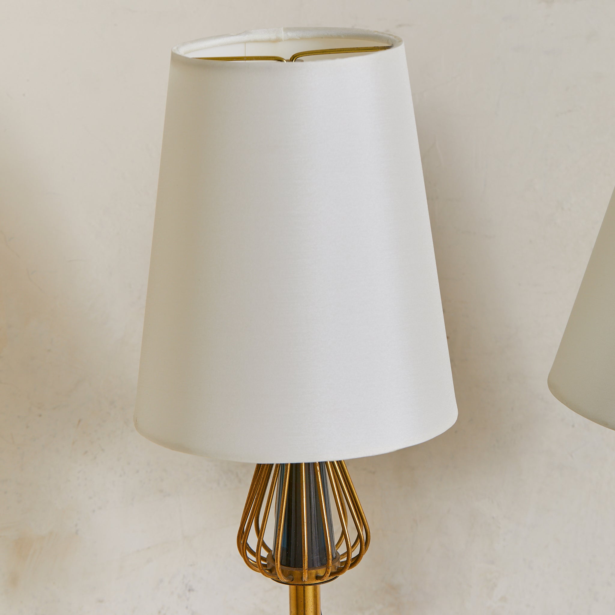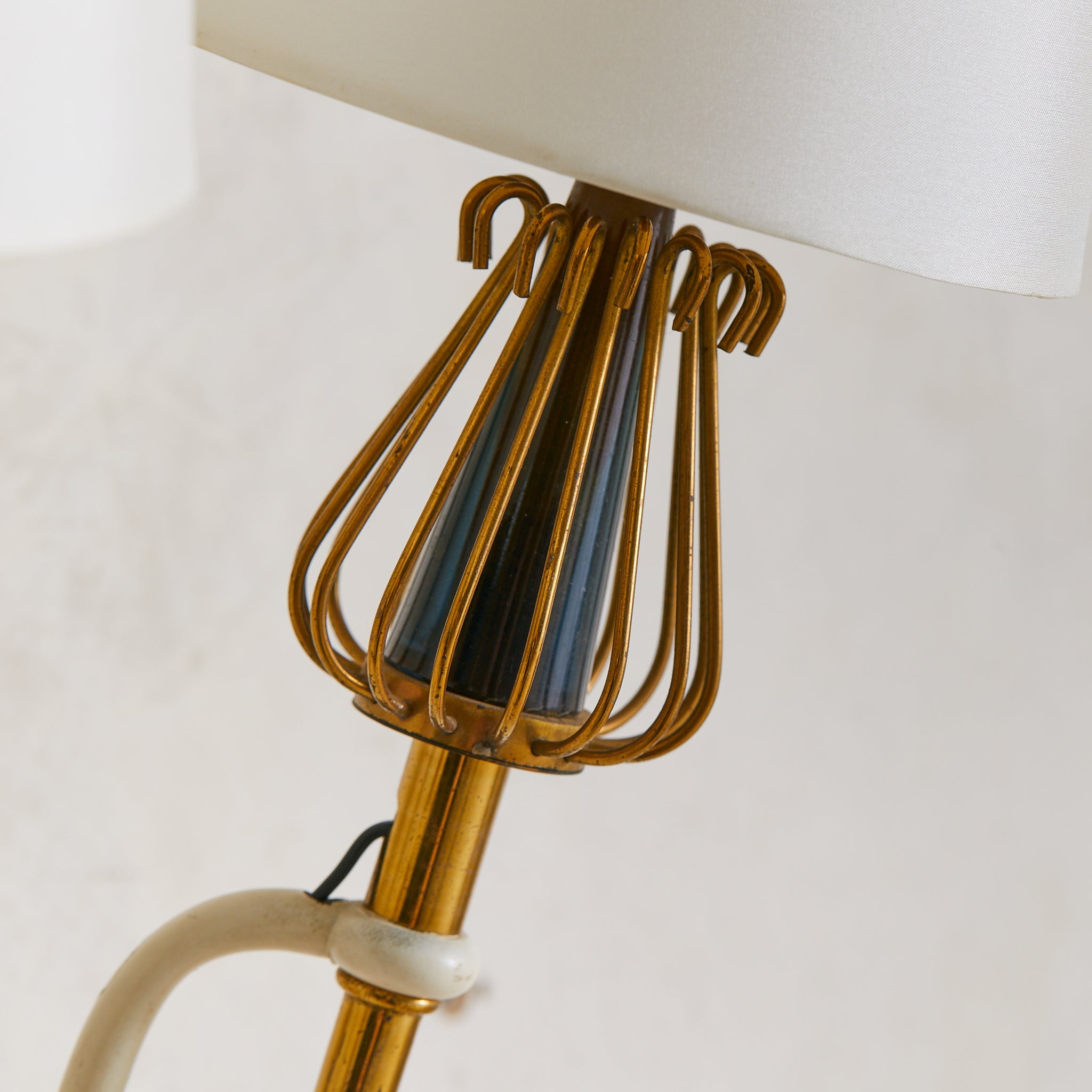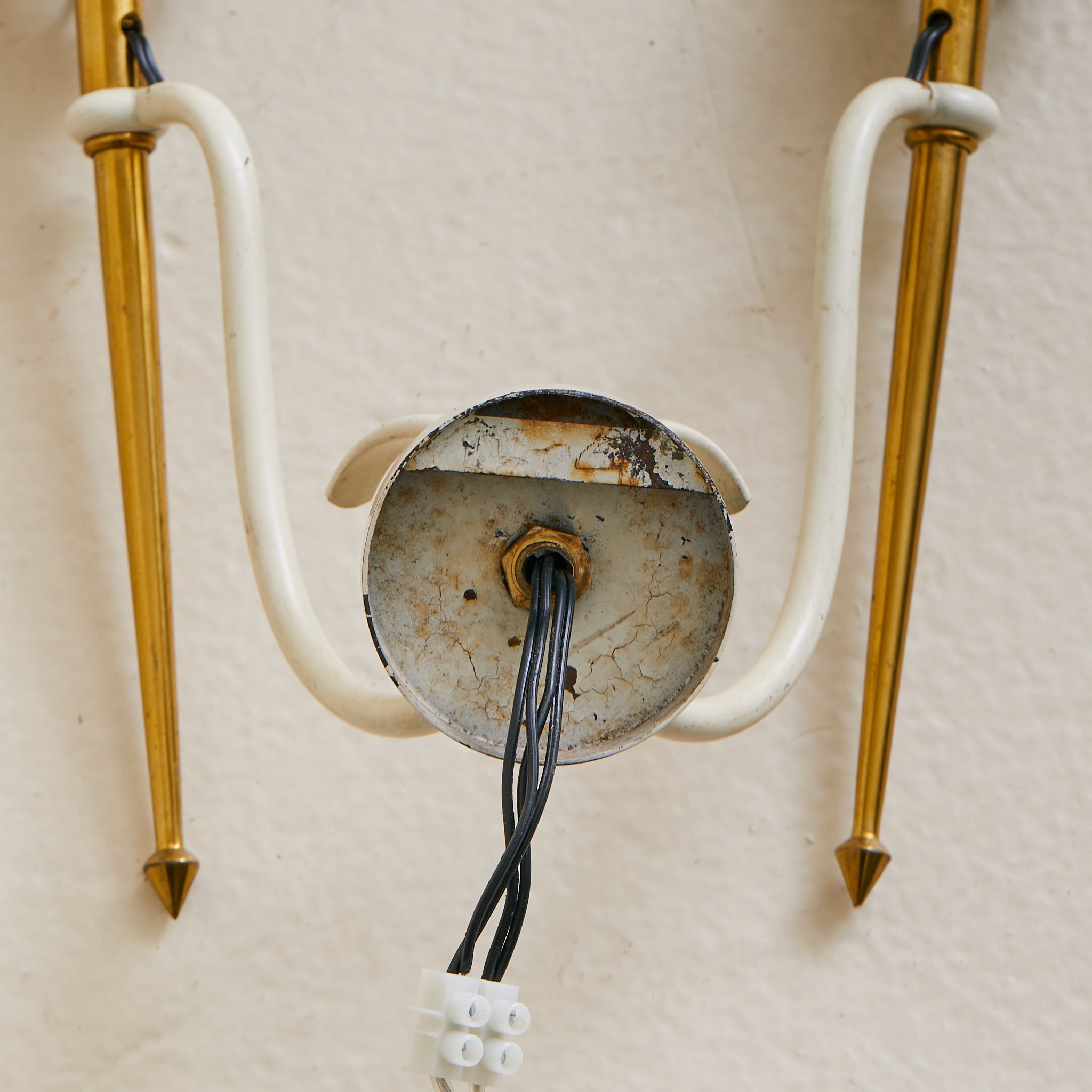 A French double-arm wall sconce from the 1950s, in the manner of Maison Arlus. Each arm scrolls outward in lacquered ivory metal, topped with a tapered brass spike and flared wire cage that cradles a black enamel cone. A round brass and ivory backplate anchors the silhouette.