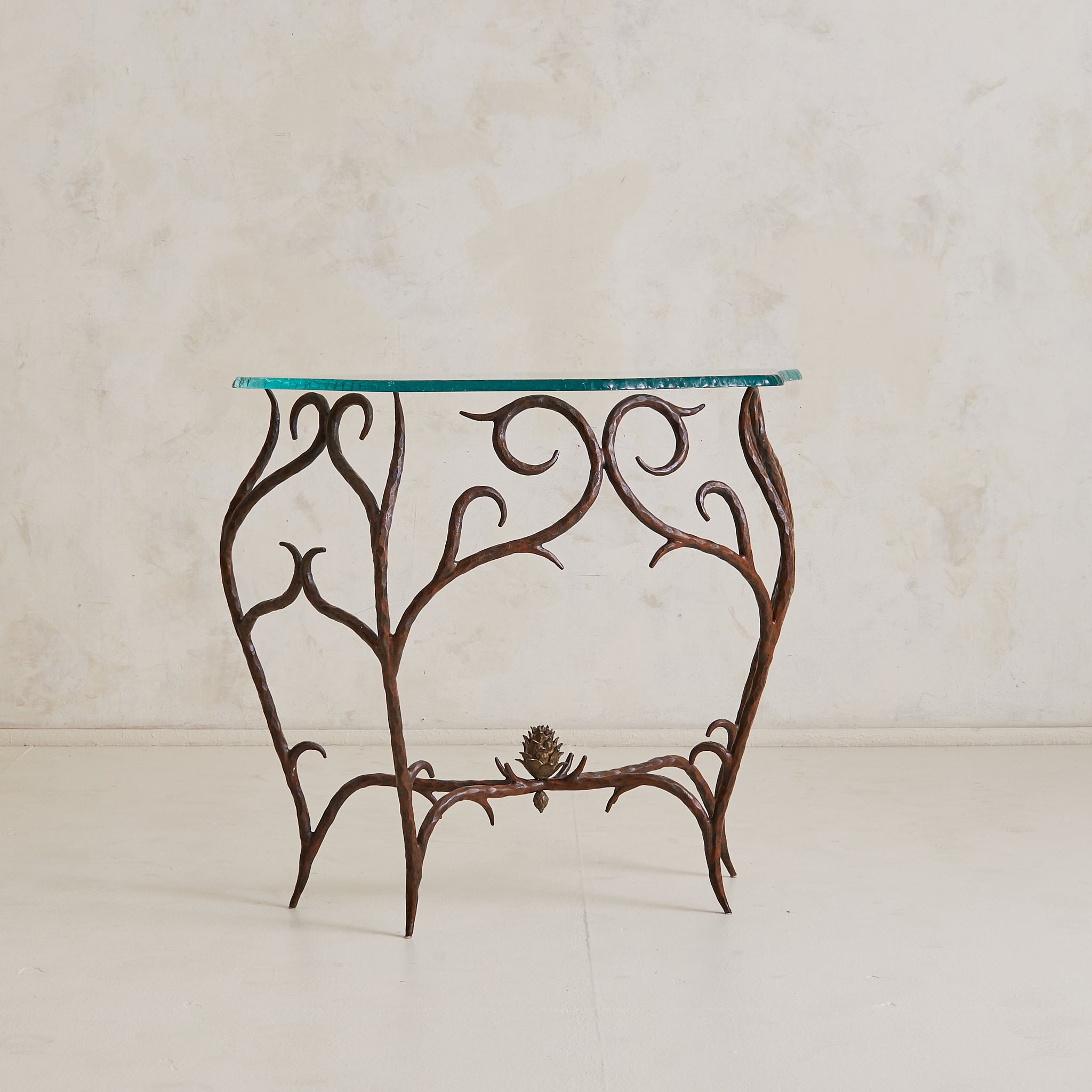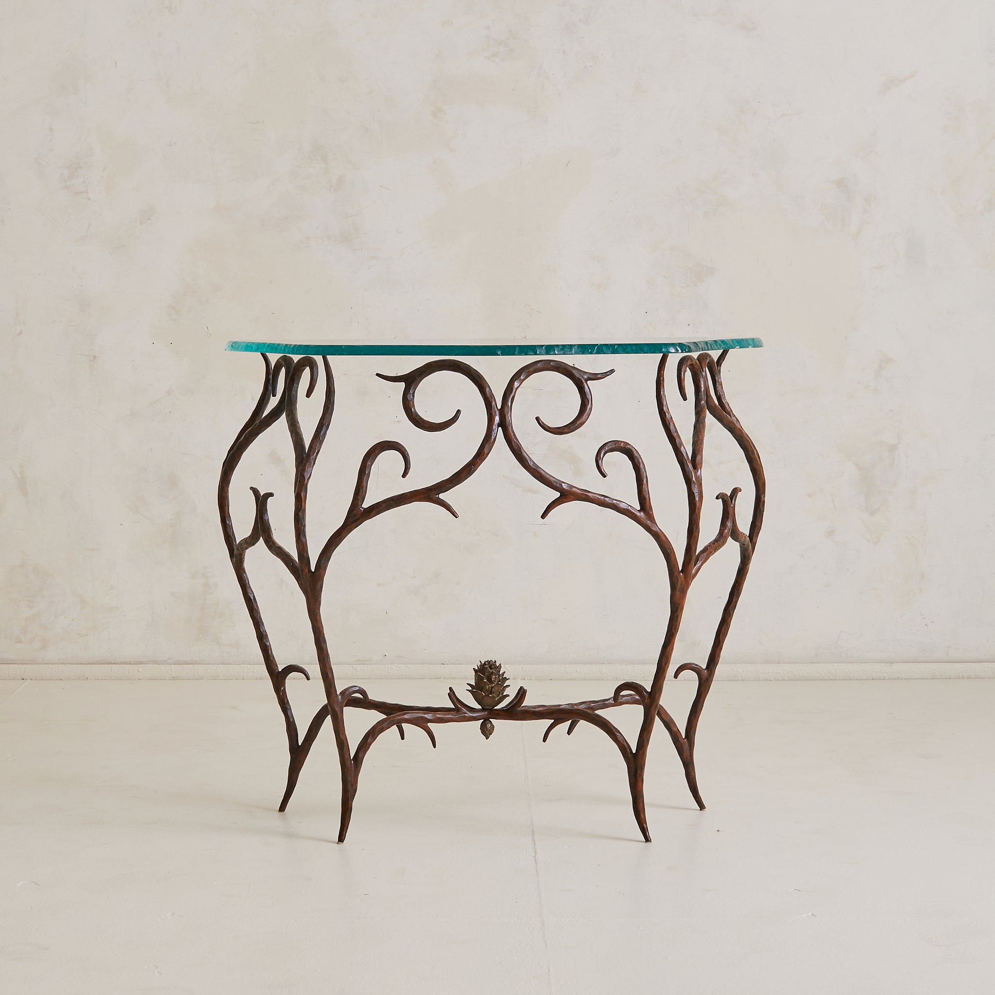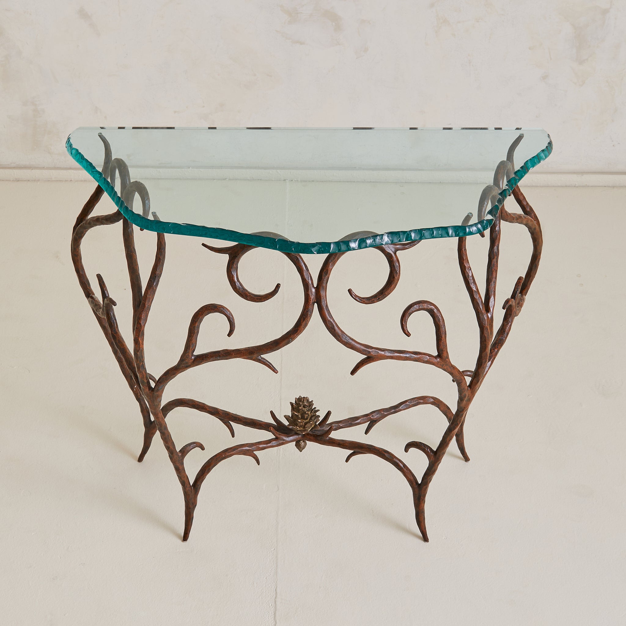 A lyrical French console table from the 1970s, crafted in hand-forged bronze with a chiseled glass top. The frame unfolds in scrolling lines and branching limbs, each hammered with intention. At its base, a cast bronze pinecone nods to nature as muse. The thick glass top is cut in an organic silhouette with a heavily textured edge.