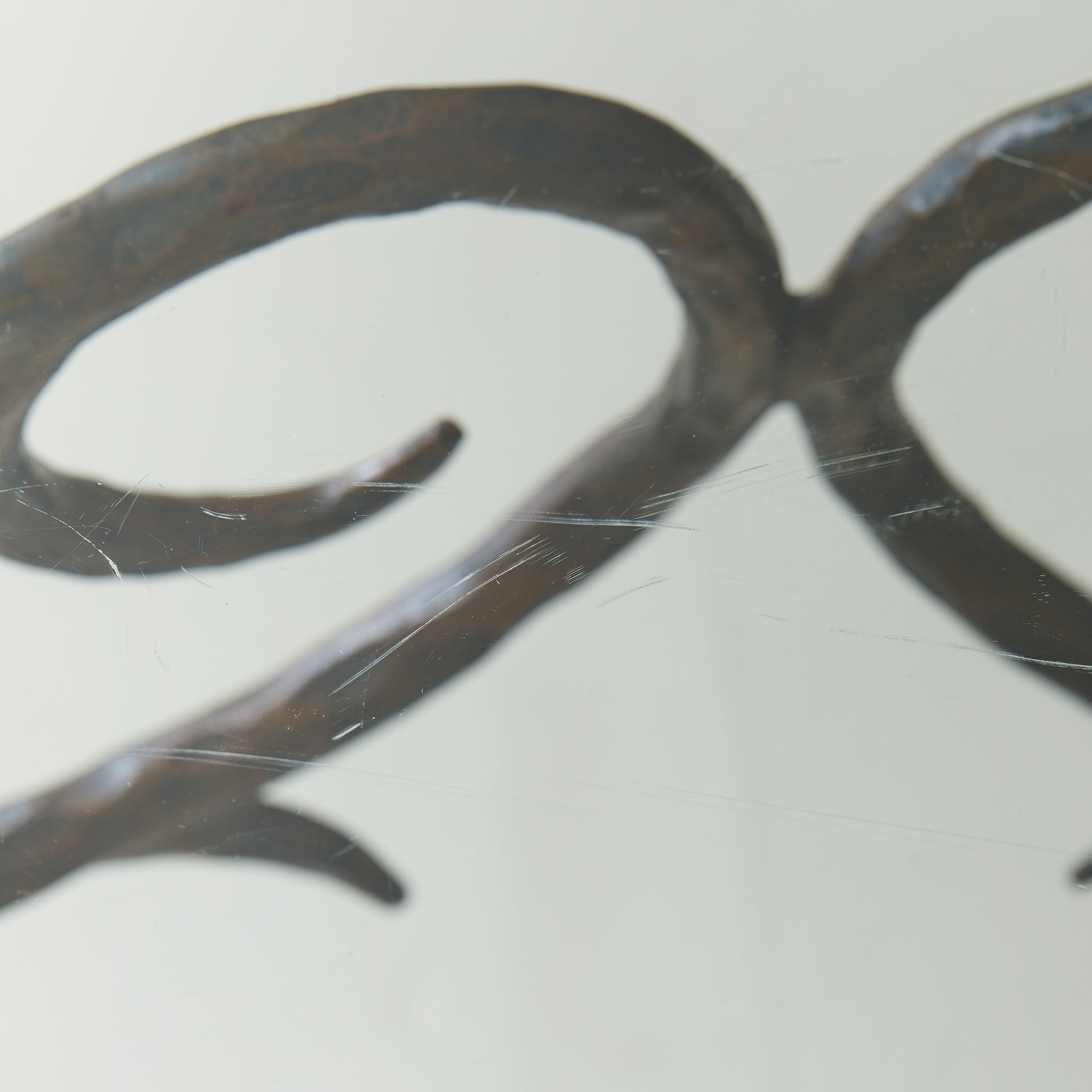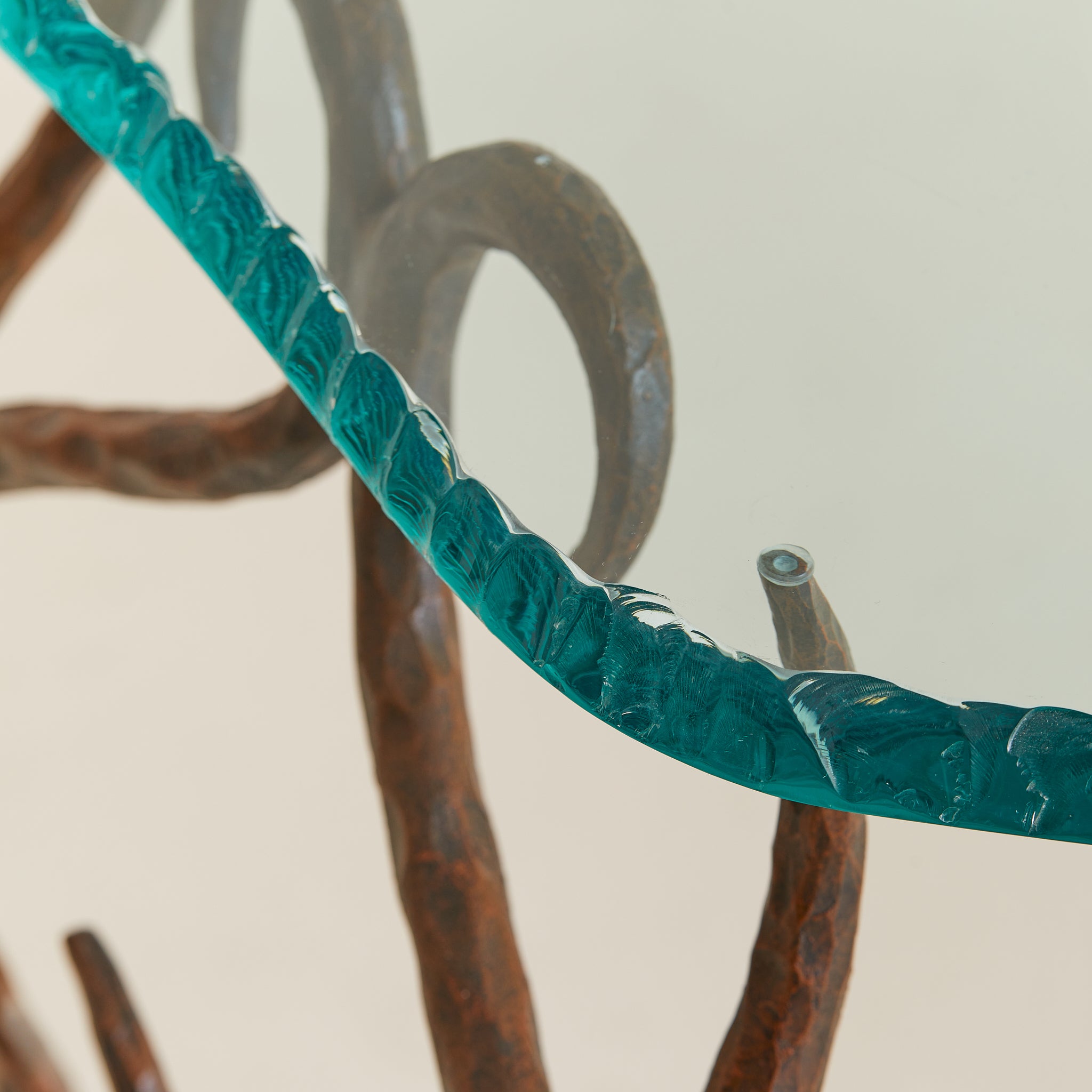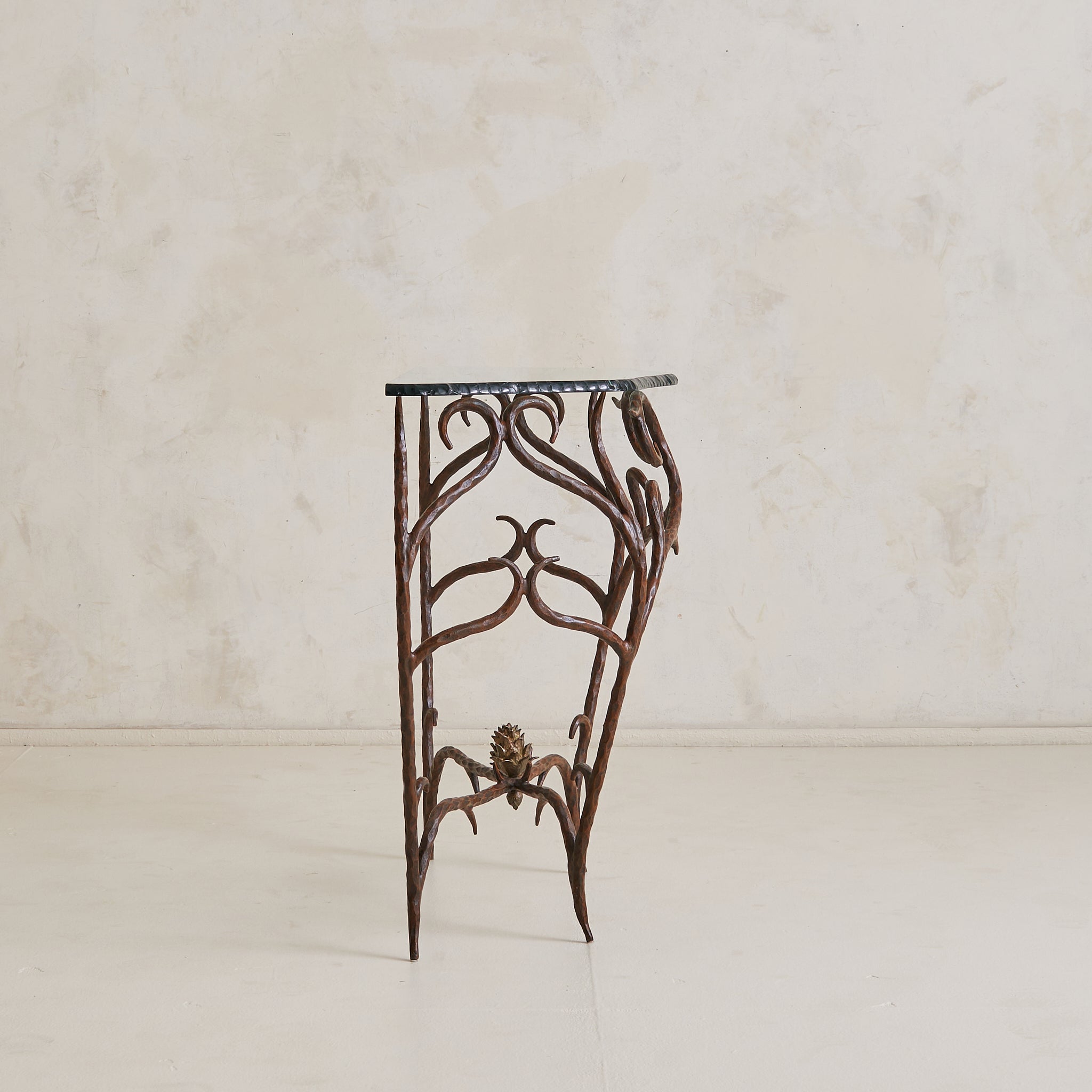 A lyrical French console table from the 1970s, crafted in hand-forged bronze with a chiseled glass top. The frame unfolds in scrolling lines and branching limbs, each hammered with intention. At its base, a cast bronze pinecone nods to nature as muse. The thick glass top is cut in an organic silhouette with a heavily textured edge.