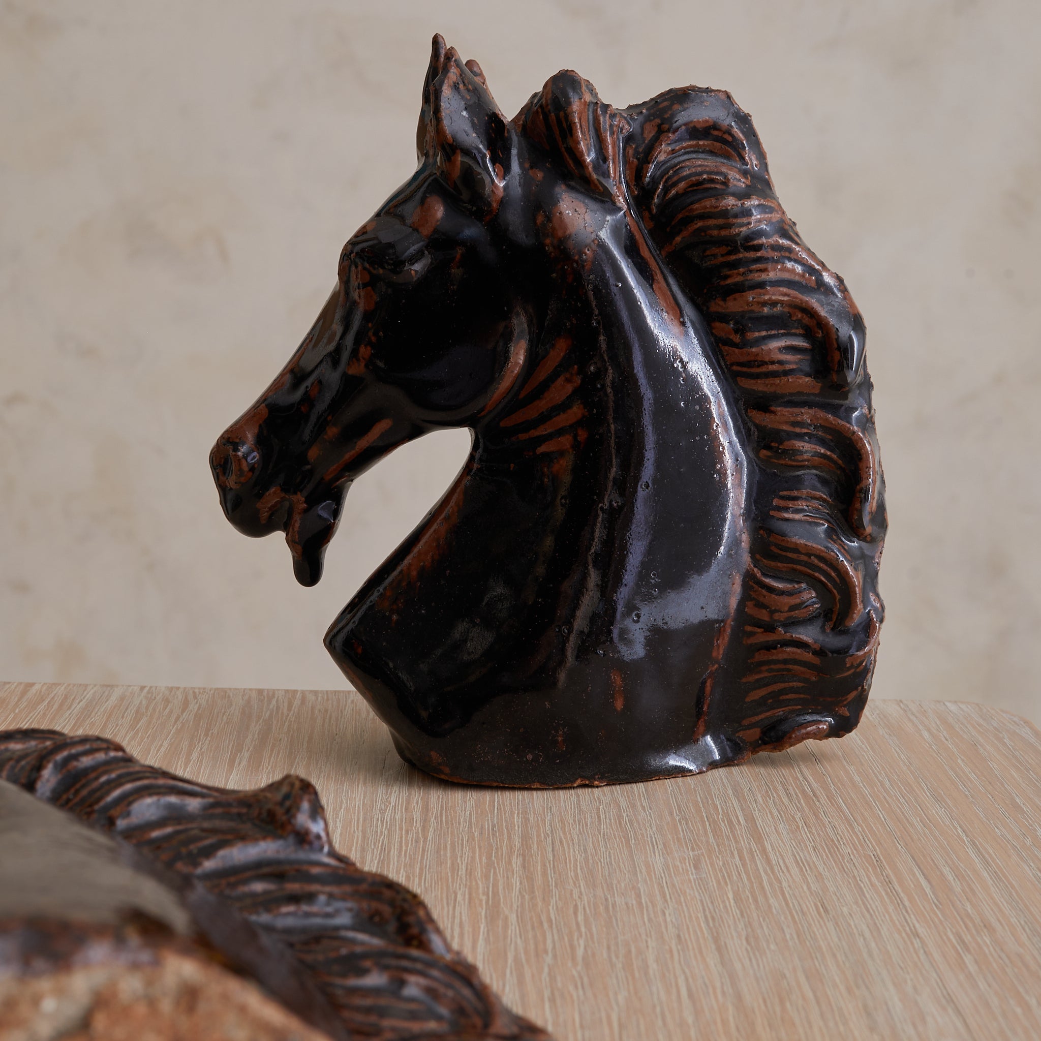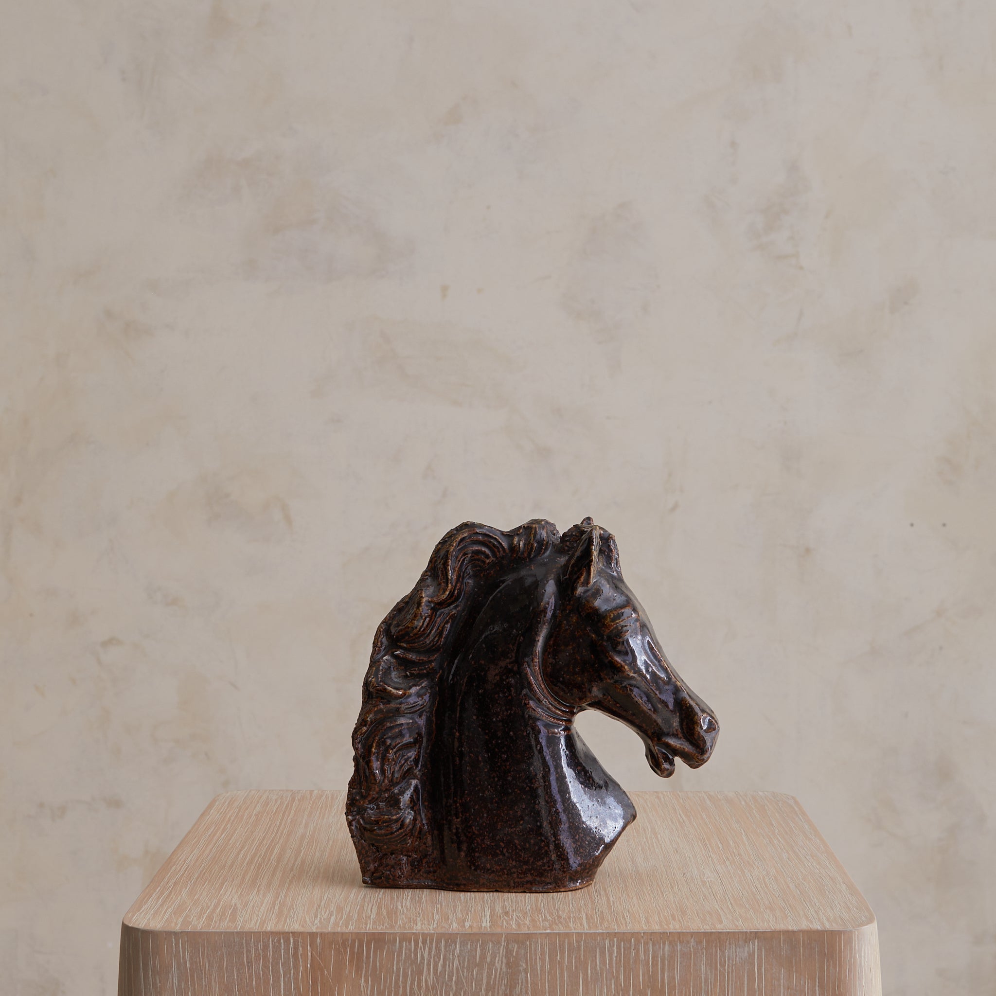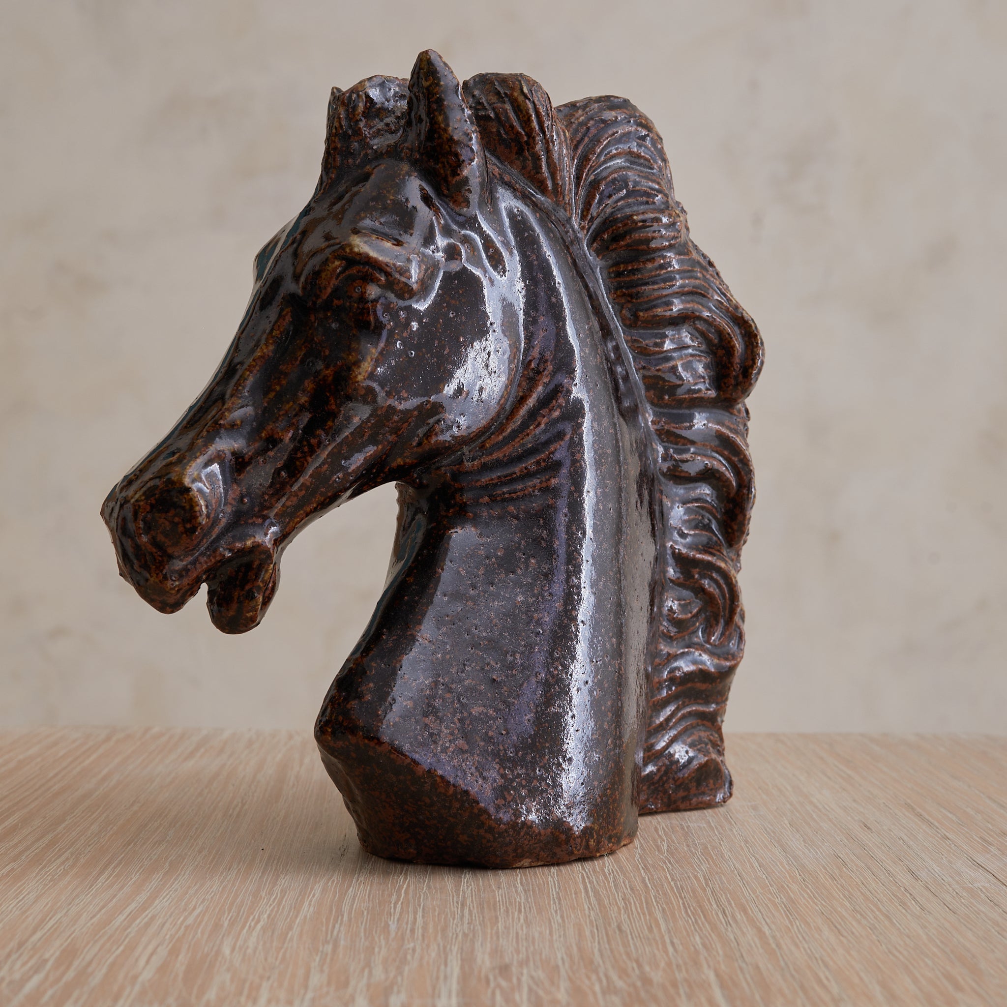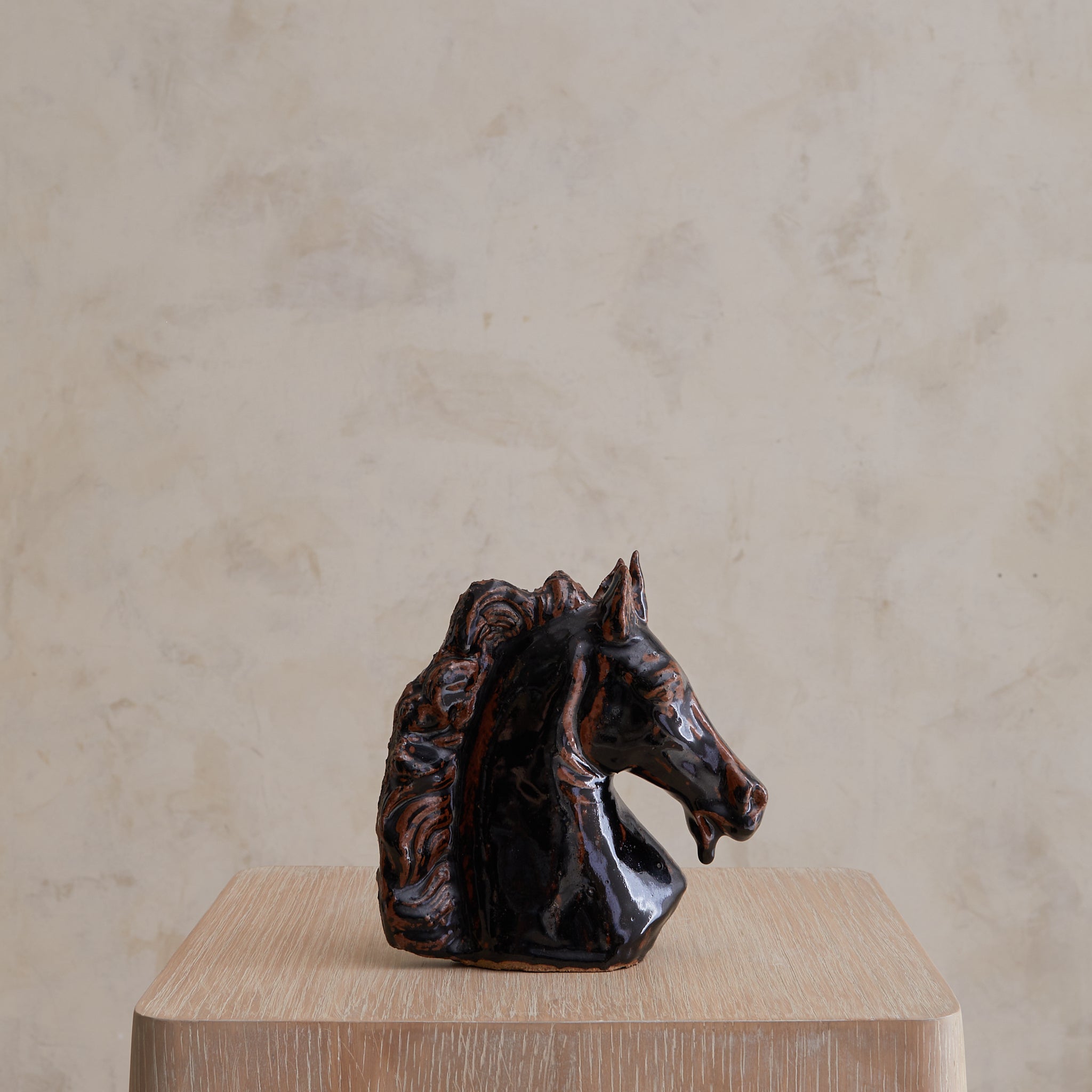 A French ceramic horse head sculpture, dating to the 1960s. Rendered in glazed earthenware with deep umber and rust tones, its expressive contours capture the strength and poise of equine form in profile. Each piece is hollow-cast and hand-finished, with subtle variations in texture and sheen.