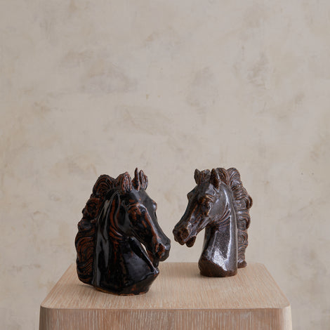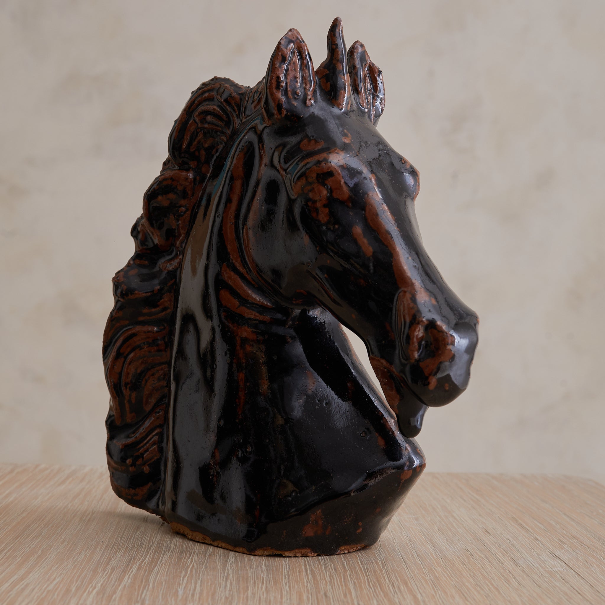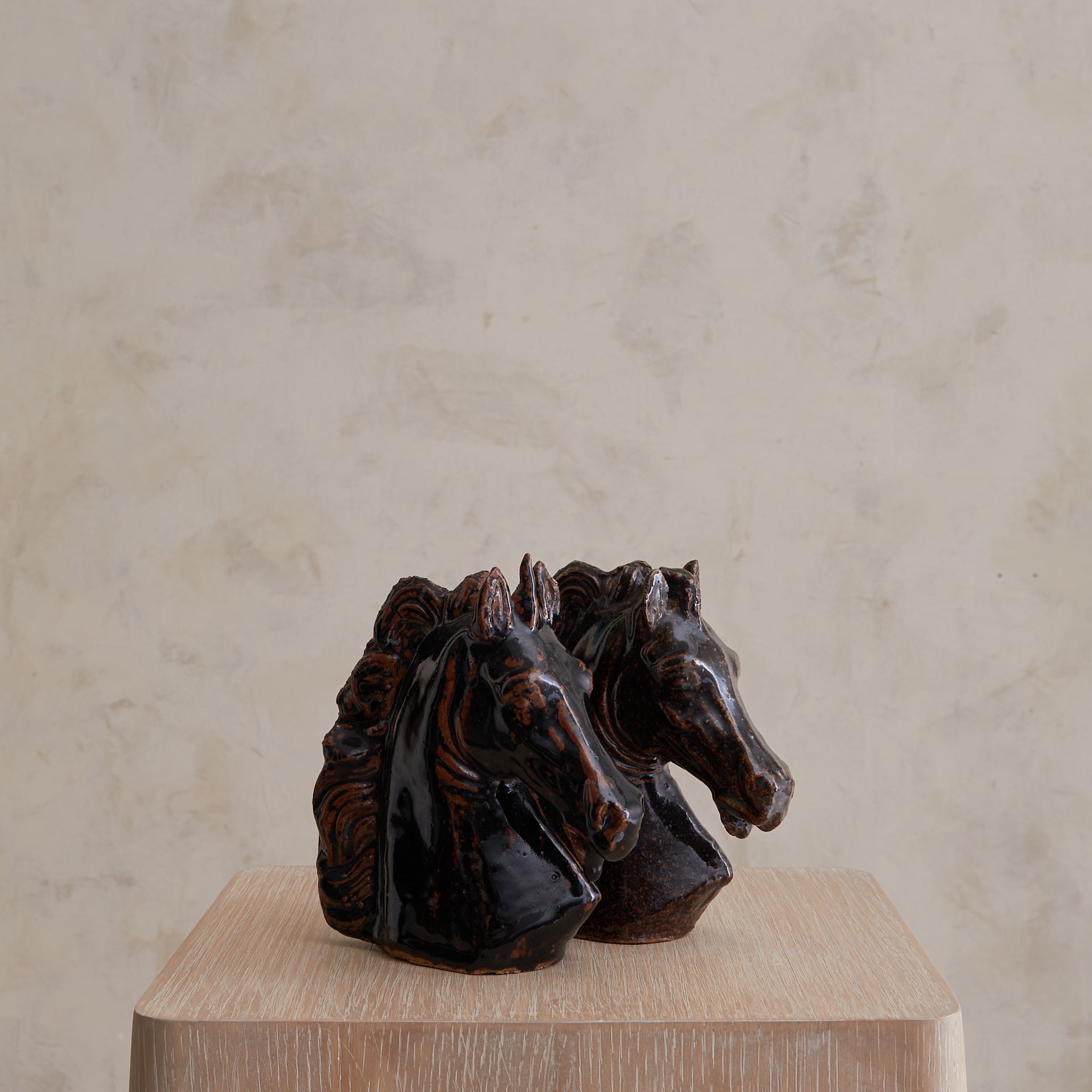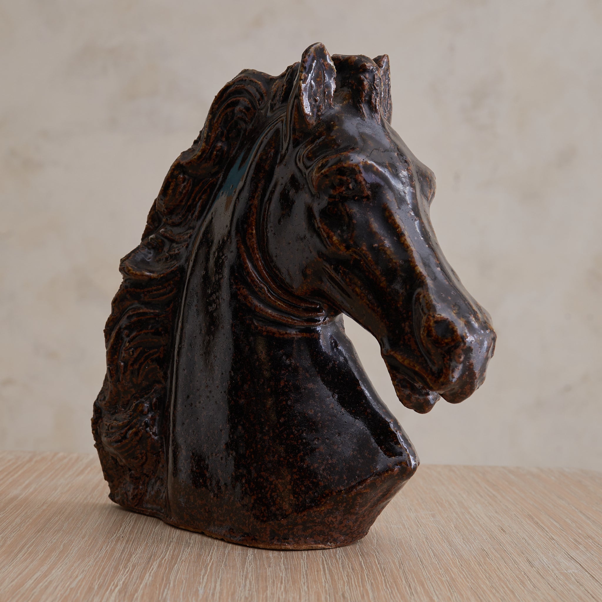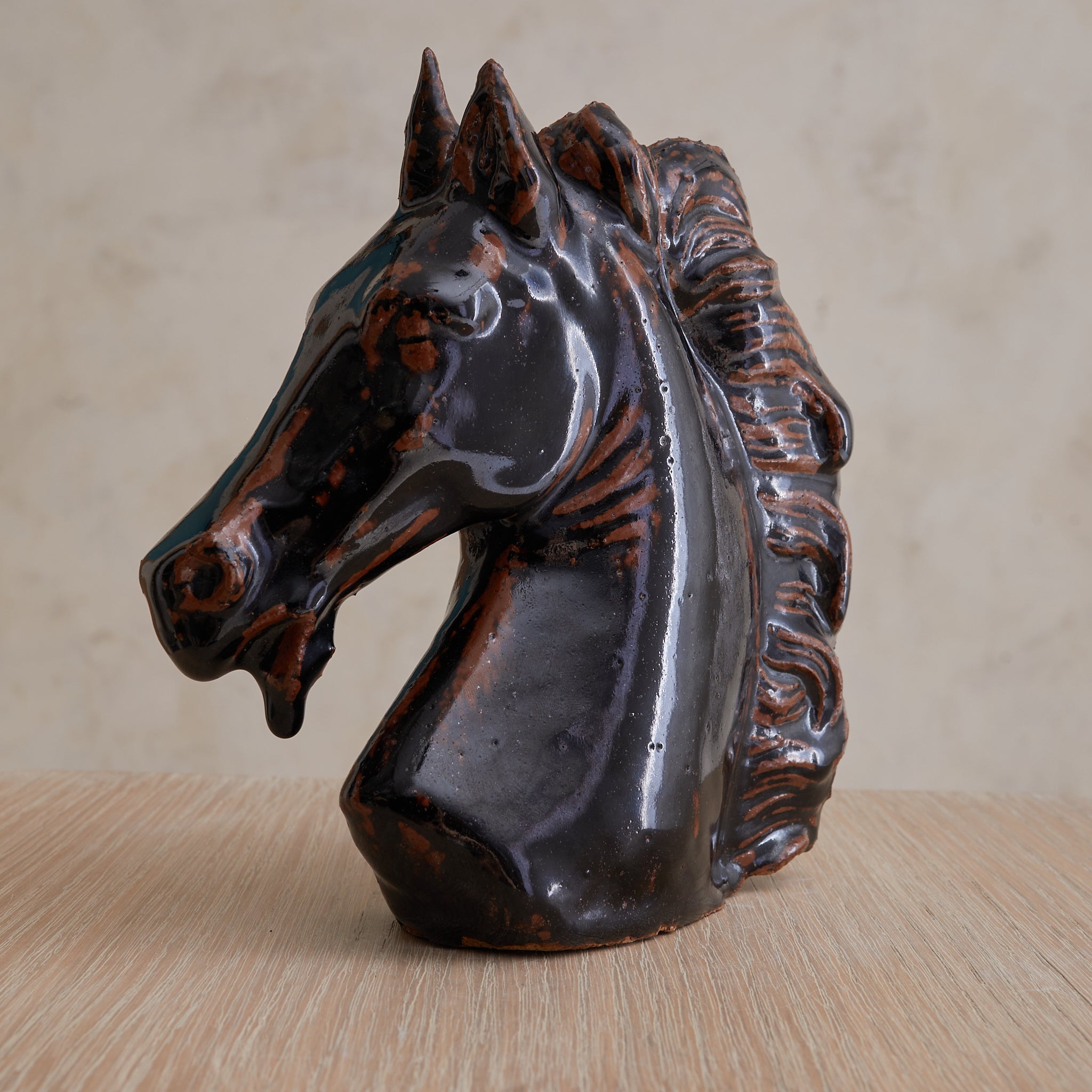 A French ceramic horse head sculpture, dating to the 1960s. Rendered in glazed earthenware with deep umber and rust tones, its expressive contours capture the strength and poise of equine form in profile. Each piece is hollow-cast and hand-finished, with subtle variations in texture and sheen.