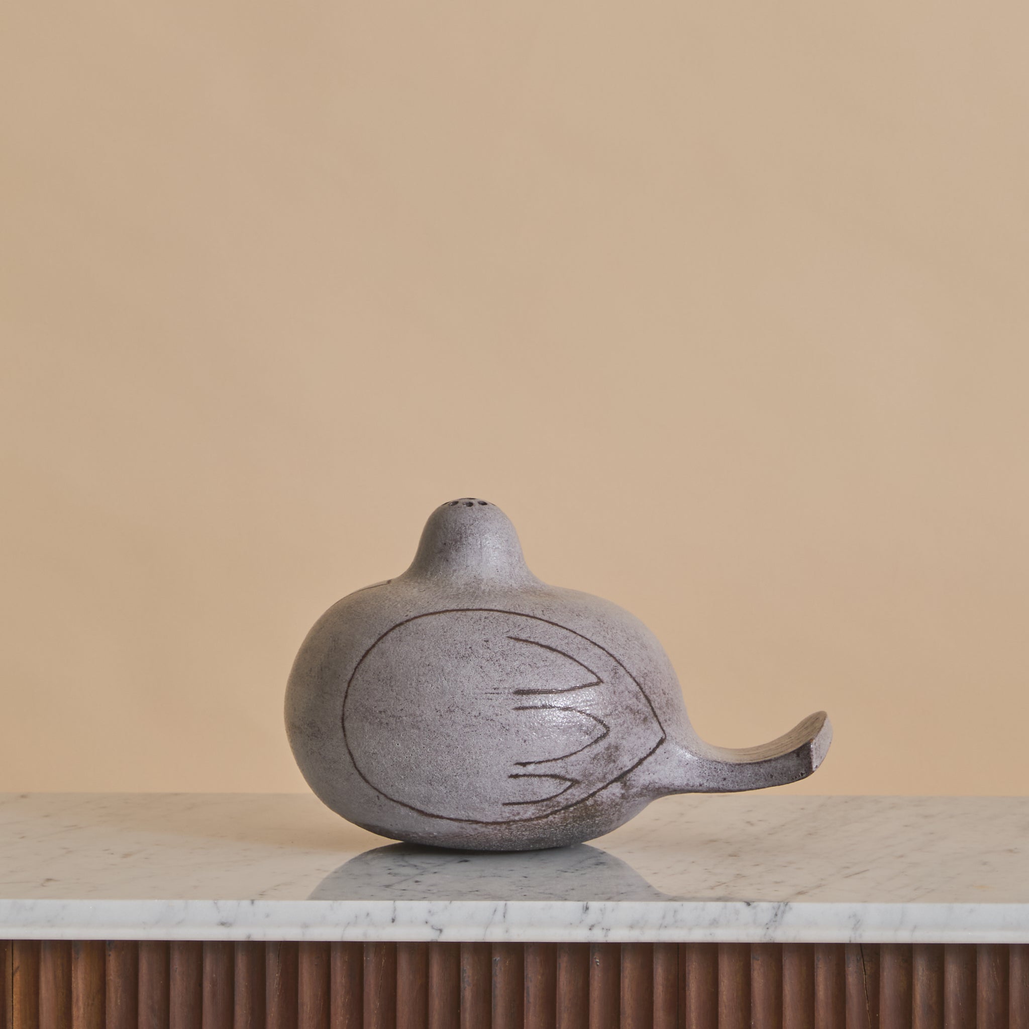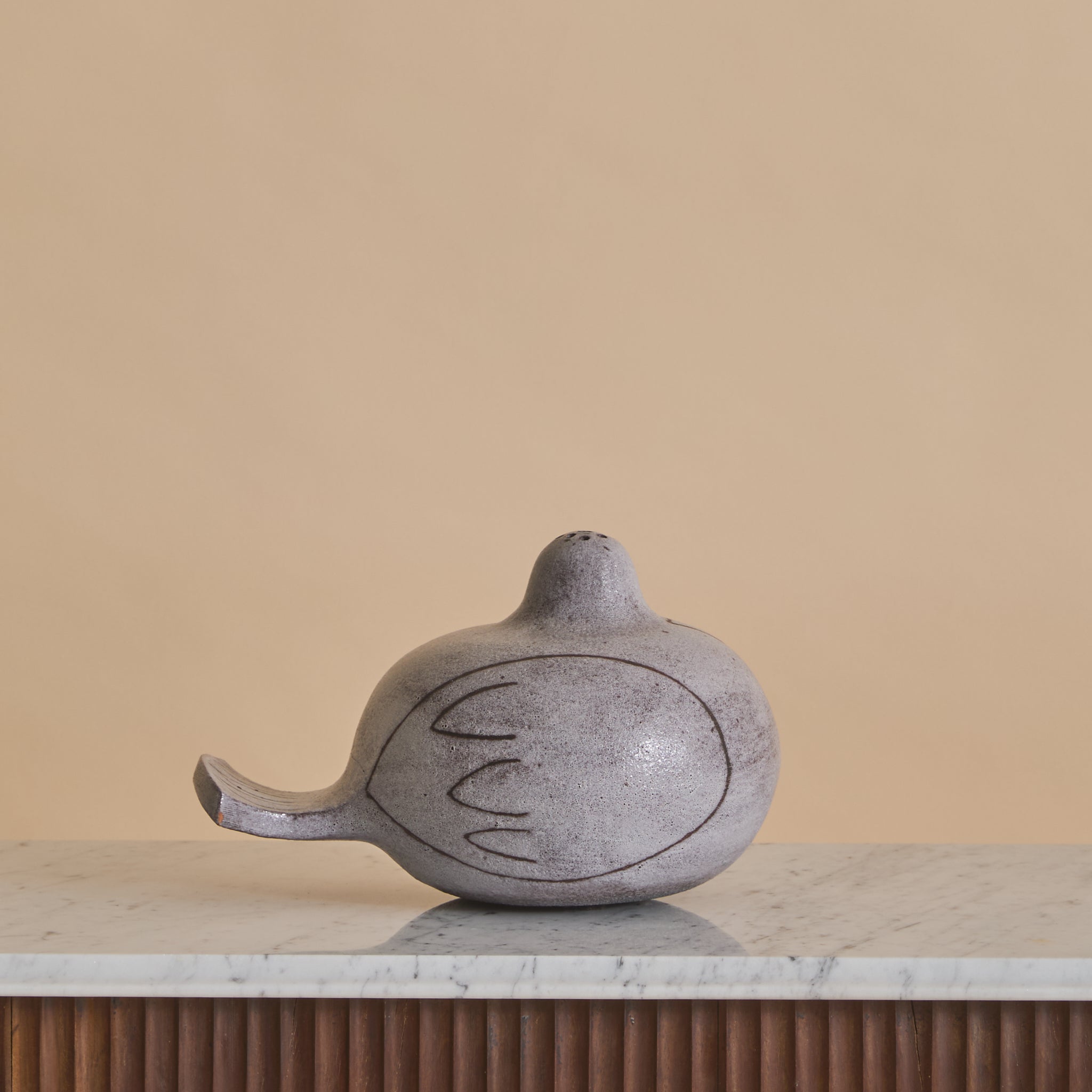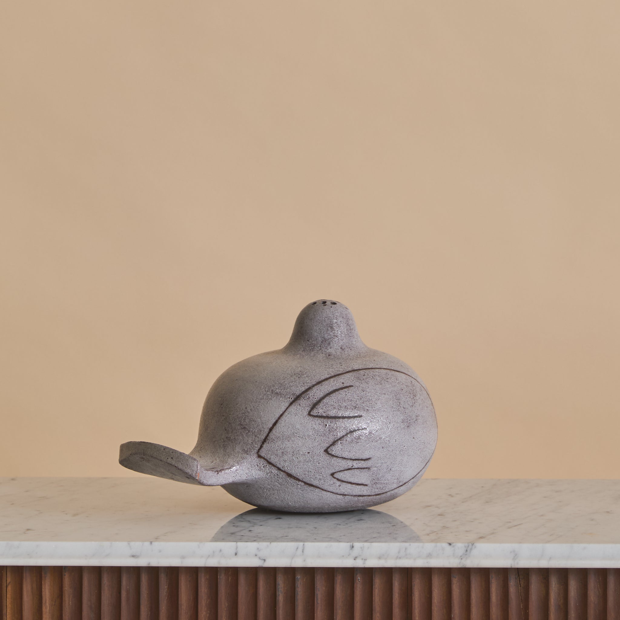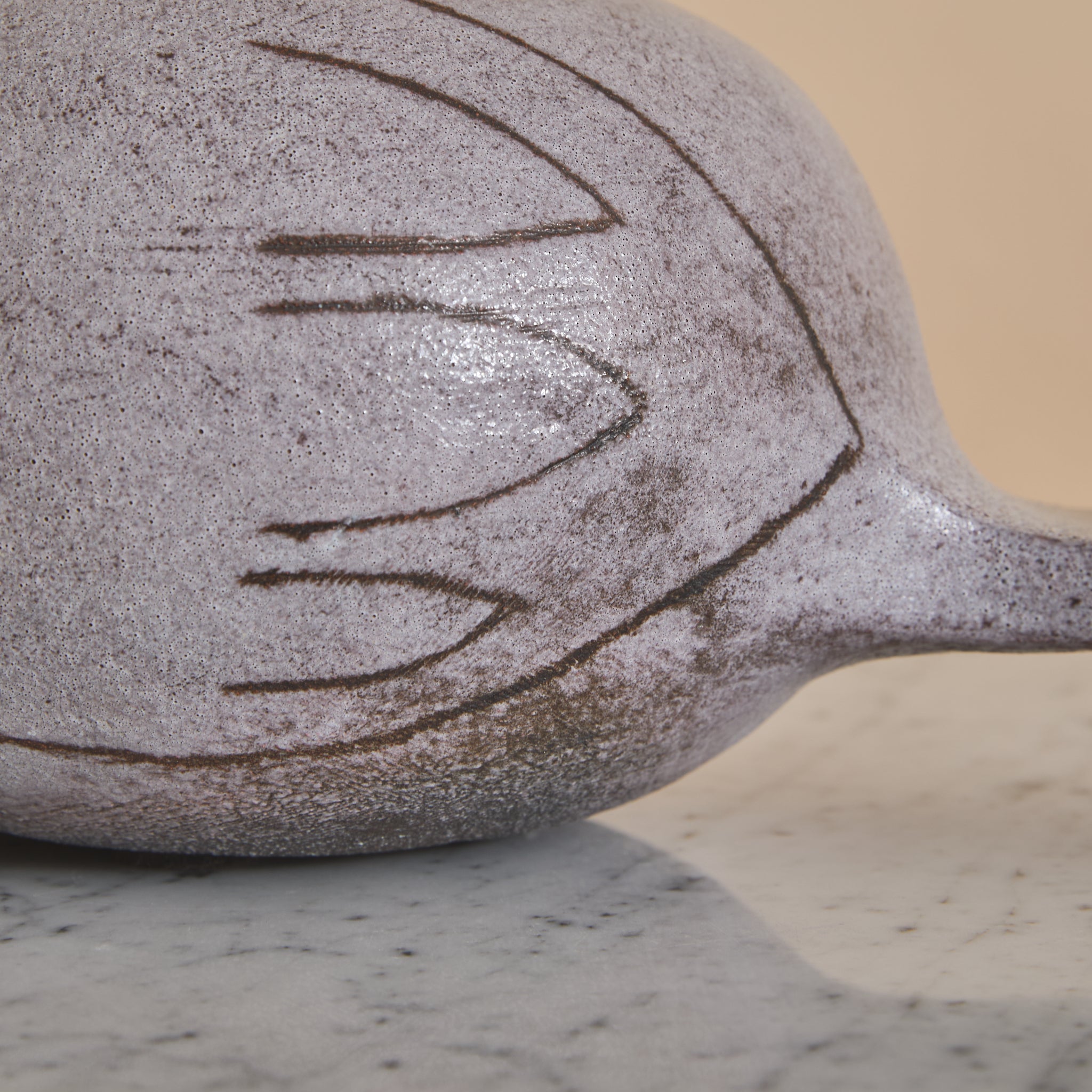 The surface is coated in a matte, stone-toned glaze with subtle speckling and tonal variation. Incised linear details suggest wing and feather contours, lending graphic definition.
