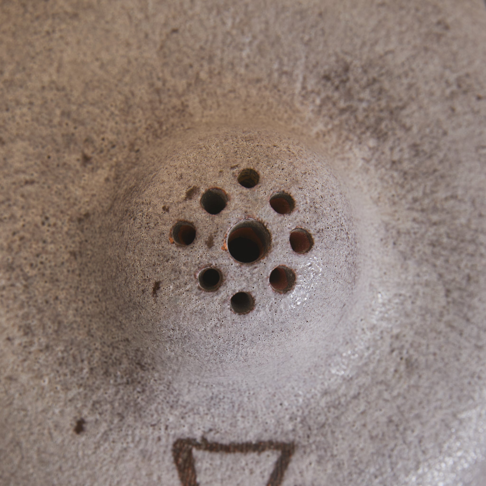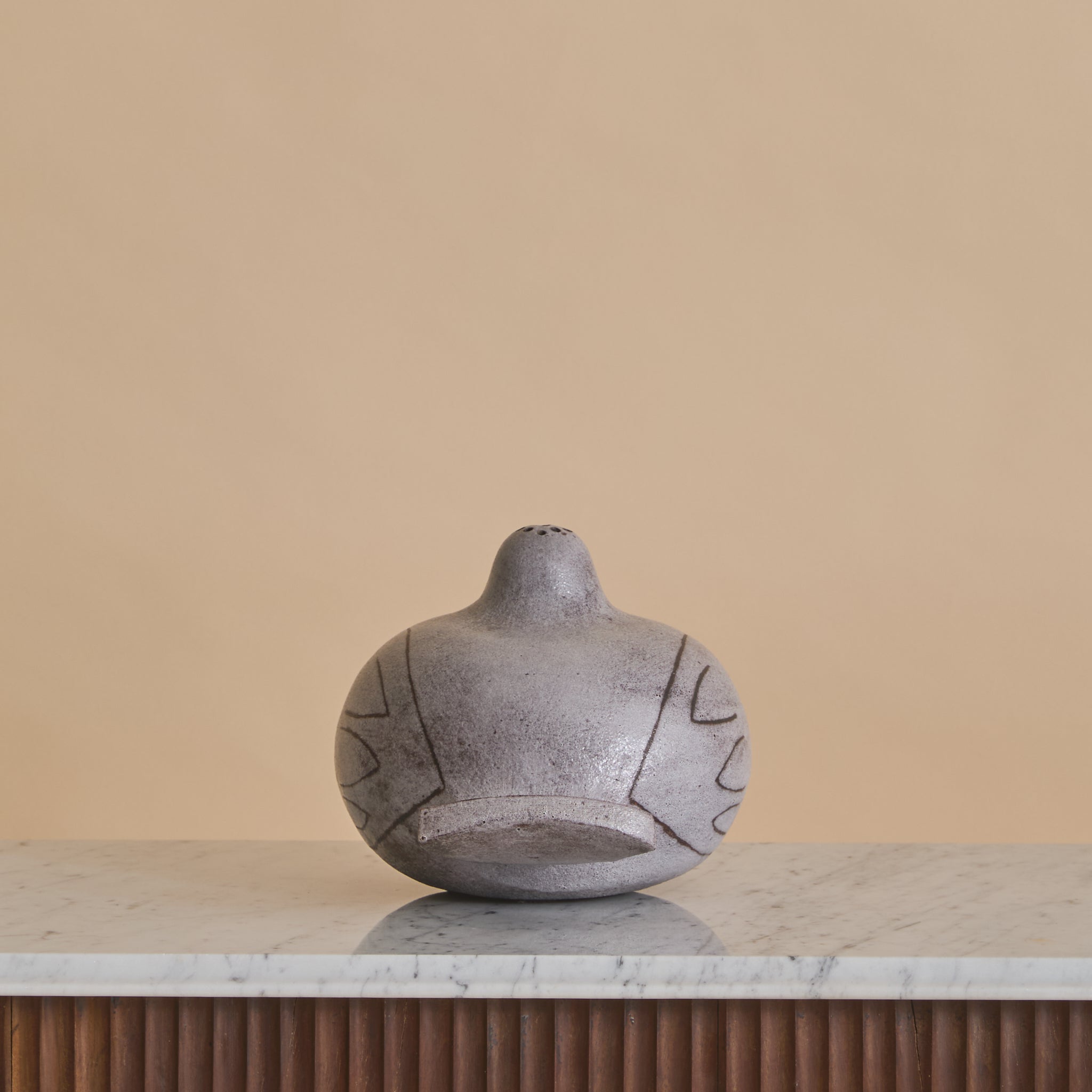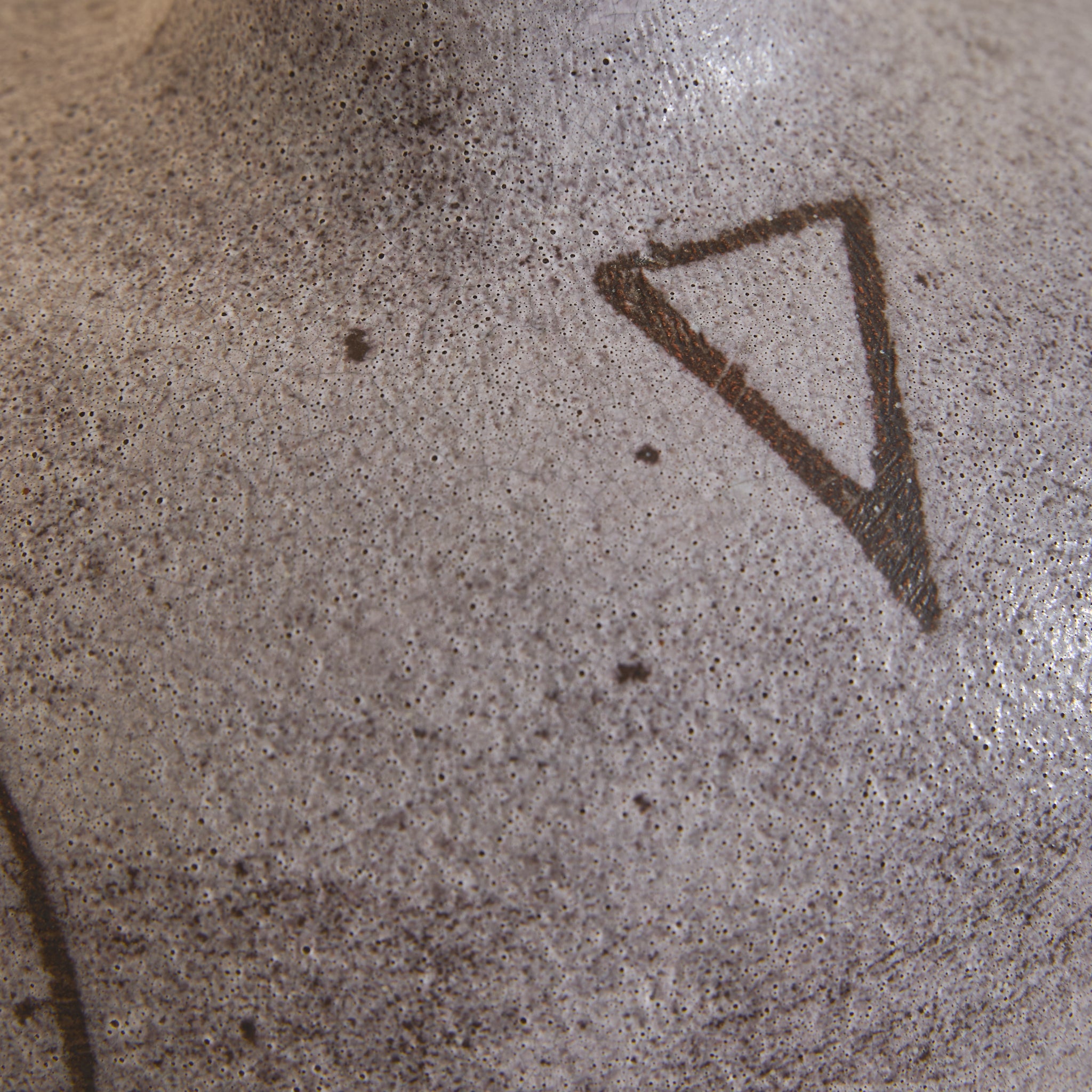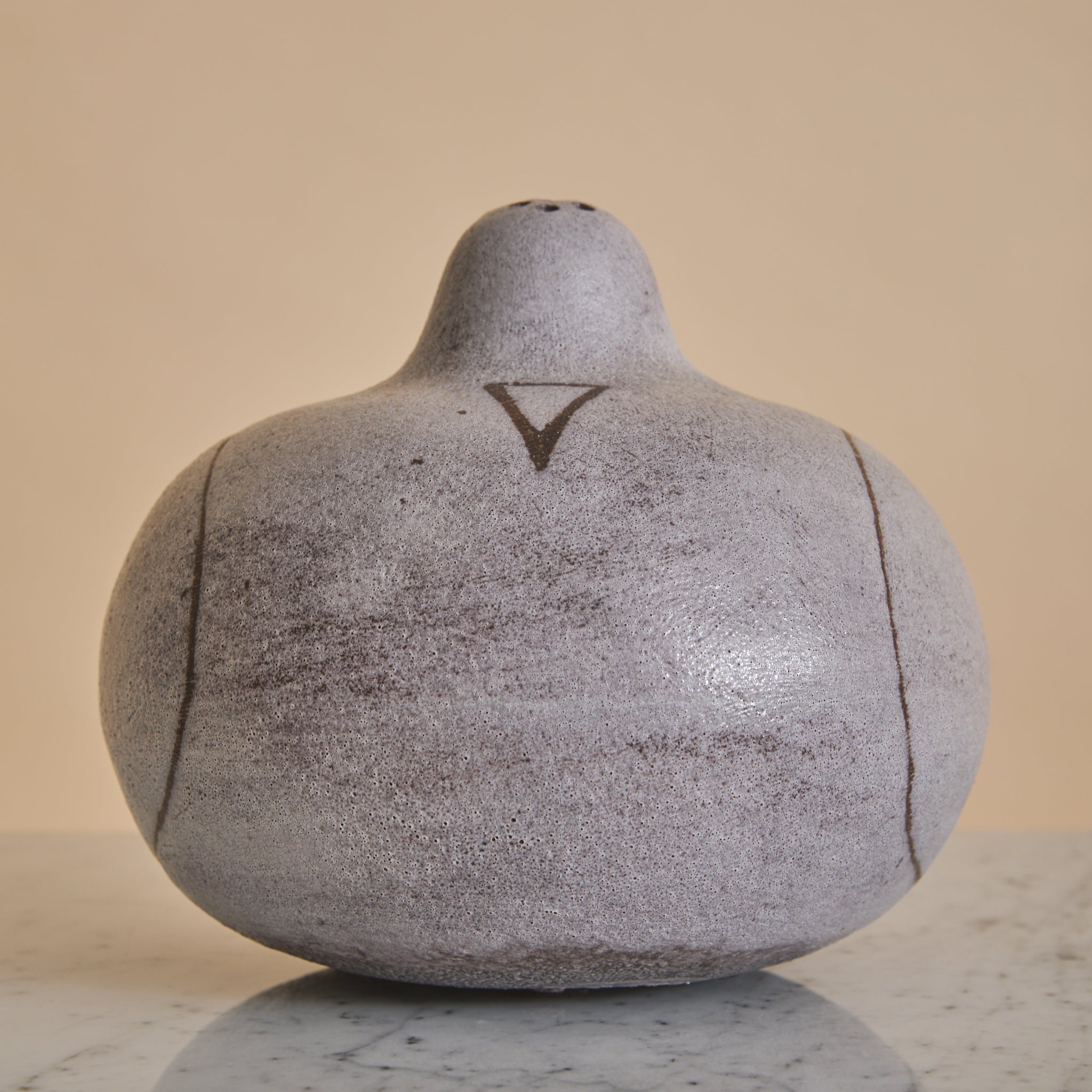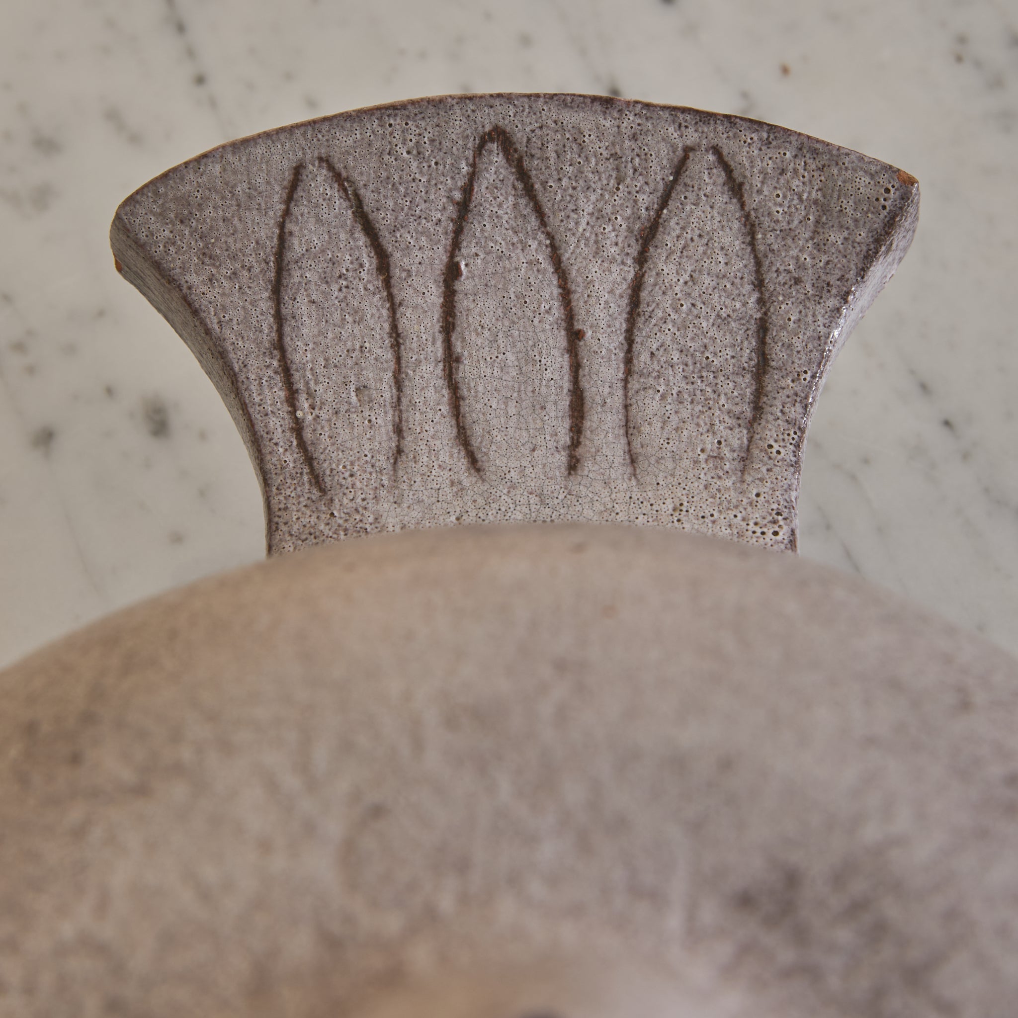 The surface is coated in a matte, stone-toned glaze with subtle speckling and tonal variation. Incised linear details suggest wing and feather contours, lending graphic definition.