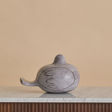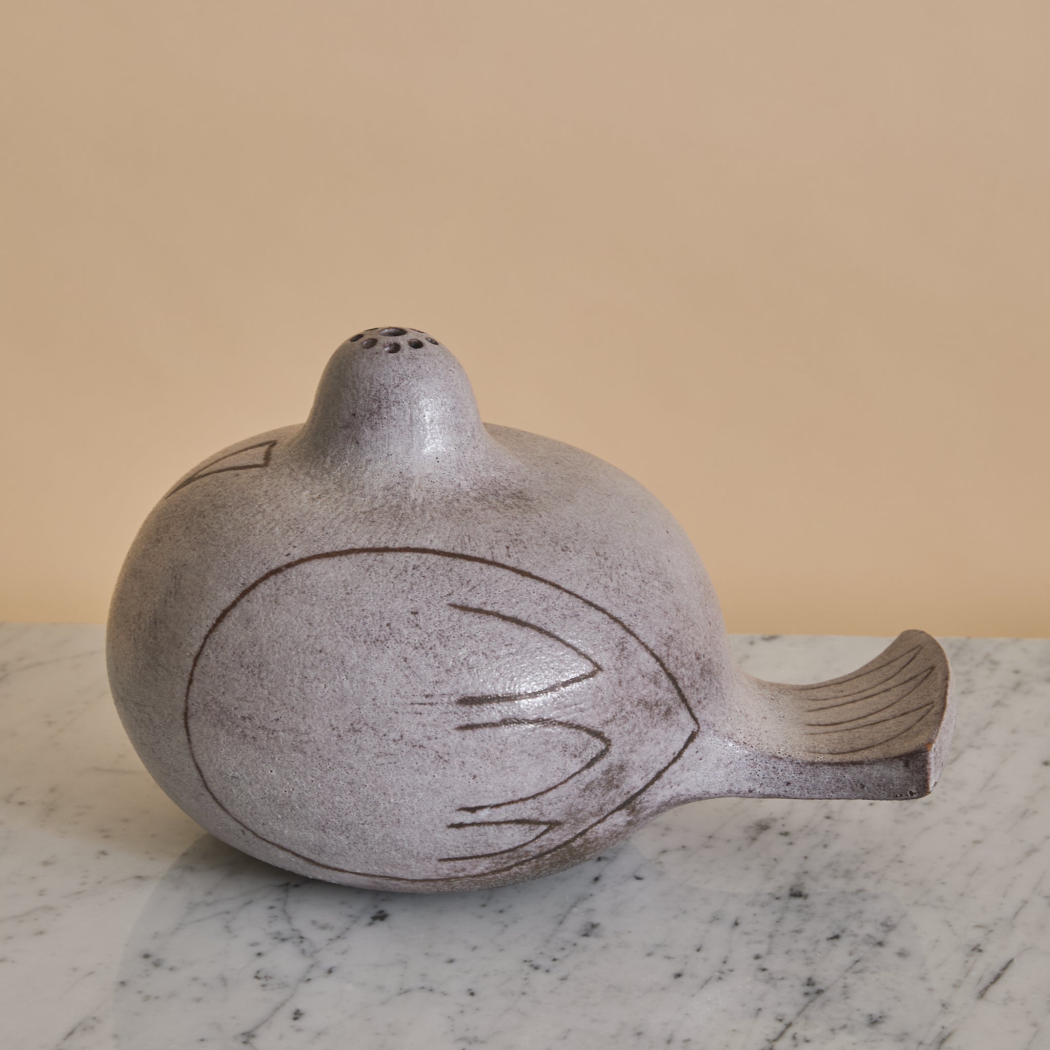 A French ceramic bird sculpture from the 1960s, conceived as both object and vessel. Modeled in a softly rounded, abstracted avian form, the piece rests horizontally with a gently extended tail and a raised head punctuated by multiple small openings designed to hold individual stems.