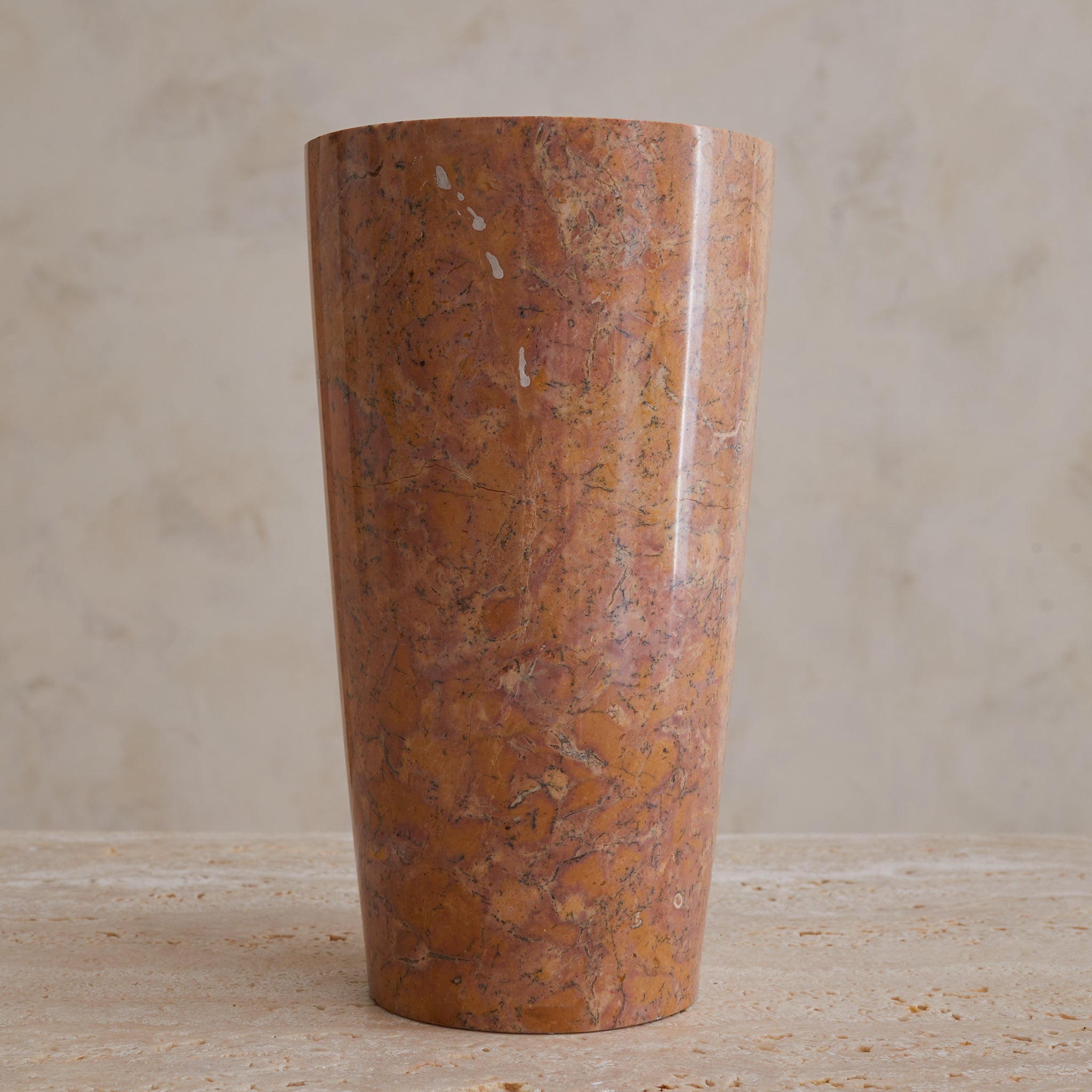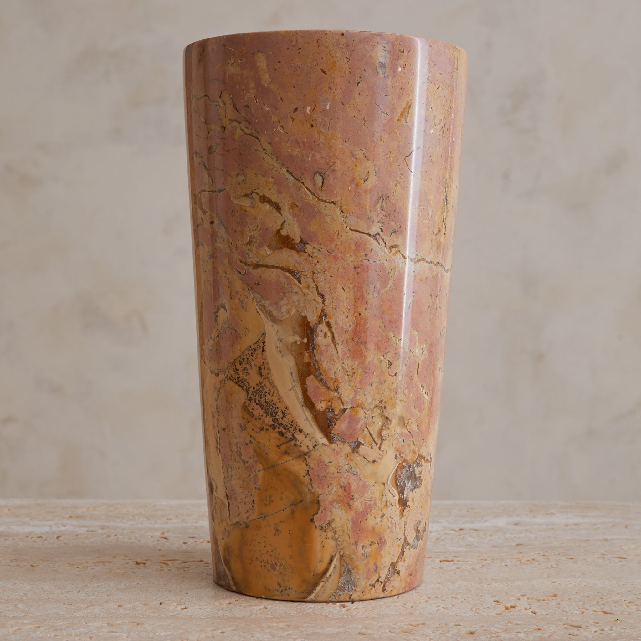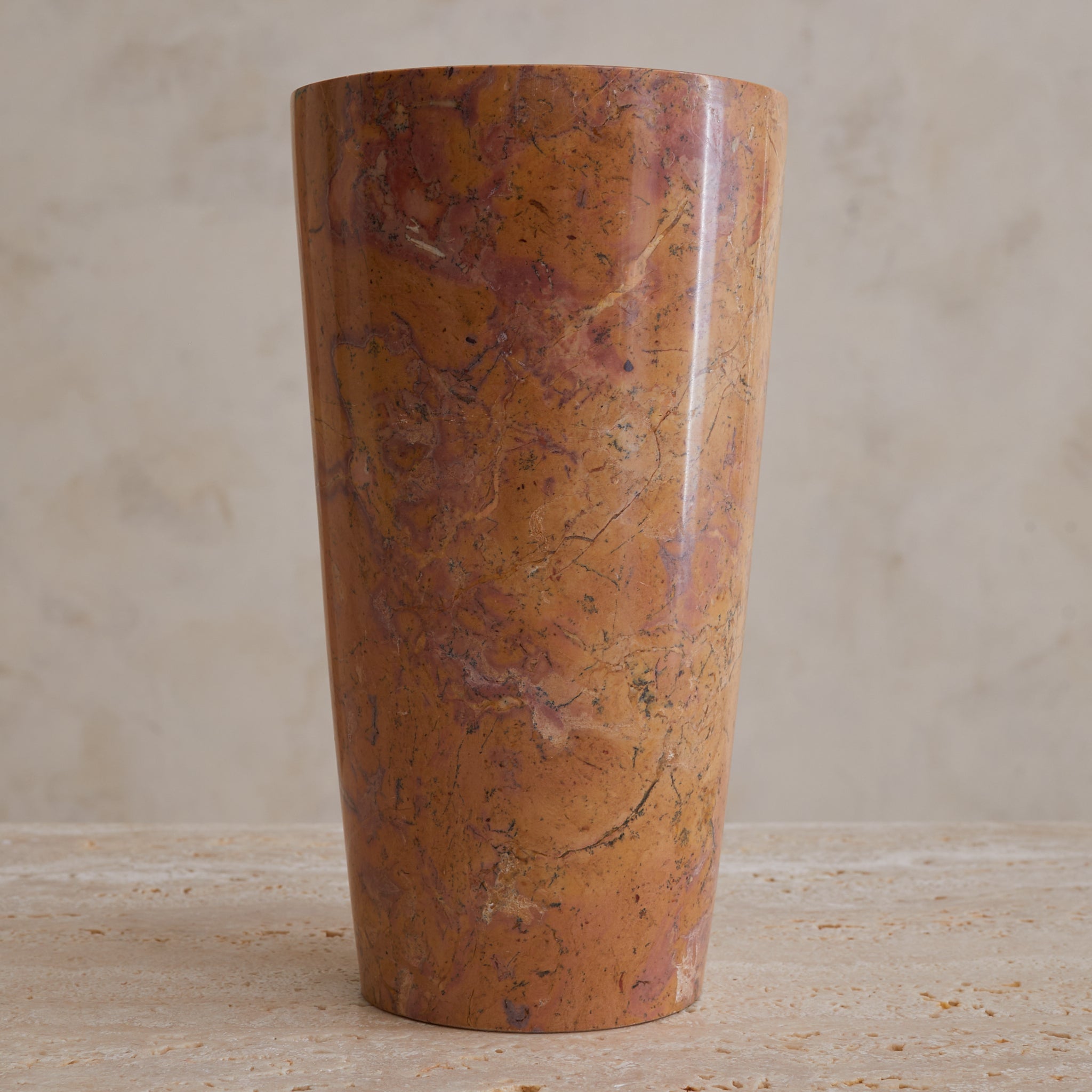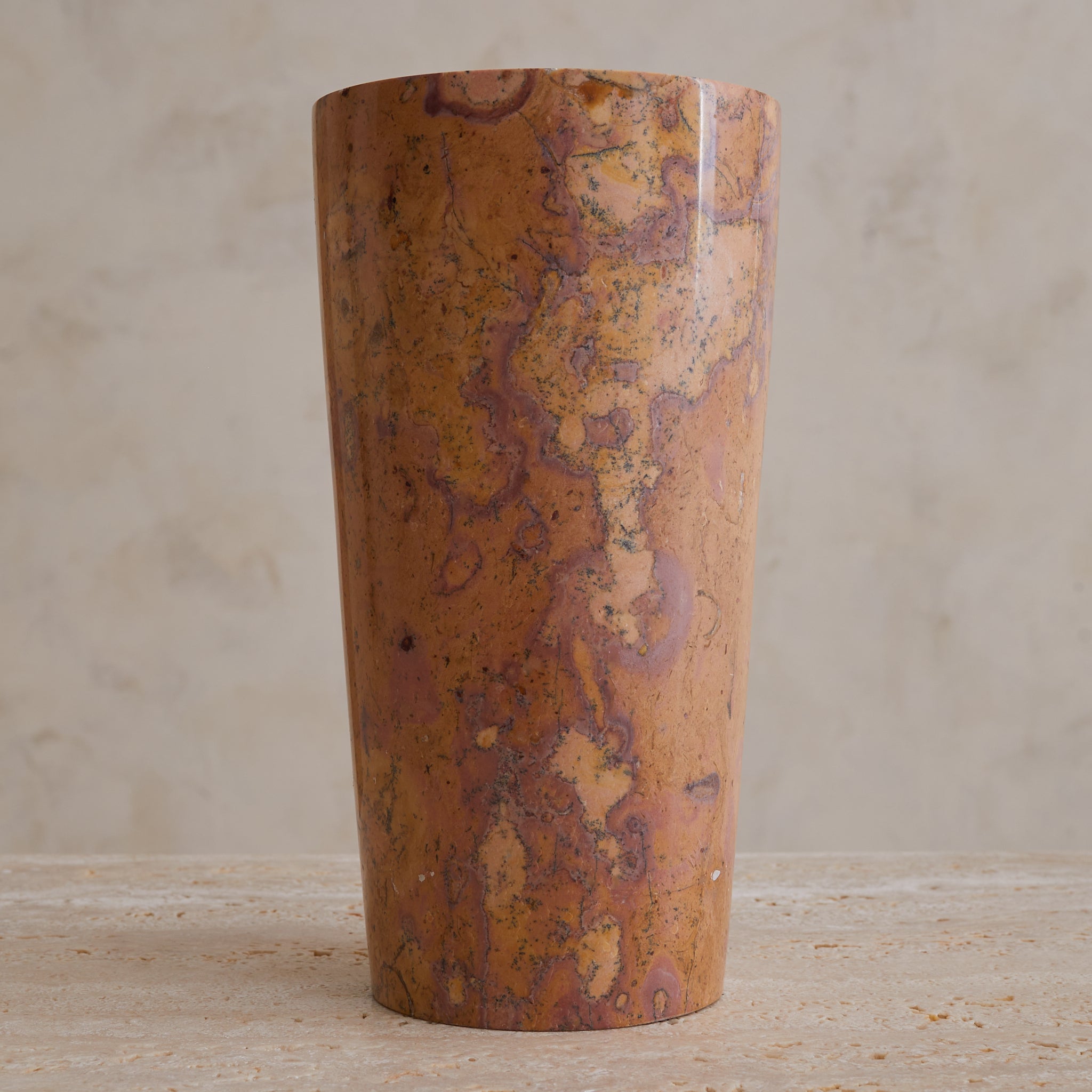 A tall cylinder of French marble, hand-turned in the 1960s. Each vase in the series is unique, with swirling sedimentary veining in terracotta, peach, and plum tones—some with graphic movement, others with subtle mottling. The marble is polished to a soft sheen, giving the form a quiet glow that heightens its painterly surface.