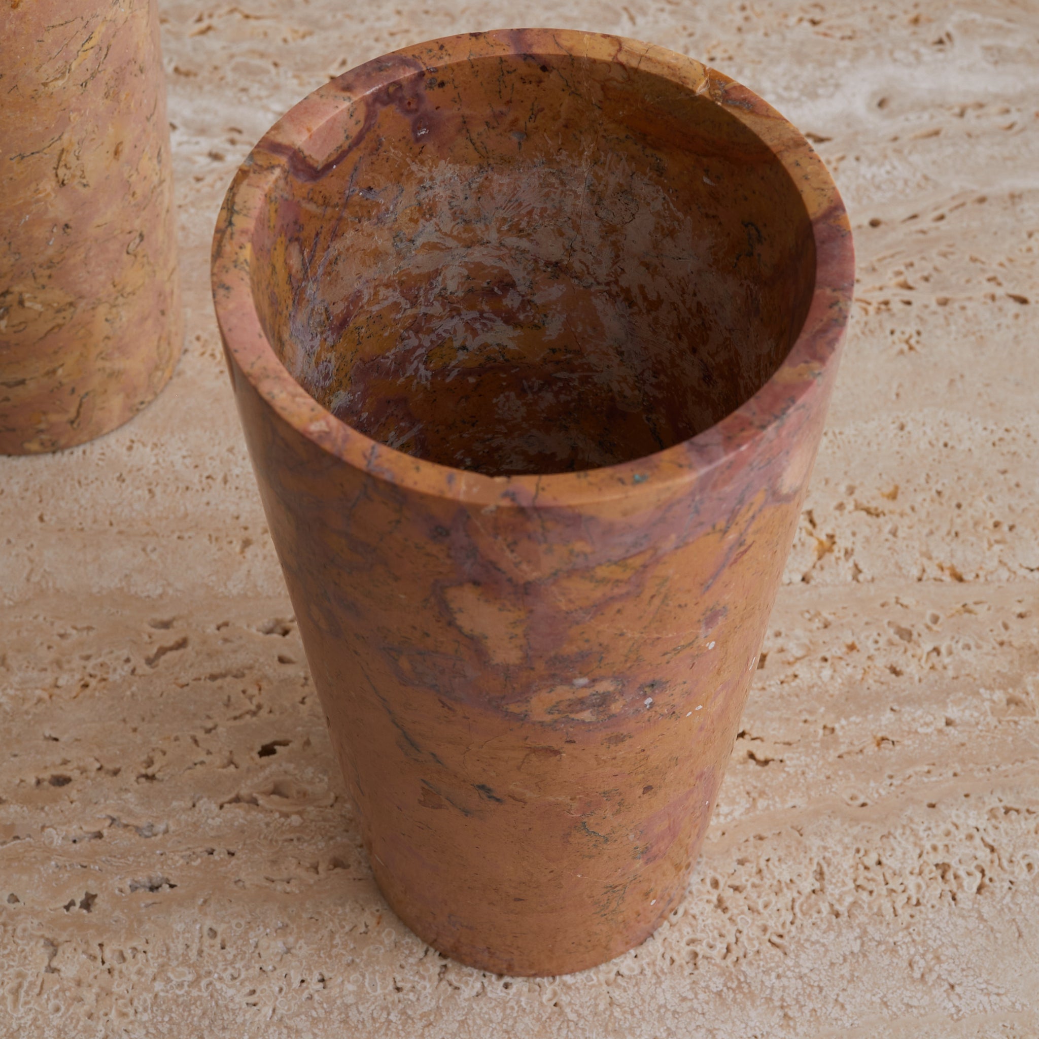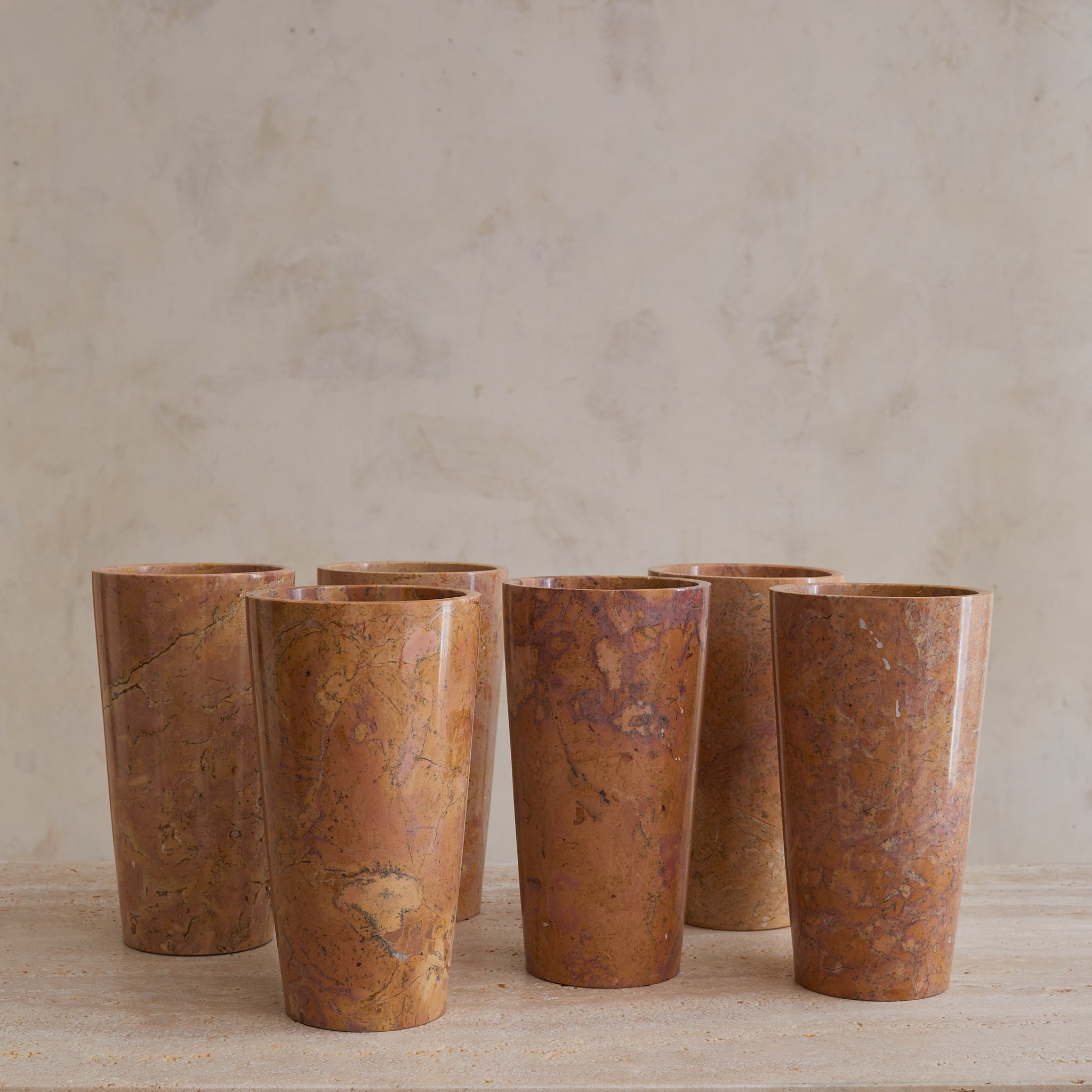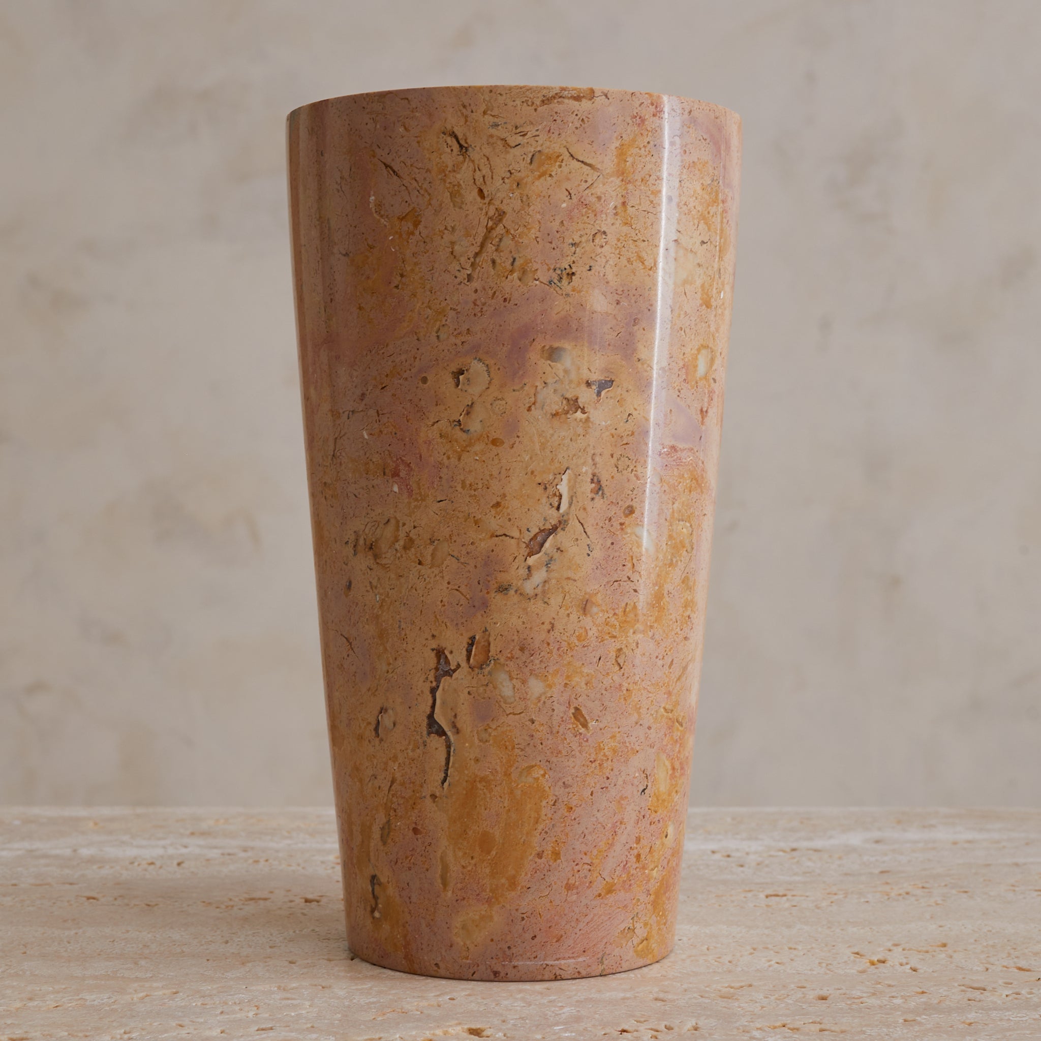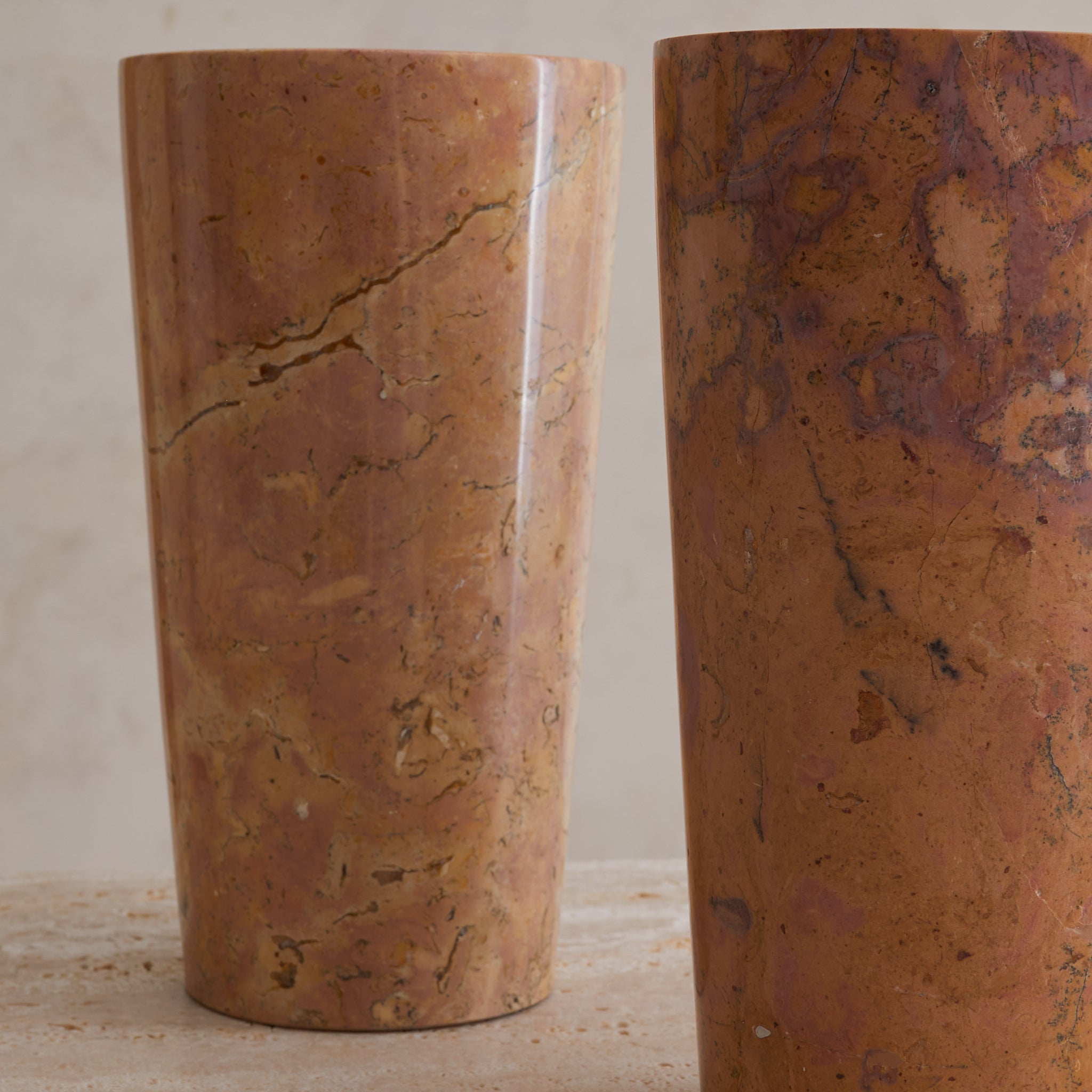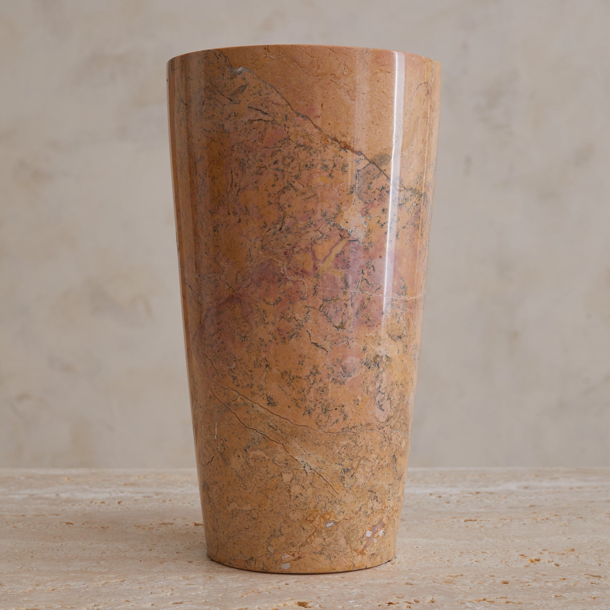 A tall cylinder of French marble, hand-turned in the 1960s. Each vase in the series is unique, with swirling sedimentary veining in terracotta, peach, and plum tones—some with graphic movement, others with subtle mottling. The marble is polished to a soft sheen, giving the form a quiet glow that heightens its painterly surface.