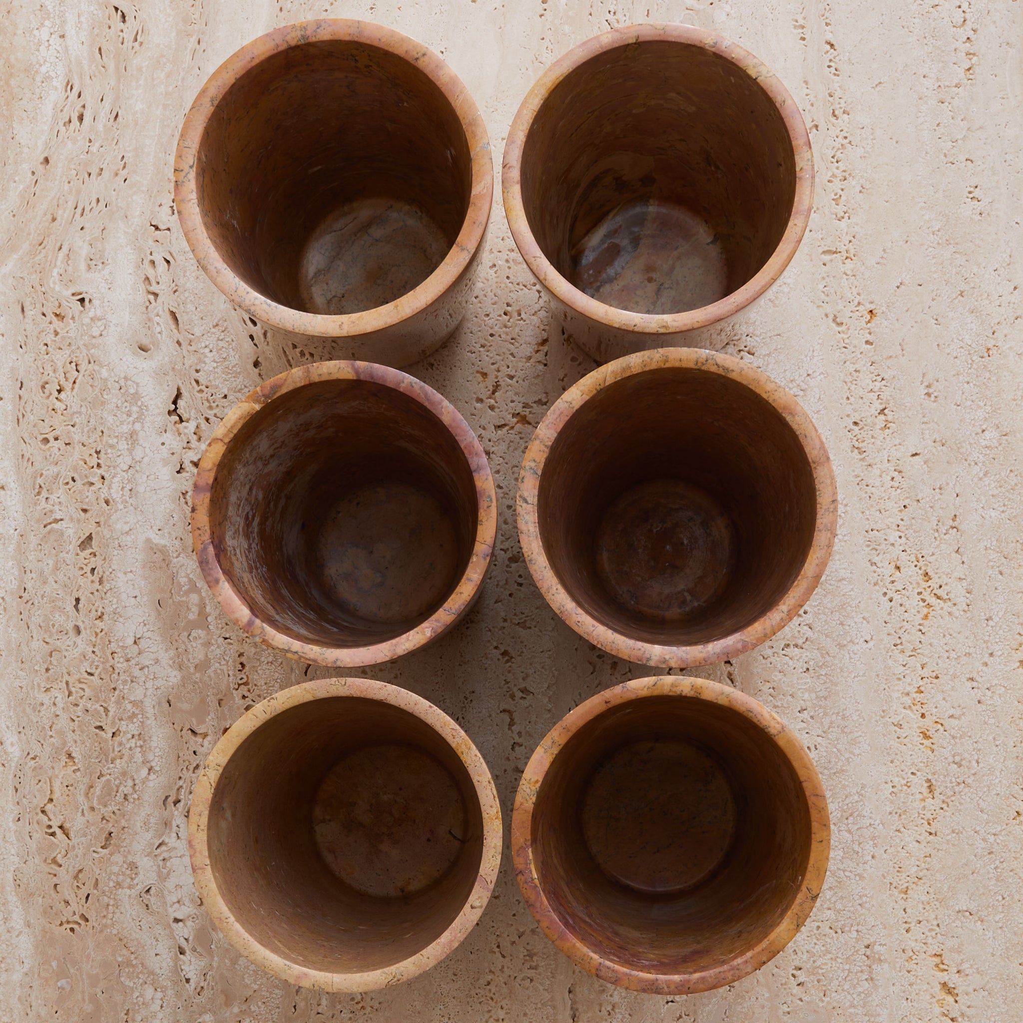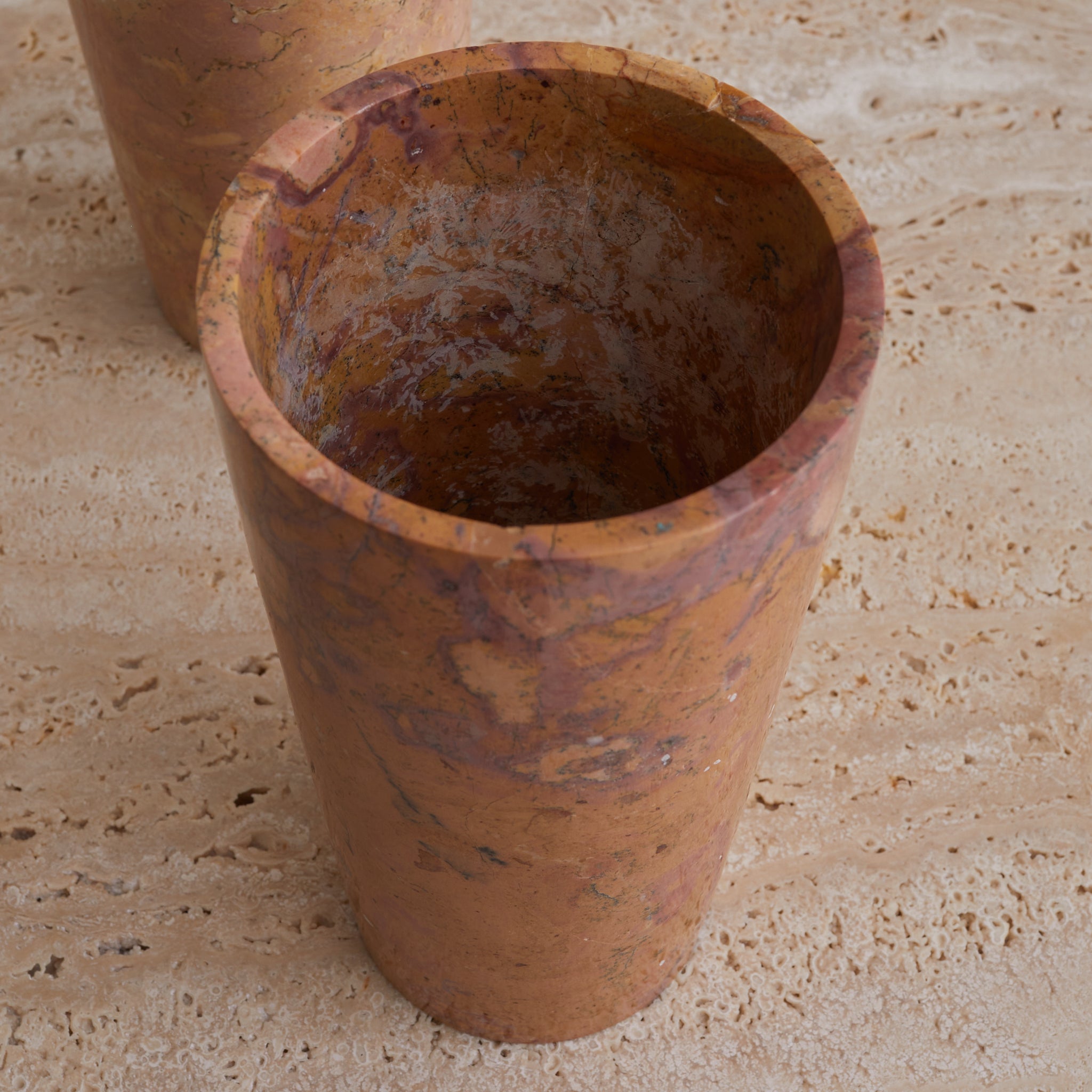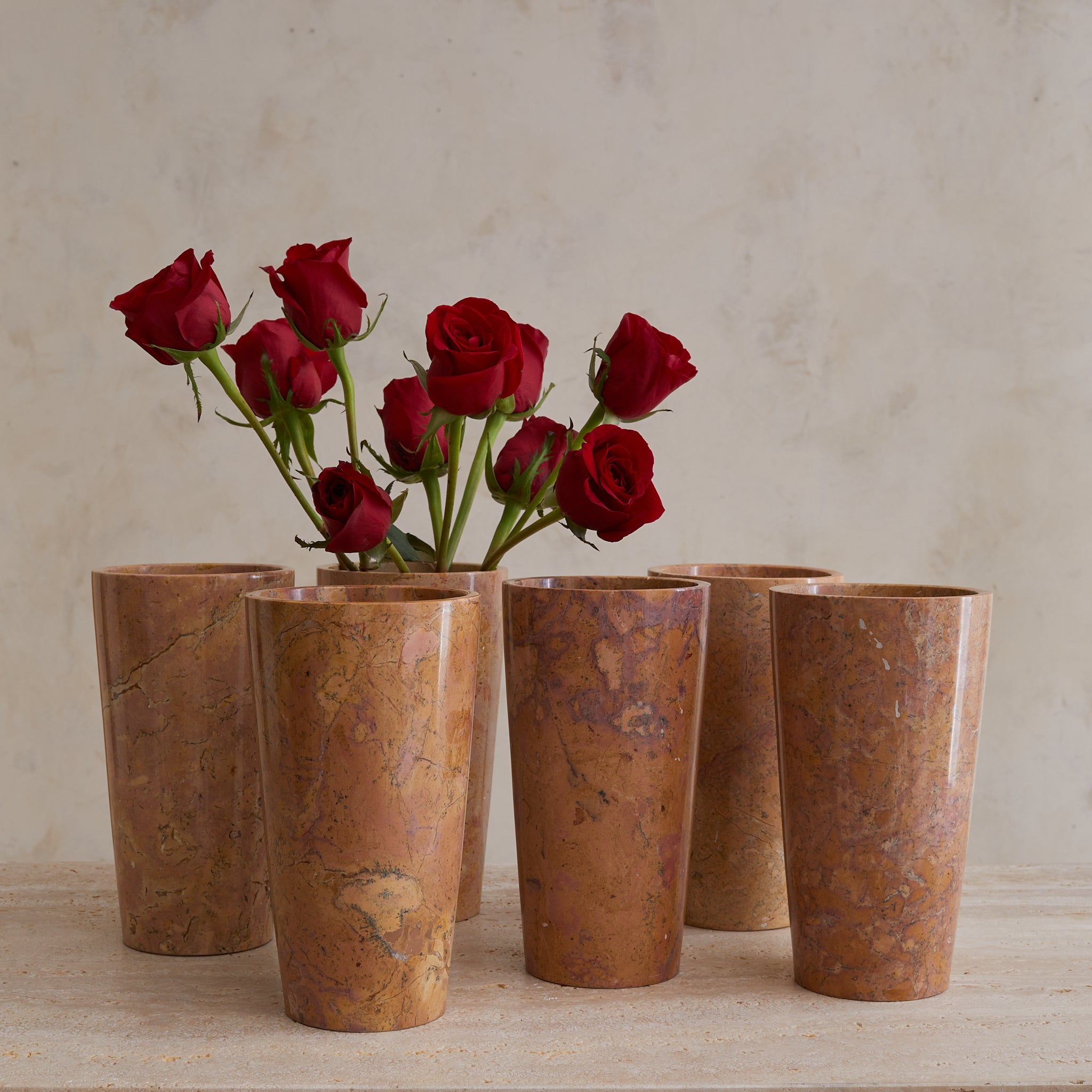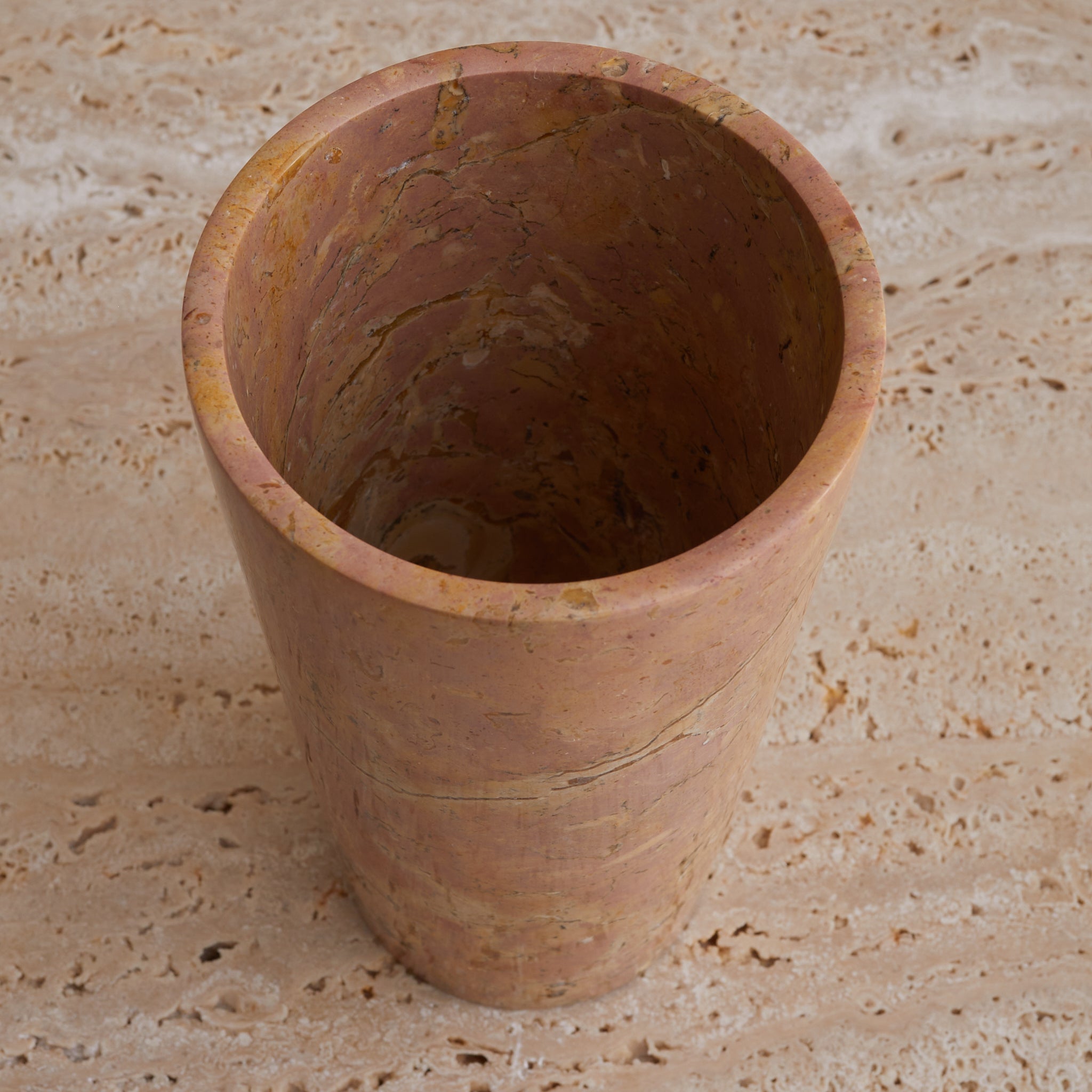 A tall cylinder of French marble, hand-turned in the 1960s. Each vase in the series is unique, with swirling sedimentary veining in terracotta, peach, and plum tones—some with graphic movement, others with subtle mottling. The marble is polished to a soft sheen, giving the form a quiet glow that heightens its painterly surface.