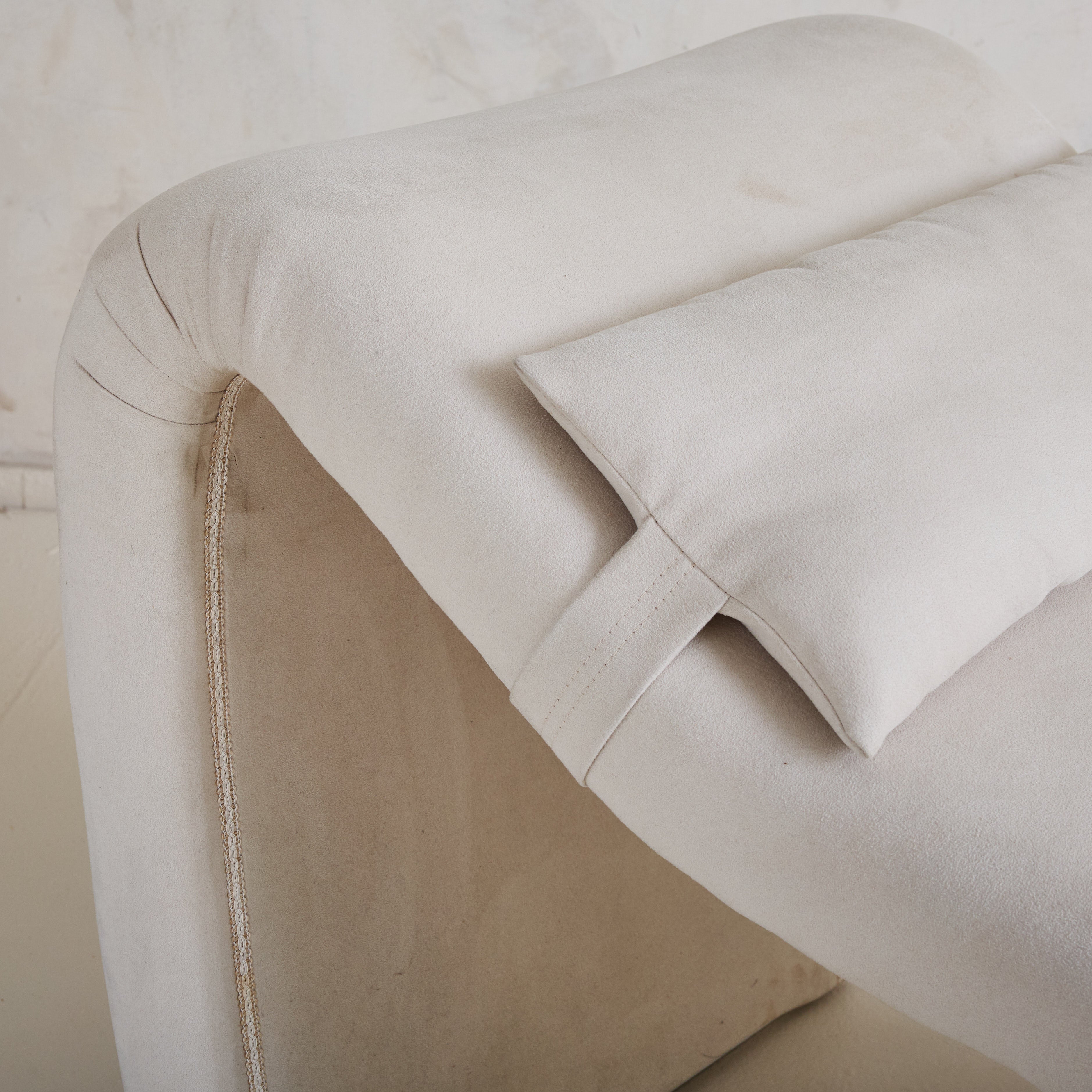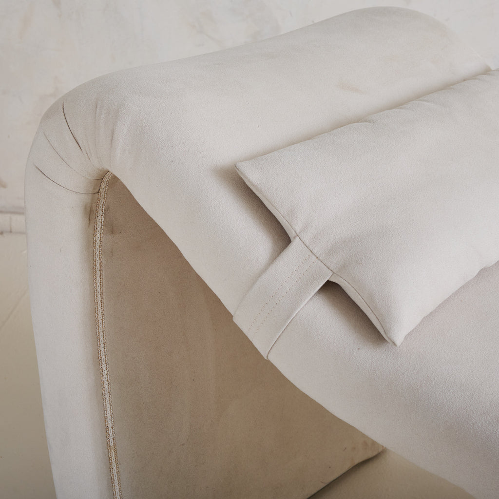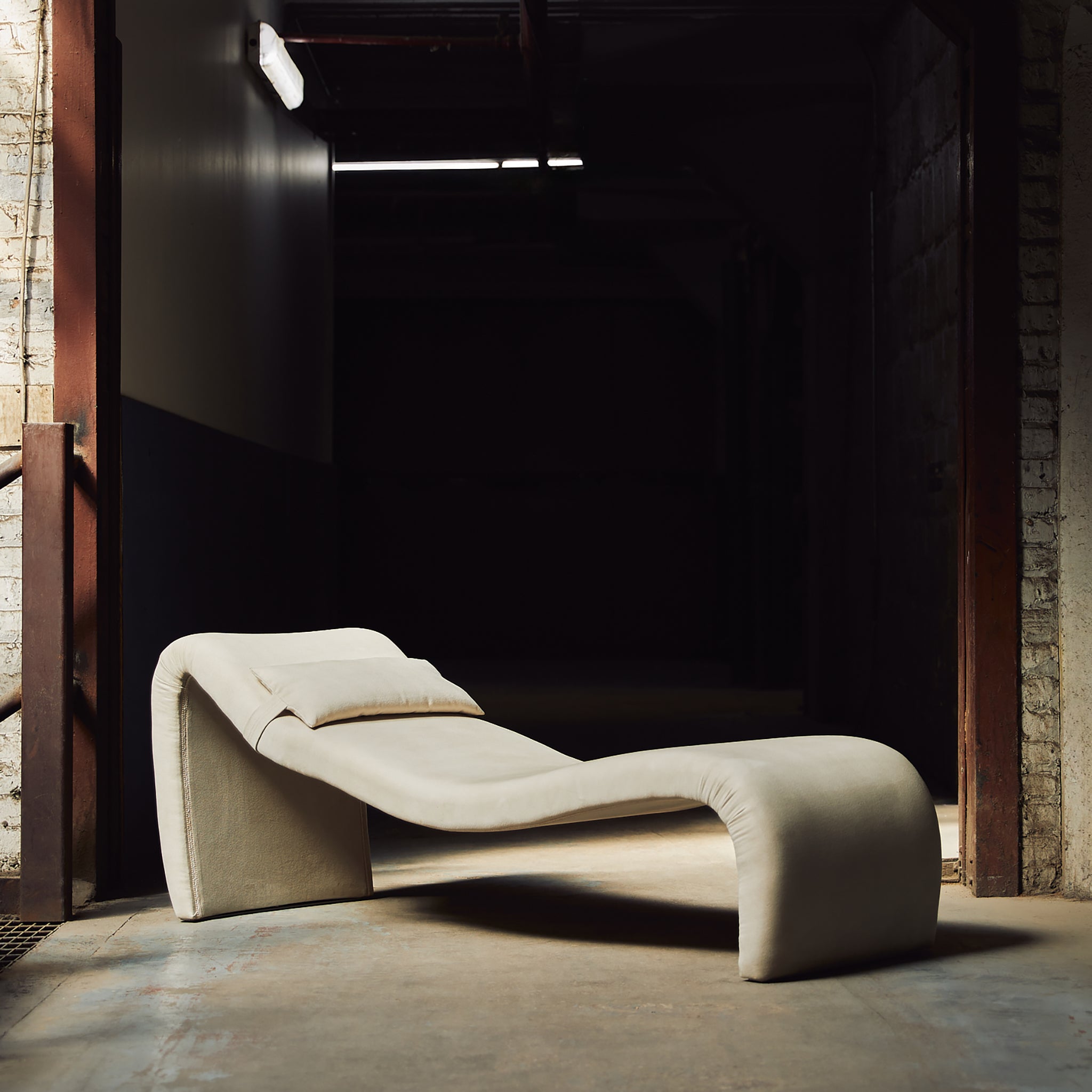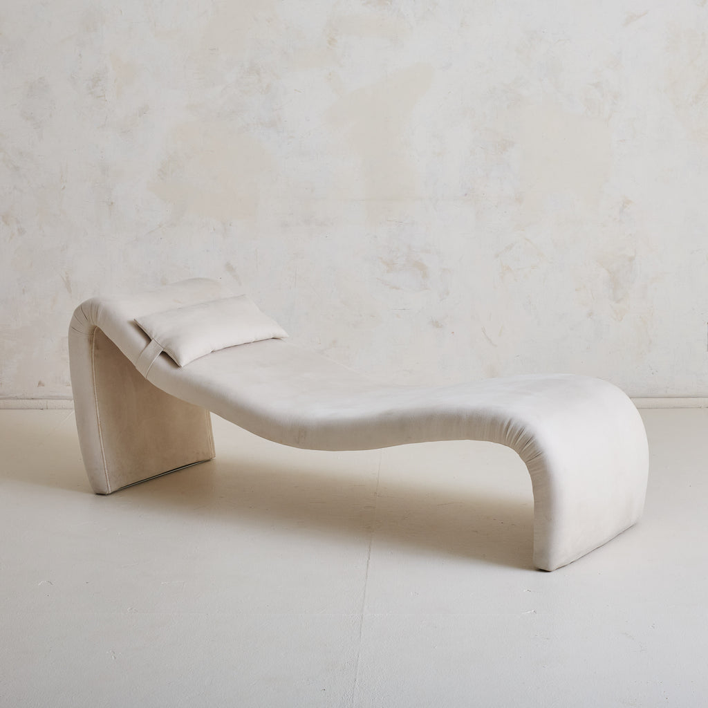 The 'Djinn' chaise lounge, designed by Olivier Mourgue for Airborne International in 1965, is an icon of futuristic and Space Age design. Characterized by its fluid, low-slung silhouette, the Djinn chair features a tubular steel frame and is upholstered in its original ivory fabric.