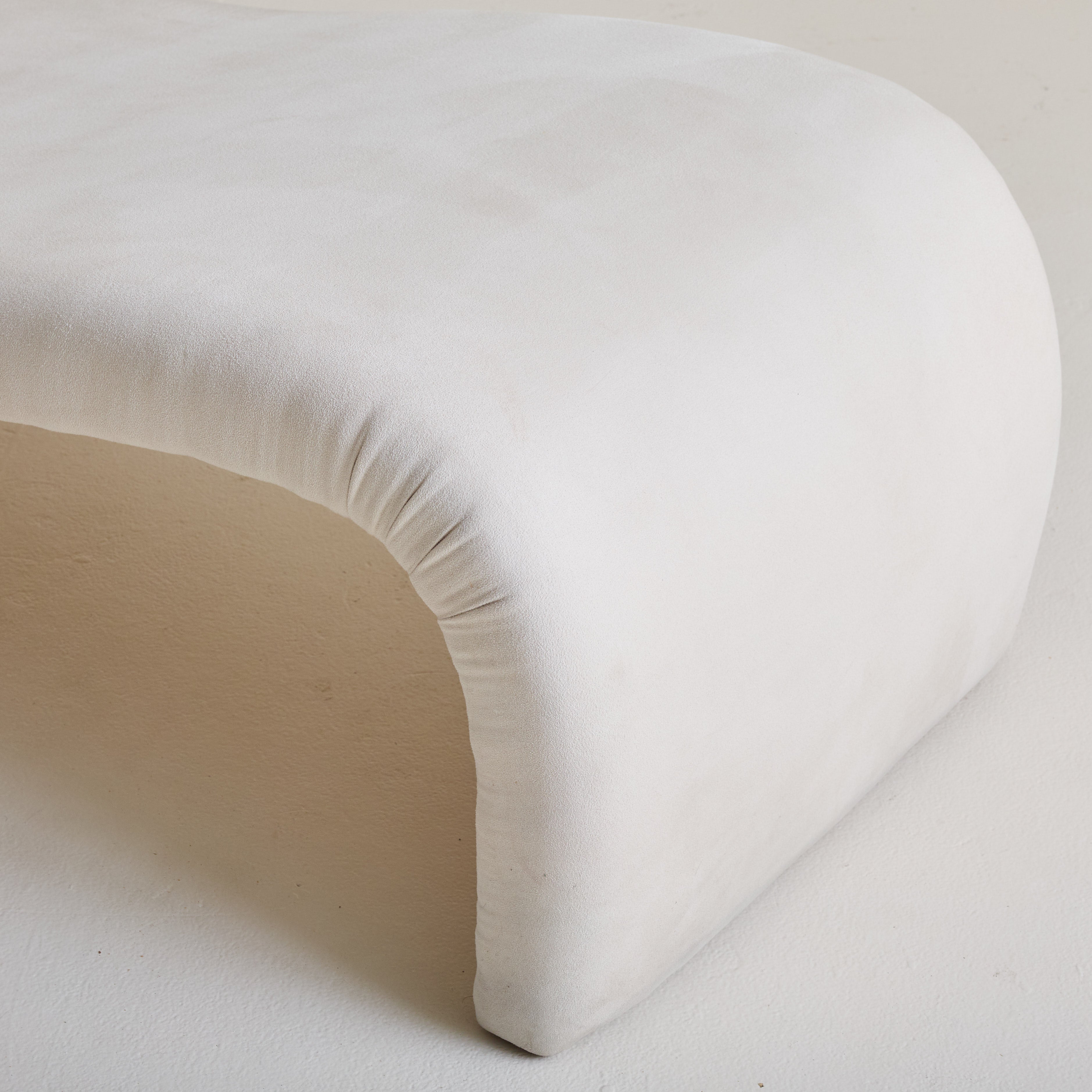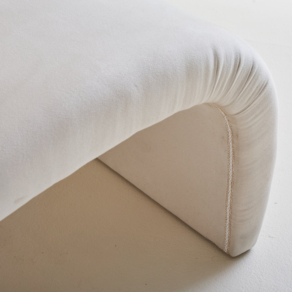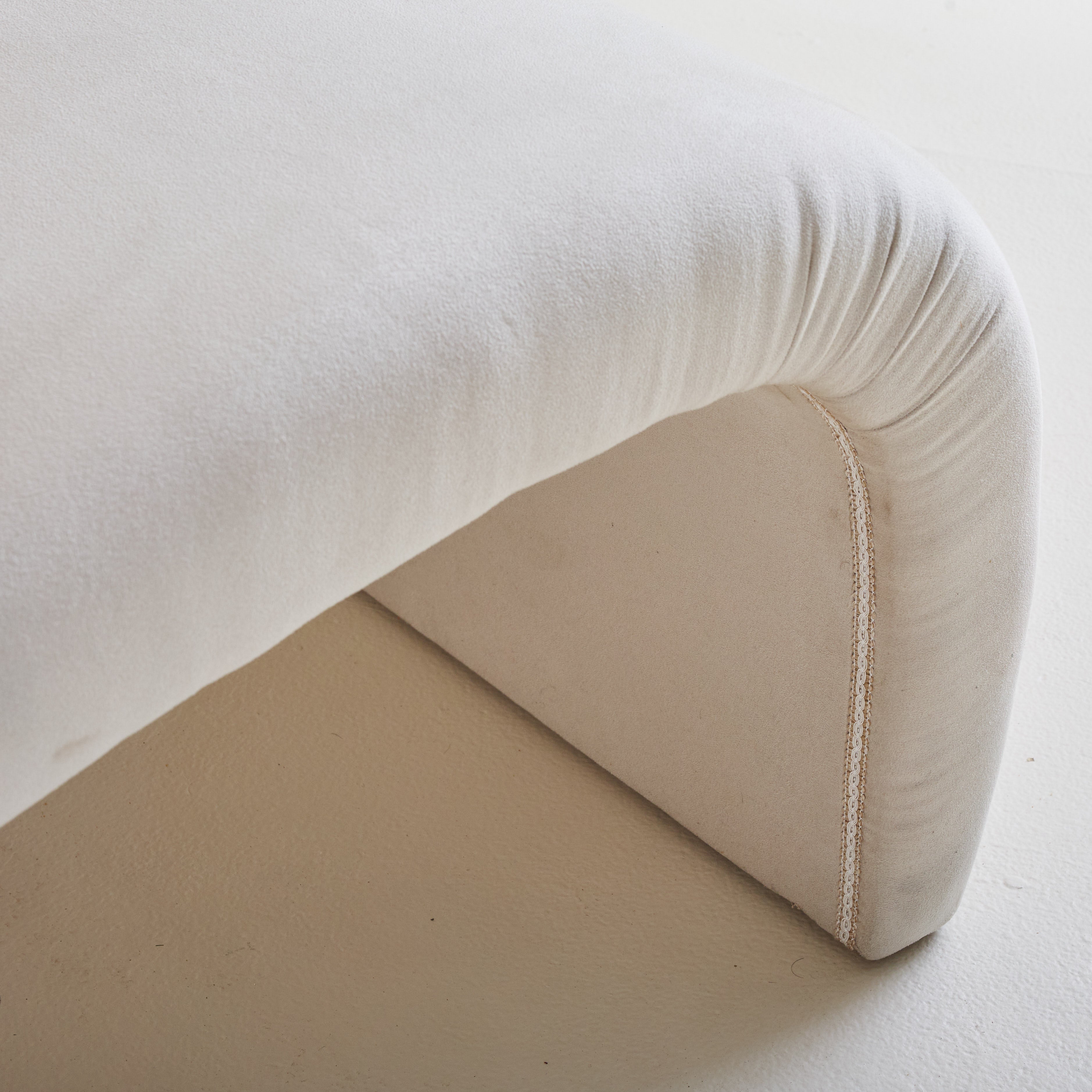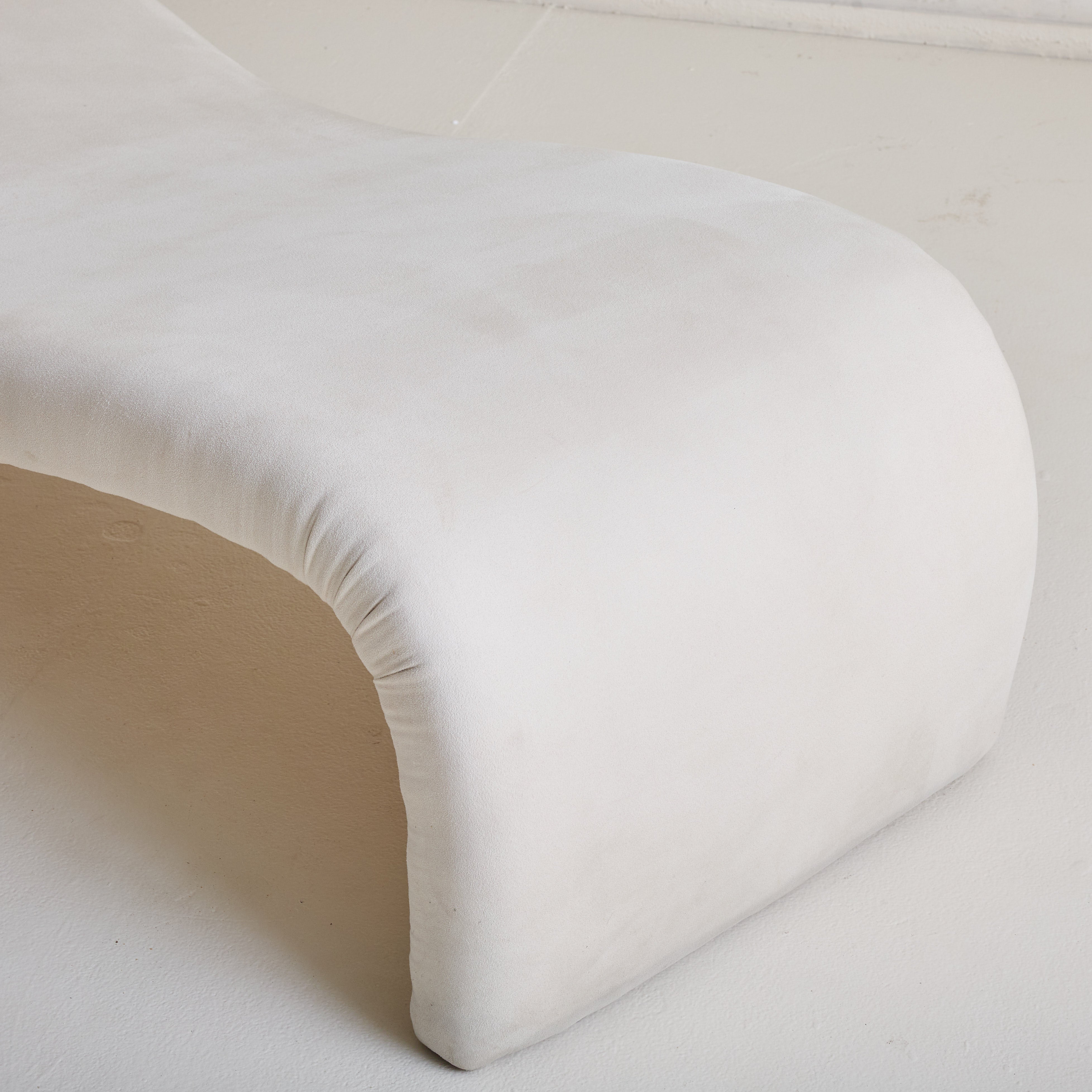 The 'Djinn' chaise lounge, designed by Olivier Mourgue for Airborne International in 1965, is an icon of futuristic and Space Age design. Characterized by its fluid, low-slung silhouette, the Djinn chair features a tubular steel frame and is upholstered in its original ivory fabric.