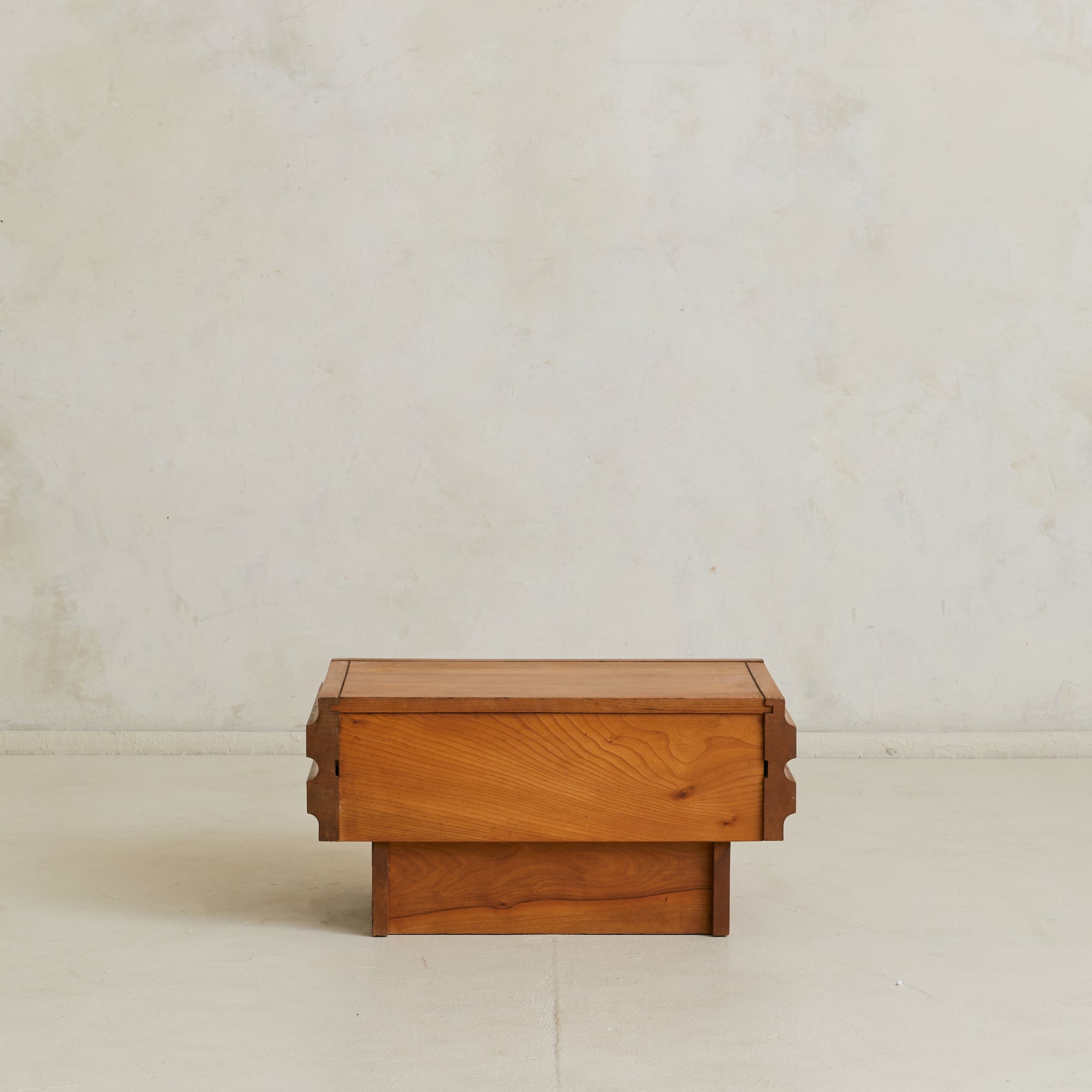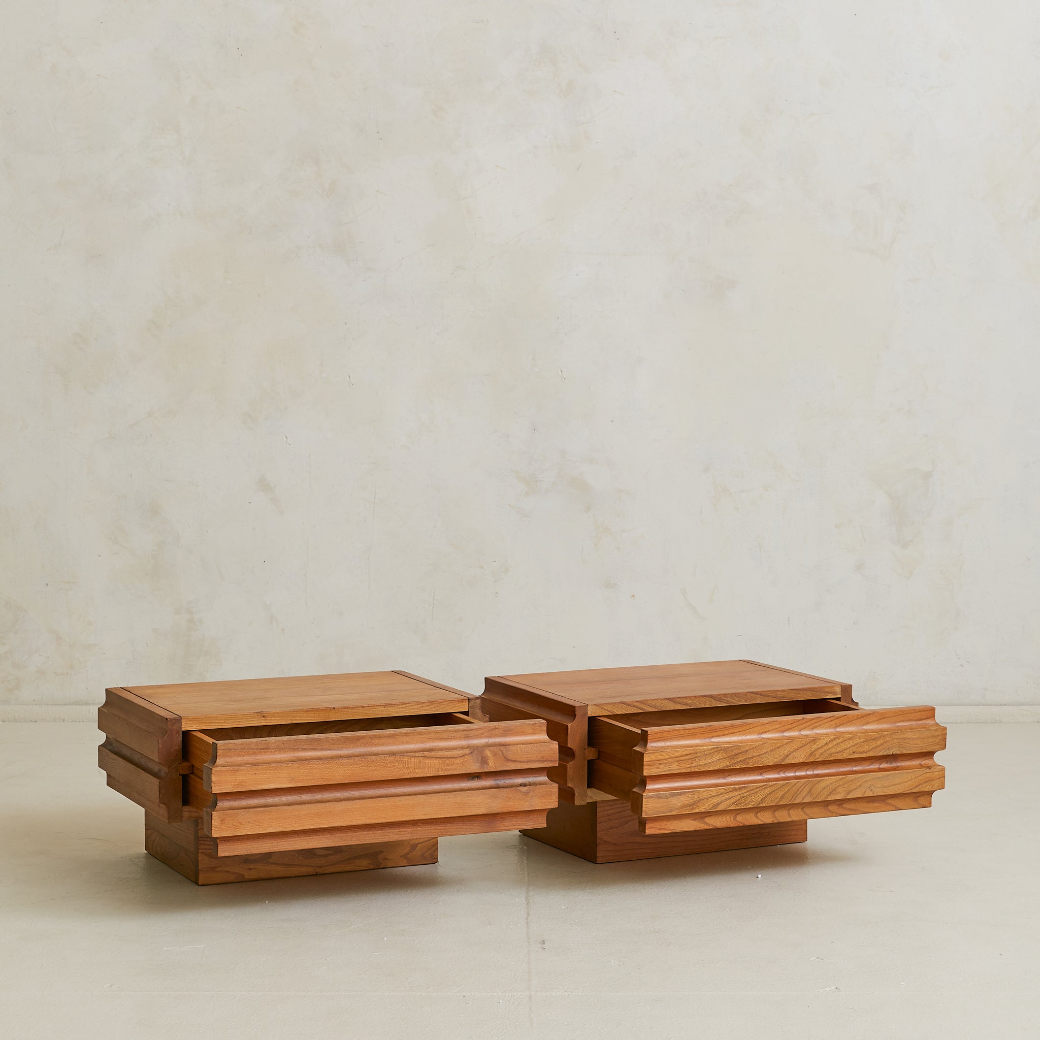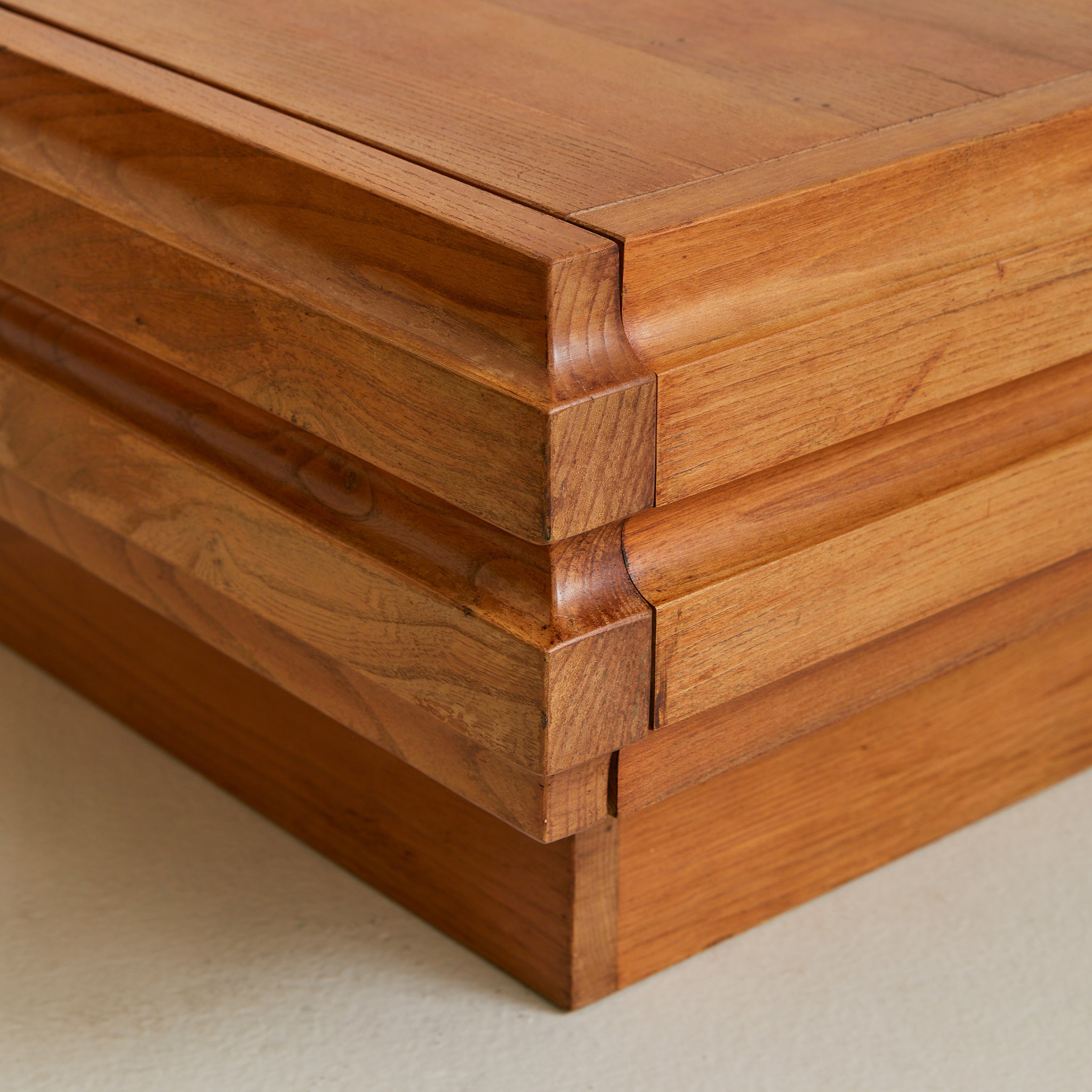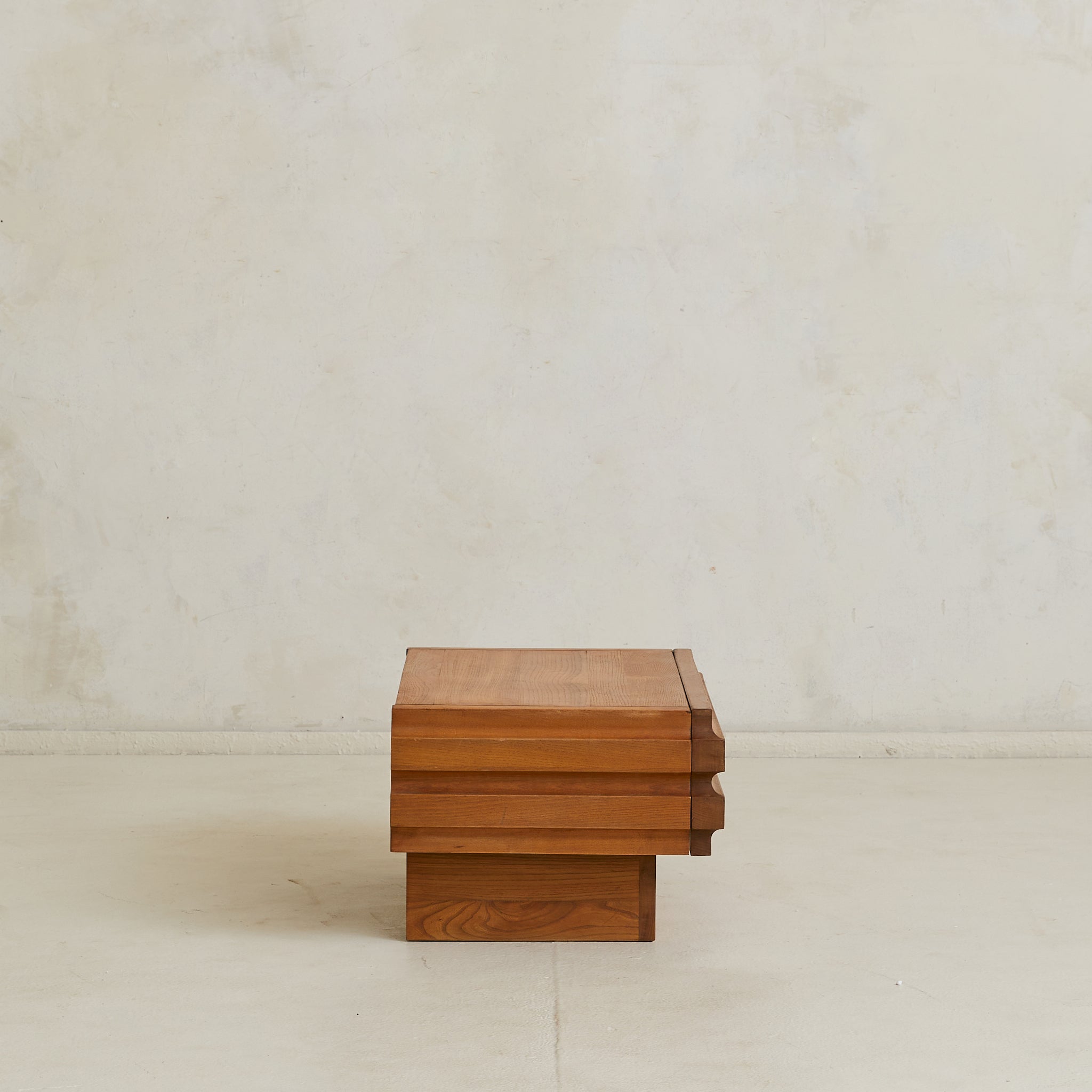 A rare and sculptural nightstand by French atelier Maison Regain, crafted in the 1960s from solid elm. Defined by its low profile and distinctive stepped form, the piece features a single integrated drawer, seamlessly concealed within the rhythmic layering of the frame. The warm tone and expressive grain of the elm lend softness to its geometry, evocative of Brutalist influences.