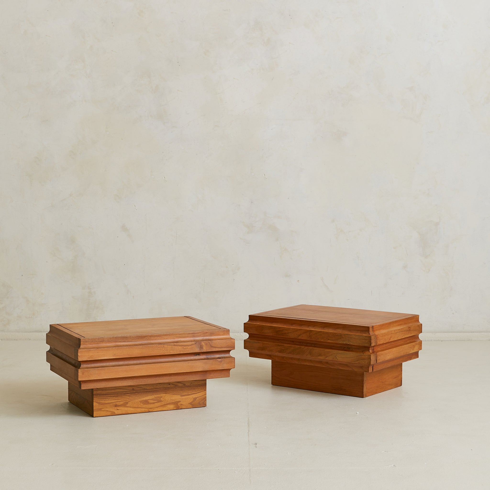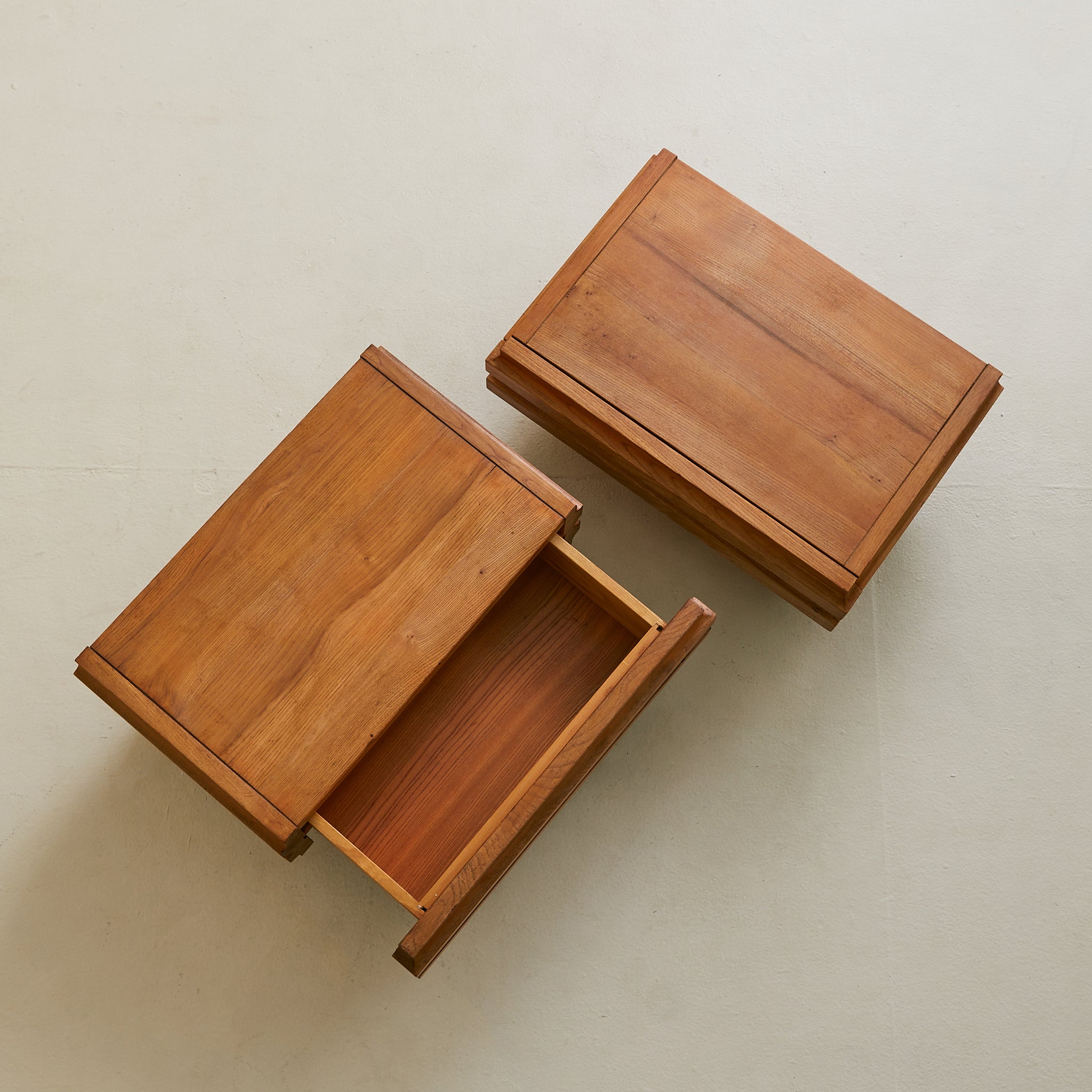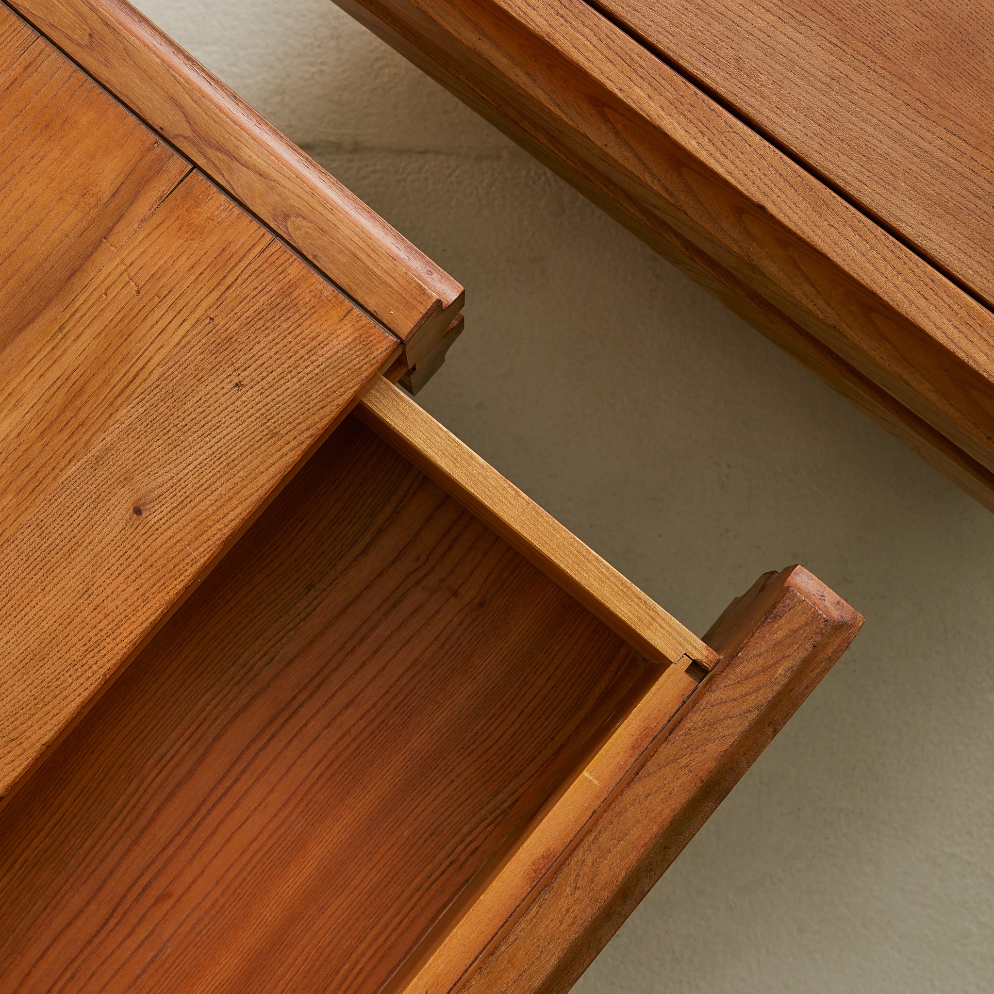 A rare and sculptural nightstand by French atelier Maison Regain, crafted in the 1960s from solid elm. Defined by its low profile and distinctive stepped form, the piece features a single integrated drawer, seamlessly concealed within the rhythmic layering of the frame. The warm tone and expressive grain of the elm lend softness to its geometry, evocative of Brutalist influences.