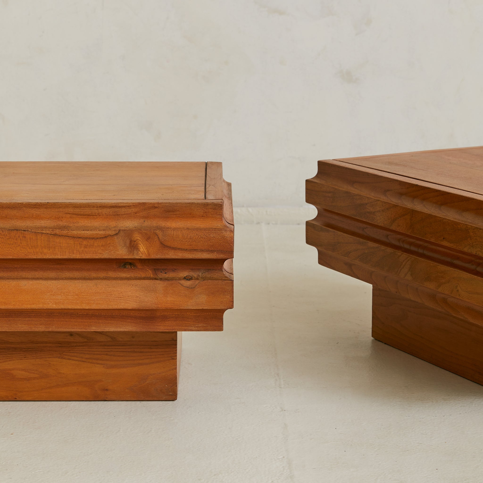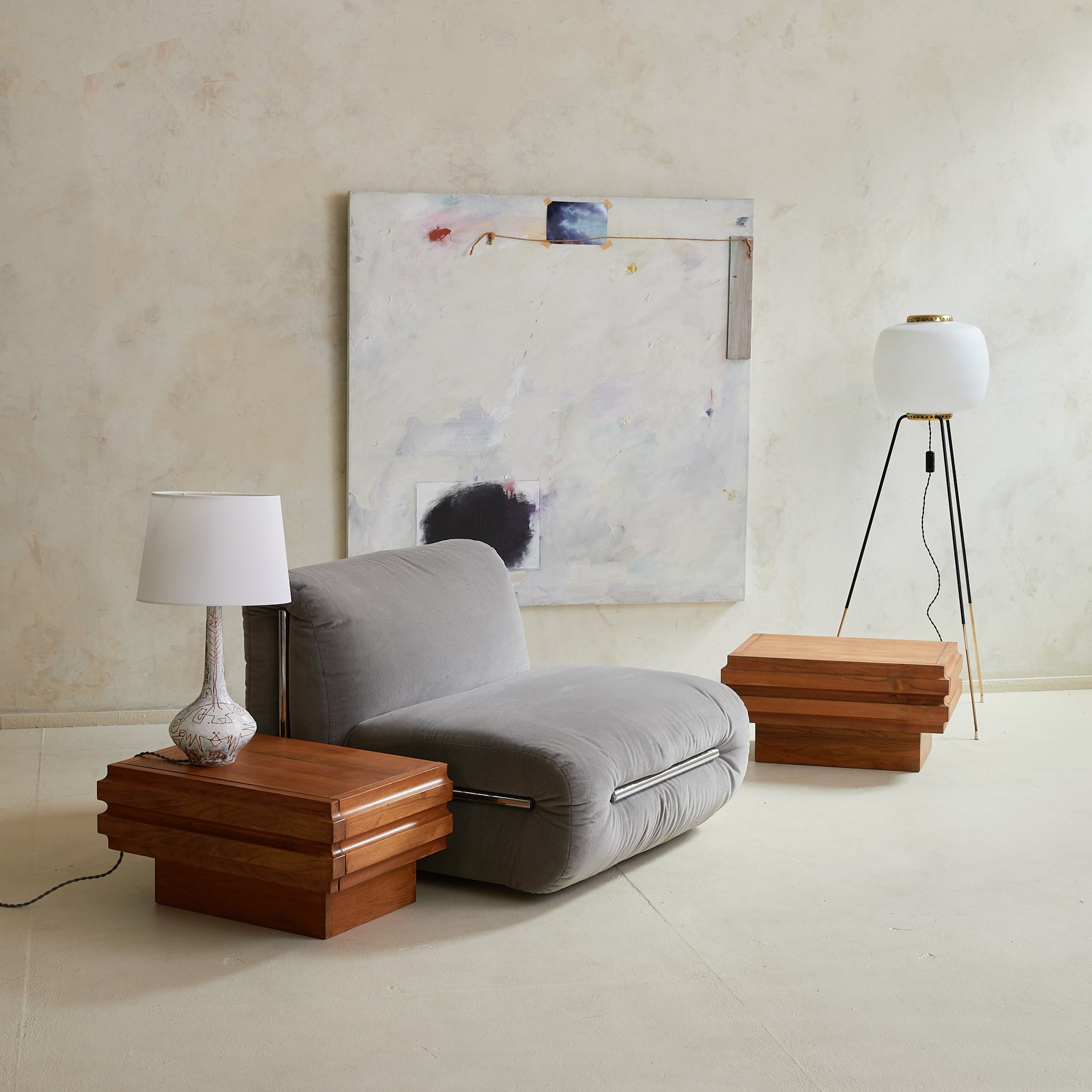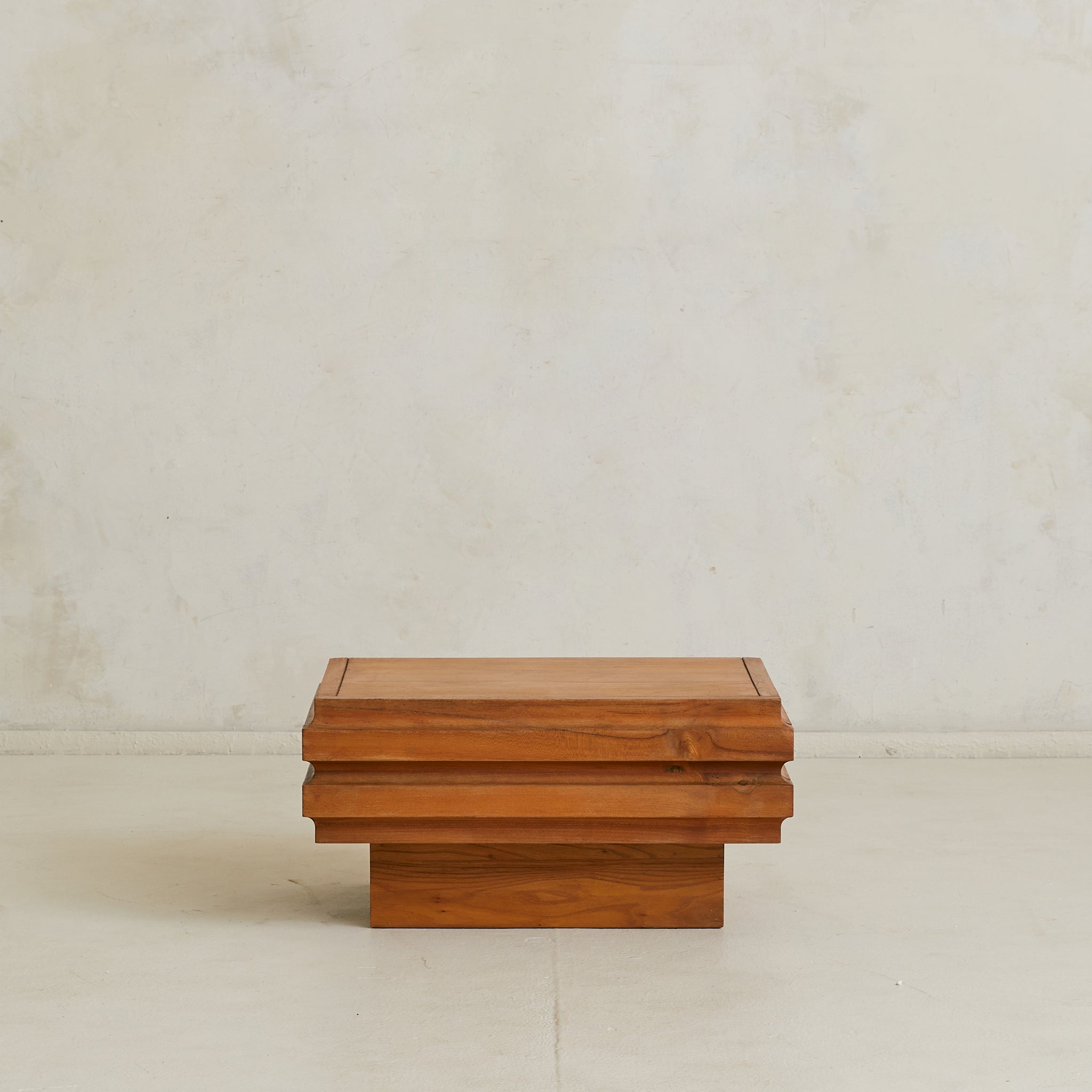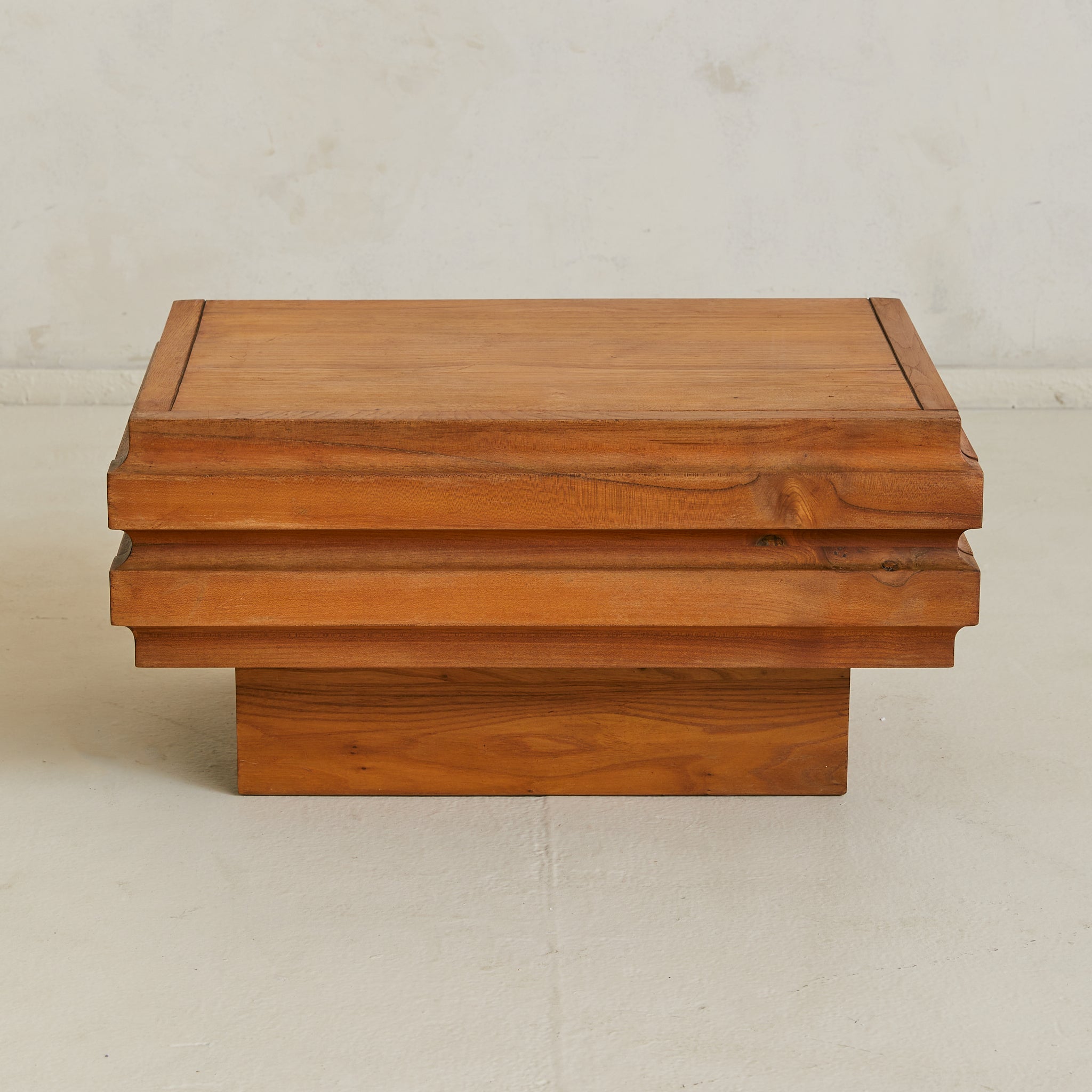 A rare and sculptural nightstand by French atelier Maison Regain, crafted in the 1960s from solid elm. Defined by its low profile and distinctive stepped form, the piece features a single integrated drawer, seamlessly concealed within the rhythmic layering of the frame. The warm tone and expressive grain of the elm lend softness to its geometry, evocative of Brutalist influences.