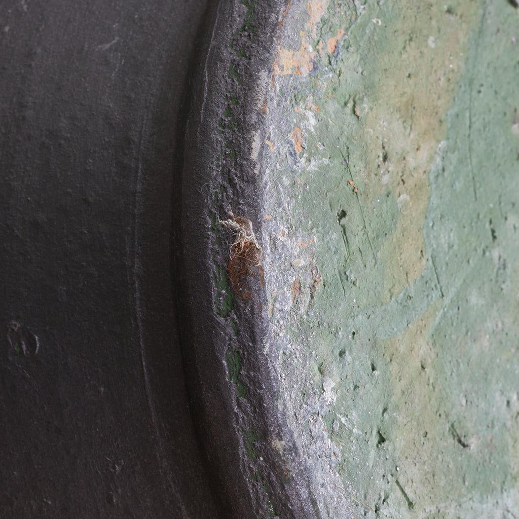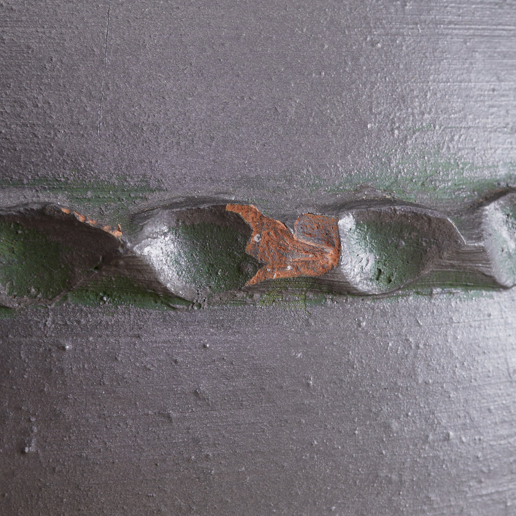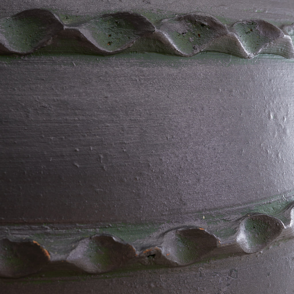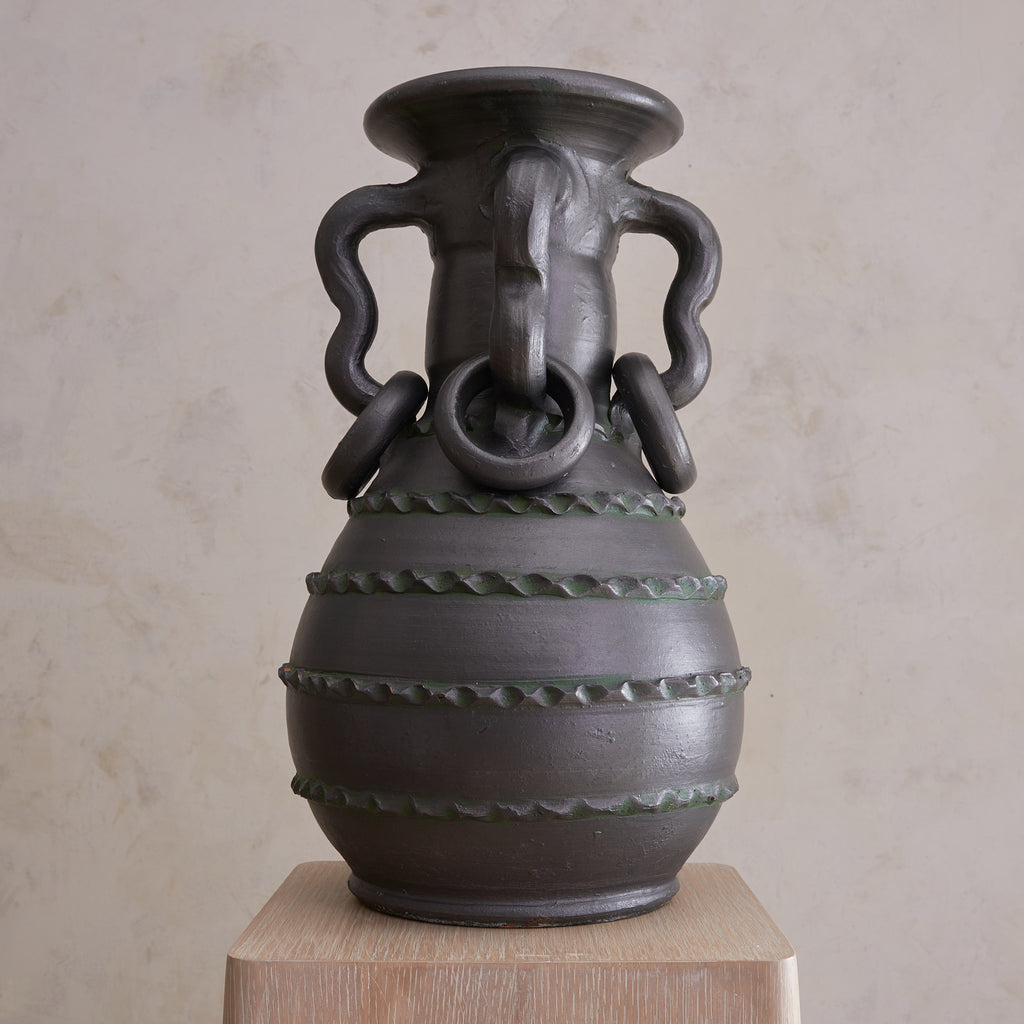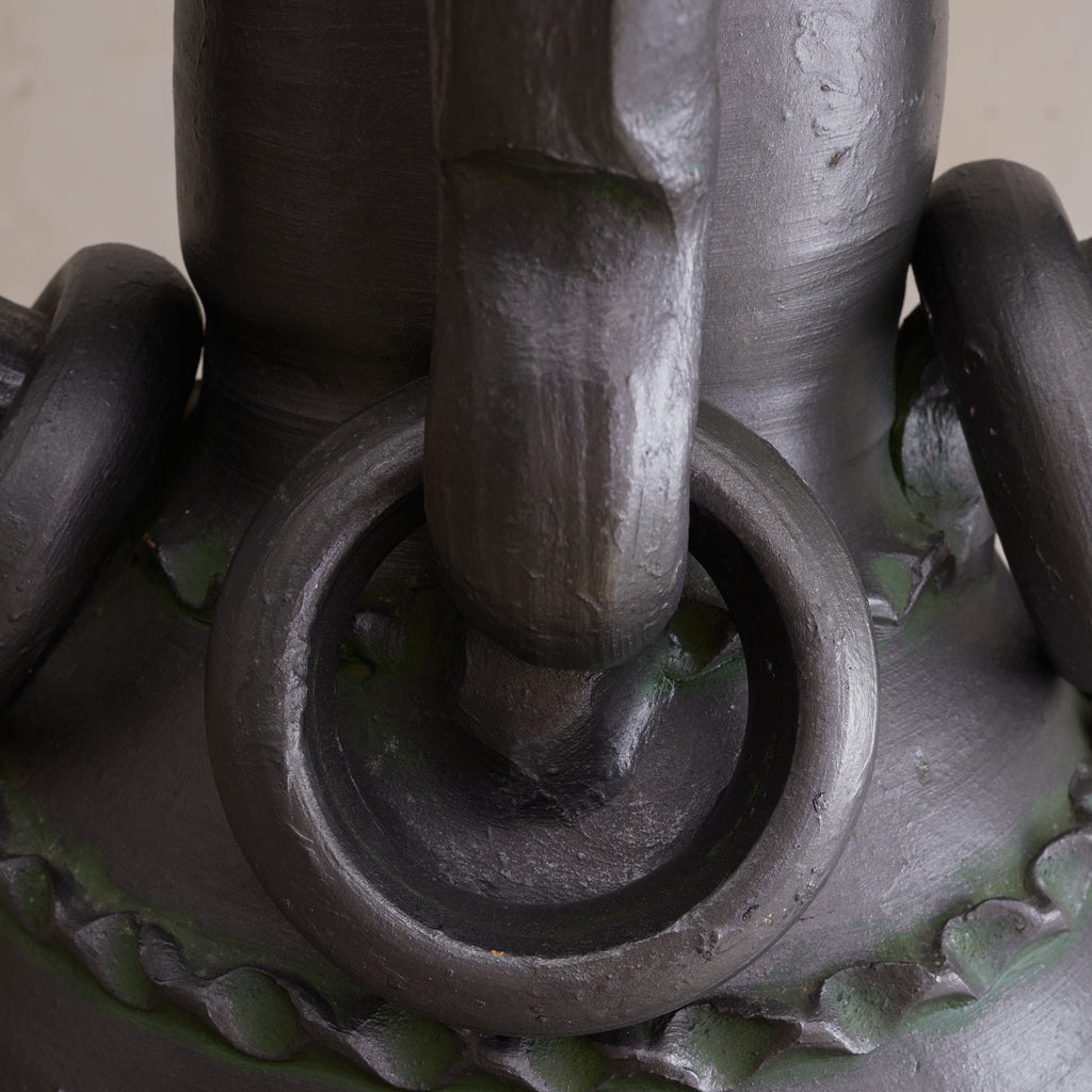 Sculptural and commanding, this French terracotta vase from the 1960s stands just under two feet tall. Finished in a deep charcoal glaze with hints of verdant green along its undulating bands, it features four dramatic chain-link handles that add a sense of movement and weight. Earthy yet architectural, it channels Brutalist energy through a distinctly handmade lens.