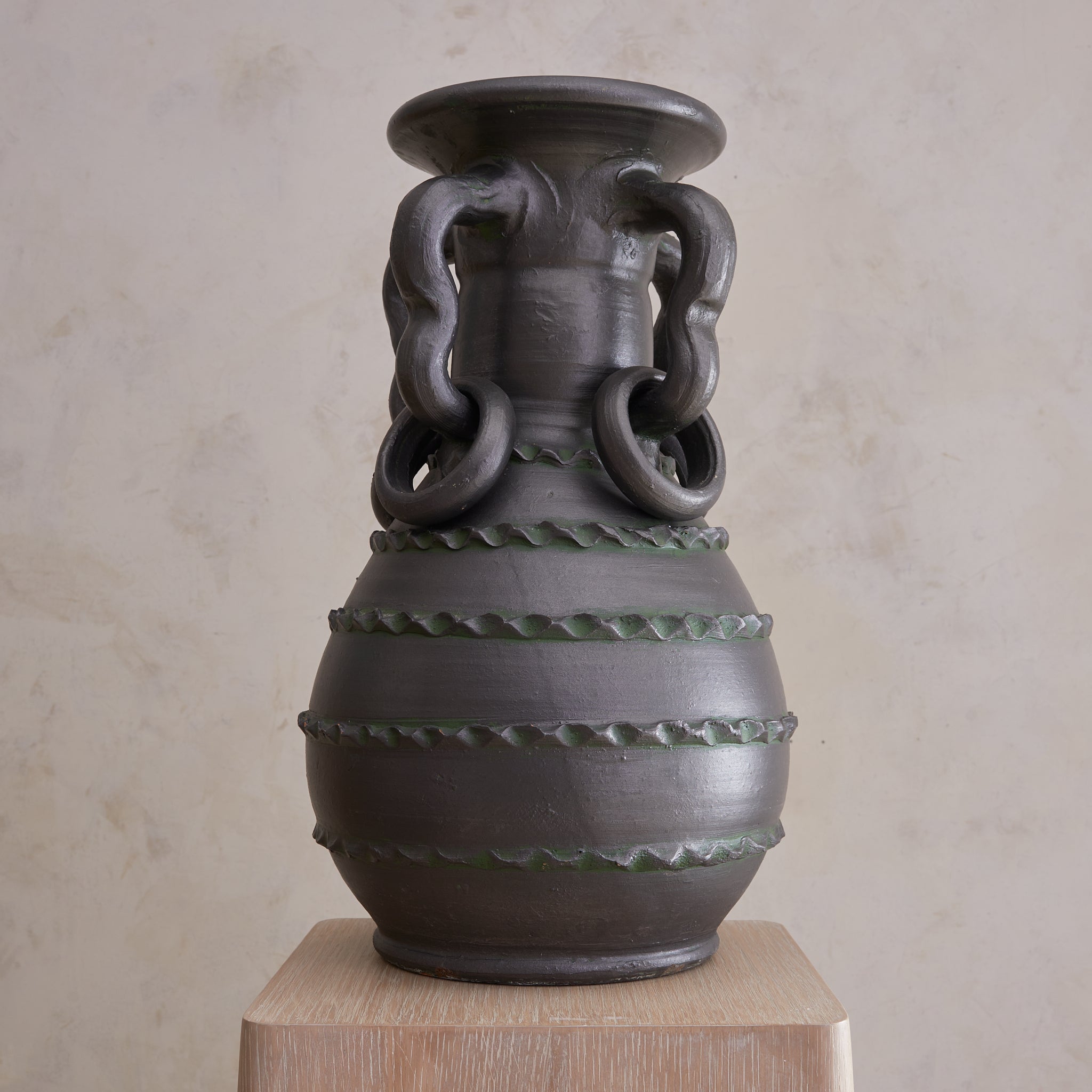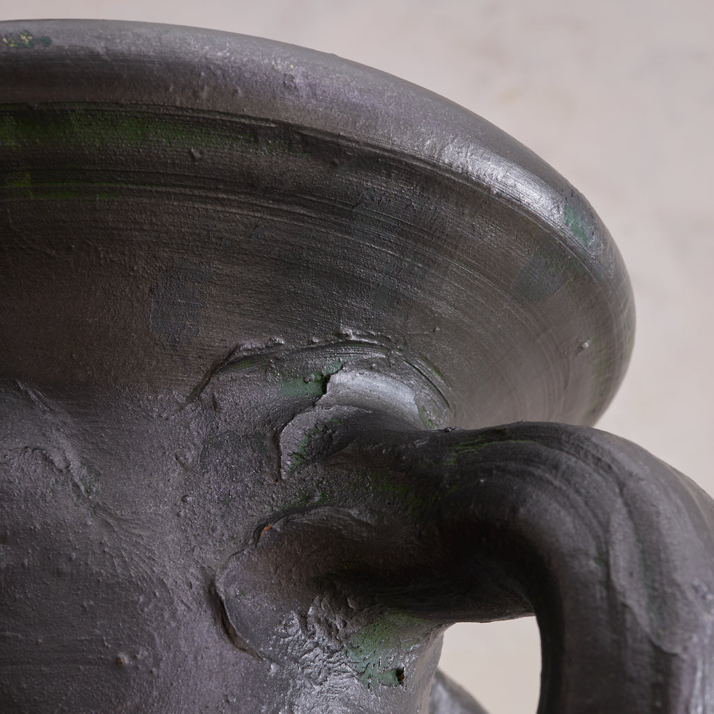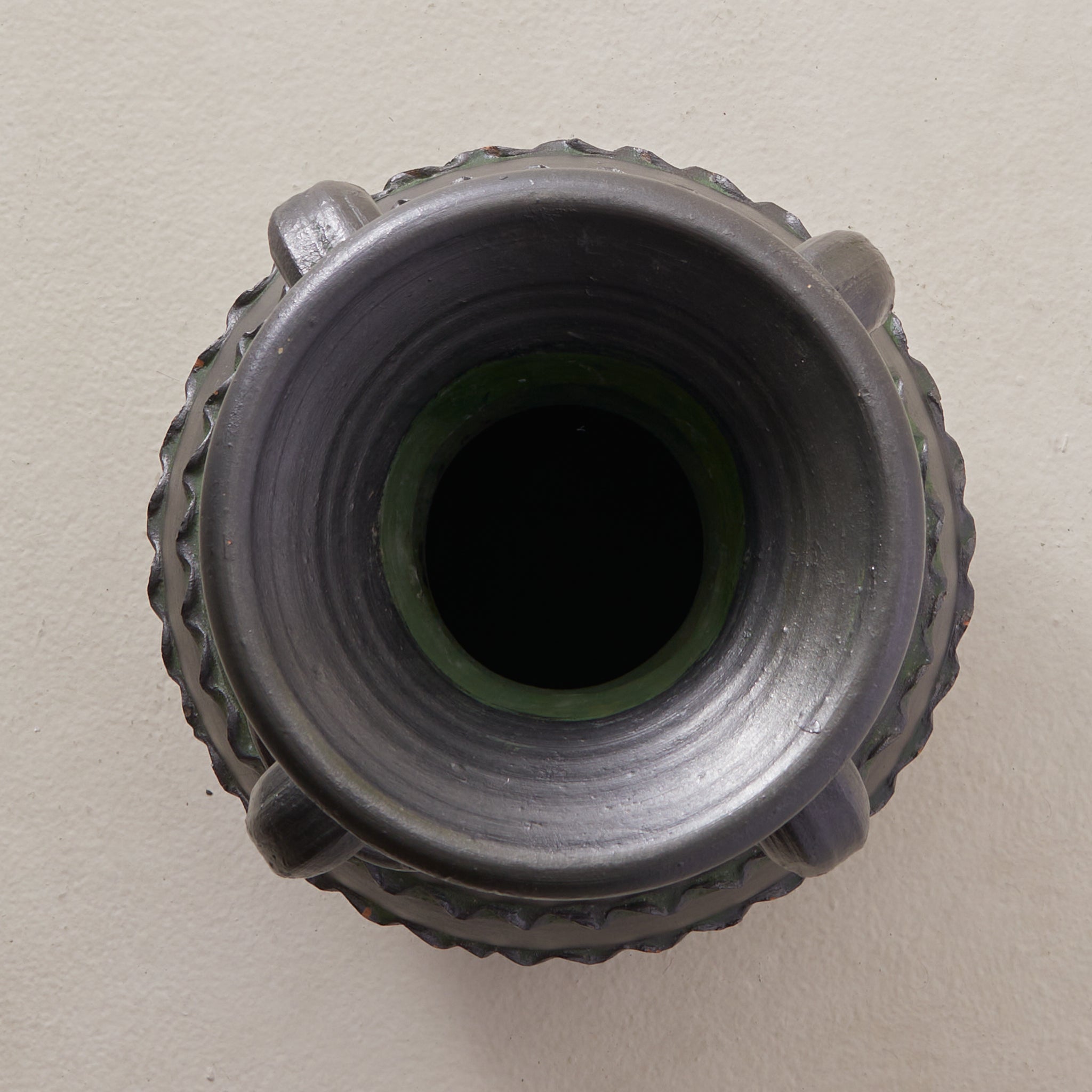 French Four-Handle Charcoal + Green Terracotta Vase, 1960s