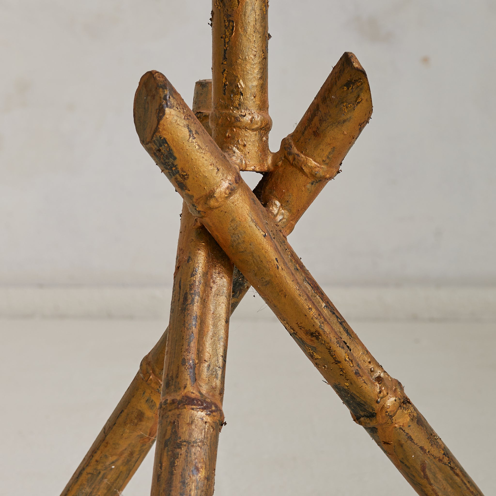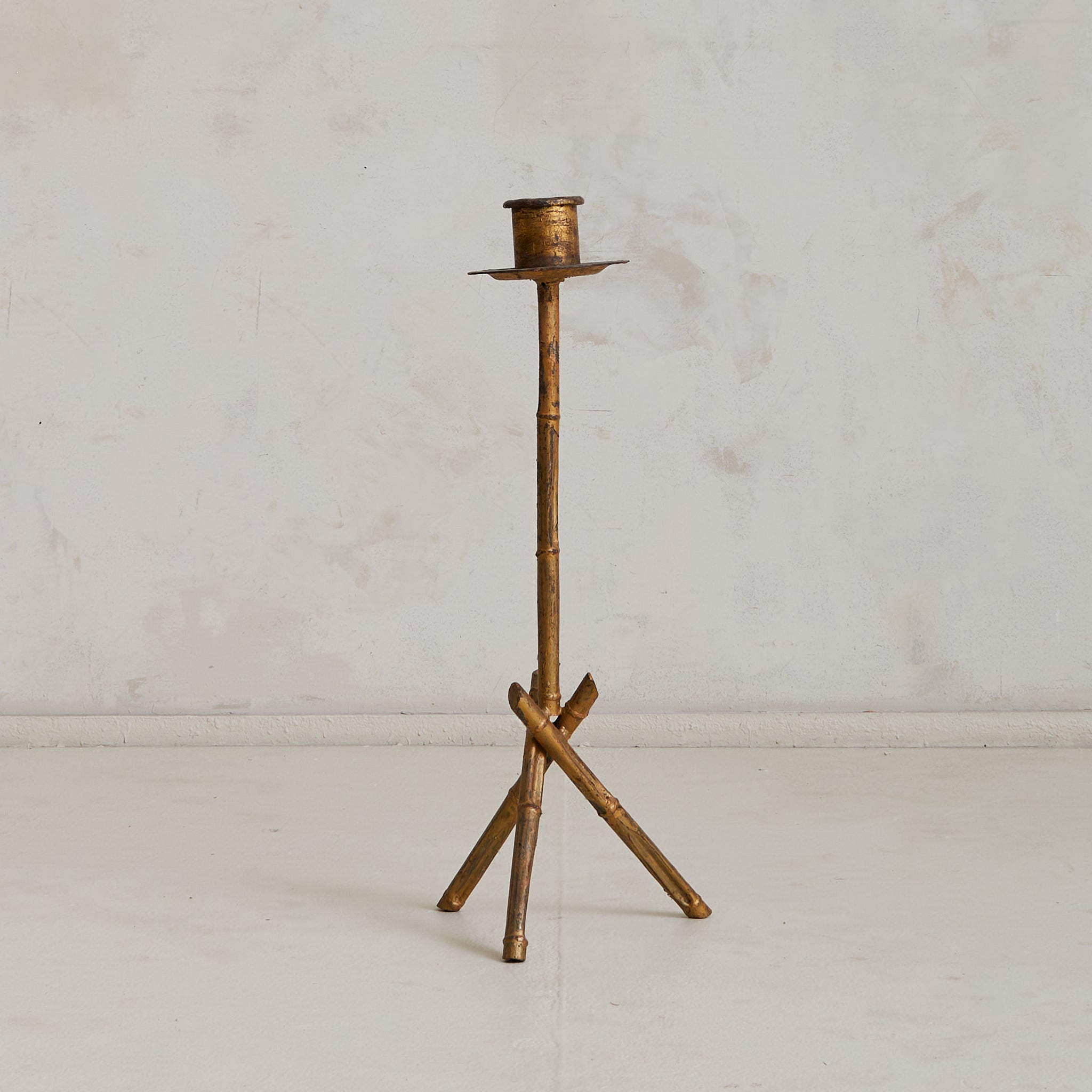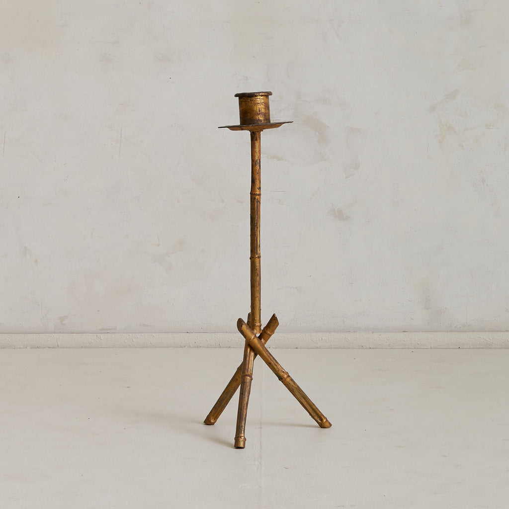 A delicate illusion rendered in metal, this 1950s French floor candleholder mimics the supple rhythm of bamboo with a sculptor’s precision. The tripod base—an elegant crisscross of faux-culms—supports a slender upright stem, culminating in a wide-banded bobeche. Gilt to a soft, timeworn lustre, its surface catches the light with an understated shimmer, lending a quiet opulence to its otherwise utilitarian function.