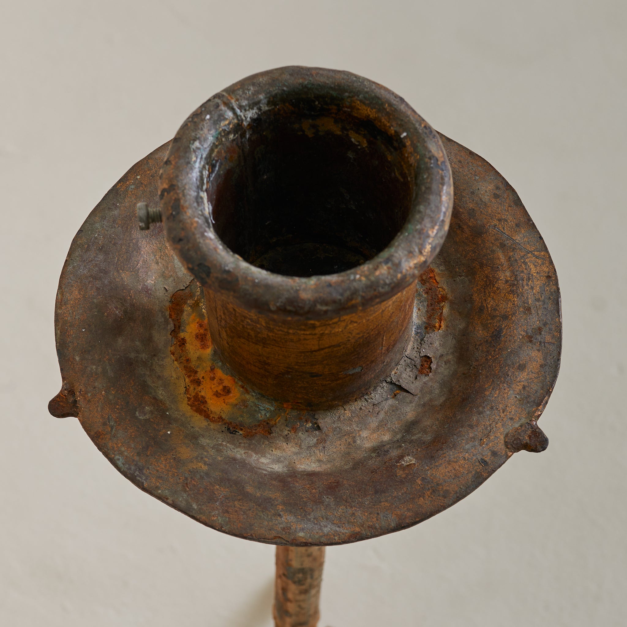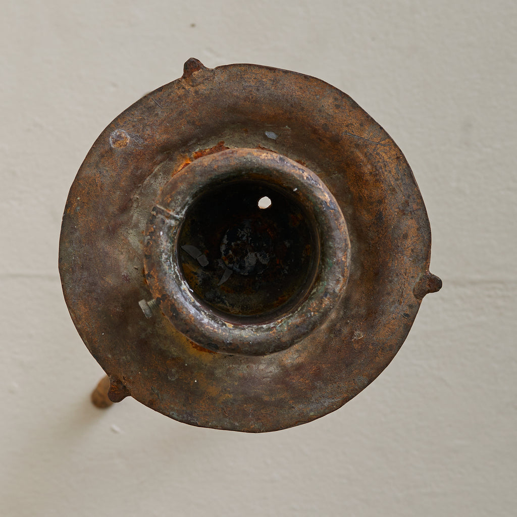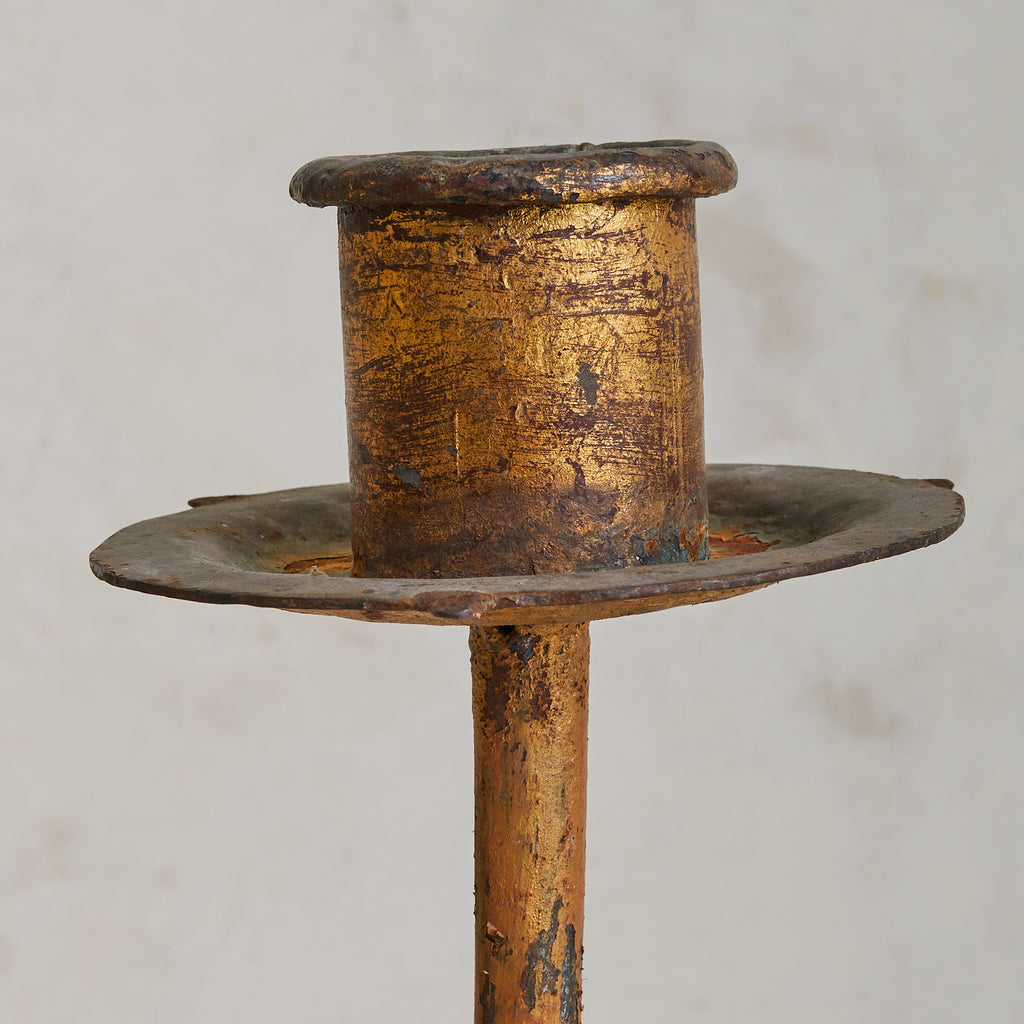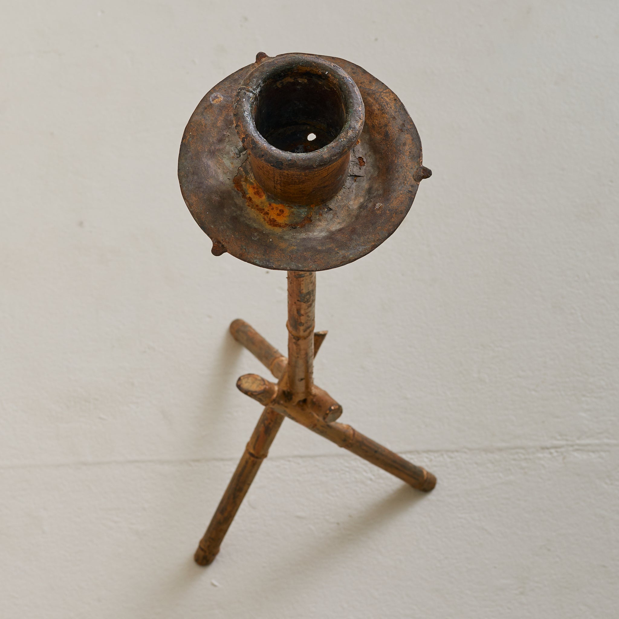 A delicate illusion rendered in metal, this 1950s French floor candleholder mimics the supple rhythm of bamboo with a sculptor’s precision. The tripod base—an elegant crisscross of faux-culms—supports a slender upright stem, culminating in a wide-banded bobeche. Gilt to a soft, timeworn lustre, its surface catches the light with an understated shimmer, lending a quiet opulence to its otherwise utilitarian function.