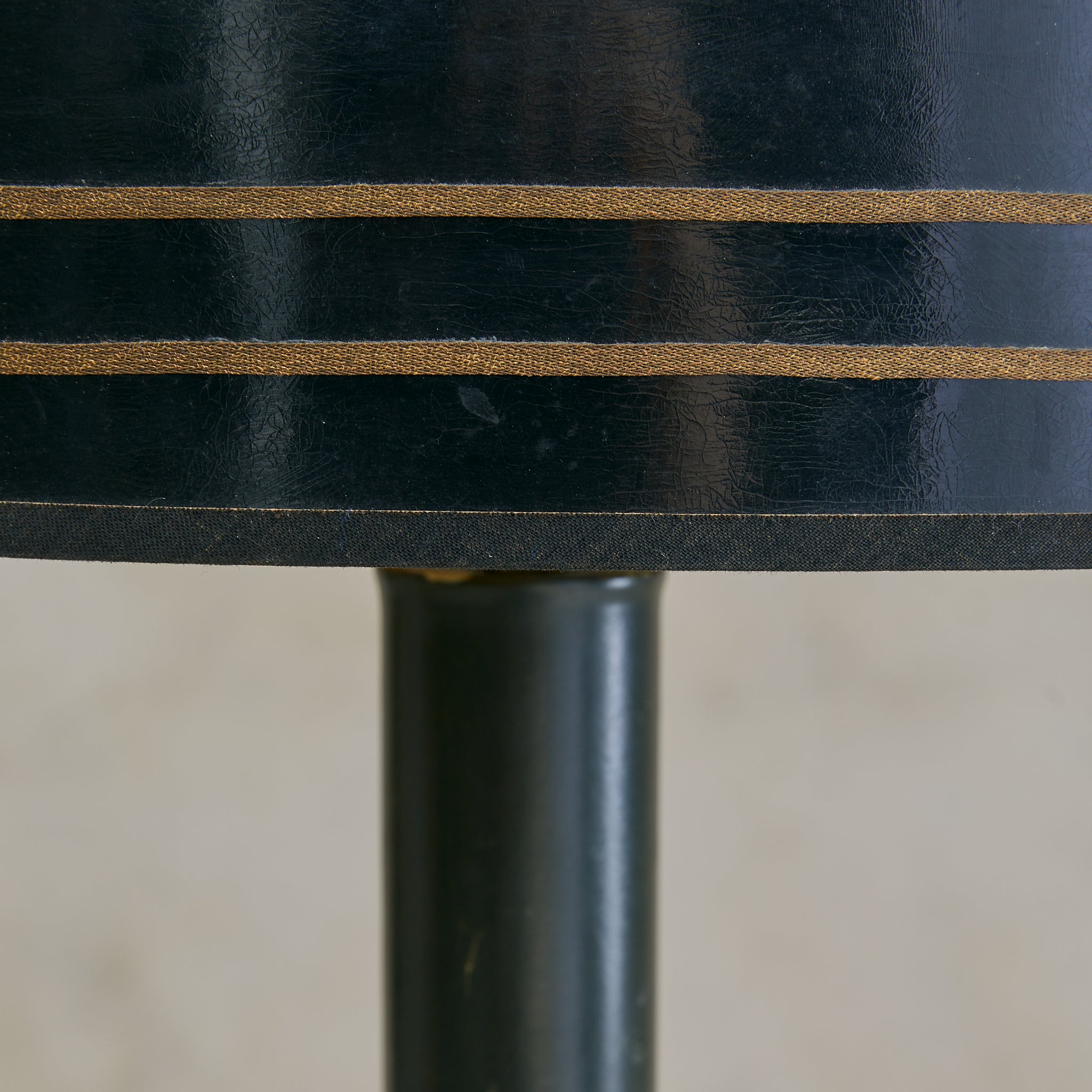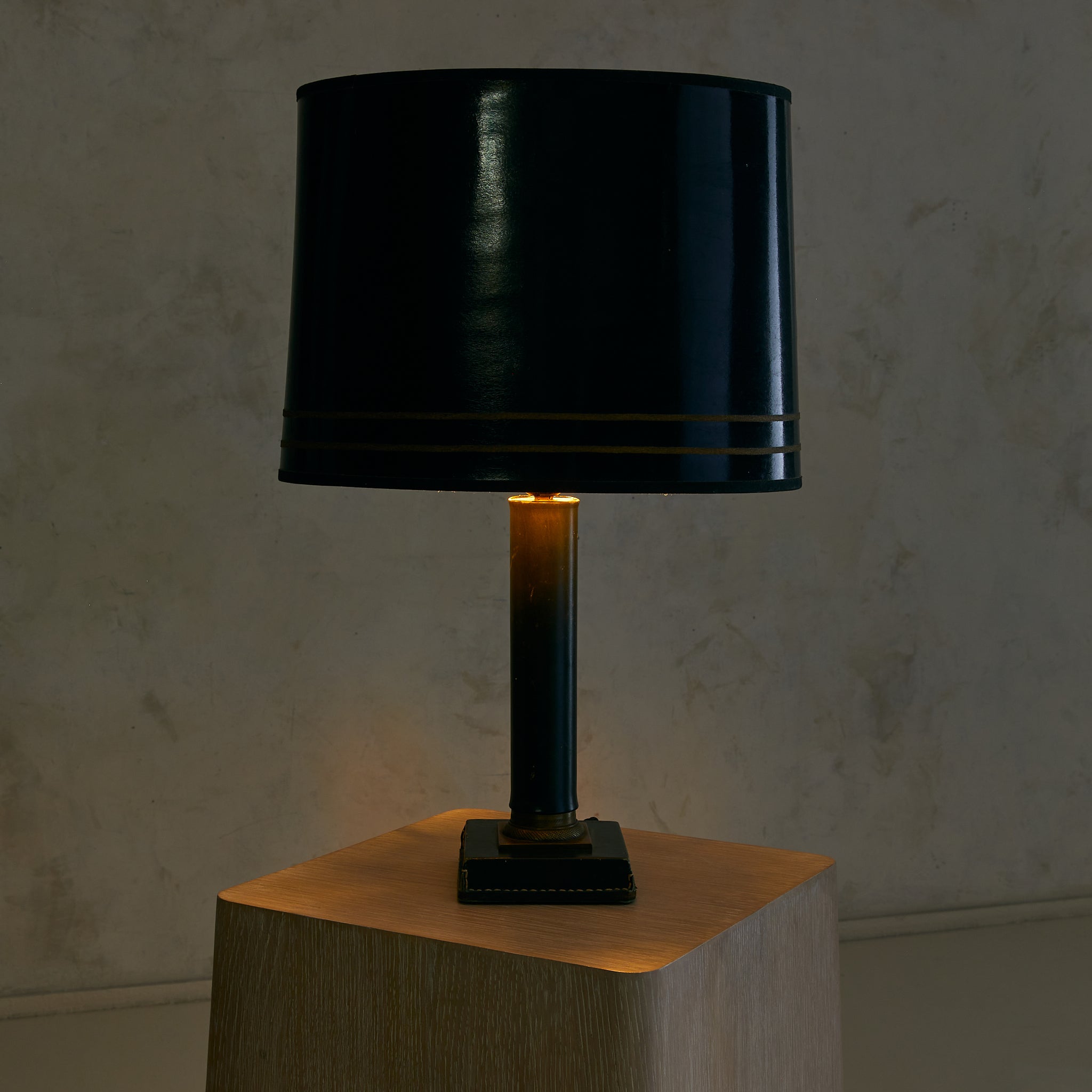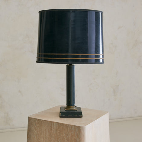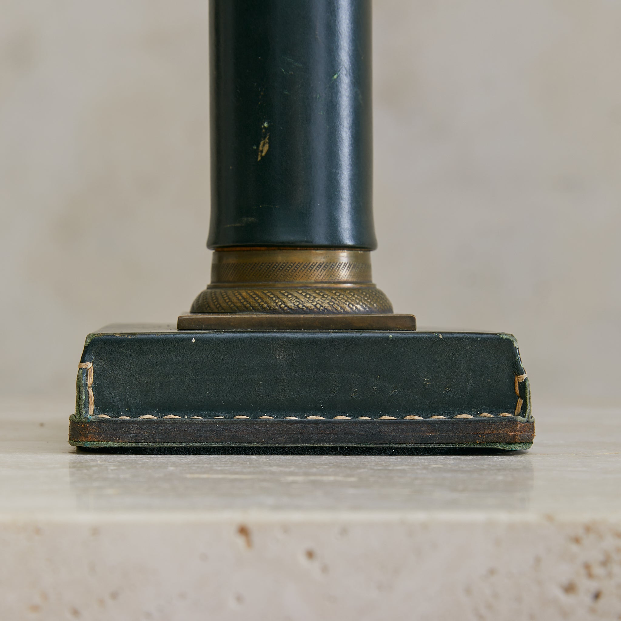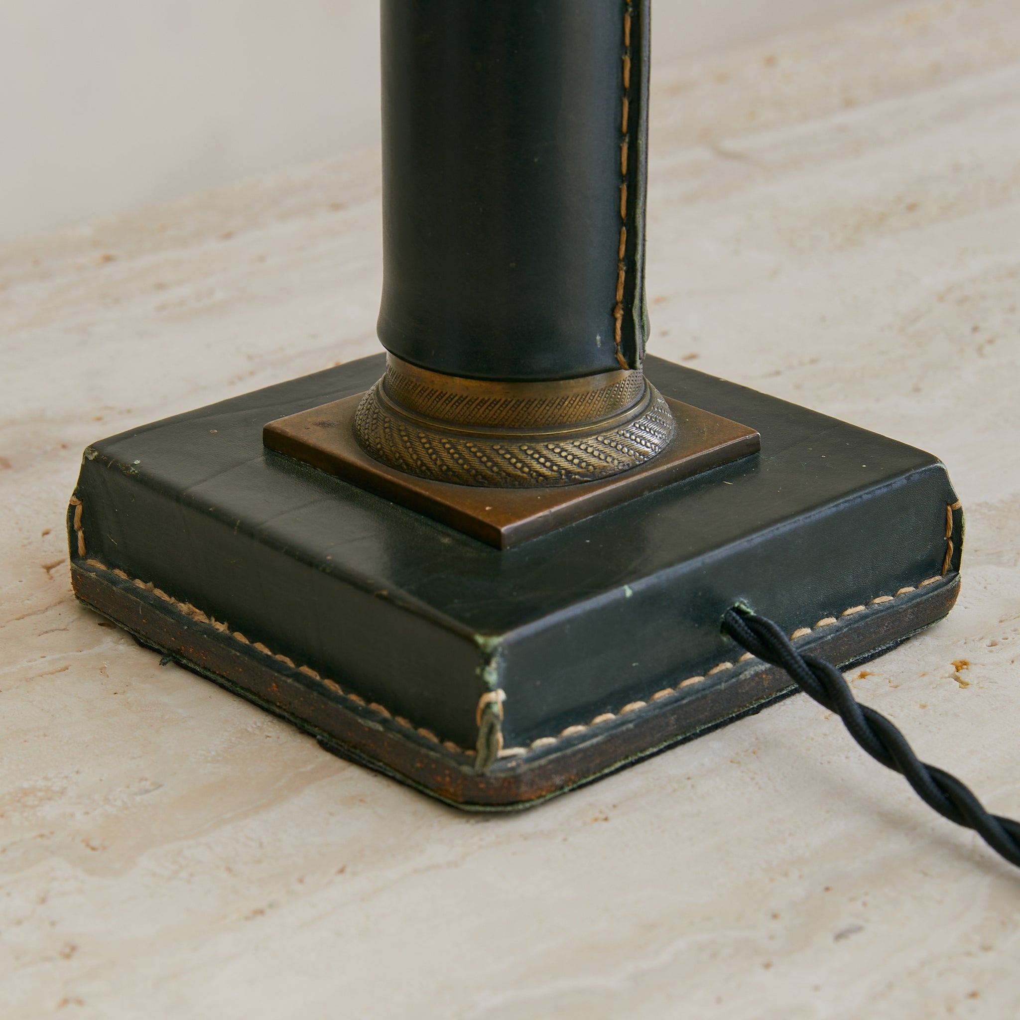 A 1950s French table lamp in the manner of Jacques Adnet, clad in deep green leather with saddle stitching along its square base. The cylindrical column rises from a brass collar etched in fine geometric patterning. Above, the original shade is gilt-lined and circled with double rings, echoing the lamp’s tailored proportions.