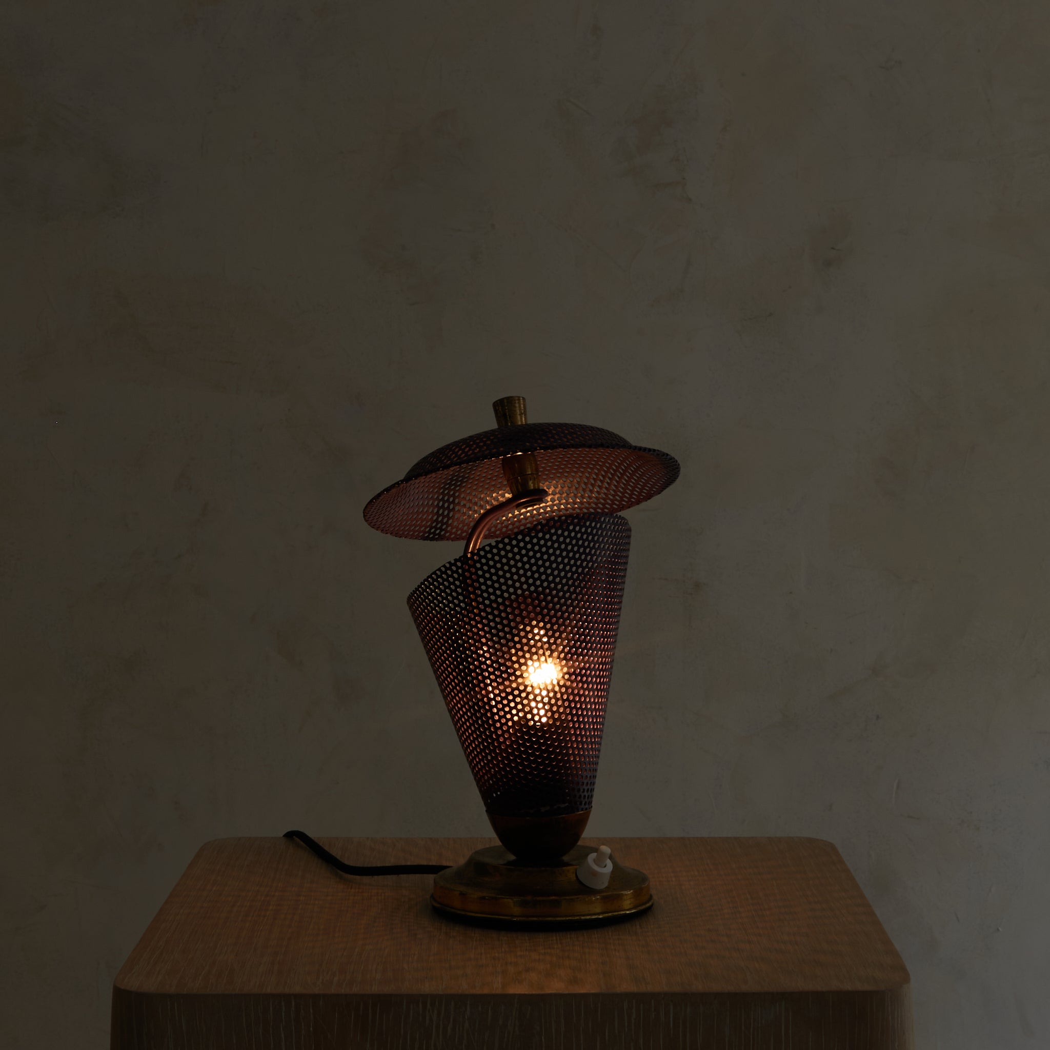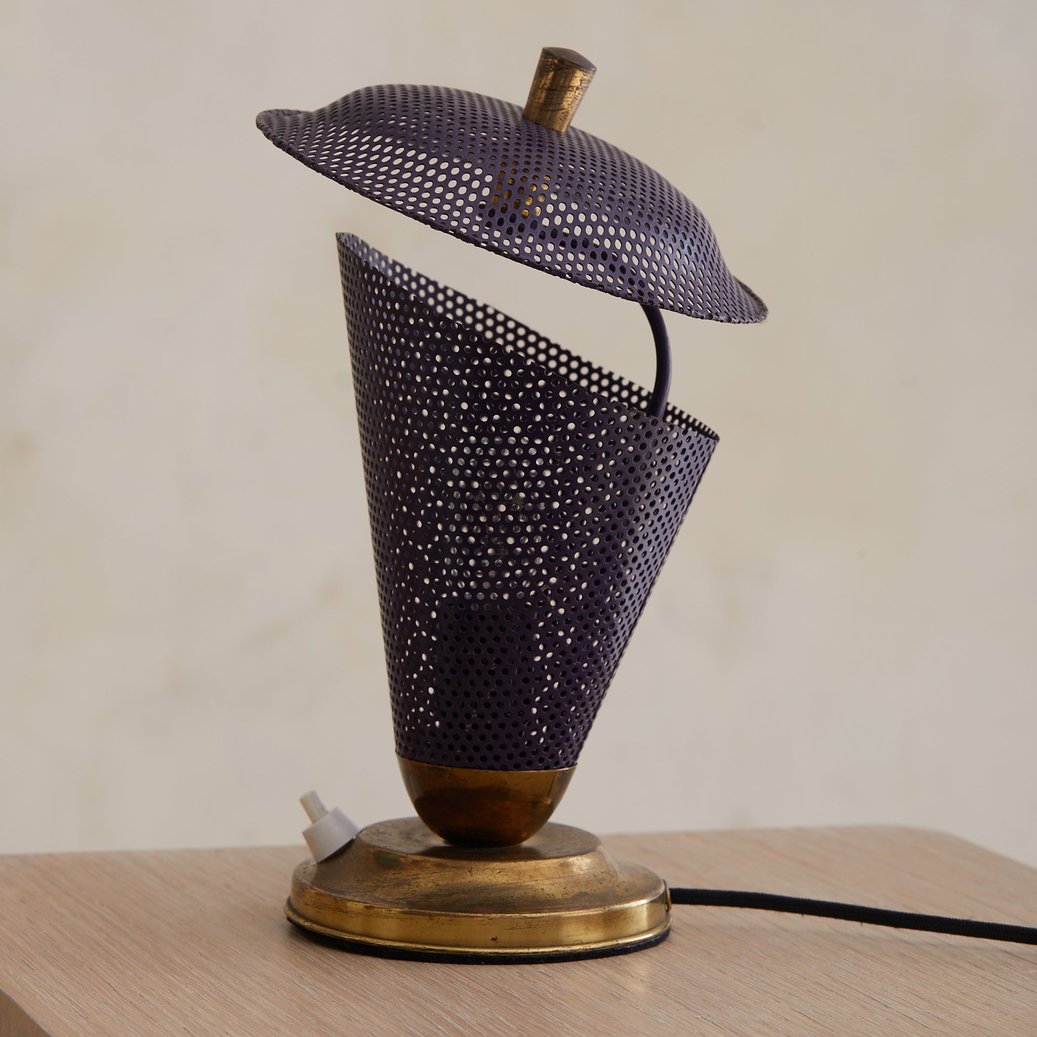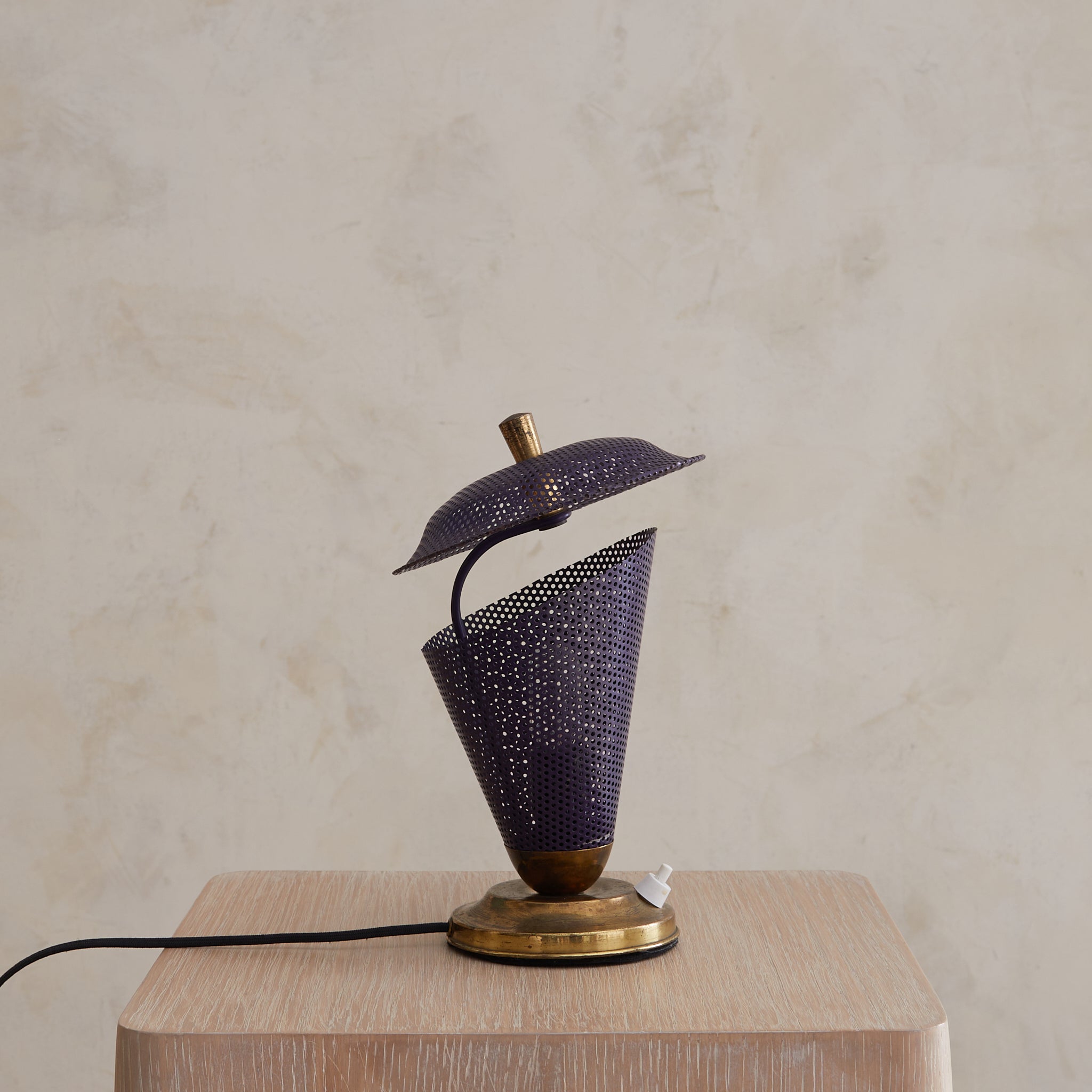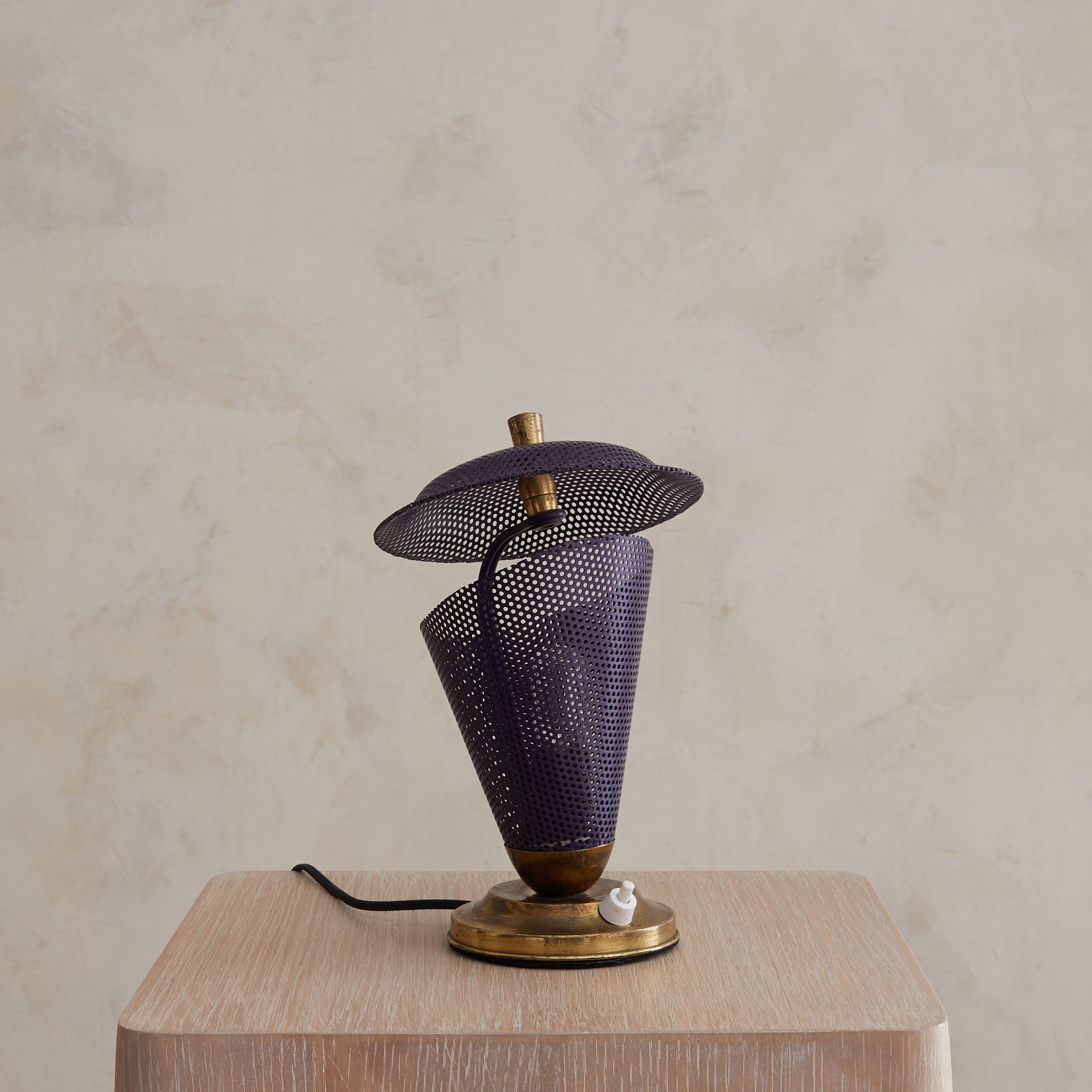 Petite and sculptural, this 1950s French table lamp pairs a perforated metal body in inky blue with a domed, angled shade. The brass base and finial are softly burnished, the light diffused in a warm, cinematic glow.