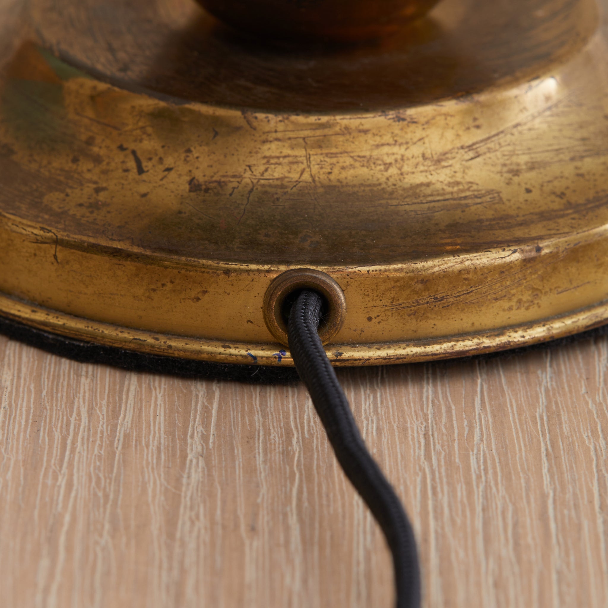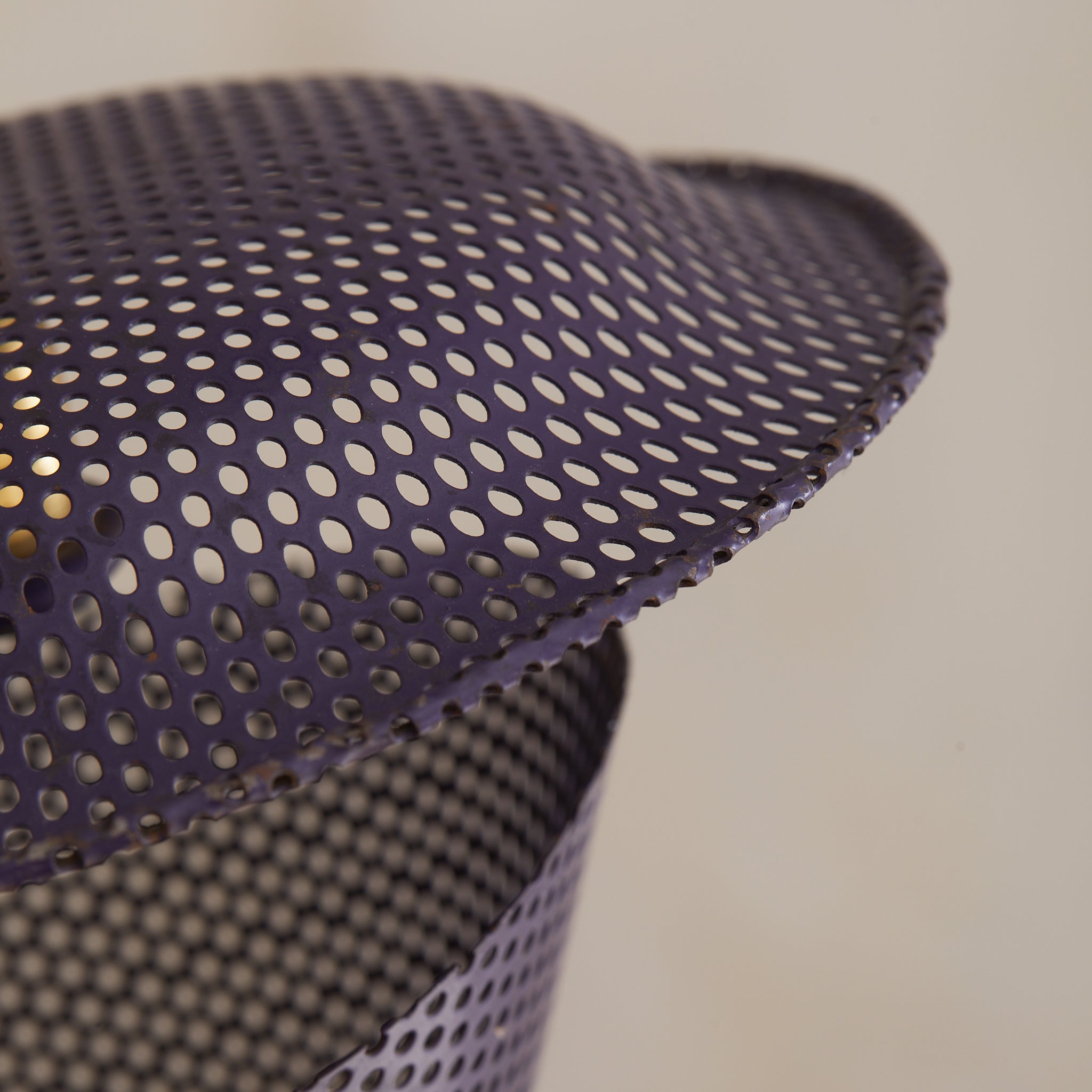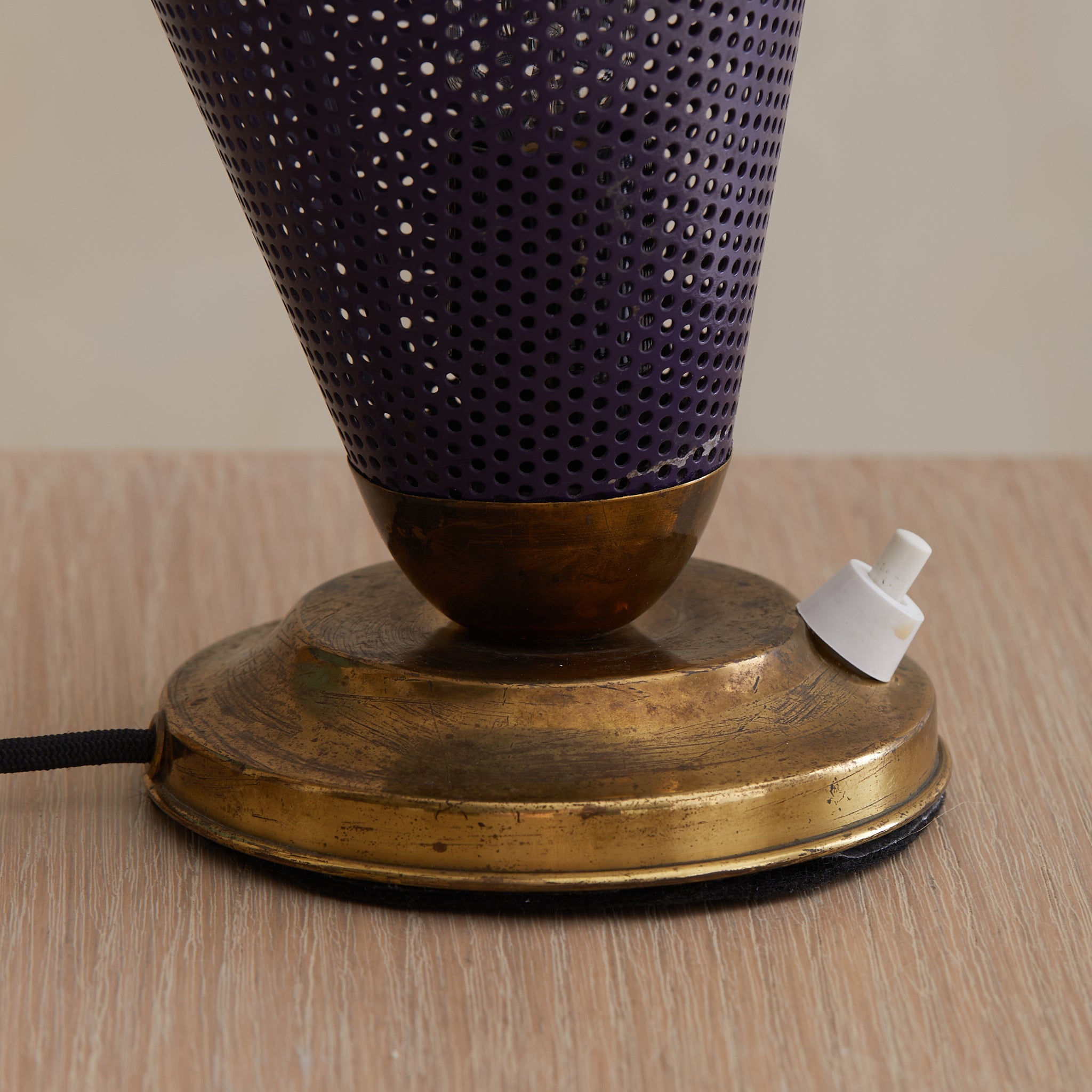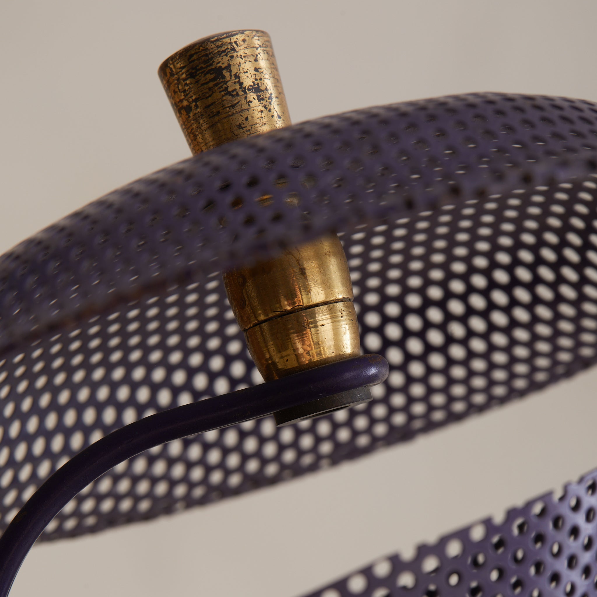 Petite and sculptural, this 1950s French table lamp pairs a perforated metal body in inky blue with a domed, angled shade. The brass base and finial are softly burnished, the light diffused in a warm, cinematic glow.